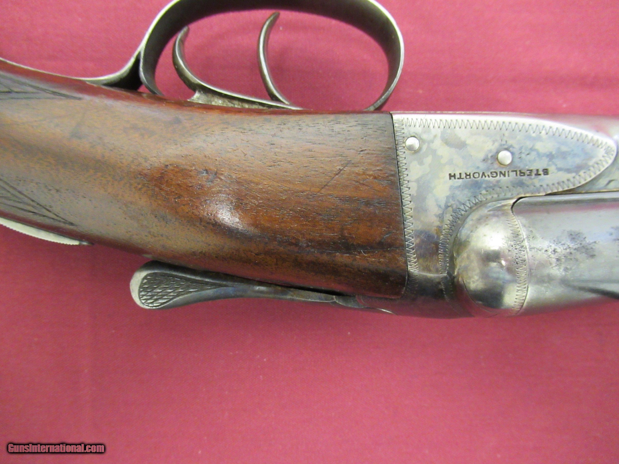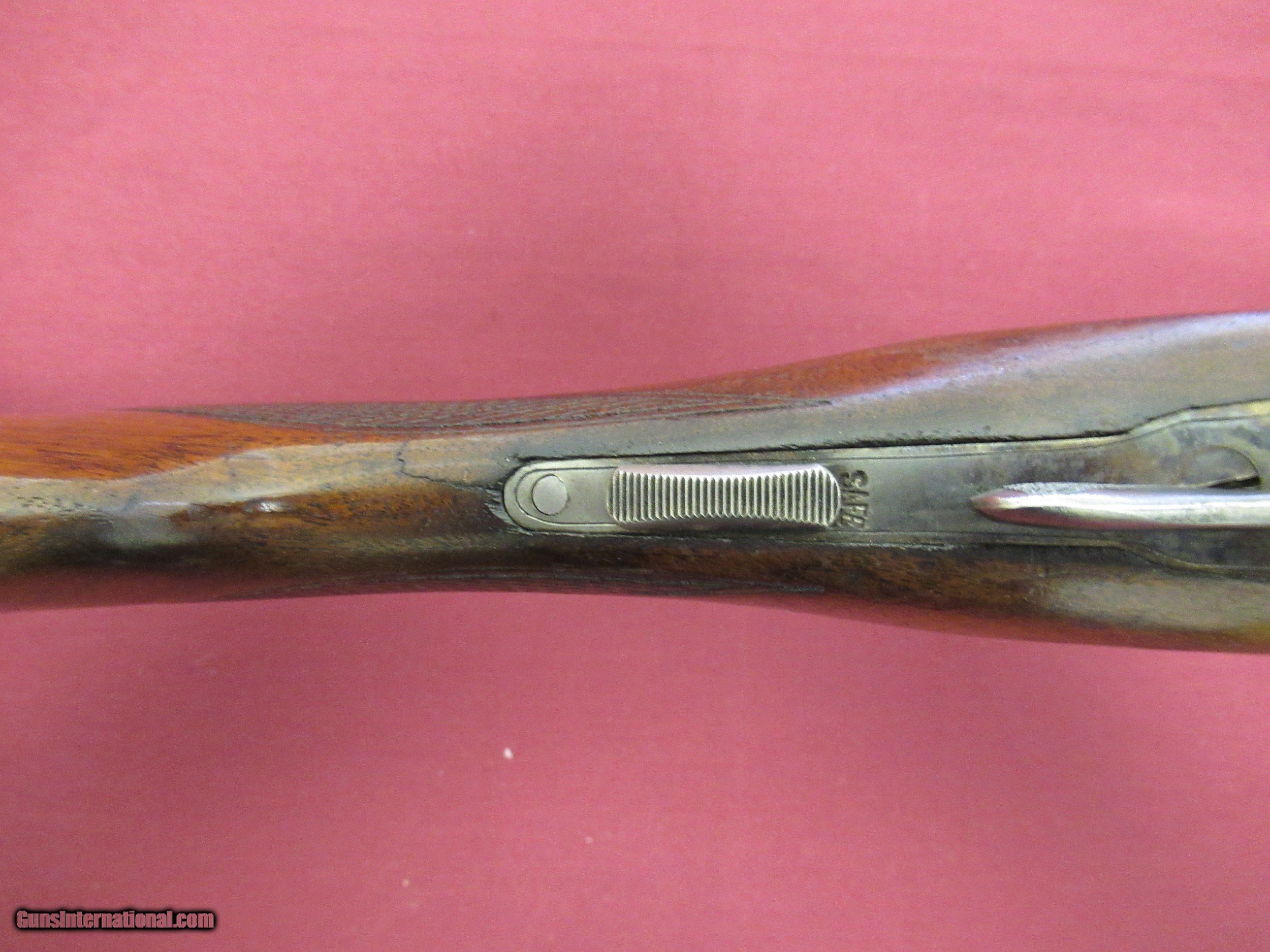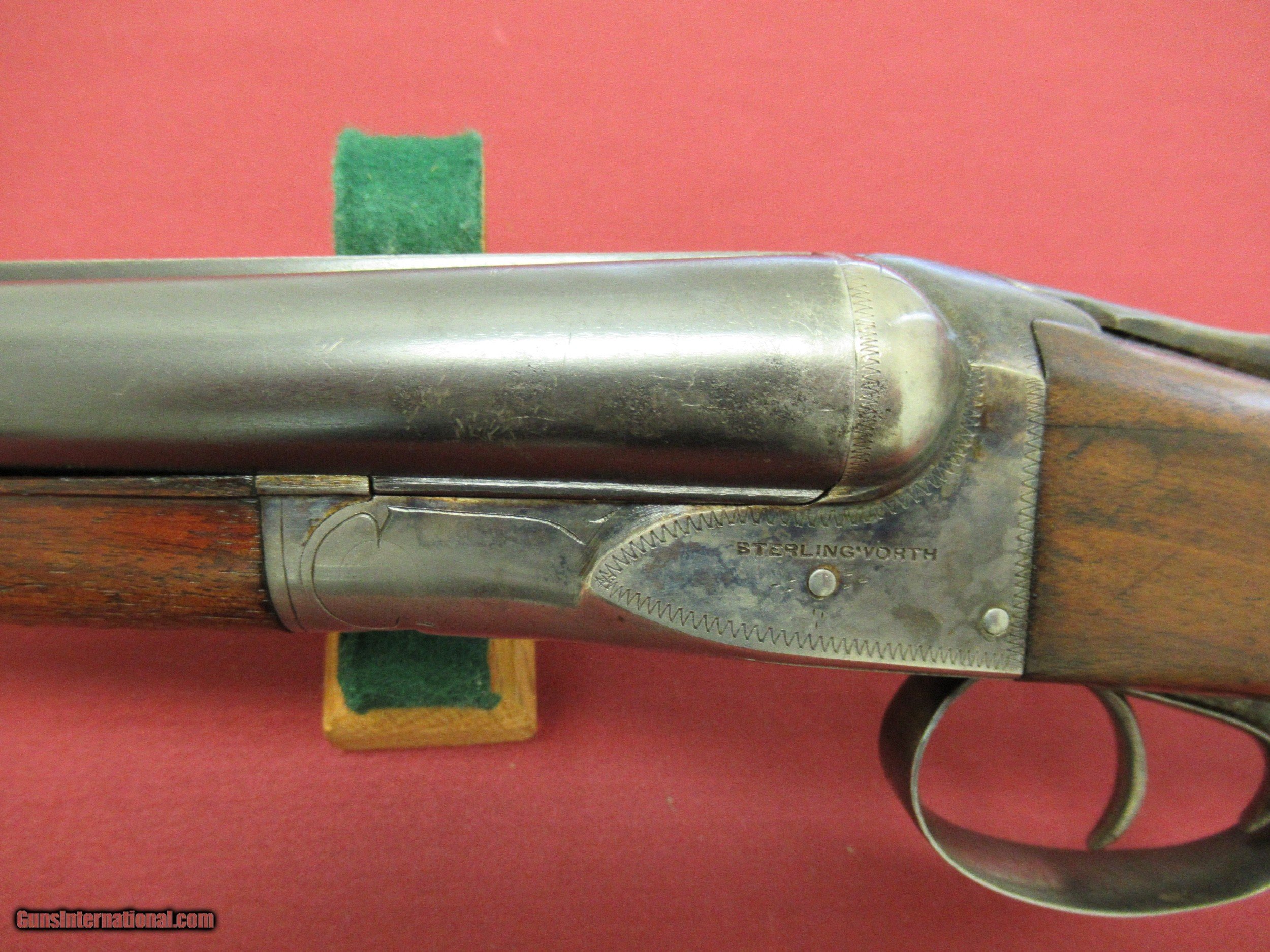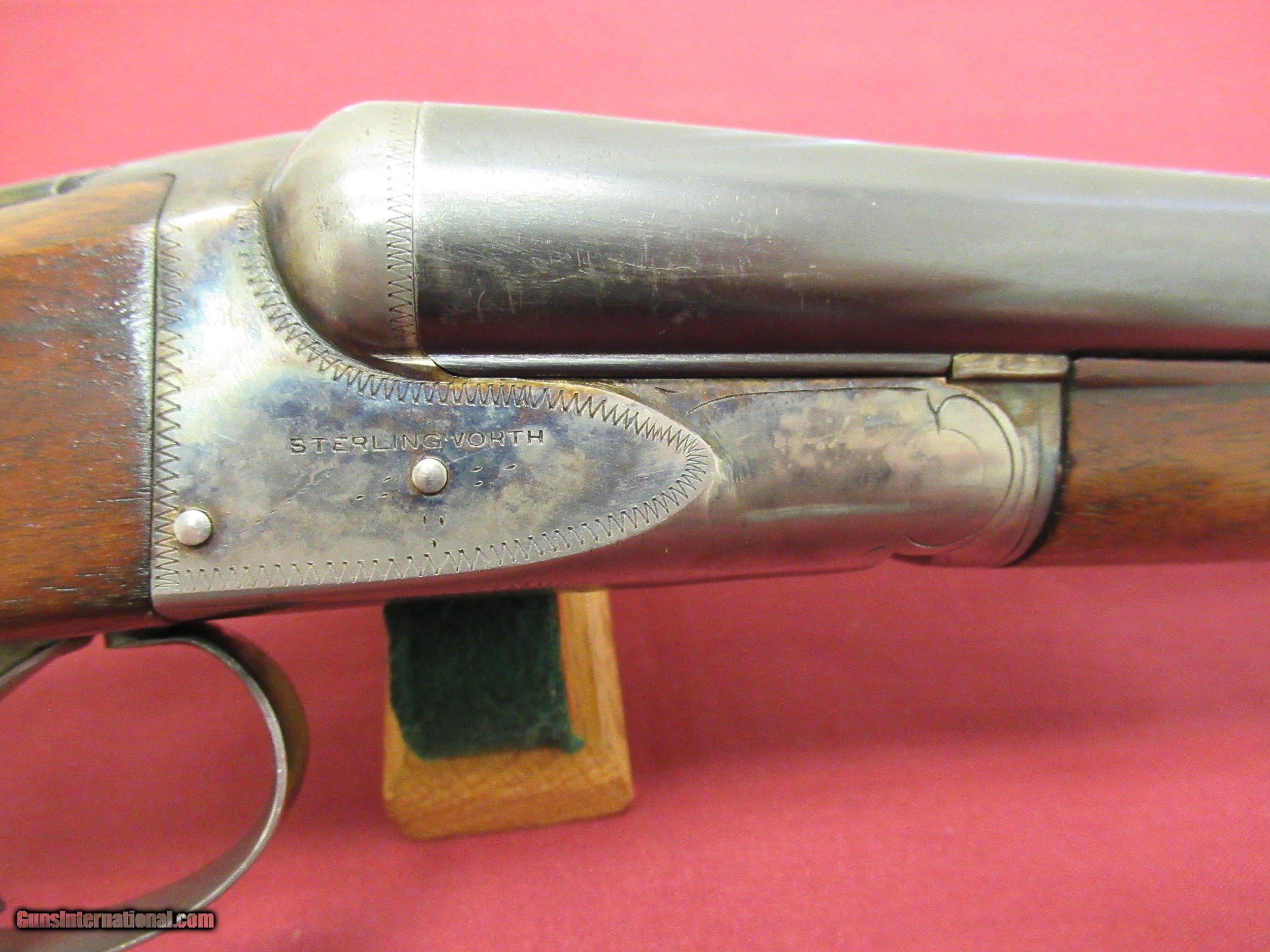 Description: Fox Sterlingworth 16 Ga. Shotgun. 28" Barrels choked tight Improved Mod. and Full. Excellent Bores. Gun has been hunted and appears to have had less than proper storage. Barrel Blue shows handling wear with slight blossums in two spots on left barrel ( See Photos ). Blue is 90+% with minor muzzle wear and breach wear near blossums next to receiver. Receiver retains 50-60% Case Colors on sides, tang and bottom. No pitting there. Wood 80% Original Finish with three minor hairline cracks at rear of tang, left upper cheek and one from the lower tang to the checkering on the right side of butt. Checkering has minor wear but still sharp on Butt and Forend. Handling marks on buttstock. ( all pictured ). Would make a good shooter. Not minty by any means but still a solid gun. SOLD Curio/Relic: Yes |