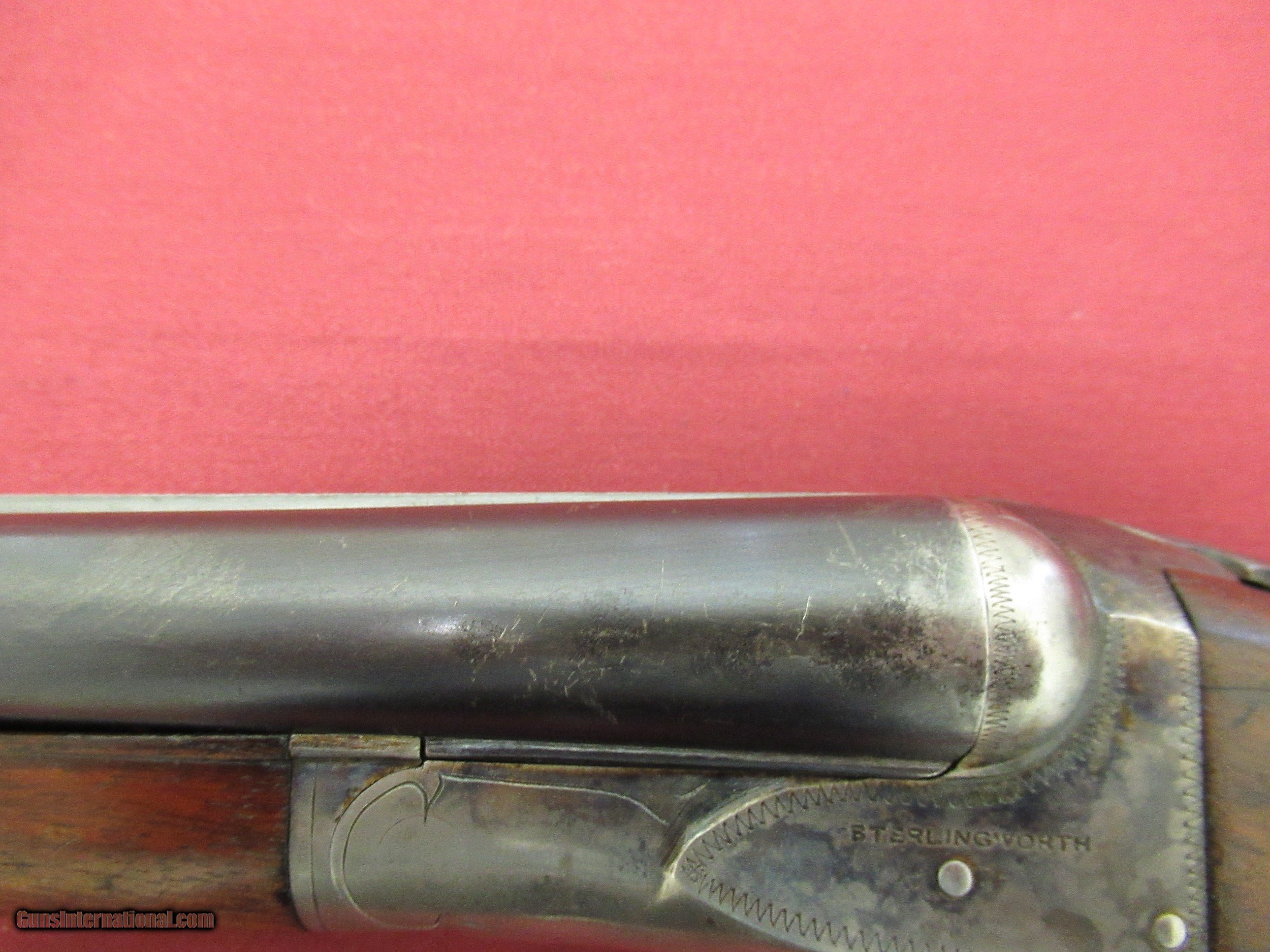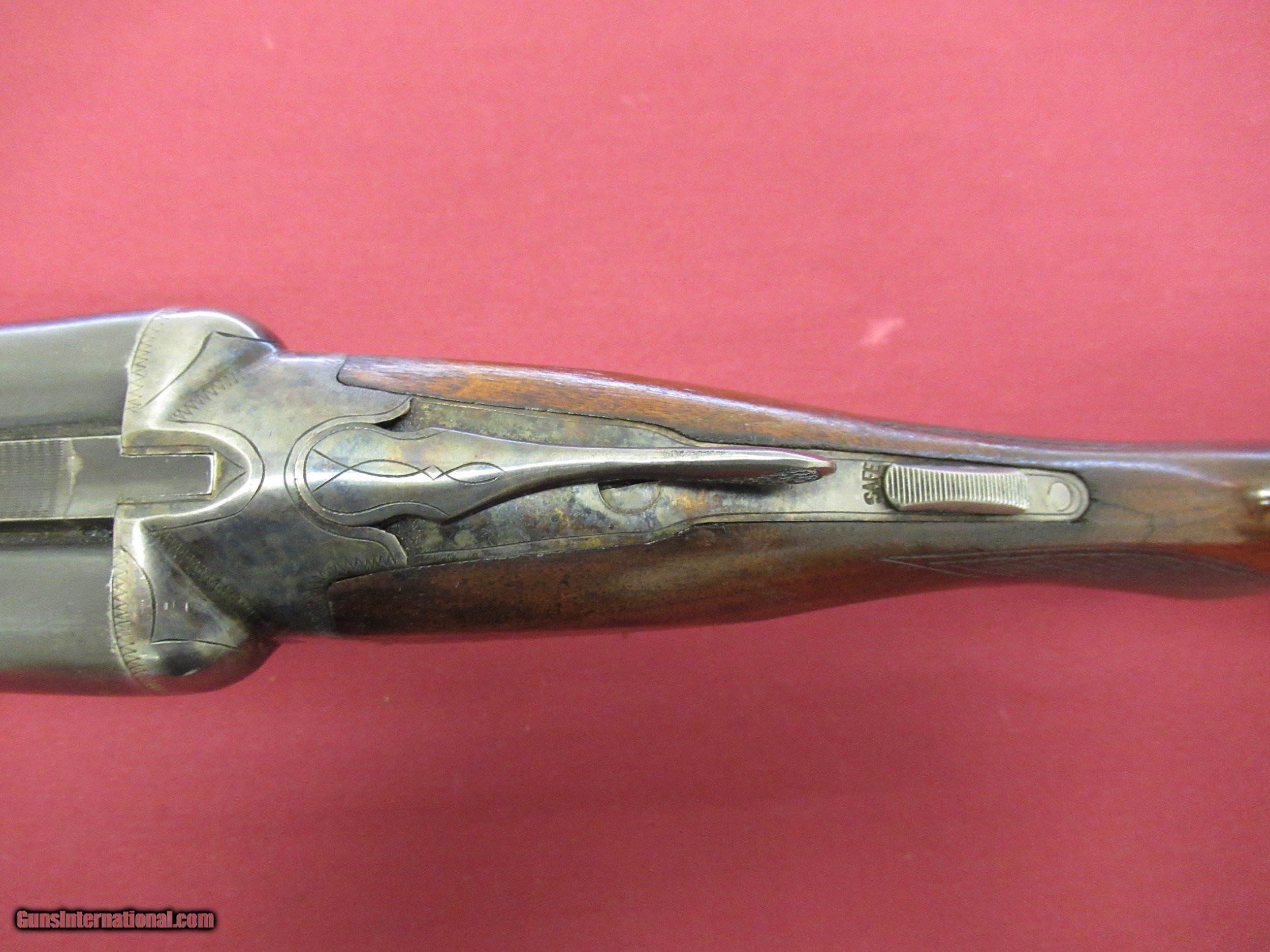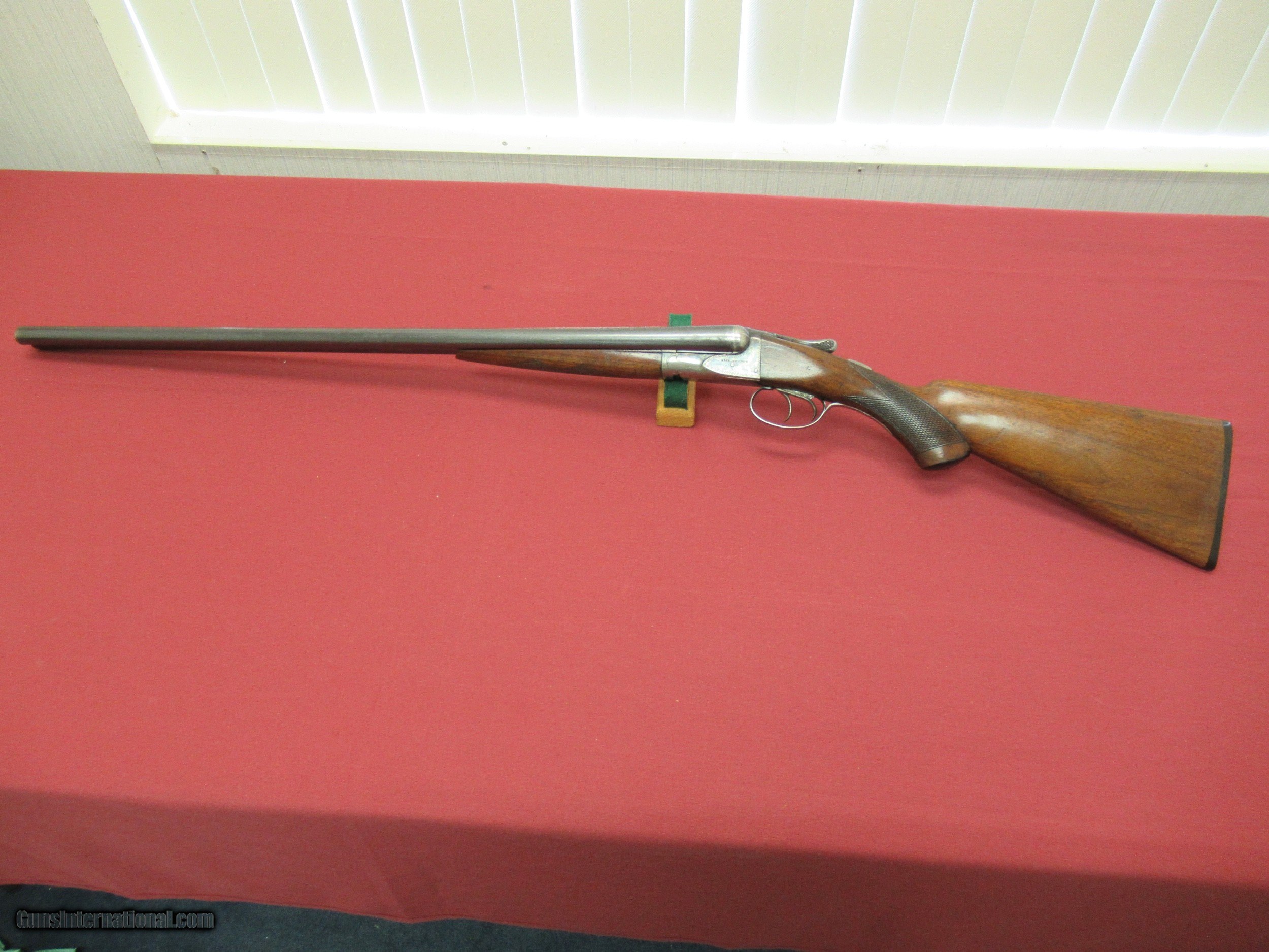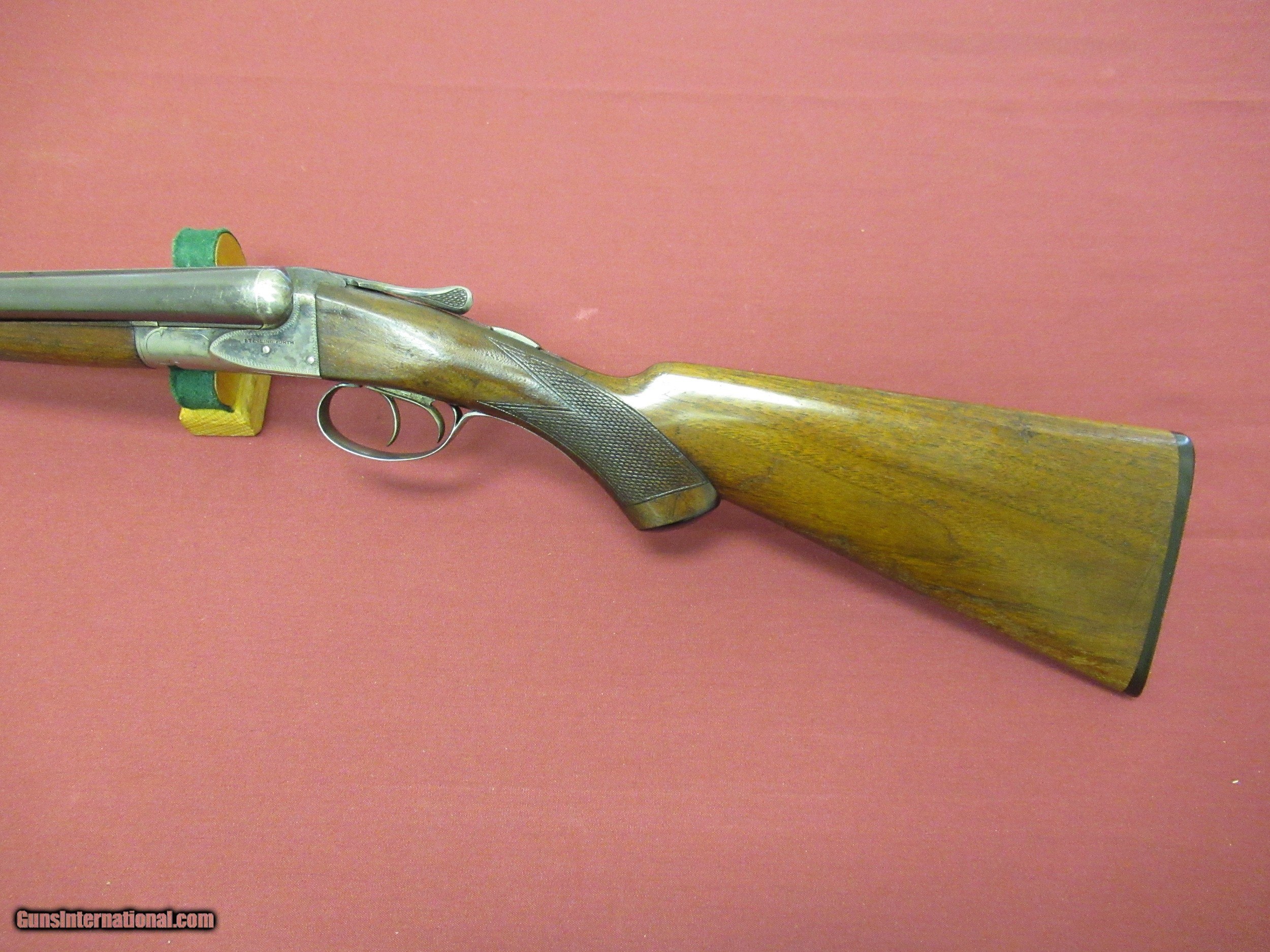 Description: Fox Sterlingworth 16 Ga. Shotgun. 28" Barrels choked tight Improved Mod. and Full. Excellent Bores. Gun has been hunted and appears to have had less than proper storage. Barrel Blue shows handling wear with slight blossums in two spots on left barrel ( See Photos ). Blue is 90+% with minor muzzle wear and breach wear near blossums next to receiver. Receiver retains 50-60% Case Colors on sides, tang and bottom. No pitting there. Wood 80% Original Finish with three minor hairline cracks at rear of tang, left upper cheek and one from the lower tang to the checkering on the right side of butt. Checkering has minor wear but still sharp on Butt and Forend. Handling marks on buttstock. ( all pictured ). Would make a good shooter. Not minty by any means but still a solid gun. SOLD Curio/Relic: Yes |