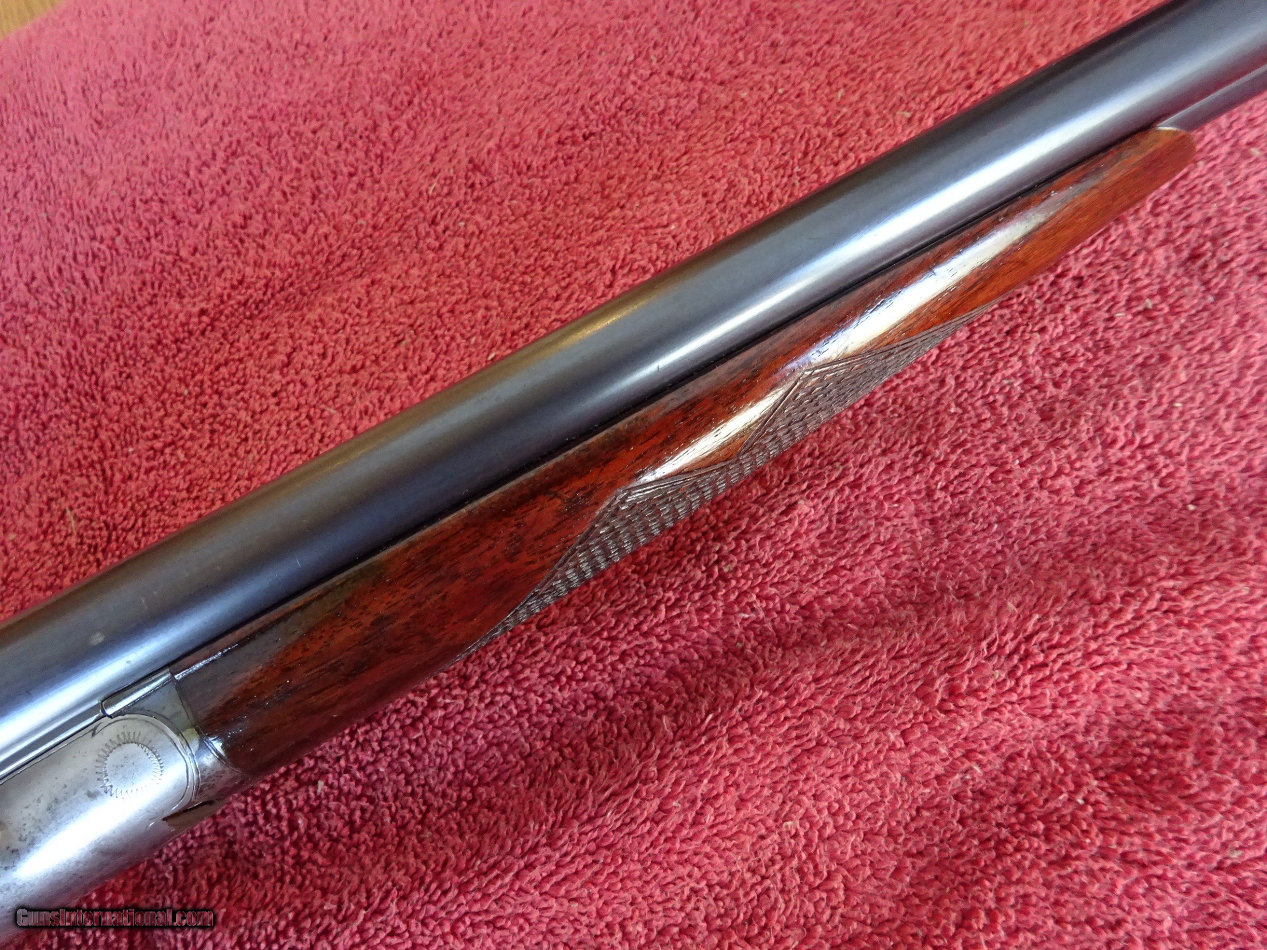 Description: *** SALE PENDING *** A H FOX, PHIL., STERLINGWORTH 20 GAUGE, 28" NUMBER FOUR WEIGHT BARRELS, VERY GOOD BLUE, MIRROR BRIGHT BORES, SINGLE BEAD SIGHT, MODIFIED (.018) AND FULL (.030), 2 1/2" CHAMBERS, BARRELS RING NICELY. CASE COLOR IN THE PROTECTED AREAS, TOP LEVER TO THE RIGHT, TIGHT ON FACE, EXCELLENT SCREWS. STRAIGHT GRIP STOCK, SPLINTER FOREARM, EXCELLENT WOOD AND CHECKERING, 1 3/8" X 2 1/2" X 14 5/8", 5 POUNDS 14 OUNCES, ORIGINAL BUTTPLATE. WONDERFUL HANDLING DOUBLE, THE ONLY FACTORY ORIGINAL STRAIGHT STOCK WITH LONG TRIGGERGUARD FOX STERLINGWORTH I HAVE EVER OWNED. VERY RARE GUN, 100% FACTORY ORIGINAL. MADE IN 1917. $2750.00 + $60.00 Insured shipping to an FFL address. Layaway is available. See all Pats gun listings on this site! We also have hundreds of pieces of ORIGINAL gun company advertising & memorabilia available for sale on our site SPORTINGCOLLECTIBLES. We have no reprints or reproductions. Email for more information. SOLD Curio/Relic: Yes |