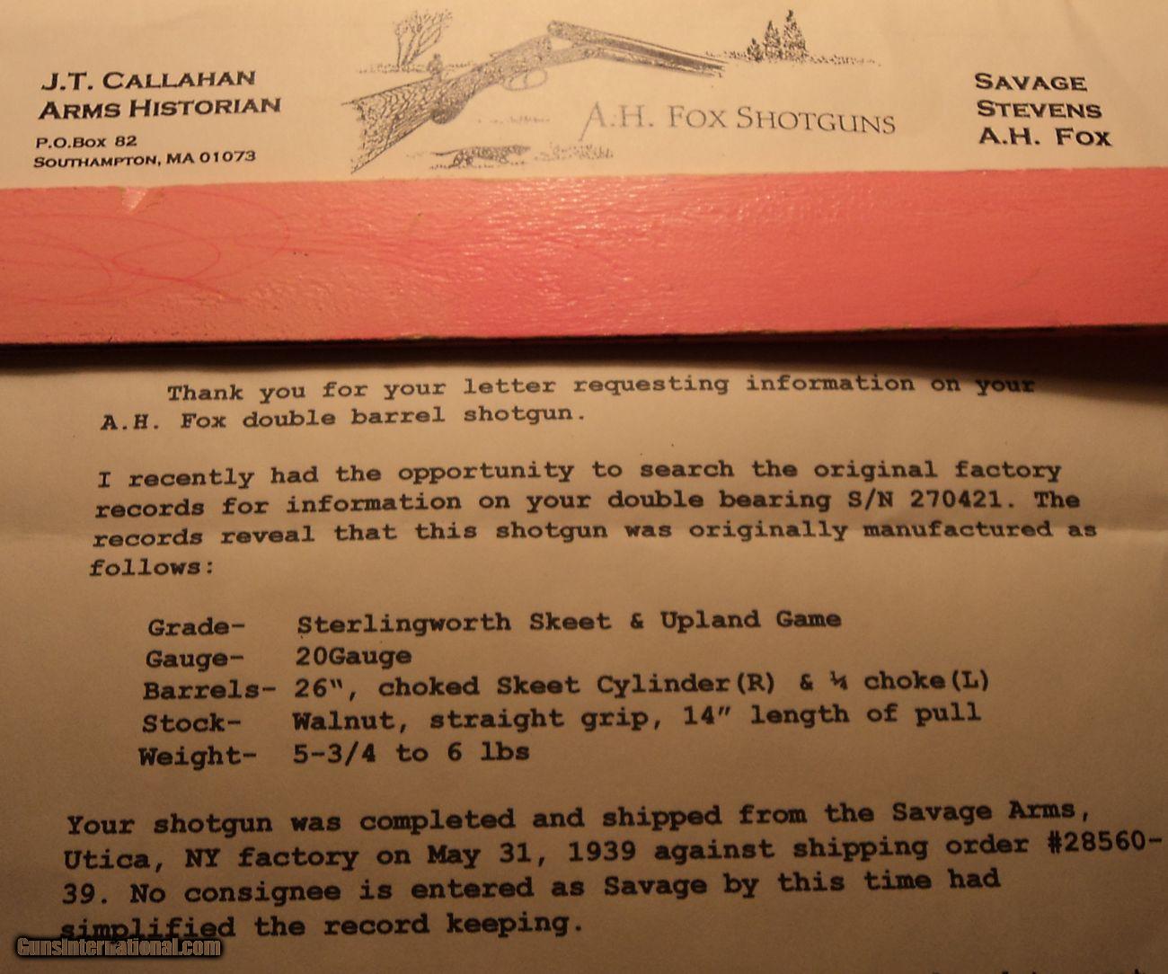 Description: Especially hard to find A H Fox Sterlingworth Skeet & Upland 20 gauge (serial #270421) made in 1939 (according to factory letter) with 26" double beaded barrels choked cylinder & improved cylinder. One of only thirty four 20 gauge Skeet & Upland known to be manufactured. What a great close cover woodcock & grouse gun this Fox double would make! Barrel lock up is tight to the receiver with the forearm off and the top lever is a little to the right. It has a good amount of original case color remaining on the receiver bottom, top and sides. It has good bluing with some thinning here & there and the wood is not bad with some light handling marks. The bores are shiney with no pitting and this little Fox has 2 3/4" chambers. LOP measures 14 1/8" with a DAH at 2 1/2". It weighs in at 5 lb 14 oz. $70 SH&I to most of the lower 48. Eight far west states at $80 SH&I. Postal money orders for payment. No warranty stated or implied by the seller. Consignment gun-no return. Lay-a-way is available! Call Tom at 724-667-2345 SOLD Curio/Relic: Yes Manufacturer: A H Fox Model: Skeet & Upland Serial Number: 270421 Chambers: 2 3/4 Ejectors: no Metal Condition: good Wood Condition: good Bore Condition: shiney, no pitting Barrel Type: SxS Action: boxlock Triggers: double Gauge Info: 20 Stock Heel: 2 1/2 Fore End: snap on LOP: 14 1/8 Rib: solid Weight: 5 lb 14 oz Sights: double bead Manufacture Date: 1939 Choke Left: imp cylinder Choke Right: cylinder Extras: rare |