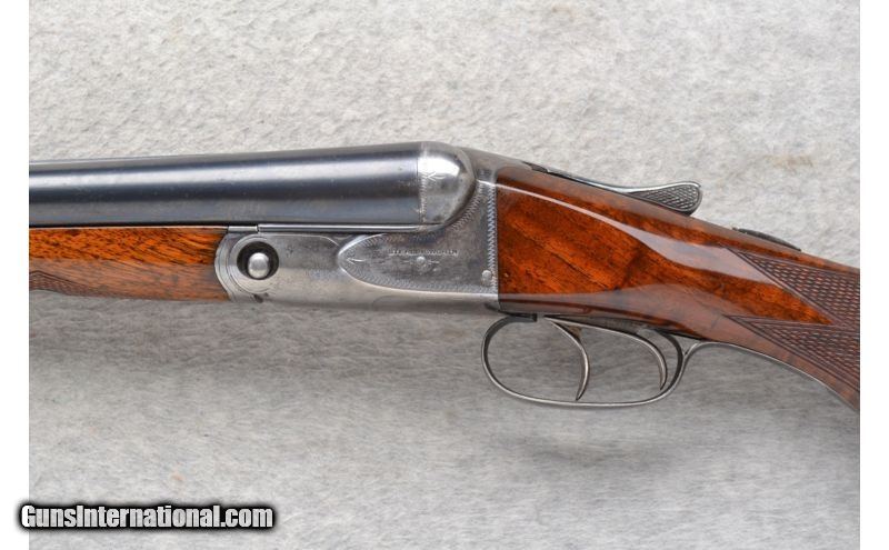 Description: This A.H. Fox Model Sterlingworth is a 12 Ga. Side x Side shotgun. It has 28 inch barrels with a solid rib. With 2 3/4 inch chambers it has fixed Modified and Cyl. chokes. It has double triggers and extractors. The case colored receiver is border engraved. The stock is a checkered walnut pistol grip with a black cap. The forearm is a checkered grip walnut Splinter. SOLD Caliber Info: 12 Ga. Chambers: 2 3/4 inch Side x Side with extractors. Boxlock Action. Metal Condition: Good. Shows some age, use and light wear. Wood Condition: Good. Has multiple handling marks. Bore Condition: Bright and shiny. Barrels: 28 inch blued with a solid rib. Triggers: Double triggers. Stock: Checkered walnut pistol grip with a black cap. Case colored receiver. Stock Dimensions: LOP 14 3/8 inches. Fore End: Checkered grip walnut Splinter. Butt Pad: Pachmayr Presentation Model White Line rubber recoil pad. Weight: 7 lbs. 0 oz. Sights: Metal front bead. Chokes: Fixed Modified and CYL. Item Location: Richfield, WI |