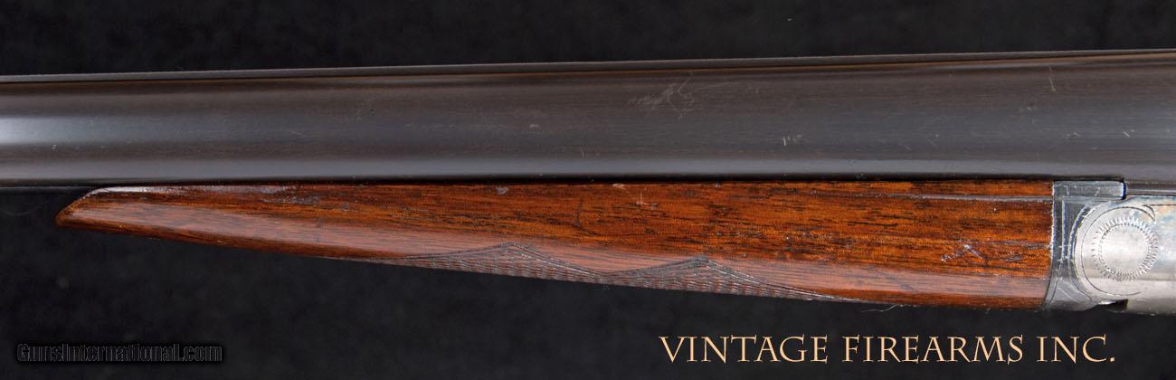 Description: A.H. Fox Sterlingworth 12 Gauge SxS Shotgun PHILLY, 95% FACTORY CONDITION! General Specs: AH Fox, Year 1922, 12 Gauge, 6lbs 12oz, Side by Side Serial Number: 93891 Fox made A LOT of Sterlingworth 12ga. guns and you can buy them any day you want at reasonable prices. And why not? The Sterlingworth is the same mechanical gun as the finest Fox ever made. There is no doubt in my mind that the Sterlingworth is the very best buy in the vintage American double gun market. Most were "used hard and put away wet" gathering meat for the family, and hence the good prices. This gun, sn93891 made in 1922, is an exception as it retains a boat load of factory original finish. Even the varnish is factory original. You rarely see such a nice, unmolested 12ga. Sterlingworth, with 93% vivid case color, 98% factory barrel blue, and 98% trigger guard blue, perfect screws, not a crack or split anywhere, and as new factory checkering. Most all American 12ga. guns are well over 7 1/4lbs. When carrying a gun over hill and dale in pursuit of your favorite upland quarry, lighter is better! At 6 3/4lbs. (a full 1/2 pound lighter than most) it would be hard to find a better carrying gun than this one. If you are going to buy a Sterlingworth for the field and your favorite clays game, it would be hard to find a better purchase than this one, which is priced to sell and a grand representative of what a near new Fox Sterlingworth looked like in its day. A great investment gun that will grow in value as you enjoy its use. We can add a pad for more LOP or bend the gun to your specs within 15 days of purchase. Our in house gunsmith can alter chambers and chokes as well. Thanks for looking! Barrels Barrel Length: 28" #3wt Chokes: .023/.038 M/F Bores: mirror Bore Diameter: .731/.727 Wall Thickness: .022/.030 % Blue: 98% factory Chambers: 2 5/8" Ribs: tight Sights: single Action Action: as new, way right of center Ejectors or Extractors: extractors Case Color: 93% vivid factory Screws: perfect Engraving: sharp Trigger Type: double, crisp Trigger Guard Color: 99% factory blue Stock Type: capped pistol grip/splinter forend LOP: 14" LOP To End Of Wood: 13 3/4" DAH: 2 7/8" DAC: 1 5/8" Cast: 0 Checkering Condition: perfect factory Butt Treatment: factory plate There are more photos upon request. We offer a 30 day mechanical warranty on this fine shotgun. Call us for full details. PLEASE SEE MY OTHER FINE VINTAGE FIREARMS. Just open one of my ads and click on the line that says “see all items from this seller” and a very nice list of fine sporting and collectible arms will appear. I have many more fine sxs shotguns not yet listed. Thanks for looking! We employ a full time gunsmith on premises and can perform alterations to suit your needs within a few weeks of purchase. Payment Methods: Money Order, Certified Check, Personal Check, Wire Transfer Inspection Period / Return Policy: Three Days from the date the item was received. Sales Tax: 6% Michigan Only Shipping & Insurance: Ground $45.00 We ship internationally! Item Condition: Used Requires FFL?: Yes If you have any questions about this item or payment, please email or call us directly, at #616-292-6240. Thanks! Vintage Firearms, Inc SOLD Curio/Relic: Yes |