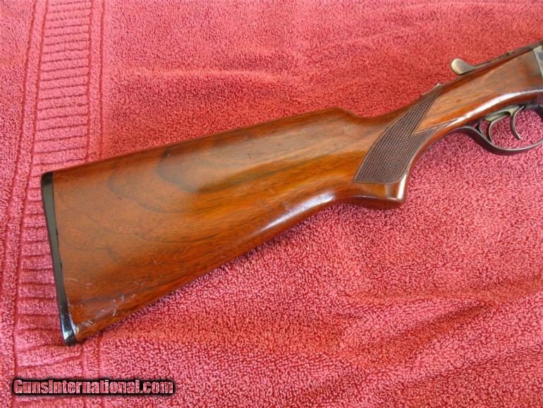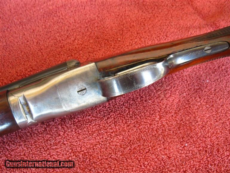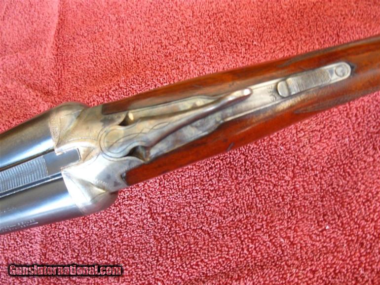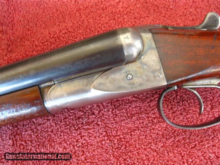 A H FOX, UTICA NY, STERLINGWORTH 16 GAUGE, 28" BARRELS, FULL AND MODIFIED, 2 3/4" CHAMBERS, EXCELLENT BLUE, MIRROR BORES. SOME VIVID CASE COLOR, UNTURNED SCREWS, TOP LEVER TO THE RIGHT. PISTOL GRIP STOCK, SPLINTER FOREARM, EXCELLENT WOOD AND CHECKERING. ORIGINAL BUTTPLATE, GREAT DIMENSIONS 1 3/8" X 2 1/4" 14 1/4", 6 POUNDS 4 OUNCES. NO. 3 BARRELS. MADE IN LAST YEAR OF PRODUCTION 1939.