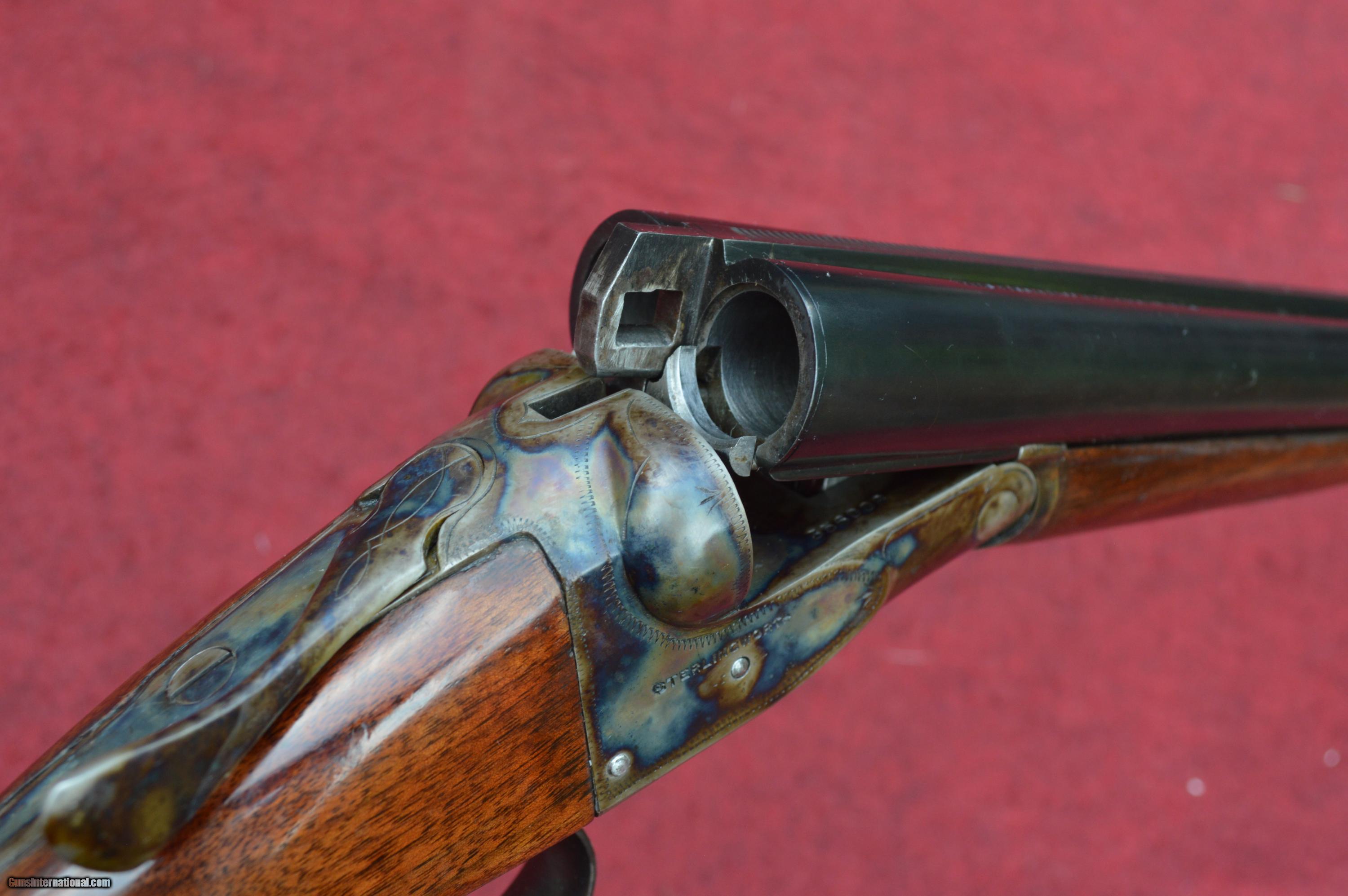 Description: This A.H. Fox 16-gauge Sterlingworth, which was manufactured in Philadelphia in 1922, is brought back to a condition similar to what it would have been in after a couple of years use by the original owner. The wood is reconditioned by drawing out a century of accumulated and damaging petroleum-based oils, replacing natural oils through the application of a hand-rubbed stock-oil finish, and re-cutting the checkering. The engraving on the action and lettering on the barrels are deep and distinct. The barrels are flawless as refinished using the traditional slow-rust-blue process. The color case hardening is re-done by Classic Guns, Crete, IL. Its 26 inch barrels are choked Improved Cylinder (.008) in the right barrel and Modified (.018) in the left. The wall thicknesses (top/side/bottom) for the right barrel 9” from muzzle are .038/.038/.039 and at the middle of the barrel are .050/.051/.049. The wall thicknesses of the left barrel are .041/.041/.044 and .051/.051/.051, respectively. Chambers are 2-1/2 inch. Bores 9” from the breech are both .665”. The weight is 6 pounds 1 ounce. The drop at the comb is 1-3/4” and at the heel 2-3/4”. Length of pull from the front trigger to the end of the original buttplate is 14-1/4”. The gun locks up tight and on face; the top lever returns to the right of center. The ejectors function properly. All serial numbers, 356998, match. The list price does not include original shipping costs, which are paid by the buyer. The inspection period is 7 days from receipt by buyer. This gun has been fired on multiple occasions with target loads. However, as for all vintage shotguns, it is recommended that new owner have it inspected by his or her gunsmith before firing. The gun carries a 30-day warrantee, during which Back in Time will have any problems documented by a professional gunsmith repaired or accept the return of the gun and refund the price of the gun and the return shipping cost. Please do not hesitate to call with questions Stephen Wesbrook, 703-625-4830; Back in Time, LLC -- Preserving late 19th and early 20th century double shotguns. SOLD Curio/Relic: Yes |