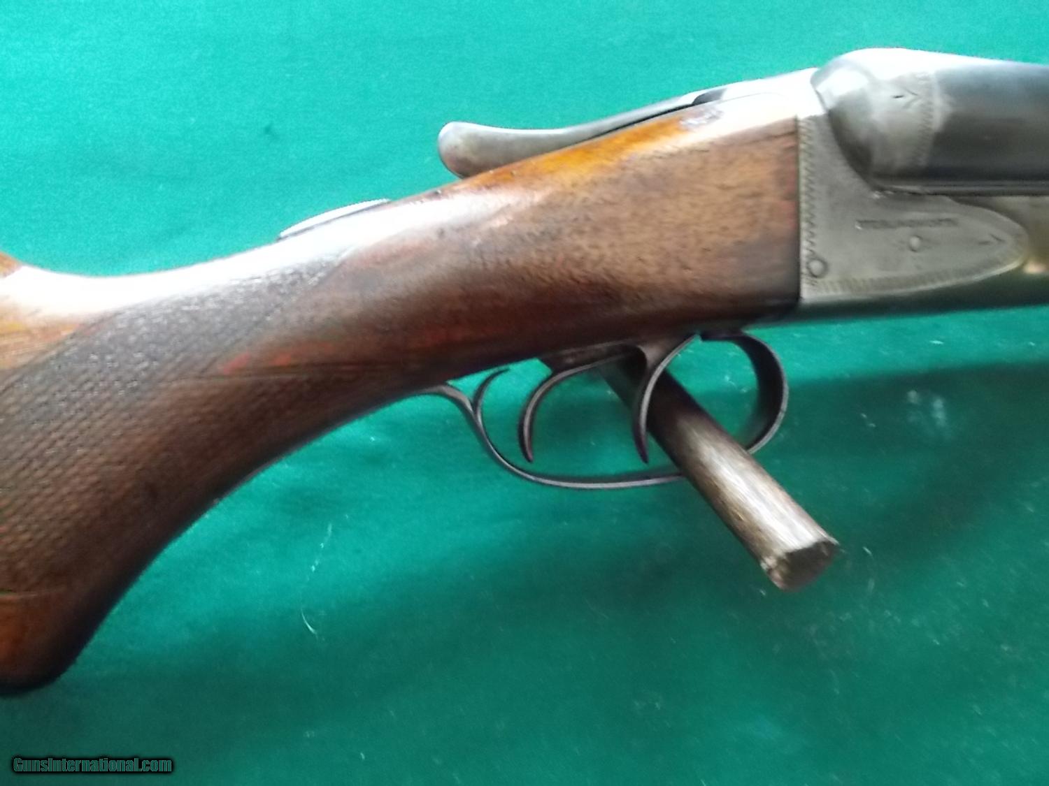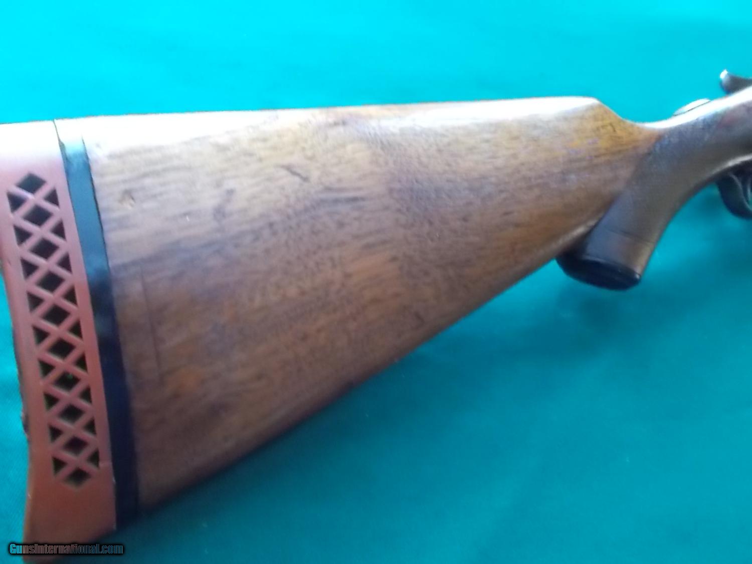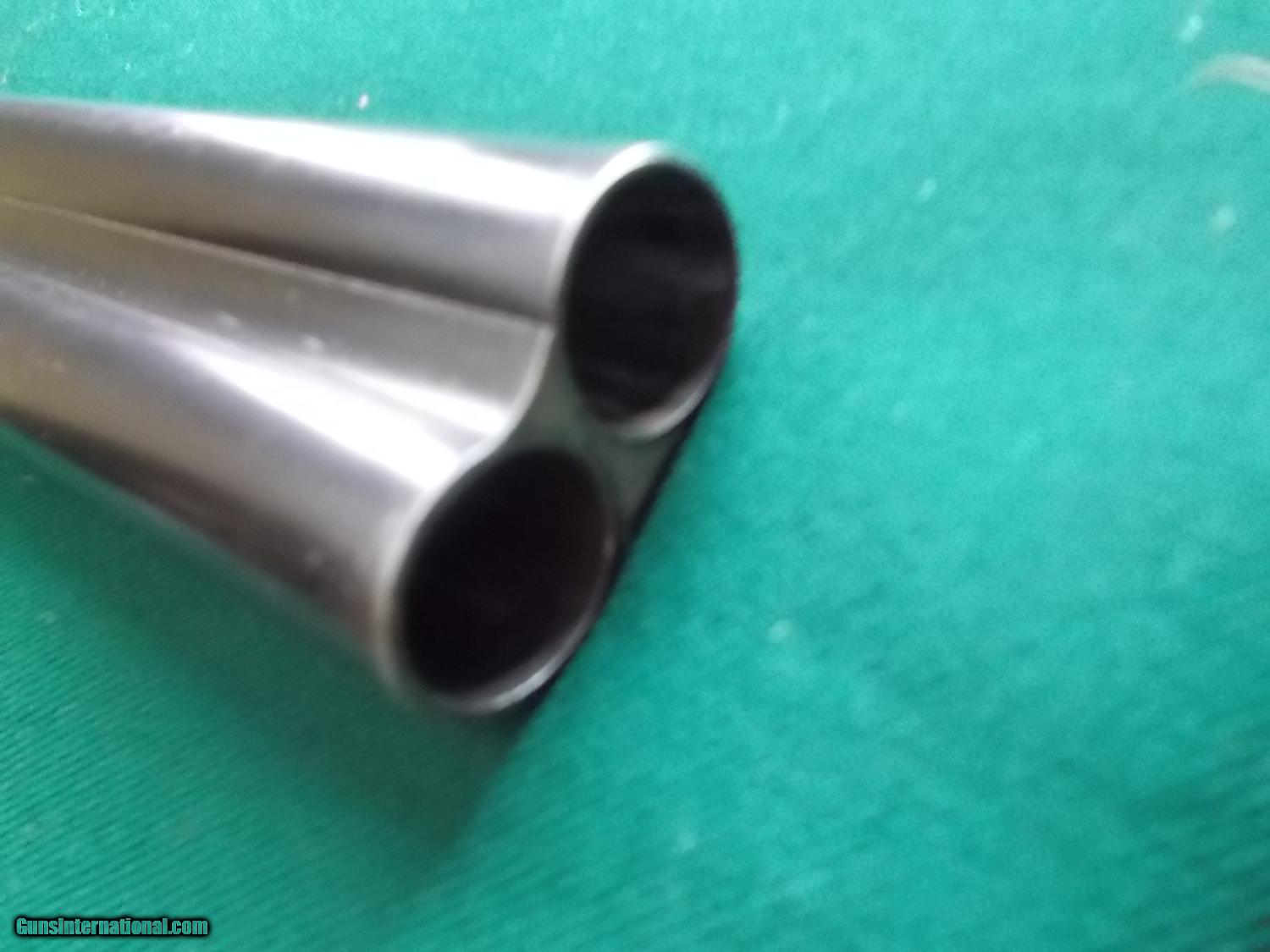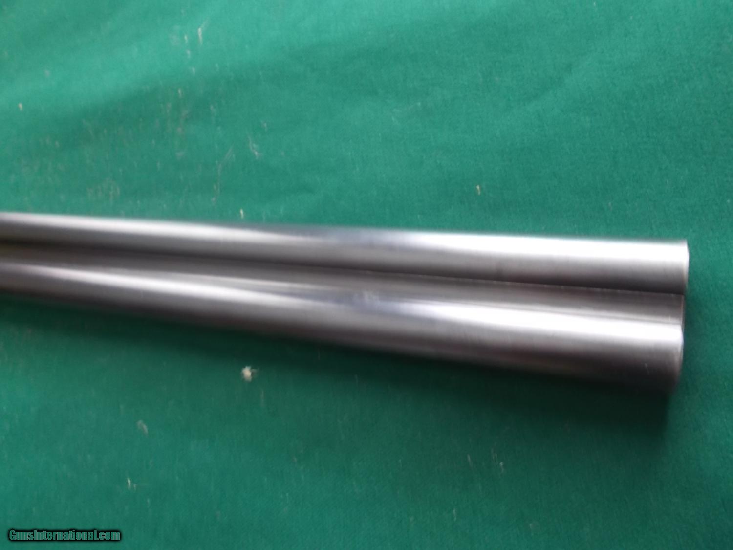 Description: 28" bbls. F/IM, double triggers, extractor, solid pistol grip stock splinter forend, checkering smooth, 14 5/8" LOP over Duck vented period pad, stock sice & solid, thin varnish, 90% blue bbls, 25% case colors, solid - tight shotgun SOLD |