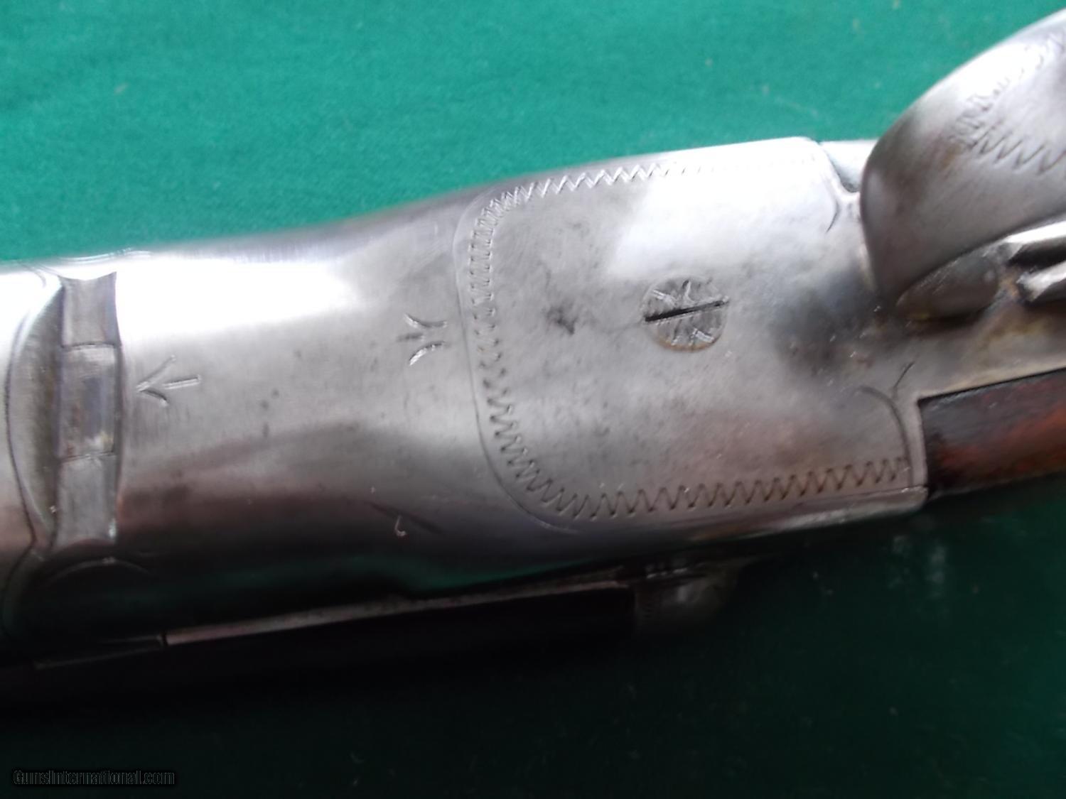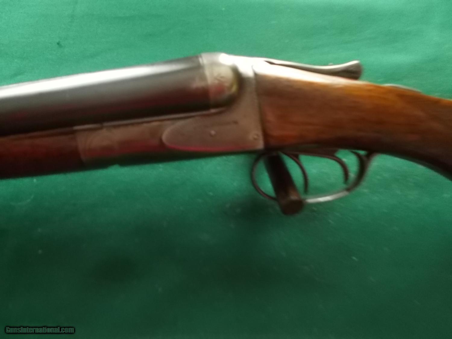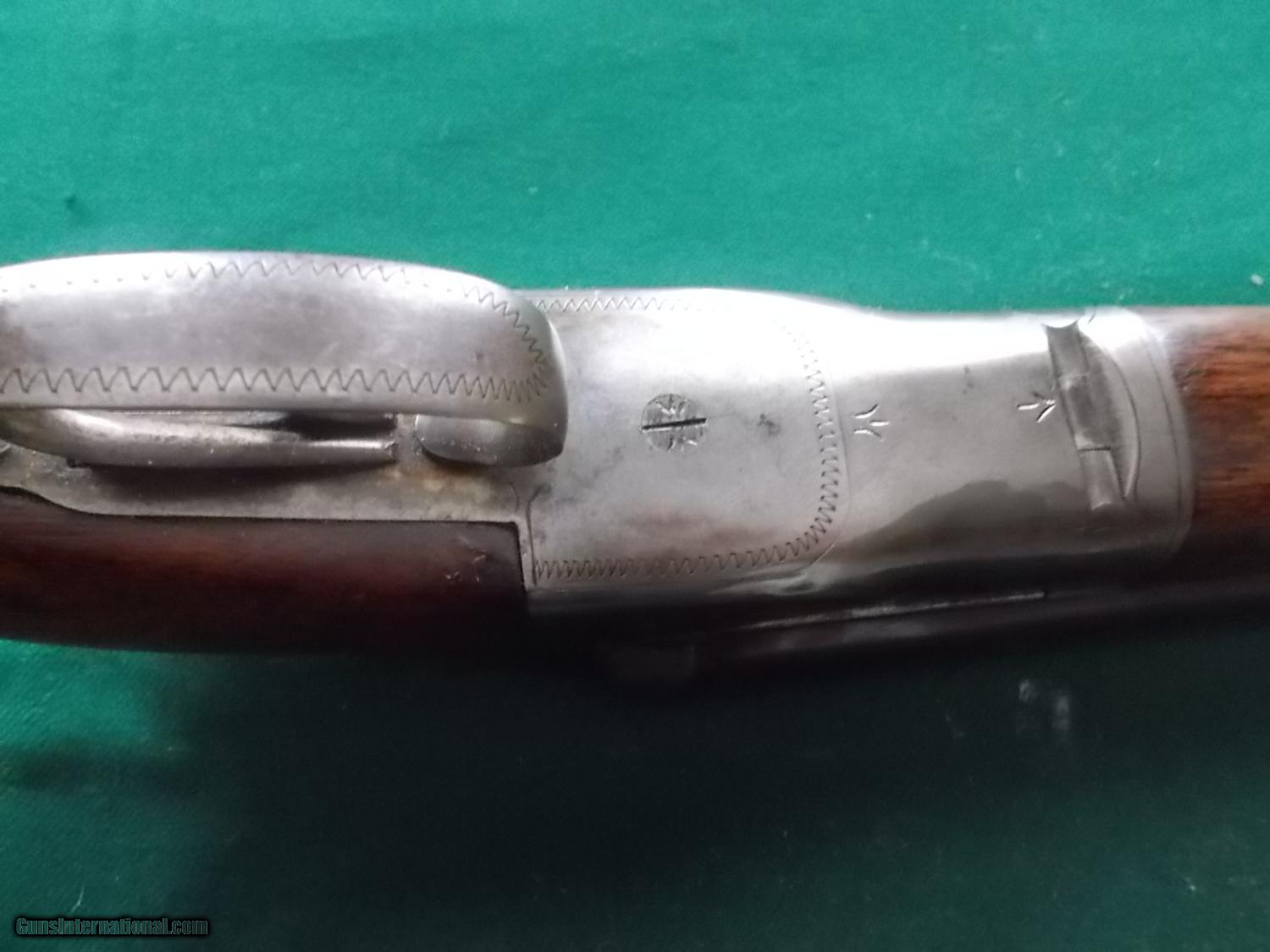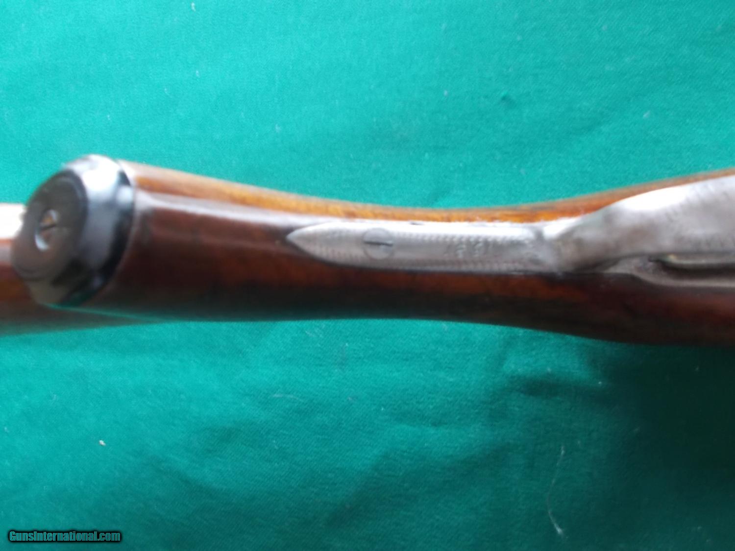 Description: 28" bbls. F/IM, double triggers, extractor, solid pistol grip stock splinter forend, checkering smooth, 14 5/8" LOP over Duck vented period pad, stock sice & solid, thin varnish, 90% blue bbls, 25% case colors, solid - tight shotgun SOLD |