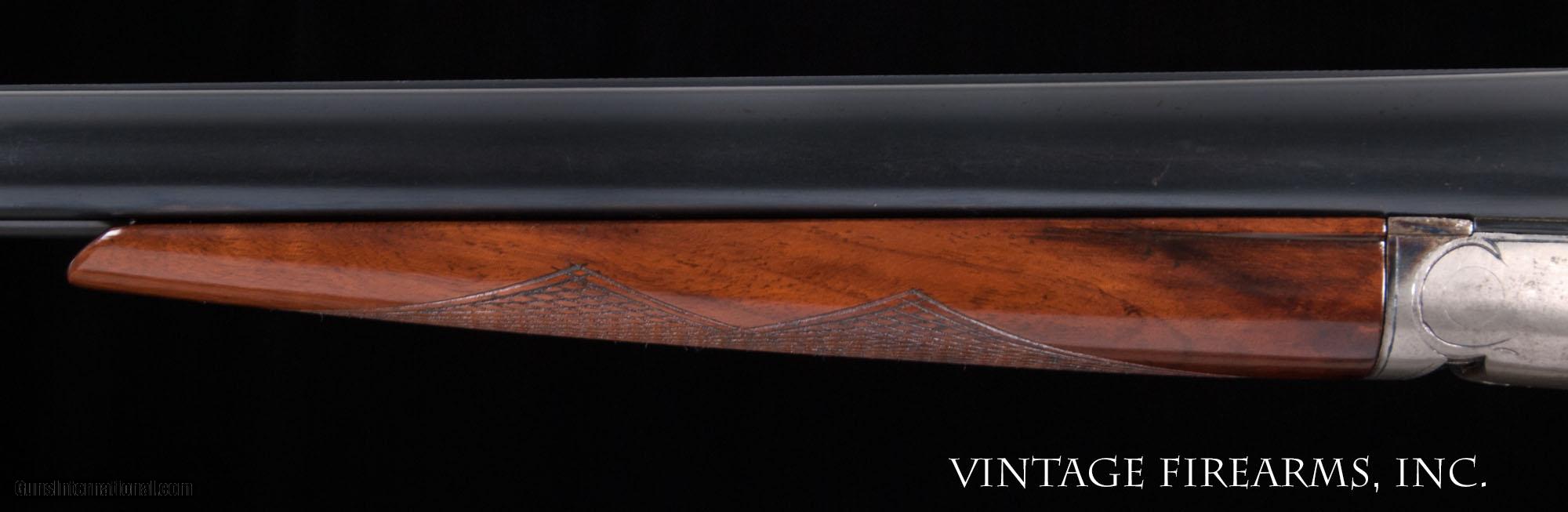 Description: Fox Sterlingworth 16 Gauge SxS 28", 6lbs, GORGEOUS WOOD, PHILLY GUN General Specs: Fox, Year 1928, 16 Gauge, 6lbs 1oz, Side by Side Serial Number: 363551 Anybody who has watched the vintage gun market knows Ansley H. Fox's 16ga. Sterlingworth value has been discovered, all being built on the diminutive 20ga. frame, and consistently the best handling, lightest weight American 16ga. double gun available at any price. When you think of the high value placed on a Parker 16 "O" frame (or 20ga. frame) double gun because of the light weight and balance, the Fox 16 is a bargain! The prices have gone up significantly on Fox guns, with really nice 16ga. guns being bought up and put away for personal use. This fine little Philly Fox, sn363551 built in 1928, is a very fine gun that has been well cared for, with 98% strong factory blue, excellent bores, unaltered 28" #3 weight barrels choked M/F, perfect screws, and a nicely restored factory original set of wood. The barrels are tight on the hinge pin and breech face like a new gun, with the lever way right of center. This is a VFI CERTIFIED GUN, which means our gunsmiths stripped the action to its smallest parts, cleaned them in the Ultrasonic cleaner, inspected each part for integrity, properly lubricated and reassembled the action, making it good for the next generation of use. VFI CERTIFIED GUNS carry a 90 day shooting warranty. I can safely say that not one of the other Sterlingworth 16's for sale today have been disassembled and properly inspected, cleaned, and lubricated for decades. This is a $200 service that is part of the value in a VFI gun. What a great gun for upland birds or sporting clays, with a LOP of 14 1/4" to the factory buttplate and gorgeous condition. Thanks for looking and be sure to visit our company ! Barrels Barrel Length: 28" #3wt Chokes: .016/.031 M/F Bores: excellent Bore Diameter: .659/.658 Wall Thickness: .034/.035 % Blue: 98% factory Chambers: 2 5/8" Ribs: tight Sights: single Action Action: tight, way right of center Ejectors or Extractors: extractors Case Color: 20% Screws: perfect Engraving: clear Trigger Type: double Trigger Guard Color: 50% Stock Type: capped pistol grip/splinter forend LOP: 14 1/4" LOP To End Of Wood: 14" DAH: 2 7/8" DAC: 1 3/4" Cast: 0 Checkering Condition: excellent, factory Butt Treatment: factory plate There are more photos upon request. We offer a 30 day mechanical warranty on this fine shotgun. Call us for full details. PLEASE SEE MY OTHER FINE VINTAGE FIREARMS. Just open one of my ads and click on the line that says “see all items from this seller” and a very nice list of fine sporting and collectible arms will appear. I have many more fine sxs shotguns not yet listed. Thanks for looking! We will be at the SOUTHERN SIDE BY SIDE CHAMPIONSHIP & EXHIBITION, Celebrating Spring Classic 17th Anniversary April 22-24, 2016 in Sanford, NC! We employ a full time gunsmith on premises and can perform alterations to suit your needs within a few weeks of purchase. Payment Methods: Money Order, Certified Check, Personal Check, Wire Transfer Inspection Period / Return Policy: Three Days from the date the item was received. Sales Tax: 6% Michigan Only Shipping & Insurance: Ground $45.00 We ship internationally! Item Condition: Used Requires FFL?: Yes If you have any questions about this item or payment, please email or call us directly, at #616-292-6240. Thanks! Jay Shachter, Vintage Firearms, Inc SOLD Curio/Relic: Yes |