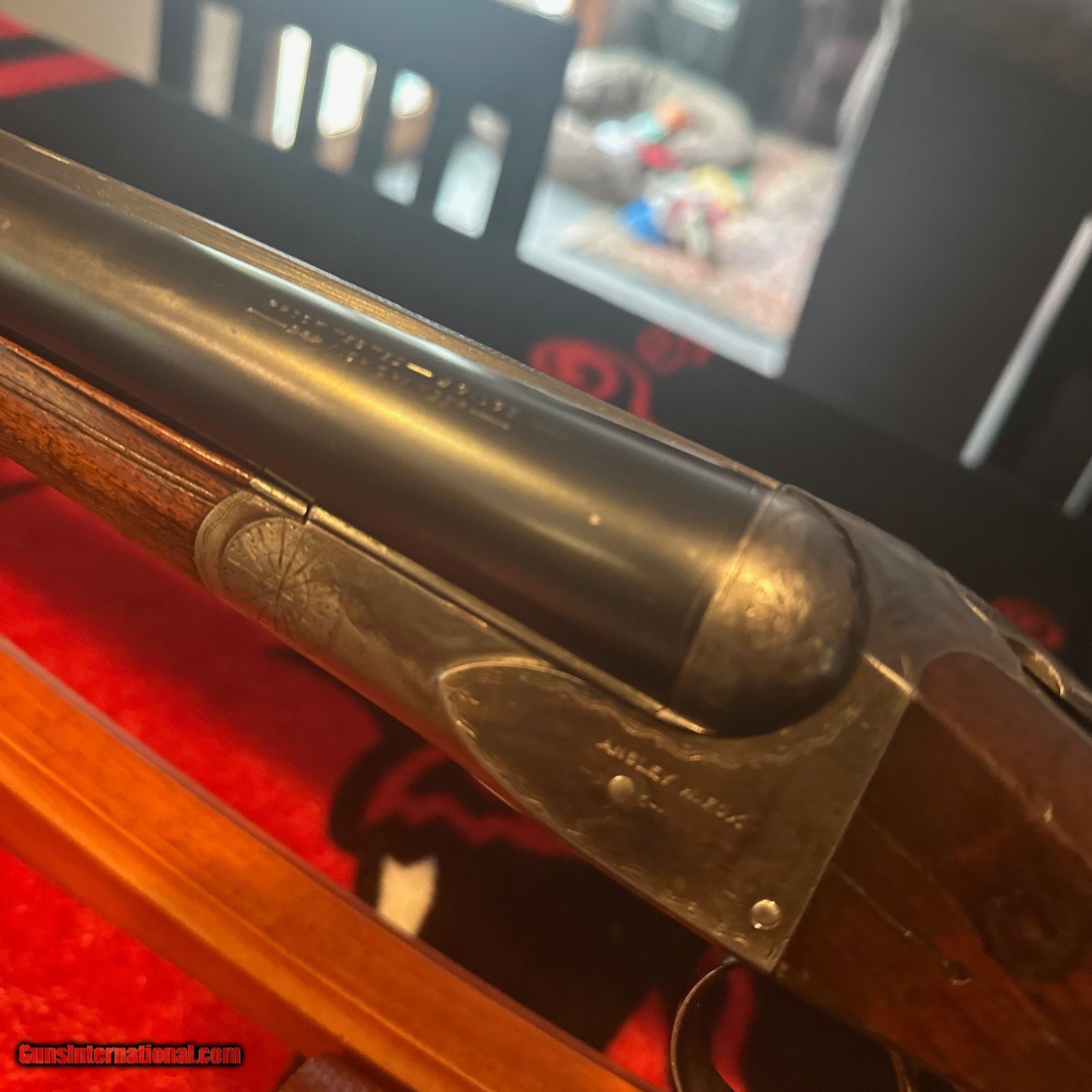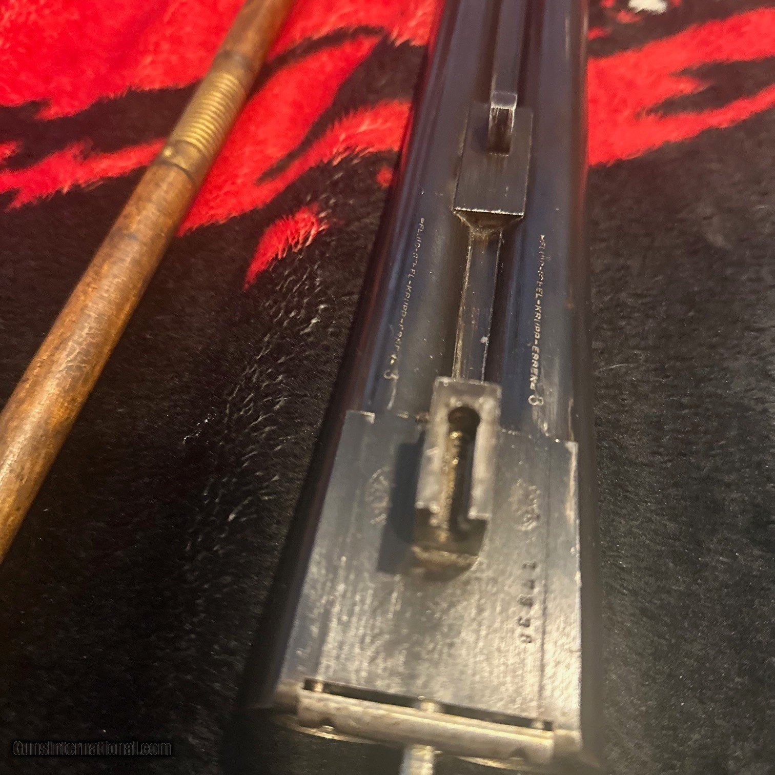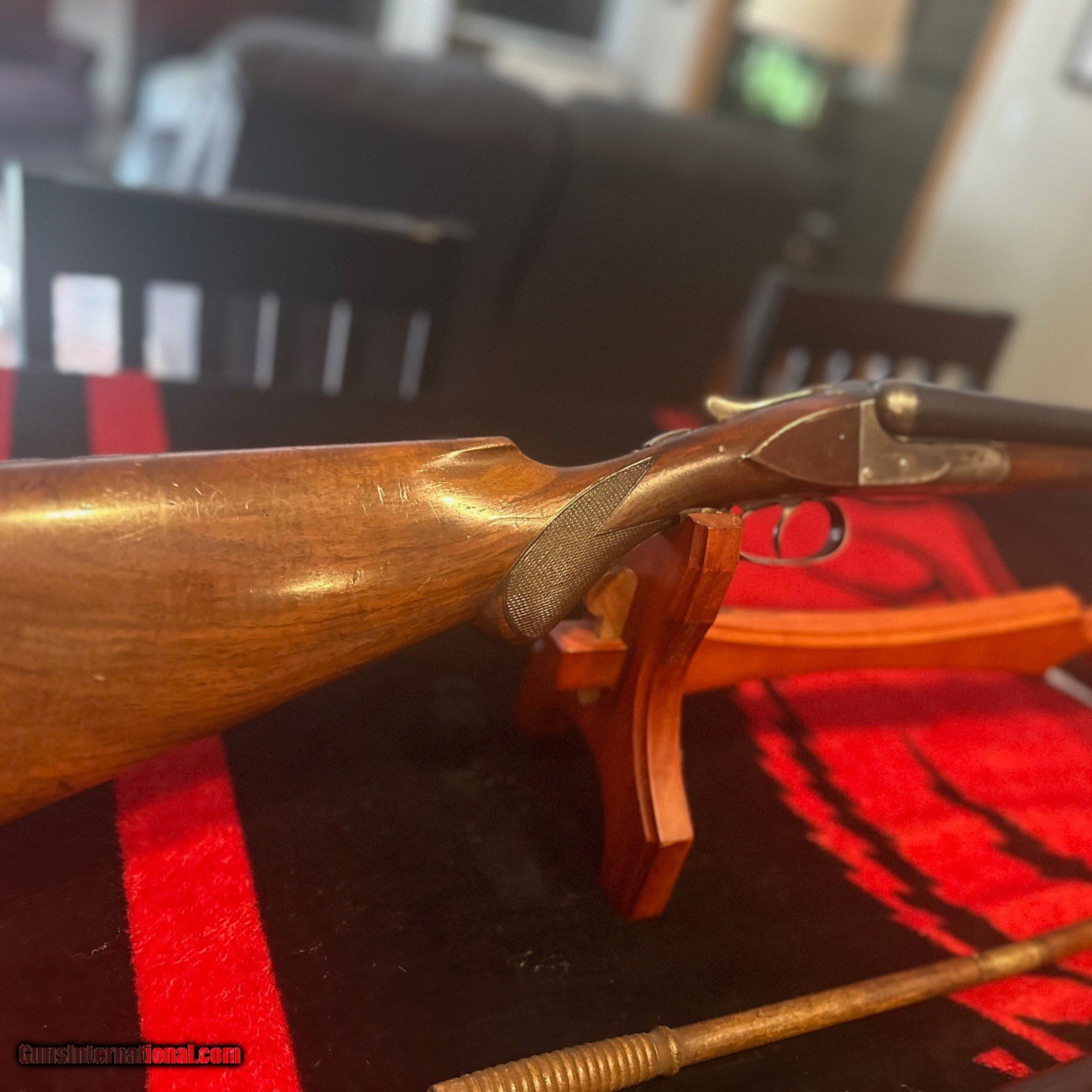 Description: SOLD PENDING FUNDS----- I purchased this project gun a while back to fix up and shoot but I have decided that the work needed is beyond my capabilities so I am moving it along to someone else who may want it. It is an early Fox A Grade 12 gauge with two barrels. The original Krupp barrels were trimmed at some time to 25 ¼”. They retain chokes of ic/ic. They are in very good condition with no rust and mirror bores. They are #3 weight. The gun must have been sent back to Savage at a later date to be fitted with a set of 28” Fox Savage Barrels, choked M/IM. These barrels are also serialized to the gun. These barrels are also in excellent condition with good bluing and no rust or dents. The bores are mirror bright. As noted in one of my pictures, the original Krupp Barrels are missing the spring and plate that should be on the barrel lug. As a result, they will not snap onto the forend. The gun locks up tight with the 28” replacement barrels and the lever is just right of center. I have not shot it but it fires fine on snap caps, and the automatic safety still works, but it very stiff to put in the firing position. The stock is in rough shape. It has been pinned twice, and a long crack has been glued. There is also a small chip out of the stock at the right side of the tang. I do not know if it can be saved or not, nor do I know if it is safe to shoot in this condition. The lop is 14”, the DAC is 1 ¾” and the DAH is 2 ¾”. The replacement barrels are #1 weight. It comes with what I believe is an original wooden cleaning rod and a leather lace up butt pad. If you would like any more information, just ask. Price is $775 shipped to your FFL. Thanks if looking. I am selling this gun as is, with no right of return. SOLD Manufacturer: fox Model: A Barrel Length: 28 Condition: good Wood Condition: bad Bore Condition: Excellent LOP: 14 1/4 |