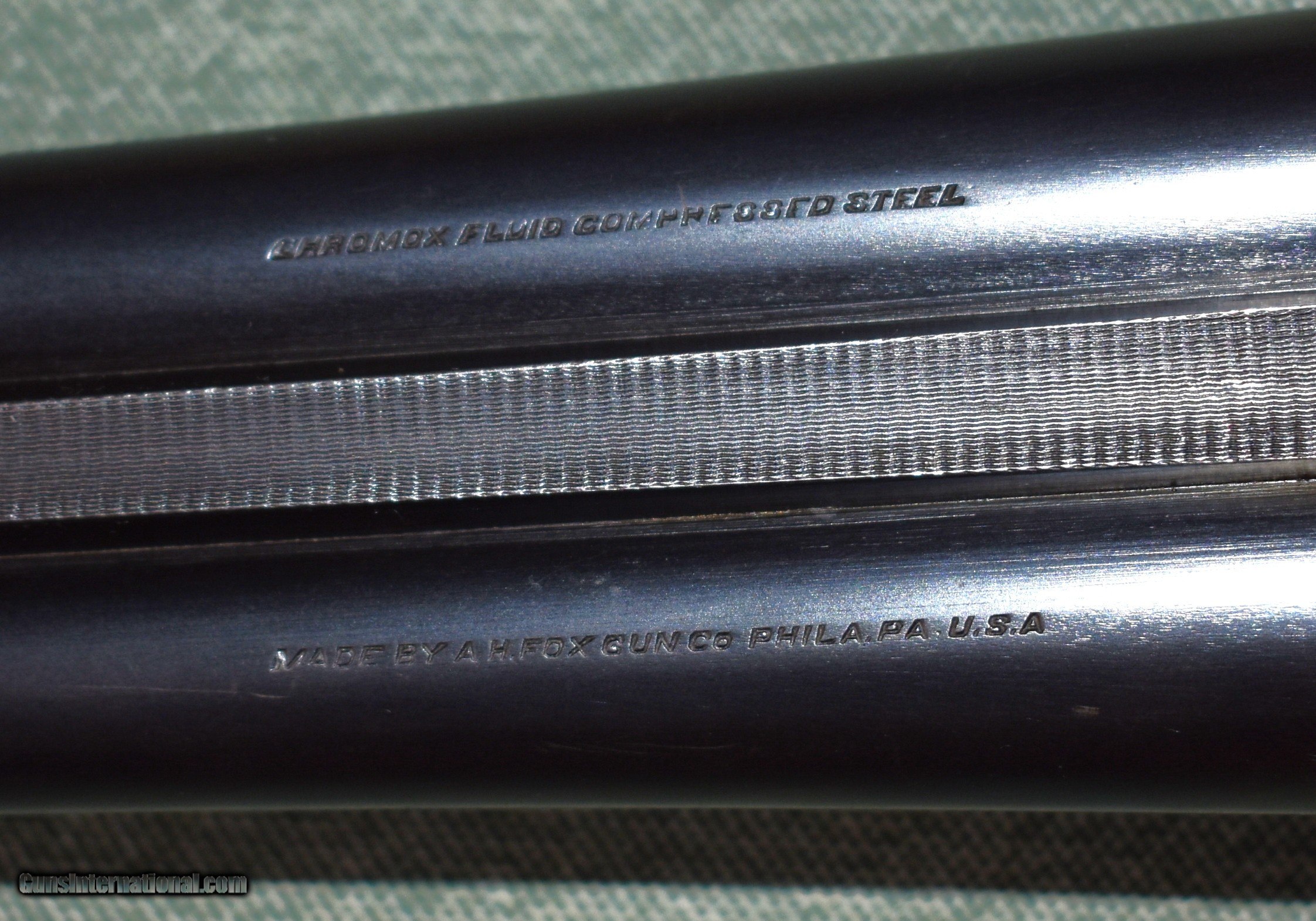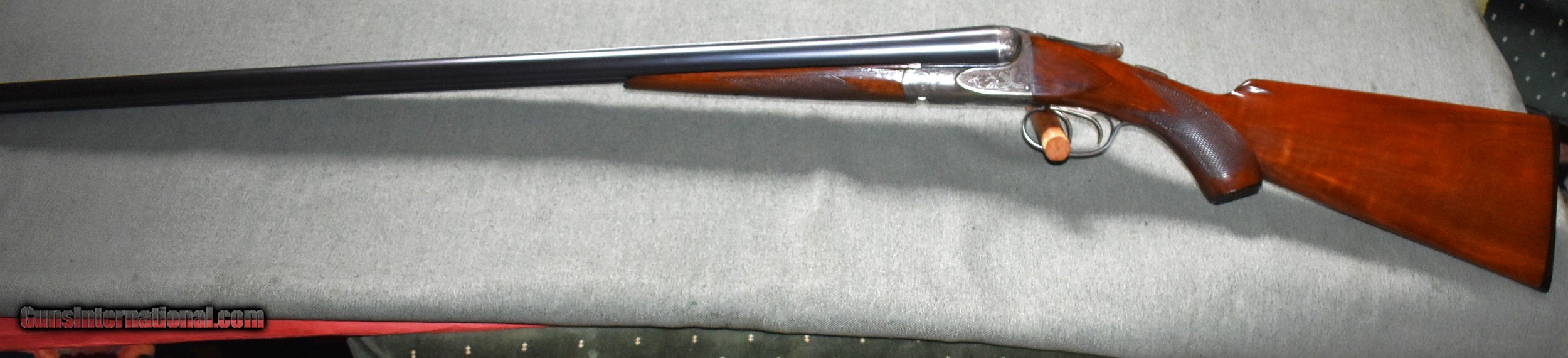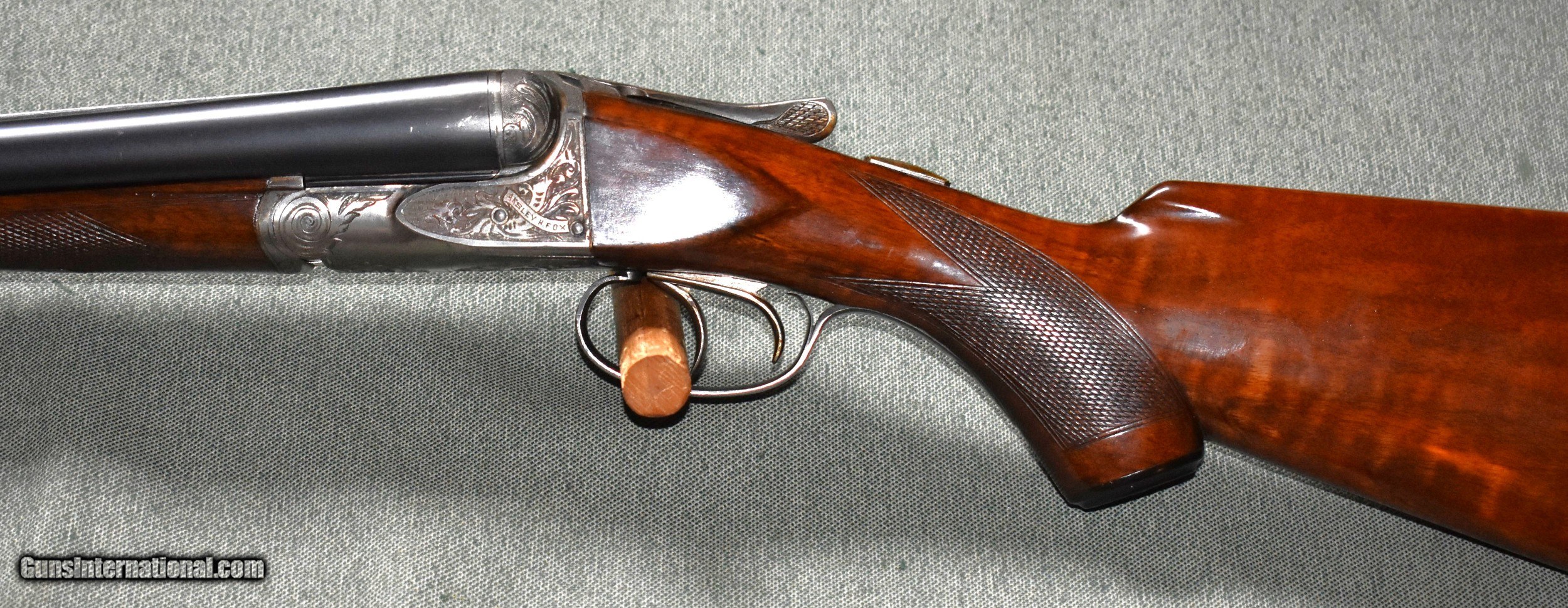 Description: SALE PENDING. A.H.Fox 12 gauge A grade built in 1924 in Philadelphia. This gun is in outstanding all original condition. It retains98% of the original barrel blue,50% of the original case colors,and 98% of the original wood finish. The 30" barrels are Chromox steel and are choked modified (.018") and full (.042"). The barrels are on face and lock up to the action with no play..The top lever is to the right indicating that the gun has been shot very little. All screws are timed and undamaged. Very nice stock dimensions of 141/4"LOP over the factory buttplate,15/8" at comb,and 27/8" at heel. This would make a great pheasant or dove gun or a nice vintager clays gun. Very hard to find in this condition. C&R eligible. SOLD Shotgun Gauge: 12 Gauge Manufacturer: A.H.Fox Philadelphia Model: A Grade Serial Number: 30767 Barrel Length: 30 Chambers: 23/4 Ejectors: extractors Condition: excellent Metal Condition: excellent Wood Condition: excellent Bore Condition: mint Barrel Type: Chromox Steel Action: Double Barrel Triggers: Double Stock Dimensions: 141/4"x15/8"x27/8 Fore End: Splinter Butt Pad: Factory Buttplate Manufacture Date: 1924 Choke Left: Full Choke Right: Modified |