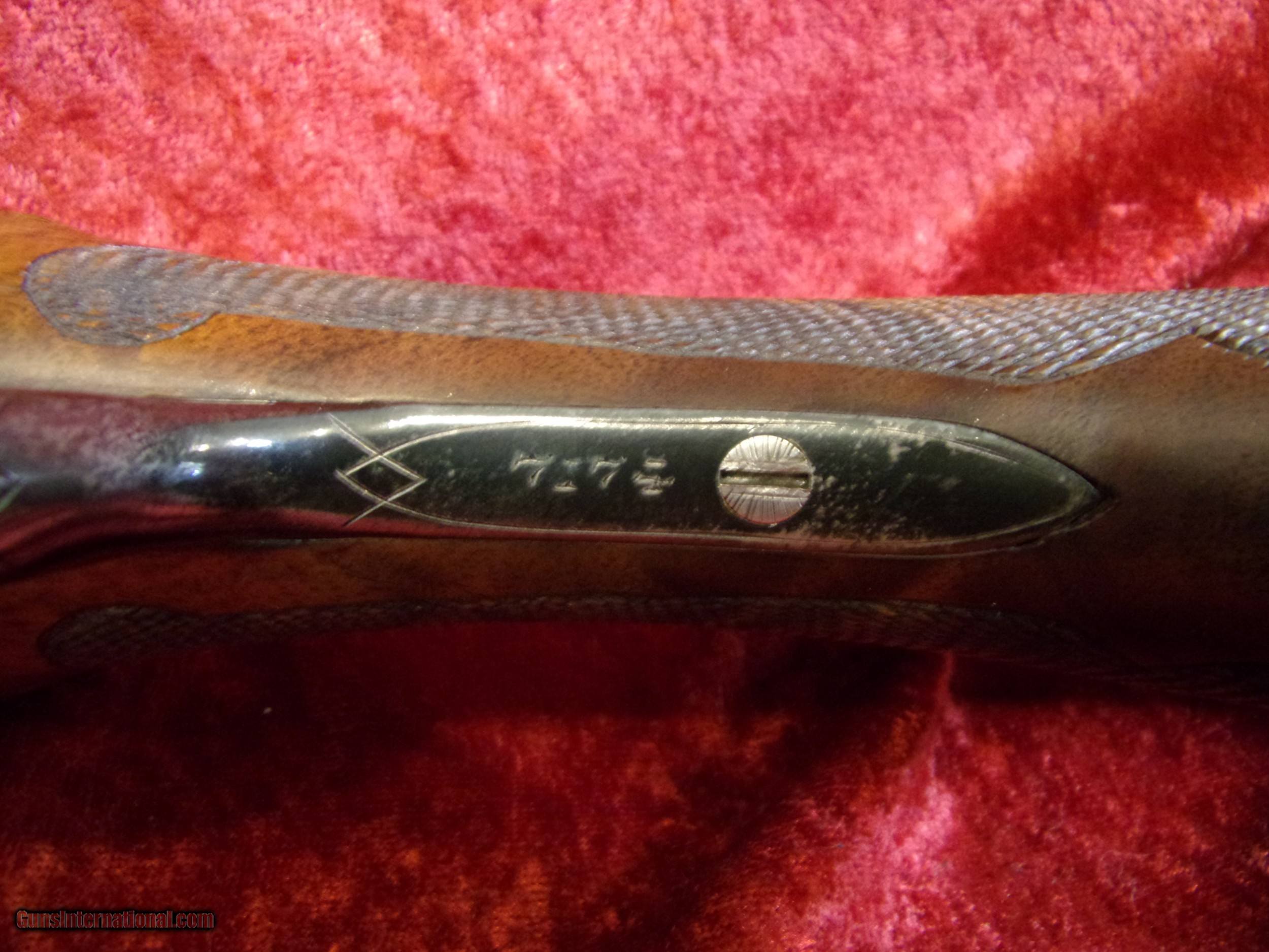 Description: A.H. Fox A Grade 12 gauge SxS double triggers 3-barrel set (28", 30", 32") Upgraded by Savage Arms--nicely recase hardened! This early A.H. Fox A Grade 12 gauge double barrel shotgun with double triggers and is a non-ejector. The serial # is 7174A (all matching). According to a letter from the late Michael McIntosh dated 2/9/99, it most likely was made in 1907. See picture of the letter. The gun was "upgraded" by Savage Arms sometime before then, unsure of date as Savage's records have been lost according to a recent inquiry. All metal parts have been nicely re-case hardened and the butt stock and two fore-ends (one beaver-tail, one splinter) done in well figured walnut with elaborate checkering. According to Mr. McIntosh's best guess, the gun was originally made with the 28" barrels, returned to Fox sometime later and fitted with the 30" barrels. The 32 in ch barrels were made by Savage when they "upgraded" it. Please see pictures. MORE PICS AVAILABLE!! The 28" barrels are marked as follows: Right barrel is marked "Krupp Fluid Steel Made by" and the left barrel is marked "A.H. Fox Gun Co. Phila. PA 12 GA - 2 3/4" chamber" on the underside, the right barrel is marked "SK IN" and the left barrel is marked "SK OUT". The 30" barrels are marked as follows: Right barrel is marked "CHROMOX FLUID COMPRESSED STEEL". The left barrel is marked "MADE BY A. H. FOX GUN CO PHILA PA U.S.A.". No marking as to choke. Measure Mod & IM. The 32" barrels are marked as follows: Right barrel is marked "PROOF TESTED 12 GAUGE 2 3/4" INCH CHAMBER". The left barrel is marked "SAVAGE ARMS CORPORATION CHICOPEE FALLS, MASS U.S.A." No marking as to choke. Measure Full & Full.
