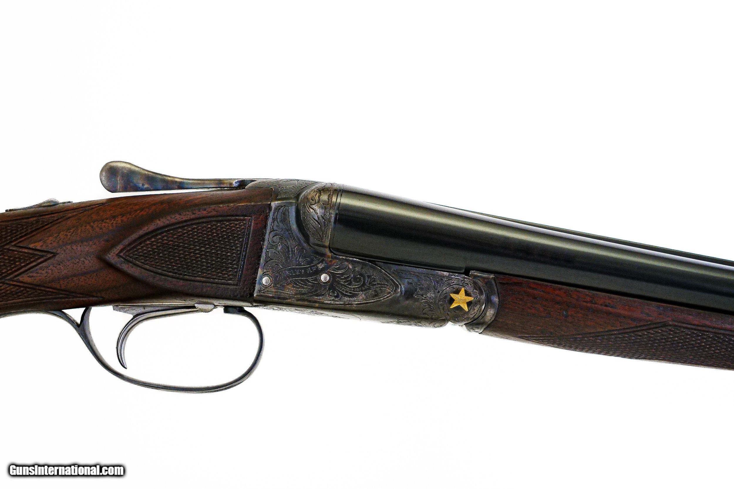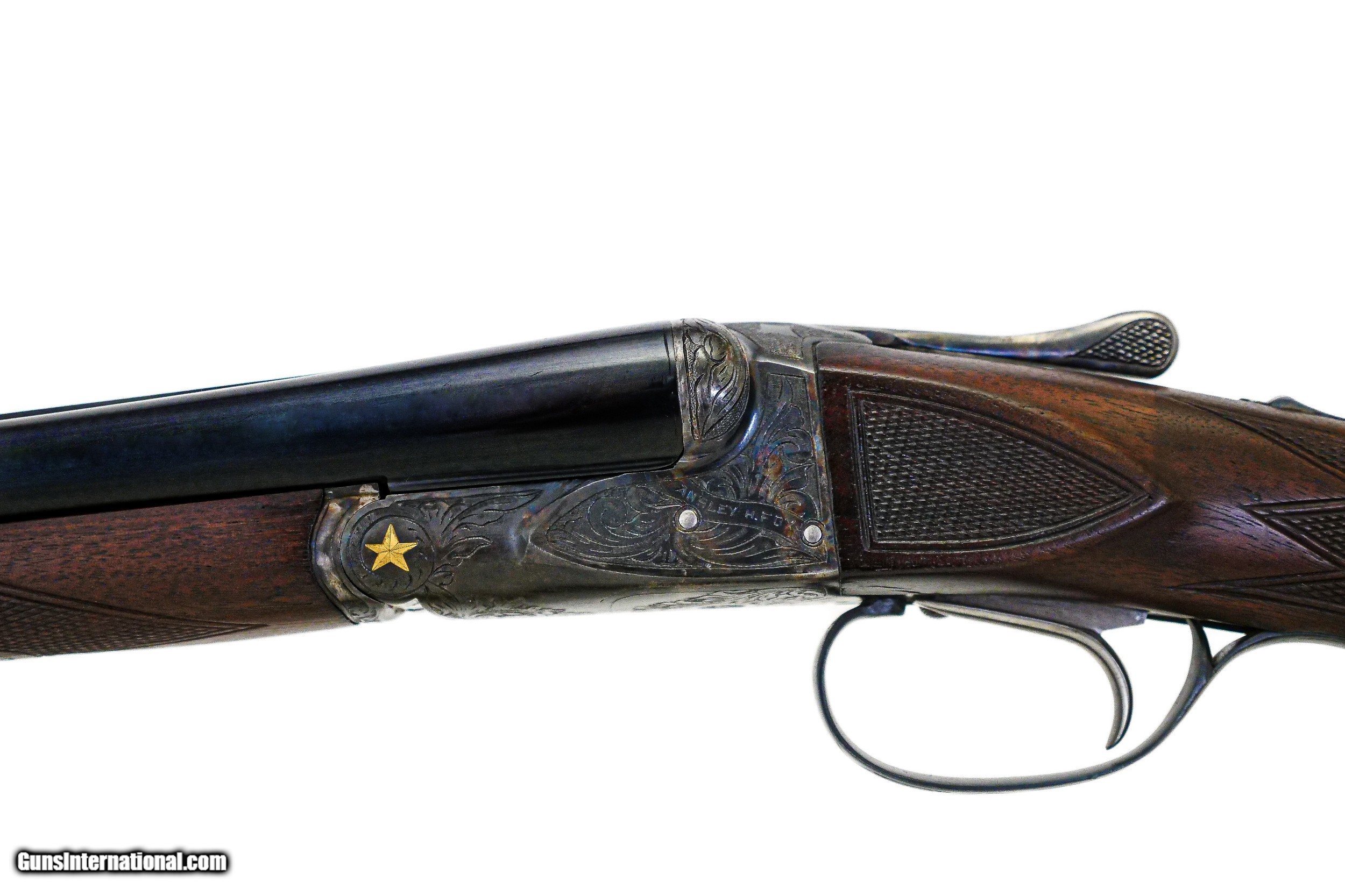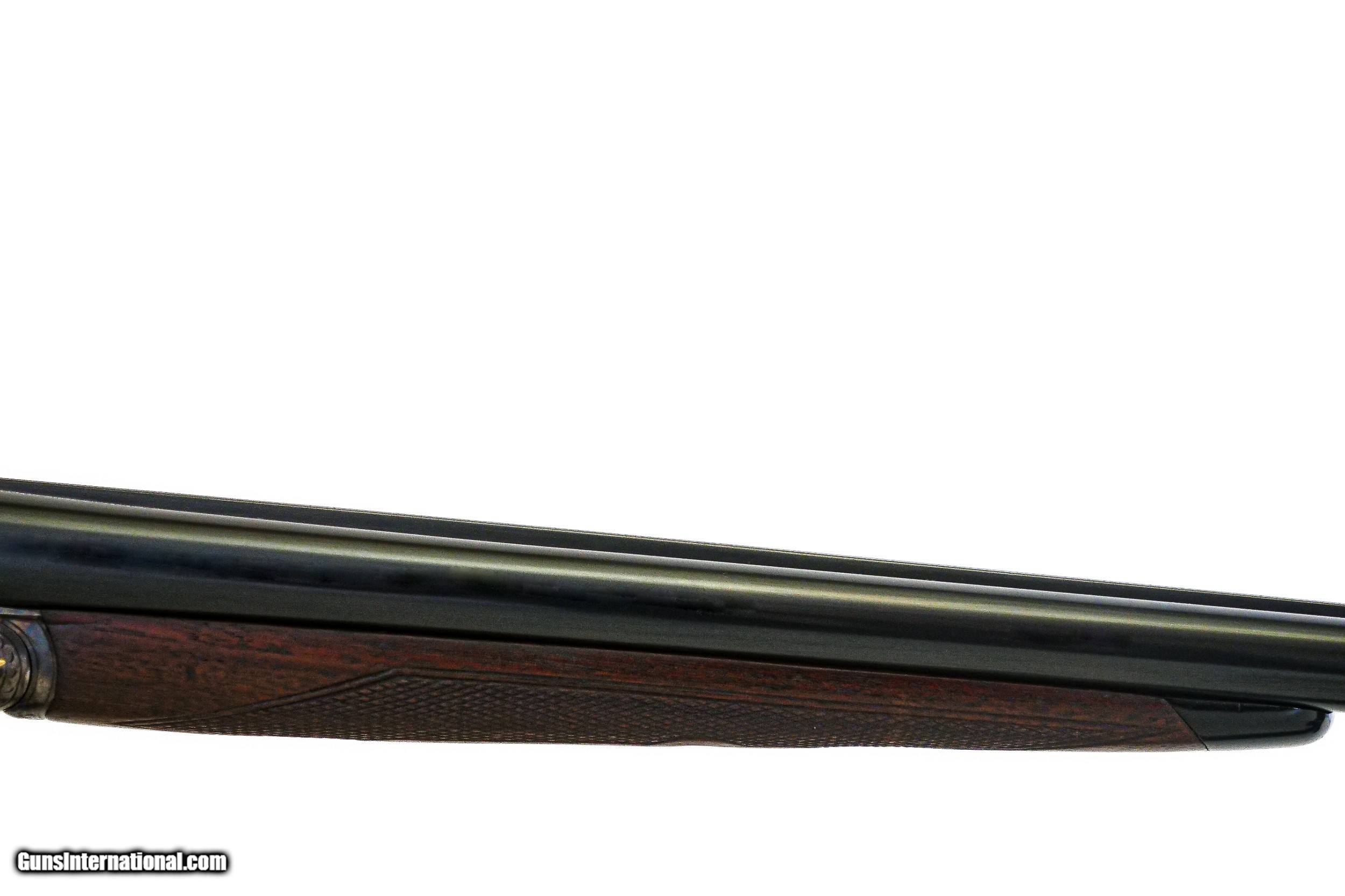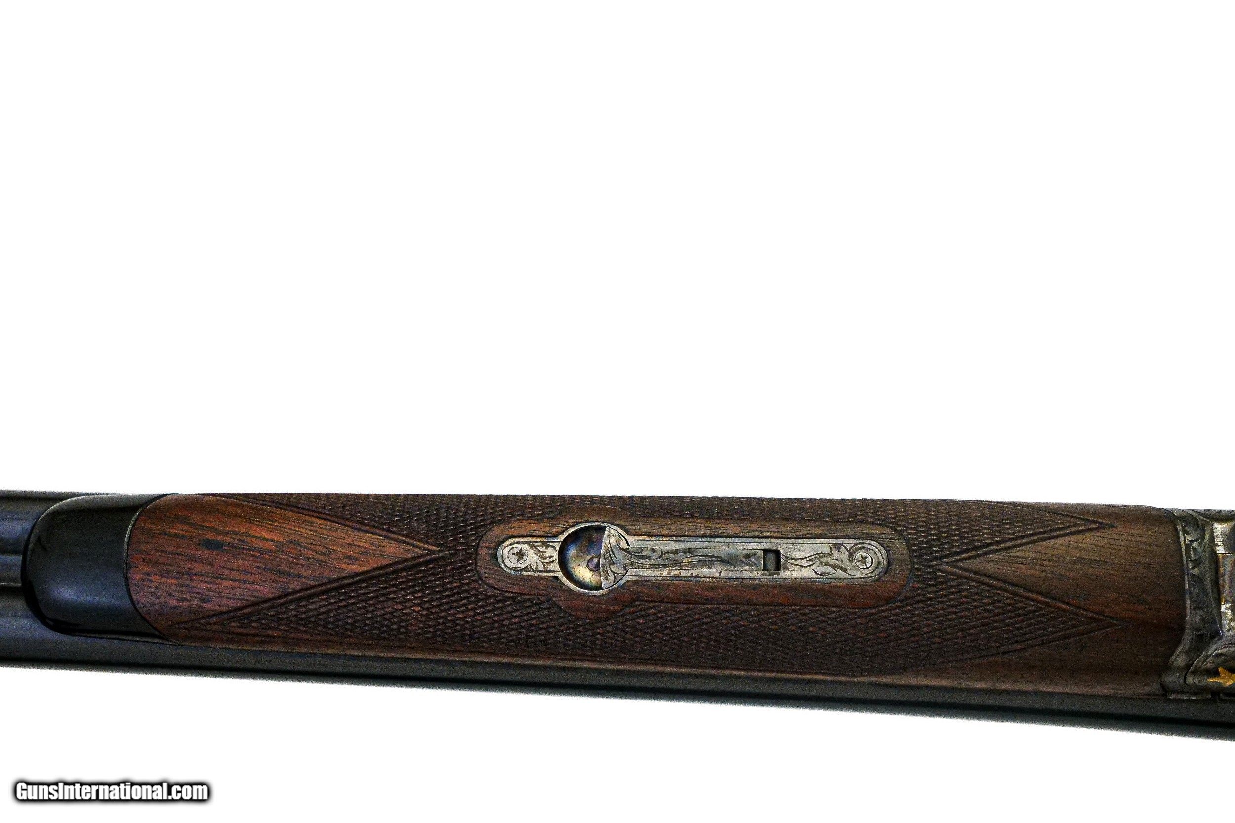 Description: A.H. Fox - AE Grade, 20ga. 26" Barrels Choked CYL/MOD. Barrels choked Cylinder and Modified, this is one of the last guns made, automatic ejectors, straight grip, splinter forend, Hawkins pad, 13 5/8” LOP to factory single selective trigger, 2 ¾” chambers, twin ivory sights, deep late style A grade engraving with factory gold inlayed star on hinge pin, checkered side panels, 100% original, late case coloring, 100% everything everywhere, a very late gun that is in like-new condition. Inv: 51713 6 lbs. 3 oz. $8,750.00 CT Shotgun/Galazan maintains the largest inventory of A.H. Fox Shotguns. We have handled, many of the highest-grade guns that have ever came to market. We are also the sole manufacturer of the A.H. FOX shotguns. Nobody knows A.H Fox shotguns more than we do, We also inspect and check all the guns that we sell and carry a full line of cases and accessories. SOLD |