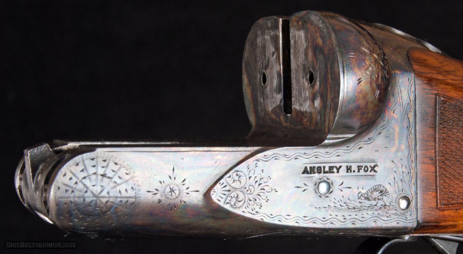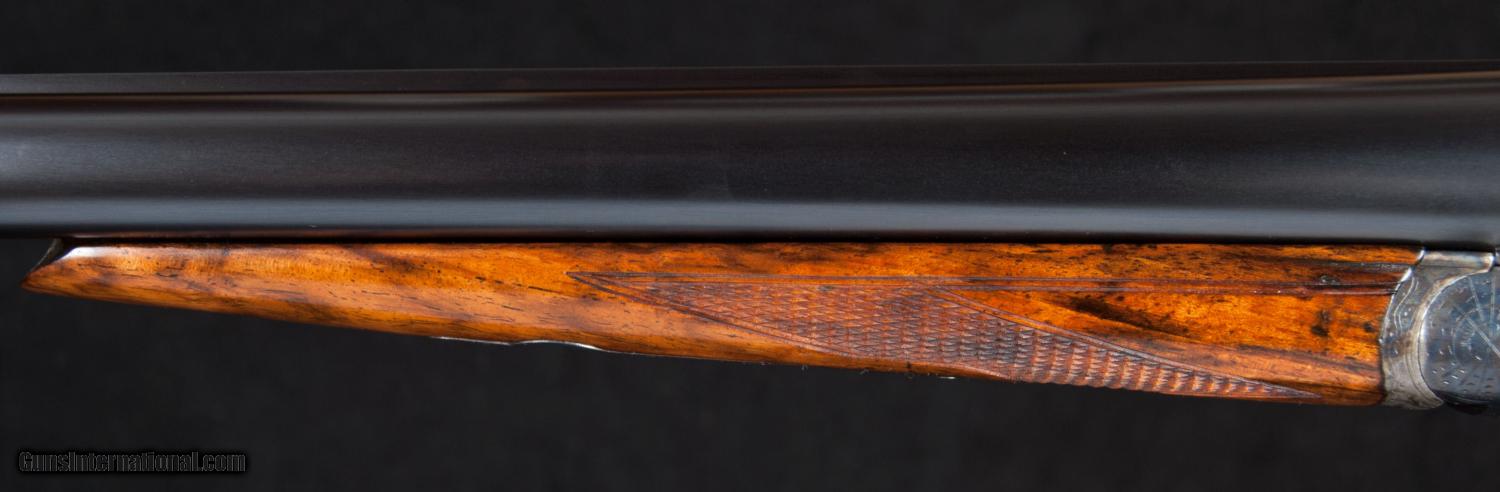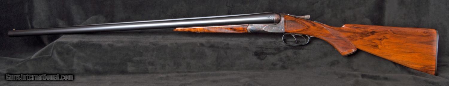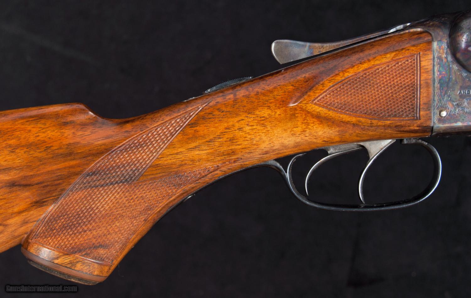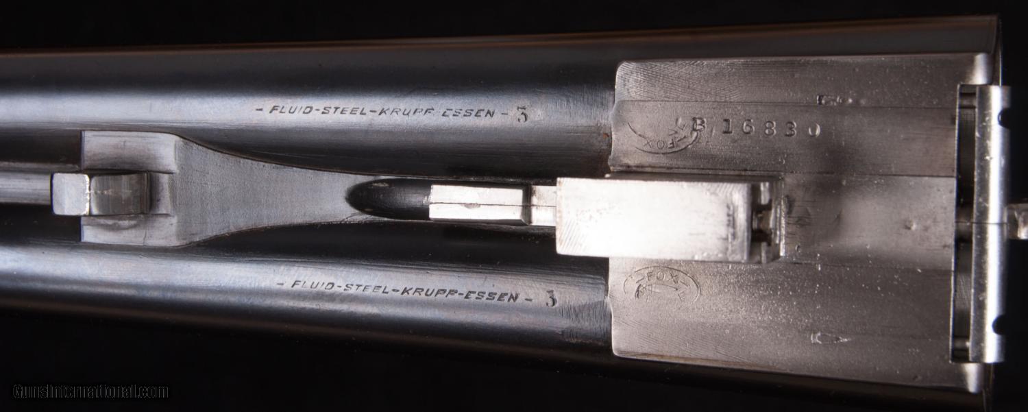 Description: A.H. Fox BE Grade 12 Gauge SxS Shotgun LIGHTWEIGHT, 6LBS 11OZ FIELD GUN! General Specs: Fox, Year 1910, 12 Gauge, 6lbs 11oz, Side by Side Serial Number: 16830 Certain guns just make an impression. Finding a vintage American double in 12 gauge that weighs 6 3/4lbs. is a start. Now, add a correct restoration so the gun looks like it just left the factory and you have one heck of a gorgeous bird and clays gun. This fine Fox, sn16830 built in 1910, is configured just as it left the factory right down to the chokes. There just isn’t any doubt in my mind. The early A.H. Fox guns were the best of them all. The internal parts are highly polished by the factory just as they did on their high grade guns. Ansley was still at the helm and everything had to live up to “The Finest Gun in the World” slogan. The wood is original to the gun and is better than most B Grades you will ever see. We have a copy of the original order card and the gun is "as shipped", with the exception of the restoration. The Fox B Grade was the first model to be phased out in 1918, so there are not a lot of them out there, especially with ejectors. With the great stock dimensions, light weight, and quick pointing characteristics this is a gun you will cherish in the field for decades. The fact that it will increase in value as you enjoy its use is a real bonus! The 28" Krupp steel, #3 weight barrels are in excellent condition, with 100% rust blue, clear lettering and engraving, reinforced forend lug for heavier loads, factory choked at .006/.018 (shown as Cylinder/Mod on the order card but measure SK/M in today's venacular), minimum barrel wall thickness 28 thou right, 25 thou left, mirror bores, 2 3/4" chambers, tight ribs, no dents, tight on breech face and hinge pin like a new gun. The action has the fine English scroll with birds on the right and left side known as the "early style" B engraving. It is elegant and clear and the style chosen by Ansley Fox to represent this level of gun. The case color has been restored to 99%, screws are excellent, lever is well right of center, the action was stripped and cleaned internally during the restoration, double triggers are crisp with pulls of 4.25 right trigger, 4.75 left trigger, which is just about perfect for hunting, trigger guared 100% blue, ejectors strong and timed, all in excellent mechanical order with a 30 day shooting warranty. The wood is original to the gun and has nice figure both sides, which is hard to find in a B Grade. B Grade wood usually only had figure on one side, plain on the other, or it would have been used for C Grade guns. Wood is nicely restored French walnut, with expertly recut checkering, no splits or cracks, 14 1/8" LOP to factory butt plate, 2 5/8" drop at heel, 1 5/8" drop at nose of comb, neutral cast for good modern dimensions, and good wood to metal fit. We can bend the stock to your dimensions for an added $200 within 21 days of purchase. The combination of features found in this gun are very difficult to find. If you want a 12ga. gun you can carry all day, one that is lighter than almost all Parker 16ga. guns and Model 21 20ga. guns, that handle like a fine English double and can handle the loads we want to shoot at pheasants and long western birds, this is your gun. Nicely restored guns are selling extremely well in today's marketplace, as modern shooter/collectors want guns that look nice and have the protective finishes intended by the maker. Don't let this one get away! Barrels Barrel Length: 28" Chokes: .006/.018 Bores: excellent Bore Diameter: .732/.741 Wall Thickness: .028/.025 % Blue: 100% Chambers: 2 3/4" Ribs: tight Sights: single Action Action: tight, way right of center Ejectors or Extractors: ejectors Case Color: 100% Screws: excellent Engraving: clear excellent. Early B Trigger Type: double, crisp Trigger Guard Color: 100% Stock Type: capped pistol grip/splinter forend LOP: 14 1/8" LOP To End Of Wood: 13 7/8" DAH: 2 5/8" DAC: 1 5/8" Cast: 0 Checkering Condition: perfect Butt Treatment: factory plate There are more photos upon request. We offer a 30 day mechanical warranty on this fine shotgun. Call us for full details. PLEASE SEE MY OTHER FINE VINTAGE FIREARMS. Just open one of my ads and click on the line that says “see all items from this seller” and a very nice list of fine sporting and collectible arms will appear. I have many more fine sxs shotguns not yet listed. Thanks for looking! We employ a full time gunsmith on premises and can perform alterations to suit your needs within a few weeks of purchase. Payment Methods: Money Order, Certified Check, Personal Check, Wire Transfer Inspection Period / Return Policy: Three Days from the date the item was received. Sales Tax: 6% Michigan Only Shipping & Insurance: Ground $45.00 We ship internationally! Item Condition: Used Requires FFL?: Yes If you have any questions about this item or payment, please email or call us directly, at #616-292-6240.Thanks! Vintage Firearms, Inc SOLD Curio/Relic: Yes |