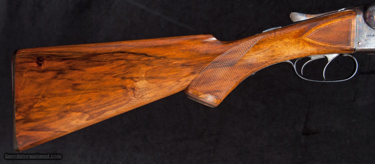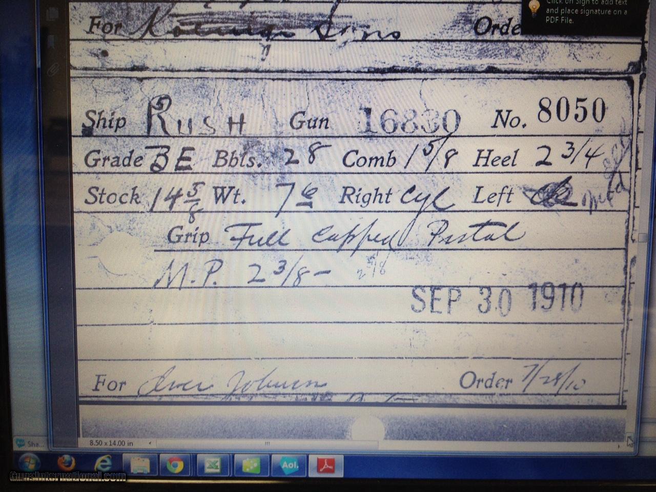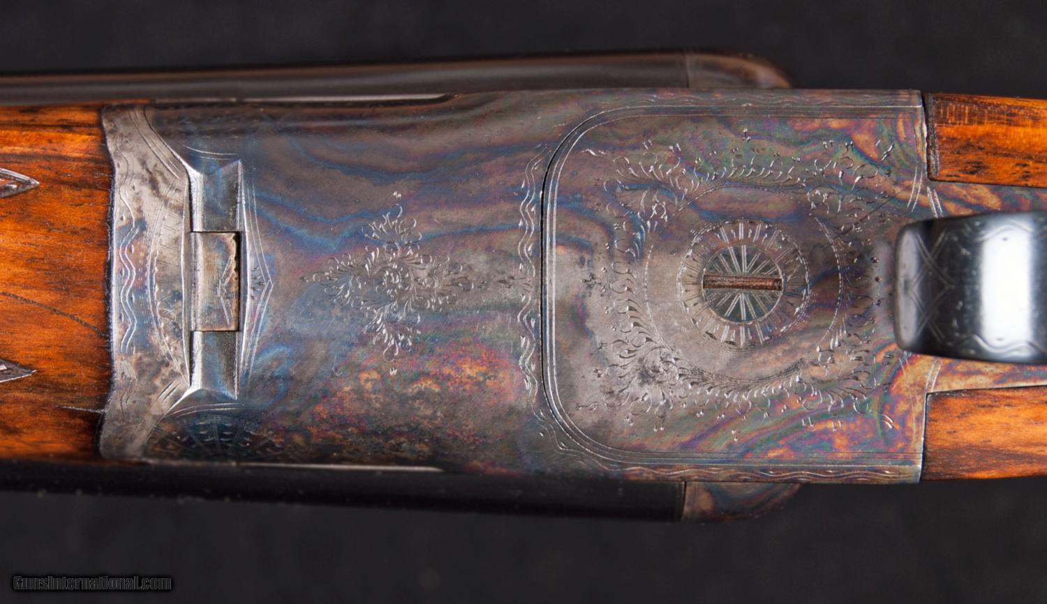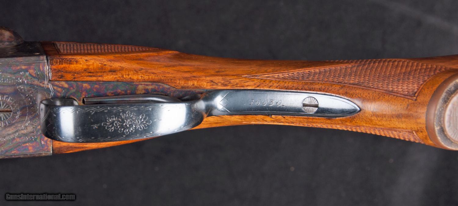 Description: A.H. Fox BE Grade 12 Gauge SxS Shotgun LIGHTWEIGHT, 6LBS 11OZ FIELD GUN! General Specs: Fox, Year 1910, 12 Gauge, 6lbs 11oz, Side by Side Serial Number: 16830 Certain guns just make an impression. Finding a vintage American double in 12 gauge that weighs 6 3/4lbs. is a start. Now, add a correct restoration so the gun looks like it just left the factory and you have one heck of a gorgeous bird and clays gun. This fine Fox, sn16830 built in 1910, is configured just as it left the factory right down to the chokes. There just isn’t any doubt in my mind. The early A.H. Fox guns were the best of them all. The internal parts are highly polished by the factory just as they did on their high grade guns. Ansley was still at the helm and everything had to live up to “The Finest Gun in the World” slogan. The wood is original to the gun and is better than most B Grades you will ever see. We have a copy of the original order card and the gun is "as shipped", with the exception of the restoration. The Fox B Grade was the first model to be phased out in 1918, so there are not a lot of them out there, especially with ejectors. With the great stock dimensions, light weight, and quick pointing characteristics this is a gun you will cherish in the field for decades. The fact that it will increase in value as you enjoy its use is a real bonus! The 28" Krupp steel, #3 weight barrels are in excellent condition, with 100% rust blue, clear lettering and engraving, reinforced forend lug for heavier loads, factory choked at .006/.018 (shown as Cylinder/Mod on the order card but measure SK/M in today's venacular), minimum barrel wall thickness 28 thou right, 25 thou left, mirror bores, 2 3/4" chambers, tight ribs, no dents, tight on breech face and hinge pin like a new gun. The action has the fine English scroll with birds on the right and left side known as the "early style" B engraving. It is elegant and clear and the style chosen by Ansley Fox to represent this level of gun. The case color has been restored to 99%, screws are excellent, lever is well right of center, the action was stripped and cleaned internally during the restoration, double triggers are crisp with pulls of 4.25 right trigger, 4.75 left trigger, which is just about perfect for hunting, trigger guared 100% blue, ejectors strong and timed, all in excellent mechanical order with a 30 day shooting warranty. The wood is original to the gun and has nice figure both sides, which is hard to find in a B Grade. B Grade wood usually only had figure on one side, plain on the other, or it would have been used for C Grade guns. Wood is nicely restored French walnut, with expertly recut checkering, no splits or cracks, 14 1/8" LOP to factory butt plate, 2 5/8" drop at heel, 1 5/8" drop at nose of comb, neutral cast for good modern dimensions, and good wood to metal fit. We can bend the stock to your dimensions for an added $200 within 21 days of purchase. The combination of features found in this gun are very difficult to find. If you want a 12ga. gun you can carry all day, one that is lighter than almost all Parker 16ga. guns and Model 21 20ga. guns, that handle like a fine English double and can handle the loads we want to shoot at pheasants and long western birds, this is your gun. Nicely restored guns are selling extremely well in today's marketplace, as modern shooter/collectors want guns that look nice and have the protective finishes intended by the maker. Don't let this one get away! Barrels Barrel Length: 28" Chokes: .006/.018 Bores: excellent Bore Diameter: .732/.741 Wall Thickness: .028/.025 % Blue: 100% Chambers: 2 3/4" Ribs: tight Sights: single Action Action: tight, way right of center Ejectors or Extractors: ejectors Case Color: 100% Screws: excellent Engraving: clear excellent. Early B Trigger Type: double, crisp Trigger Guard Color: 100% Stock Type: capped pistol grip/splinter forend LOP: 14 1/8" LOP To End Of Wood: 13 7/8" DAH: 2 5/8" DAC: 1 5/8" Cast: 0 Checkering Condition: perfect Butt Treatment: factory plate There are more photos upon request. We offer a 30 day mechanical warranty on this fine shotgun. Call us for full details. PLEASE SEE MY OTHER FINE VINTAGE FIREARMS. Just open one of my ads and click on the line that says “see all items from this seller” and a very nice list of fine sporting and collectible arms will appear. I have many more fine sxs shotguns not yet listed. Thanks for looking! We employ a full time gunsmith on premises and can perform alterations to suit your needs within a few weeks of purchase. Payment Methods: Money Order, Certified Check, Personal Check, Wire Transfer Inspection Period / Return Policy: Three Days from the date the item was received. Sales Tax: 6% Michigan Only Shipping & Insurance: Ground $45.00 We ship internationally! Item Condition: Used Requires FFL?: Yes If you have any questions about this item or payment, please email or call us directly, at #616-292-6240.Thanks! Vintage Firearms, Inc SOLD Curio/Relic: Yes |