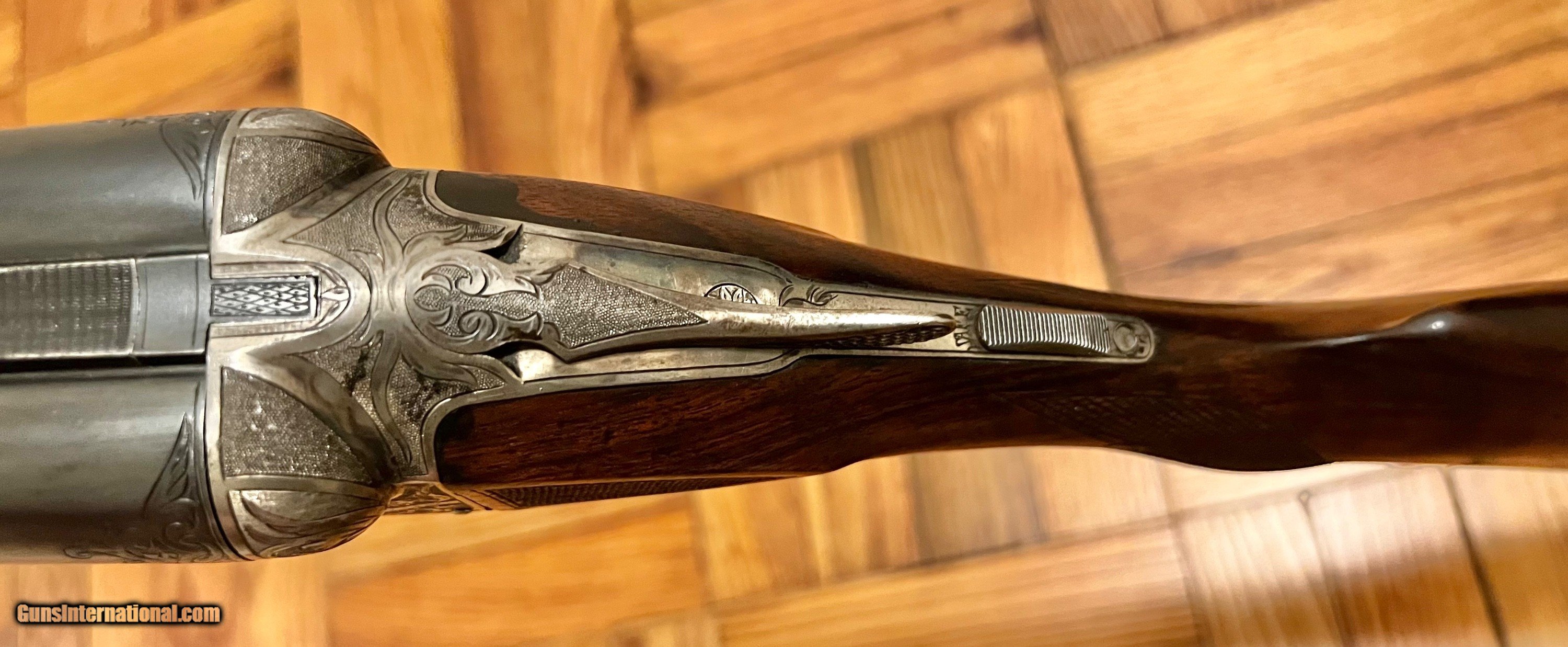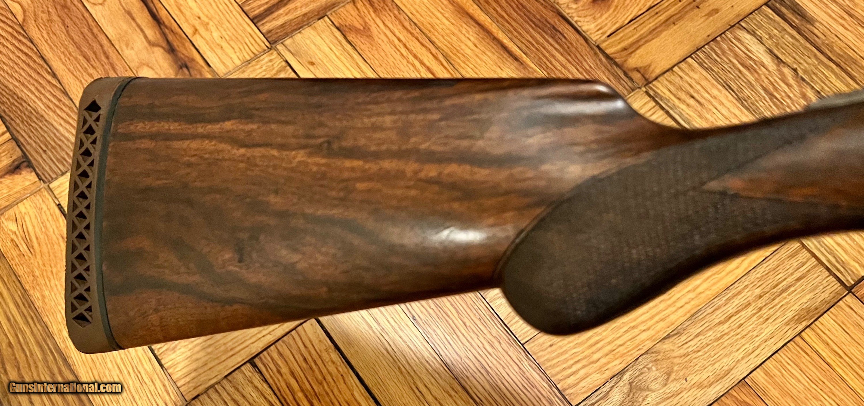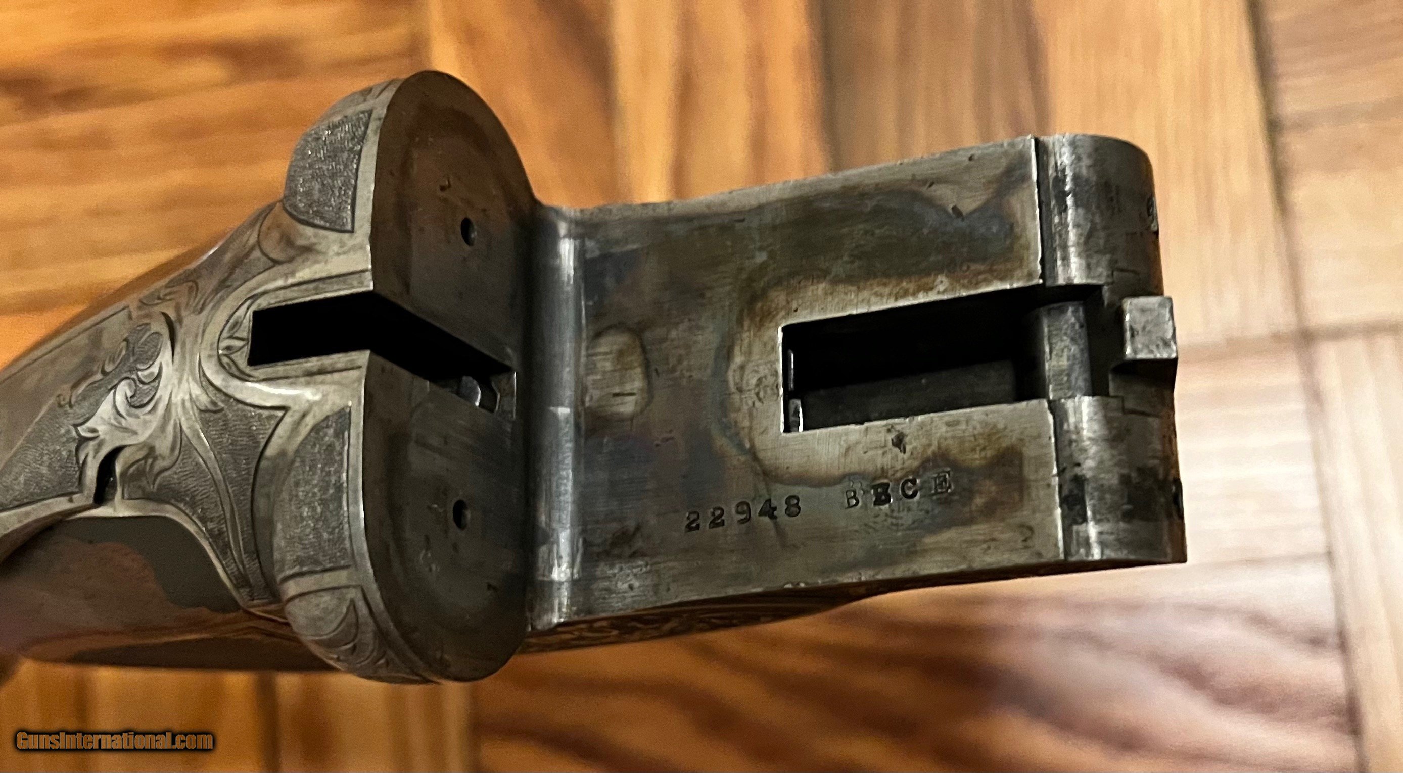 Description: A.H. Fox BE grade 12ga Fox Kautzky single selective trigger that functions perfectly. 26" ejector barrels with excellent bores (originally 30" and cut to 26") Chokes: Cyl/Cyl .000/.000 Minimum wall thickness R:0.032 L:0.033 LOP: 13 5/8 with rear position single trigger DAC: 1 3/4 DAH: 3 3/8 Cast off: 1/8" 6lbs 13oz Built in 1916 Nice original BE action with late style deep cut engraving retaining much original case color. Figured stock and forend that are solid but have some repairs, lockup is tight with no movement between barrels and action with the forend removed. Ejectors work properly when shooting but need servicing as they eject when the gun is opened and not shot. Gun can be used as is or used for a custom build/restoration project. SOLD Curio/Relic: Yes Shotgun Gauge: 12 Gauge |