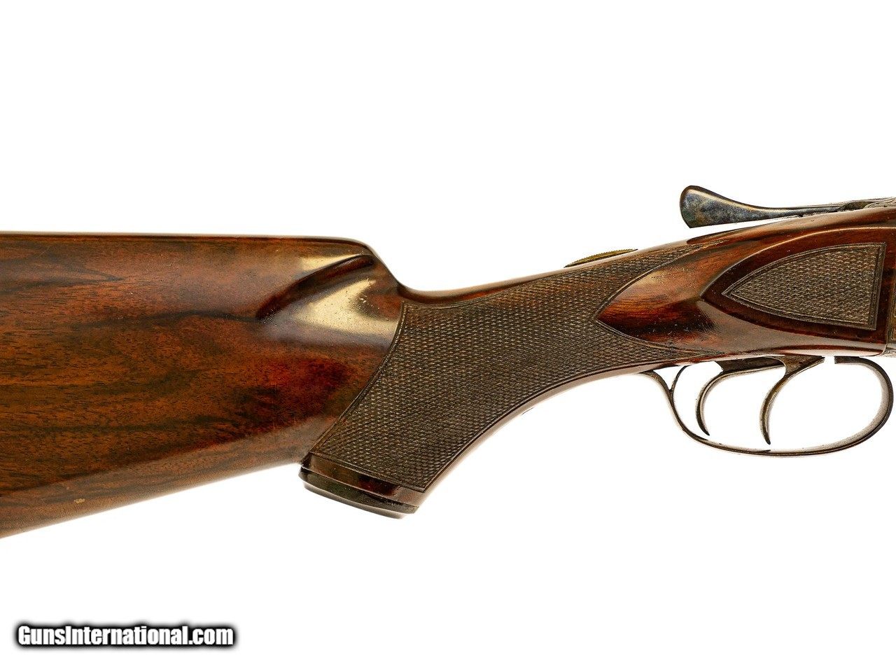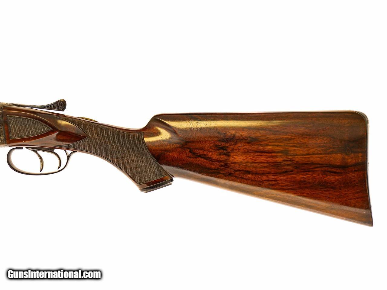 Description: A.H. Fox - BE Grade, SxS, 16ga. 28" Chromox Steel Barrels Choked IM/F. Philadelphia, PA. Chromox Steel Barrels. Splinter forend, capped pistol grip, very rare skeleton butt, double trigger, auto ejector, checkering, beautiful deep bold engraving that is crisp and sharp. Gun retains 99% blue, and wood finish. There are some minor spots on the barrel which may or may not come off with re-bluing. Perfect screws, retains over 90% case color. An absolute collector grade gun that is tight, perfect, and virtually without flaw. Inv: 32478 6 lbs. 7 oz. 14 ¼" (approx.) x 1 ½" x 2 ¾" $21,995.00 SOLD |