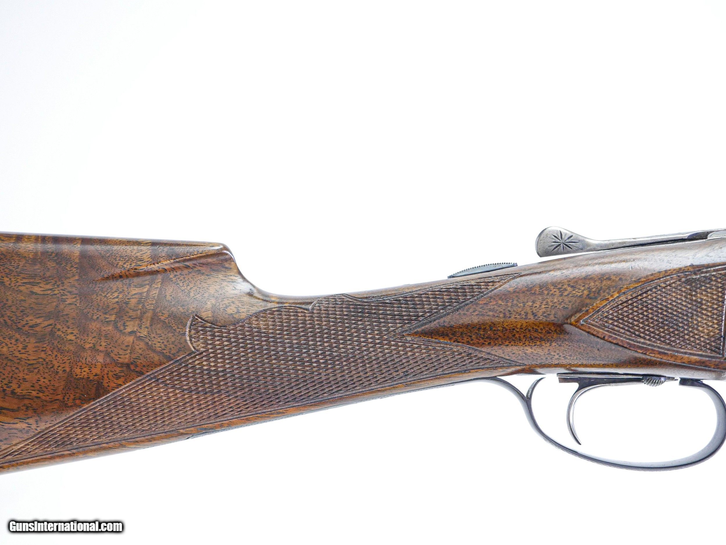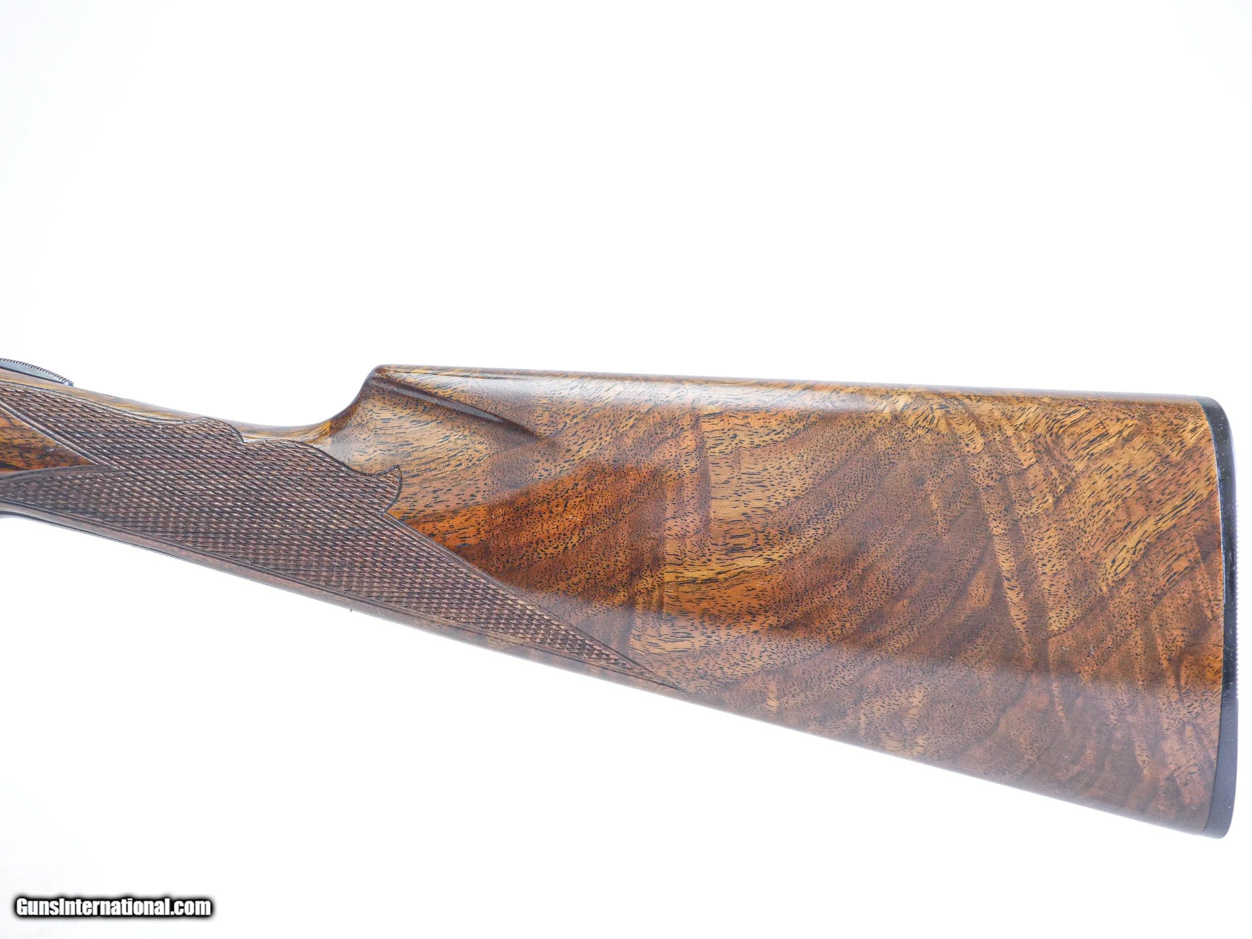 Description: A.H. Fox - CE Grade, 12ga. 26" Barrels Choked SK/IC. Nicely figured after market straight grip stock, big after market beavertail forend, hard butt plate, single selective trigger, Simmons vent rib, automatic ejectors, non-auto safety, great C grade engraving, a great gun that is in a wonderful condition throughout, 99% condition barrel bluing, 99% wood finish, some traces of case coloring left, a wonderful gun for any Fox enthusiast. Inv: 21501 8 lbs. 5 oz. 14" x 1" x 2 3/8" $4,250.00 SOLD |