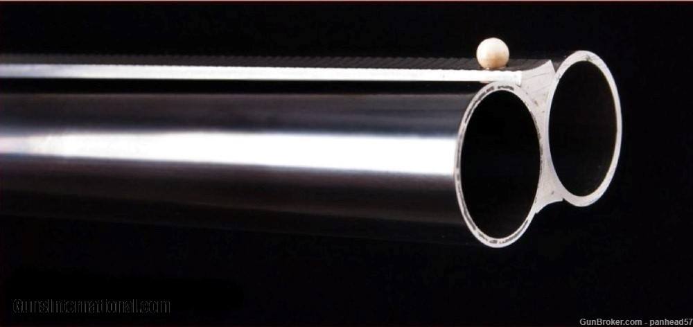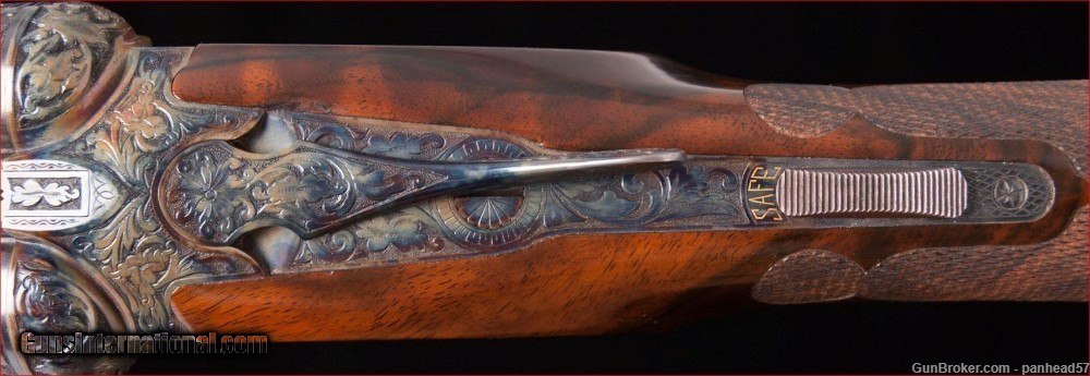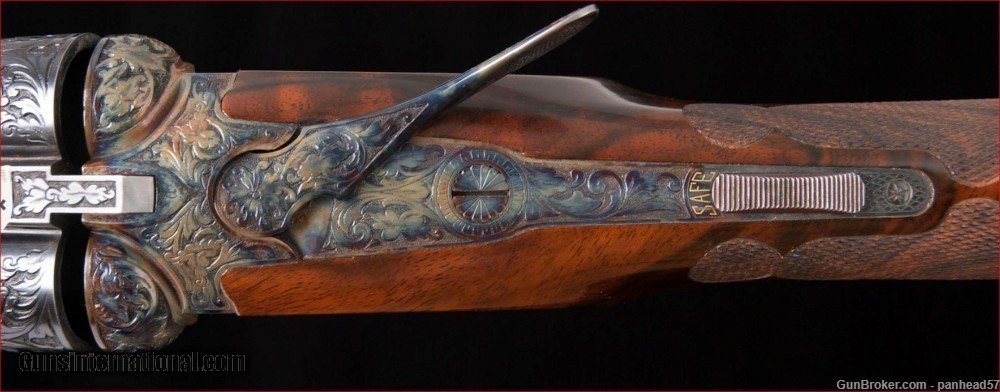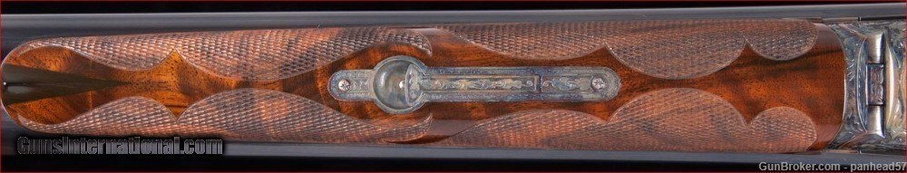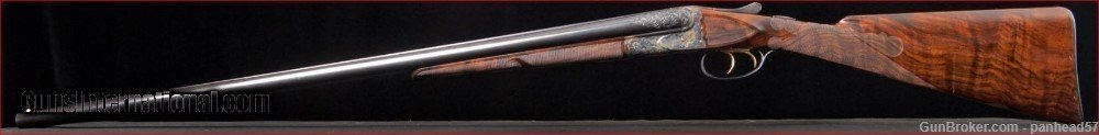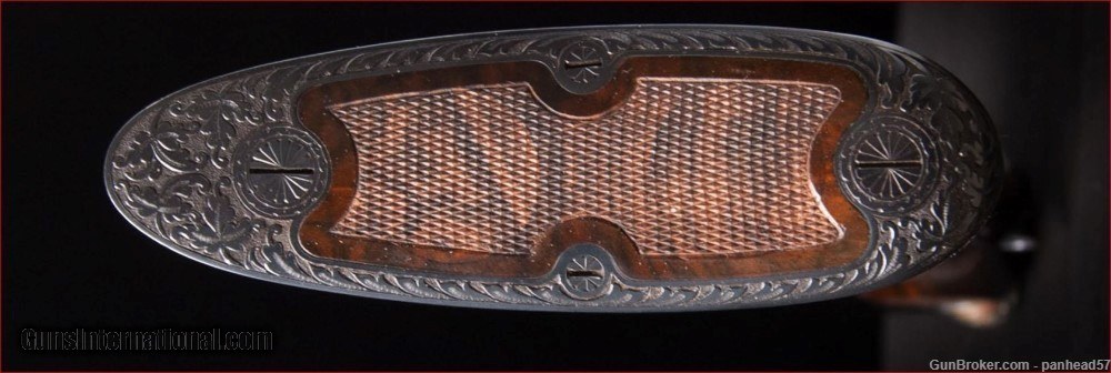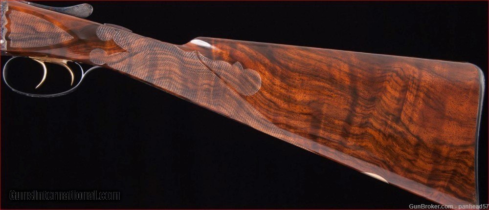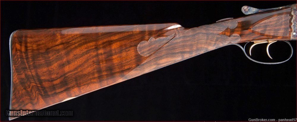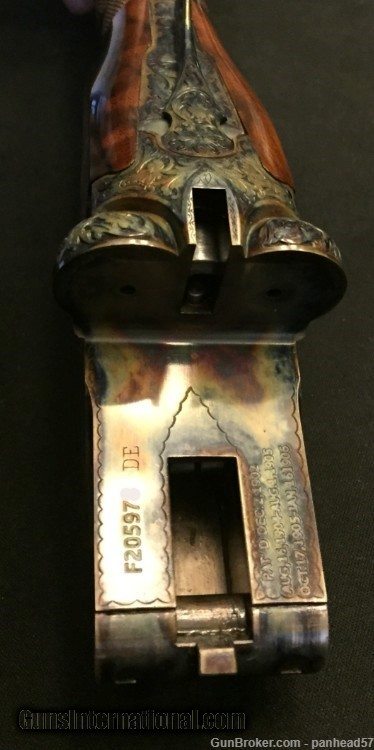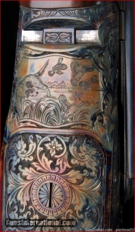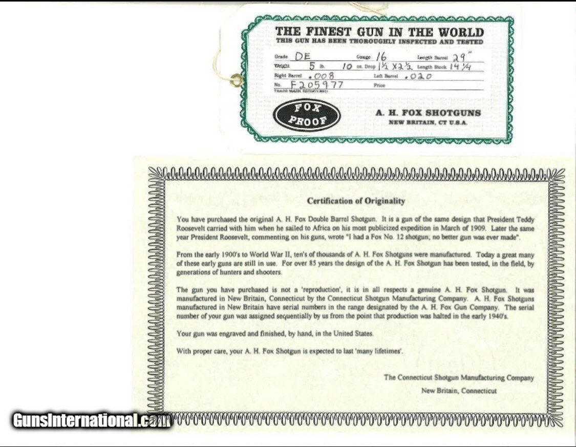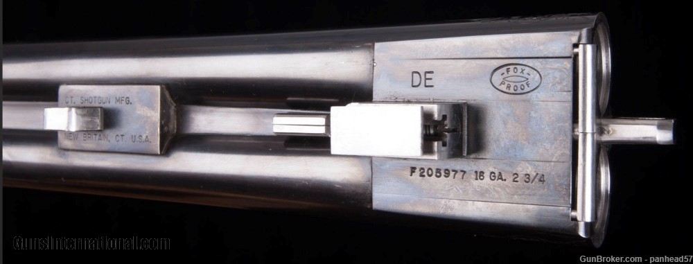 Description: If you are seeking perfection in an American made shotgun, this AH Fox DE grade manufactured by the Connecticut Shotgun Manufacturing company, CSMC, fits the bill nicely. It was ordered on December 29, 2006, manufactured and completed in 2007. A combination of the legendary Ansley H. Fox design and modern manufacturing processes by CSMC resulted in this very attractive and functional shotgun. AH Fox shotguns were stated as being "The Finest Gun in the World" because of their design and elegant engraving. This Fox was made with the finest quality materials. It features an English style straight grip stock, Cromax Fluid Steel barrels tipped with a single ivory bead front sight, a skeleton butt plate and a Schnable forend with an ebony insert. The receiver, engraved by Jere Davison is appealing to the upland hunter, featuring flushing grouse on the right side, flushing woodcock on the left side and a setter pointing a covey of flushing quail on the underside. The stock and forend have a very fine and attractive checkering pattern. It has gold plated double triggers. The metal to wood fit is superb. The gun weighs in at 5 pounds, 10 ounces and sports 29 inch barrels. The right barrel is choked improved cylinder and the left barrel is choked modified. It comes in a Galazan Traditional Trunk Case with a canvas outside cover. This gun would be a valuable asset to your collection or a first class piece to use in pursuing your favorite upland game. A gun as such, if ordered today from CSMC, would cost in excess of 27K. This gun is not a reproduction but in all respects, a genuine AH Fox shotgun. It is "New Old Stock", having never been fired Shotgun Gauge: 16 Gauge Manufacturer: A.H. Fox, CSMC Model: DE Serial Number: F205977 Barrel Length: 29 Bore Info: 0.672 Chambers: 2-3/4 Ejectors: Automatic & Safety Condition: New Metal Condition: New Wood Condition: New Bore Condition: New Barrel Type: Chromax Triggers: Double Stock: English Straight Grip Stock Comb: 1-1/2 Stock Heel: 2-1/2 Fore End: Schnabel Butt Pad: Skeleton LOP: 14-1/4 Weight: 5 lbs 10 ozs Sights: ivory Choke Left: .020 Choke Right: .008 Case: Galazan Trunk Case w/Canvas Cover Item Location: PA Price: $19,800.00 Shipping: $200.00 Contact Seller |