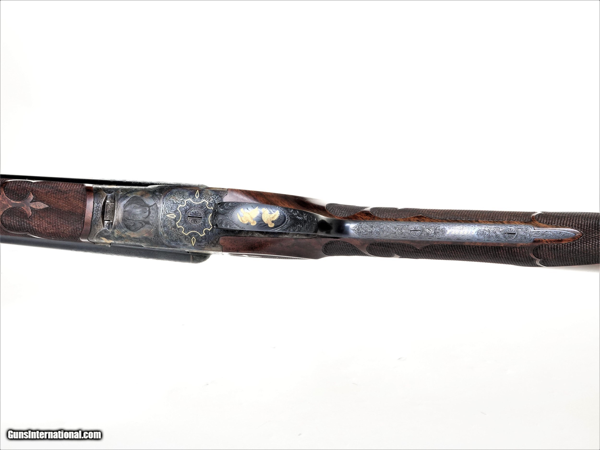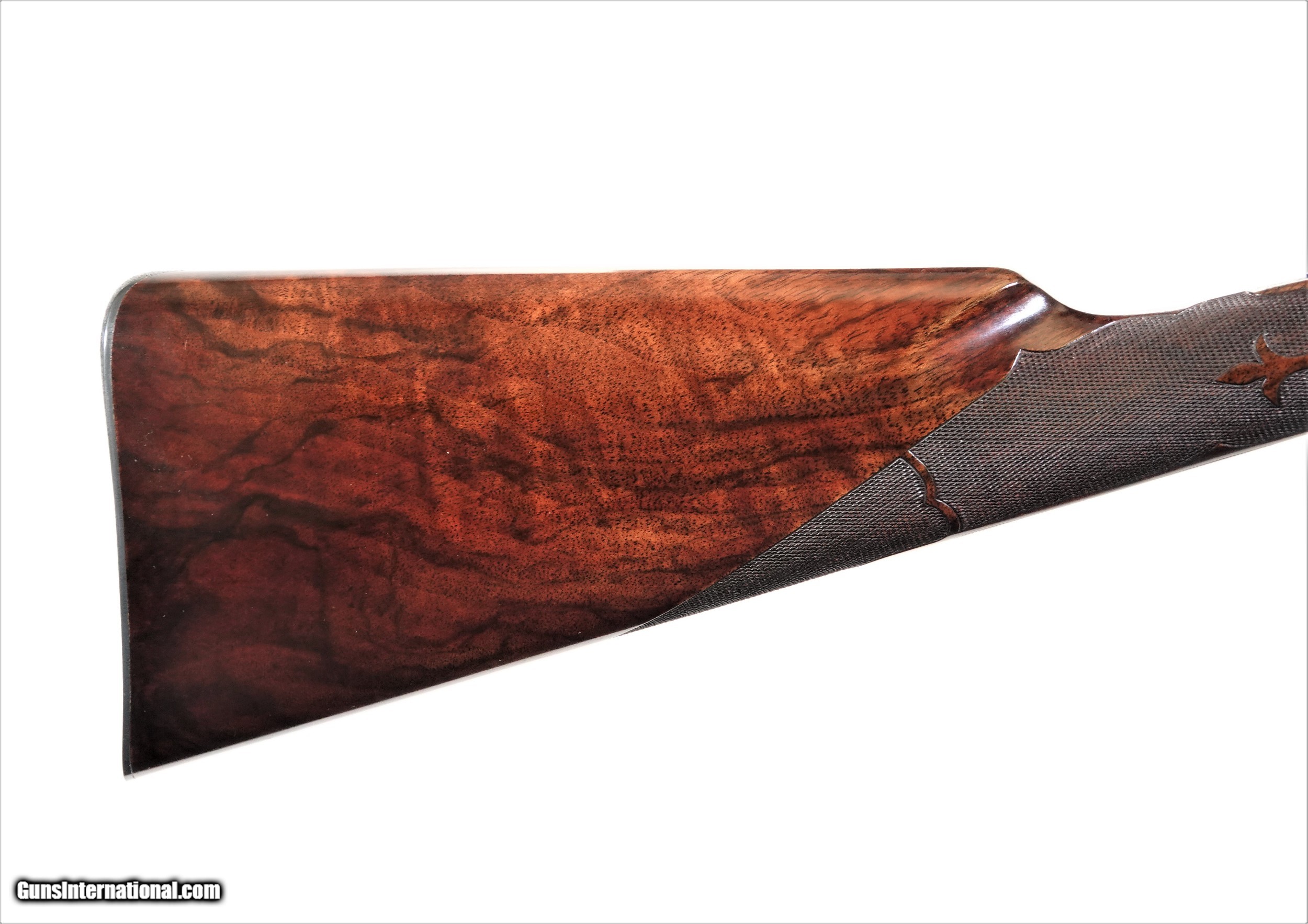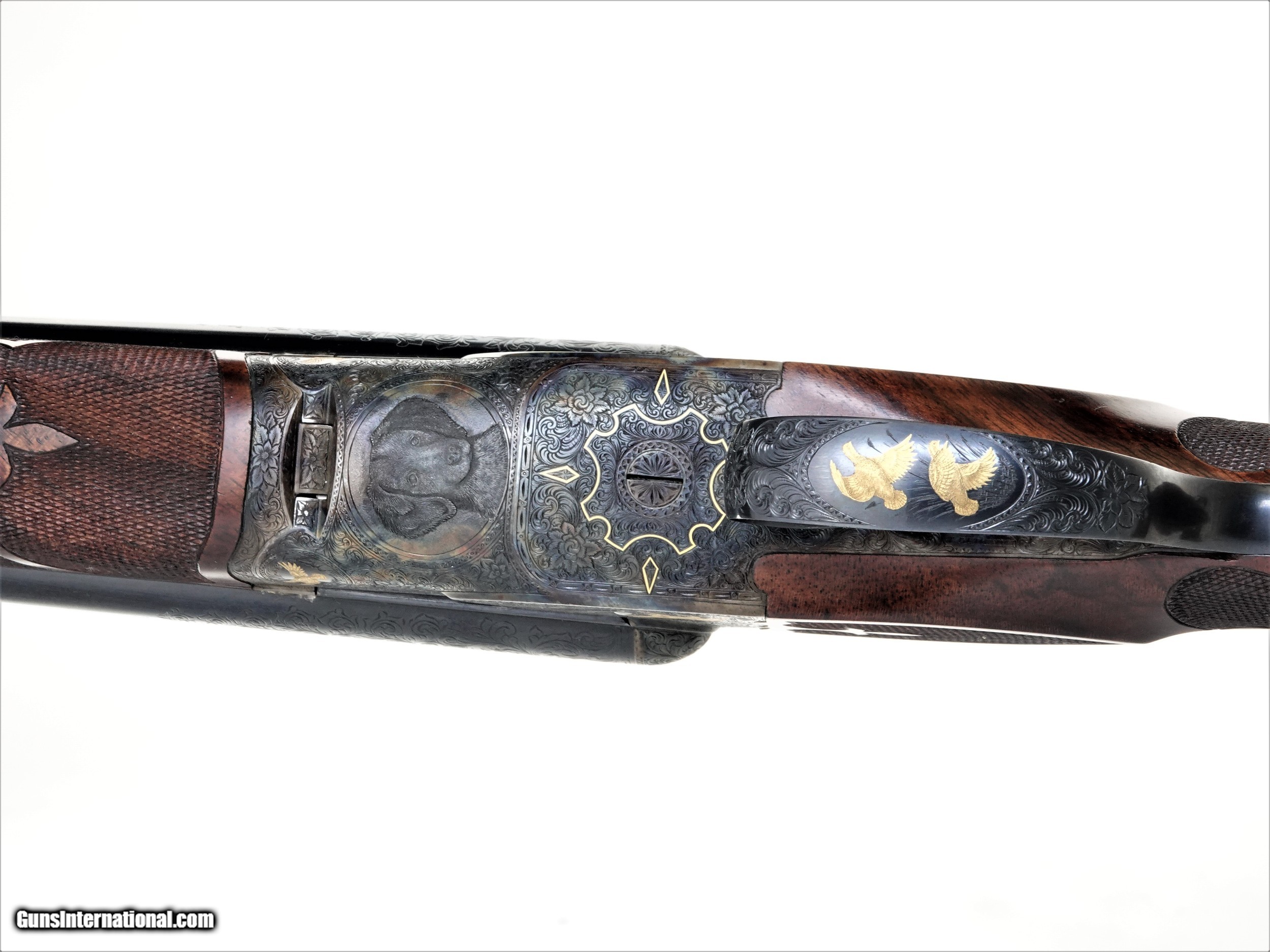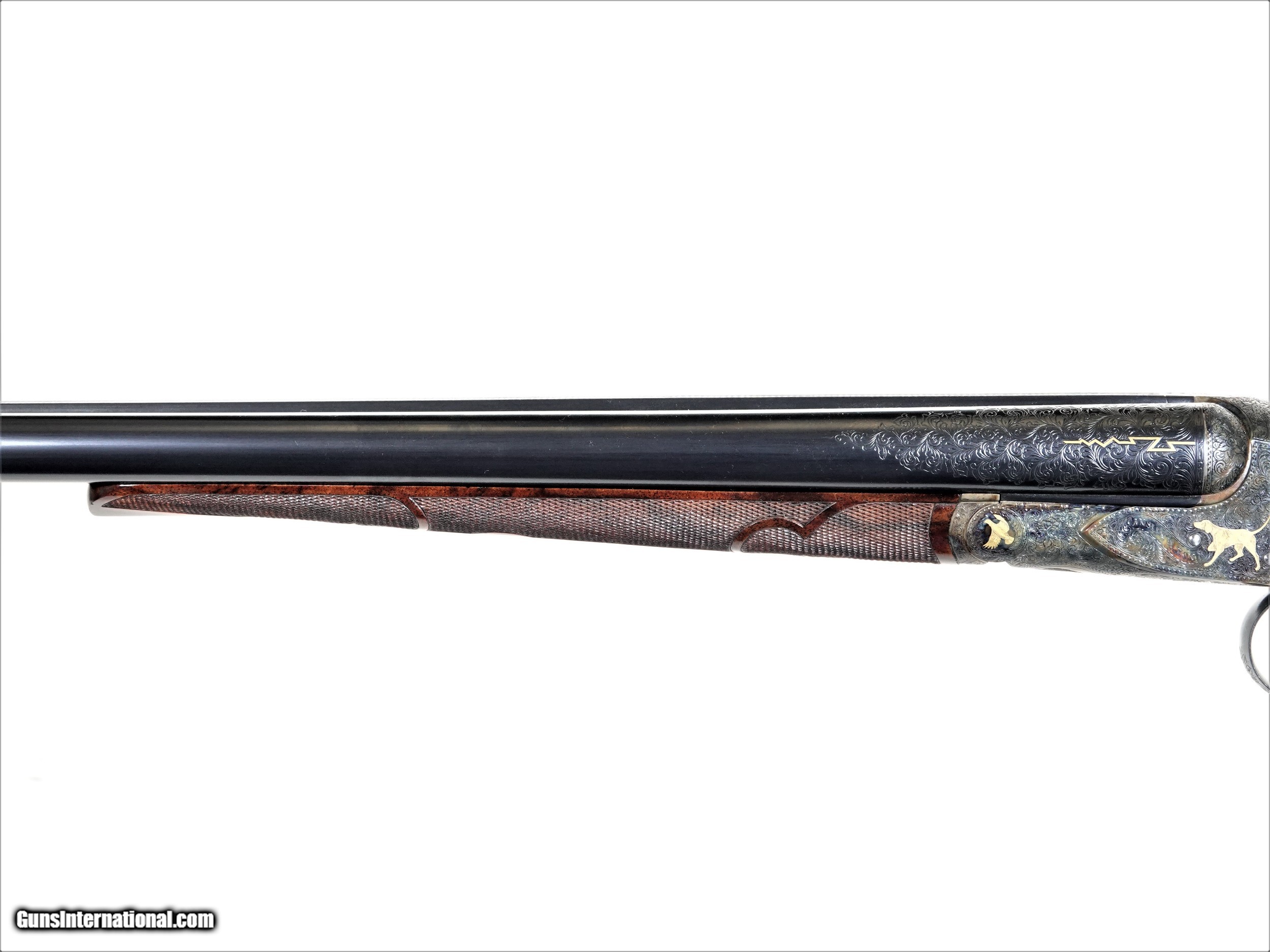 Description: A.H. Fox - DFE Grade, 16ga. 26" Barrels Choked M/IM. Unbelievable, superior gun. It is Demunck engraved, extra gold inlays with 2 gold quail on the trigger guard, gold quail on the hinge pin, gold pointer on each side, surrounded by magnificent Demunck scroll and roses. Long engraved barrel wedges, twin white sites. FE Fleur De Lis checkering, select Turkish walnut. Magnificent Brittany Spaniel is engraved on the bottom of the frame. Krupp steel barrels, skeleton butt, long schnabel forend. This is an outstanding special order gun that is really unobtainable today, cost would be $40,000, engraved by one of the world's finest engravers. In its Nizzoli case with all of its accessories. This gun is unused, a few marks from the case, which we will redeliver as a new gun with a lifetime warranty as it is currently unused. The best of the best in Americana. If you are interested in purchasing one of the finest Fox's, this is it. Inv: 29155 5 lbs. 9 oz. 14 ¼" x 1 ½" x 2 ¼" $29,995.00 SOLD |