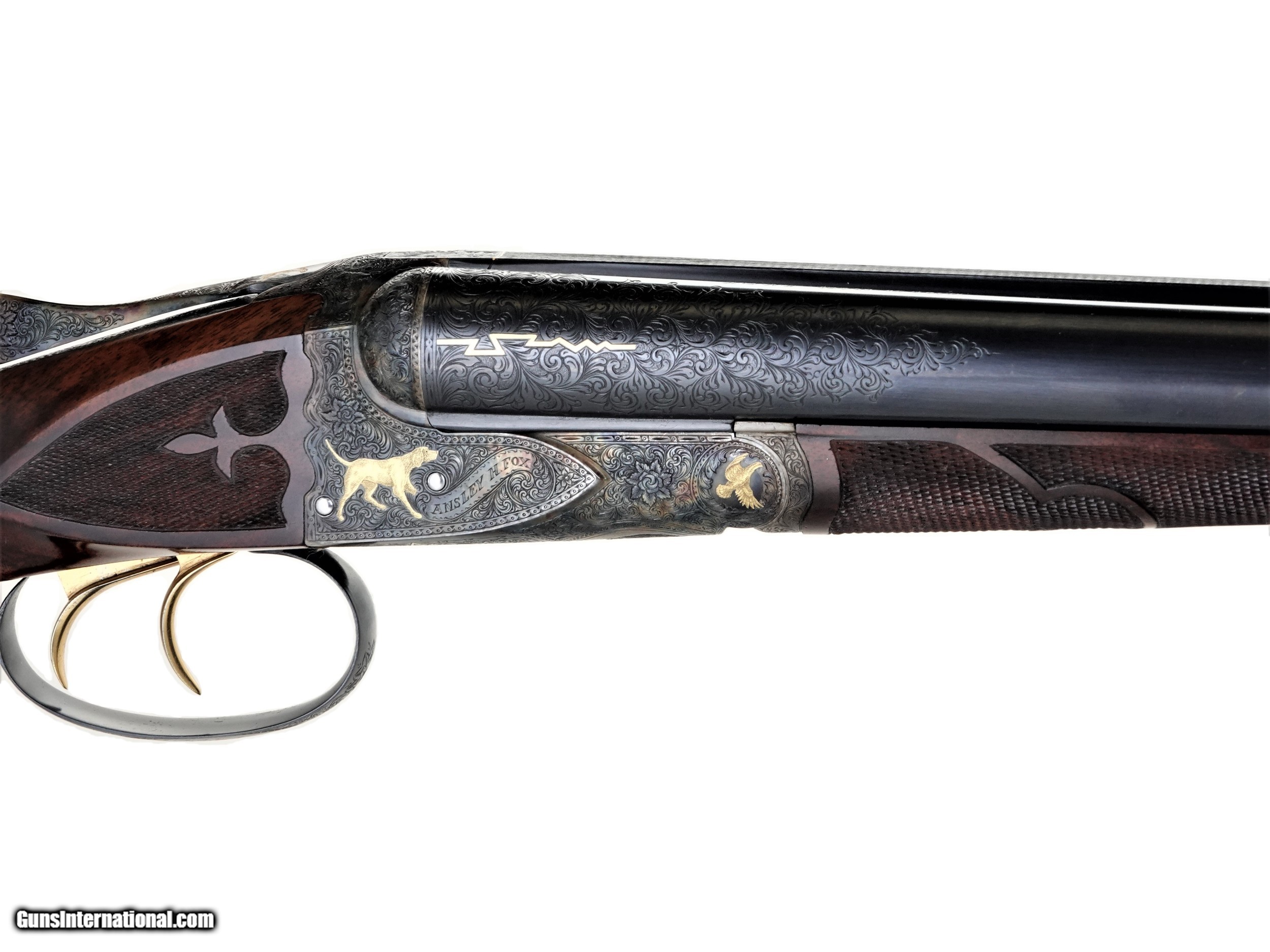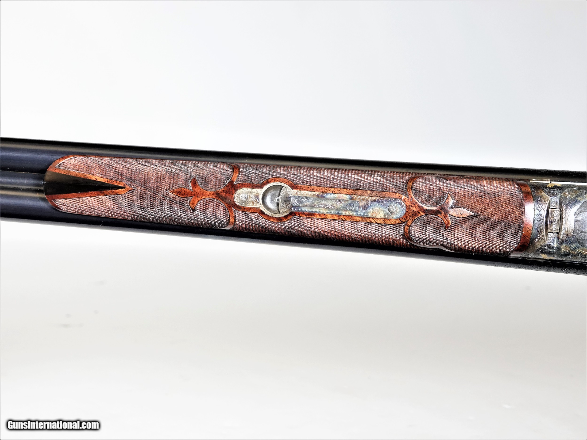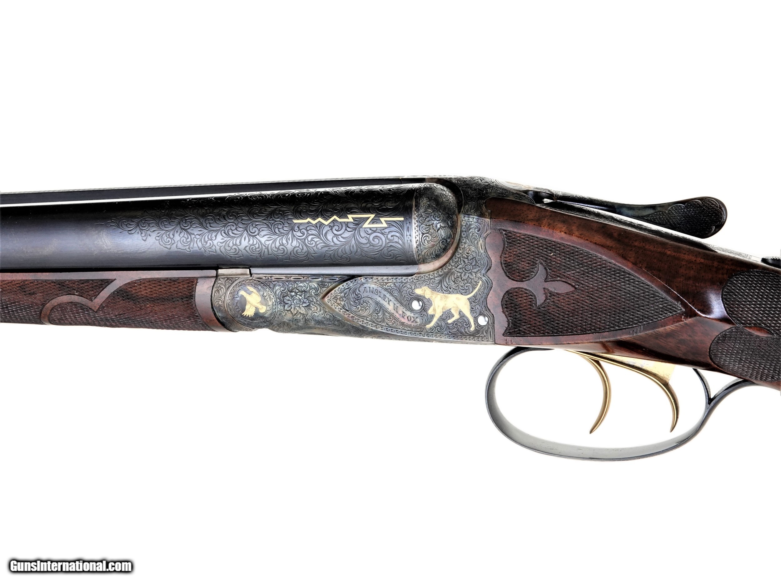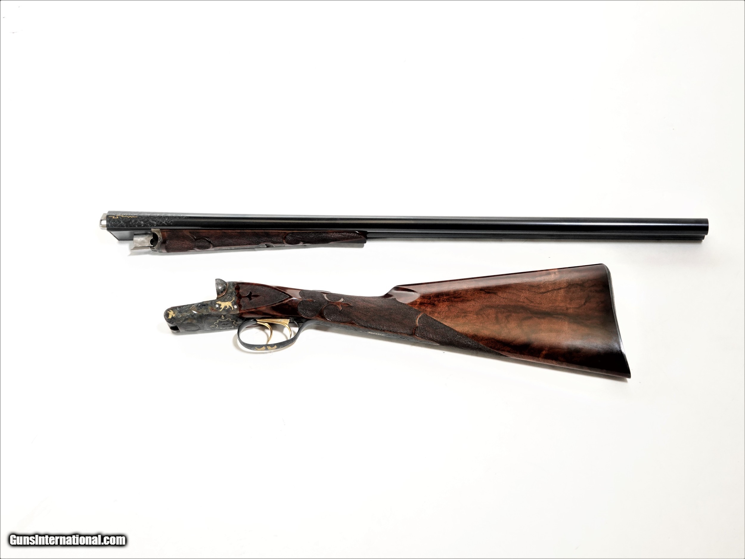 Description: A.H. Fox - DFE Grade, 16ga. 26" Barrels Choked M/IM. Unbelievable, superior gun. It is Demunck engraved, extra gold inlays with 2 gold quail on the trigger guard, gold quail on the hinge pin, gold pointer on each side, surrounded by magnificent Demunck scroll and roses. Long engraved barrel wedges, twin white sites. FE Fleur De Lis checkering, select Turkish walnut. Magnificent Brittany Spaniel is engraved on the bottom of the frame. Krupp steel barrels, skeleton butt, long schnabel forend. This is an outstanding special order gun that is really unobtainable today, cost would be $40,000, engraved by one of the world's finest engravers. In its Nizzoli case with all of its accessories. This gun is unused, a few marks from the case, which we will redeliver as a new gun with a lifetime warranty as it is currently unused. The best of the best in Americana. If you are interested in purchasing one of the finest Fox's, this is it. Inv: 29155 5 lbs. 9 oz. 14 ¼" x 1 ½" x 2 ¼" $29,995.00 SOLD |