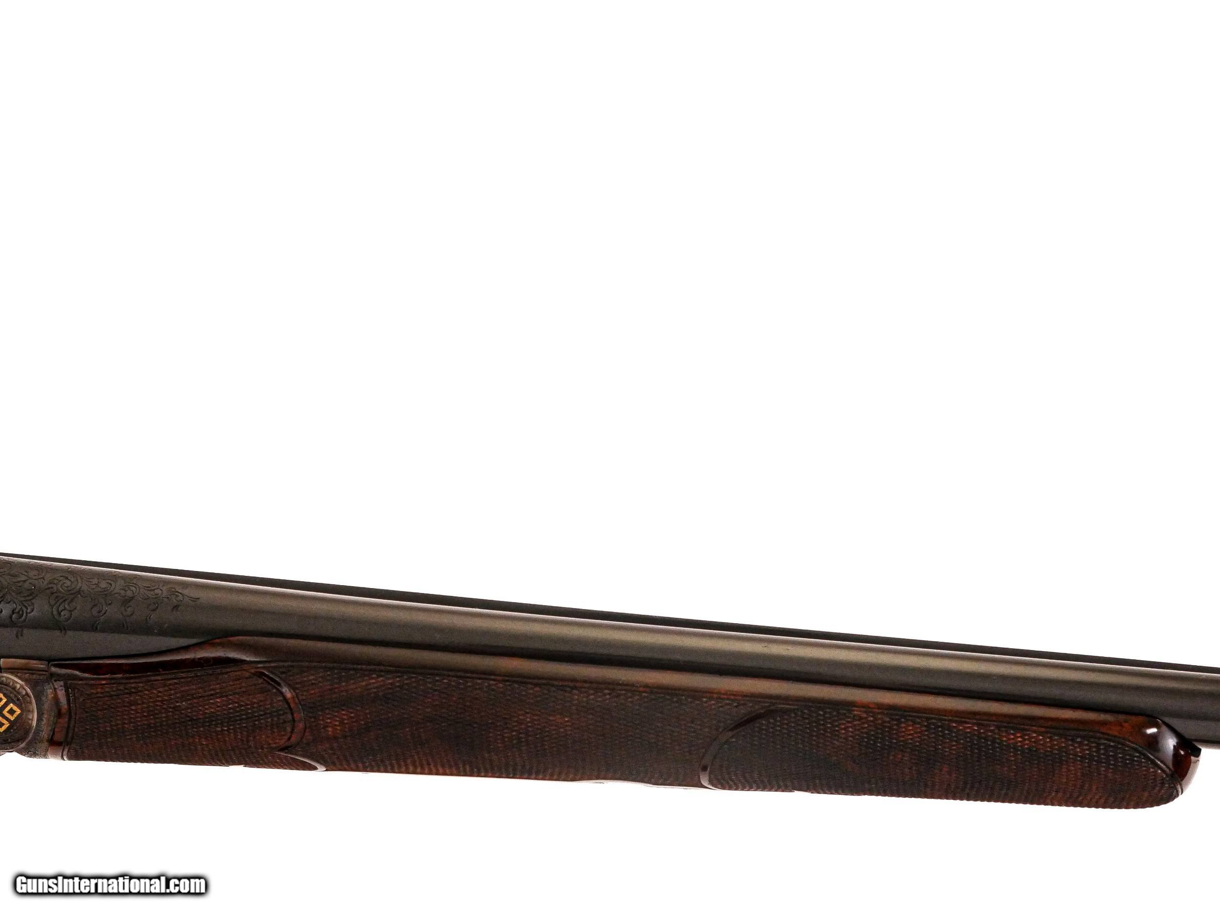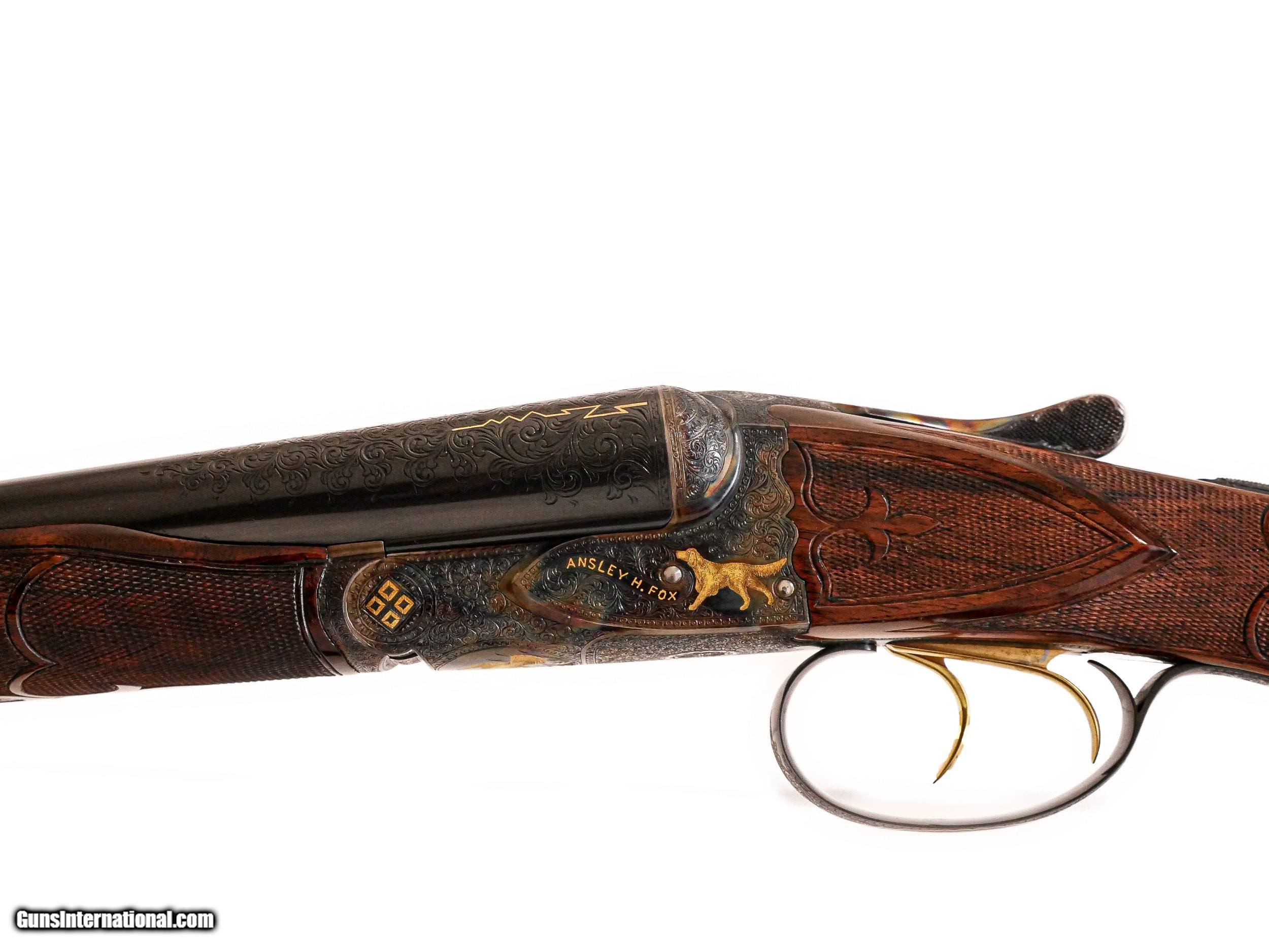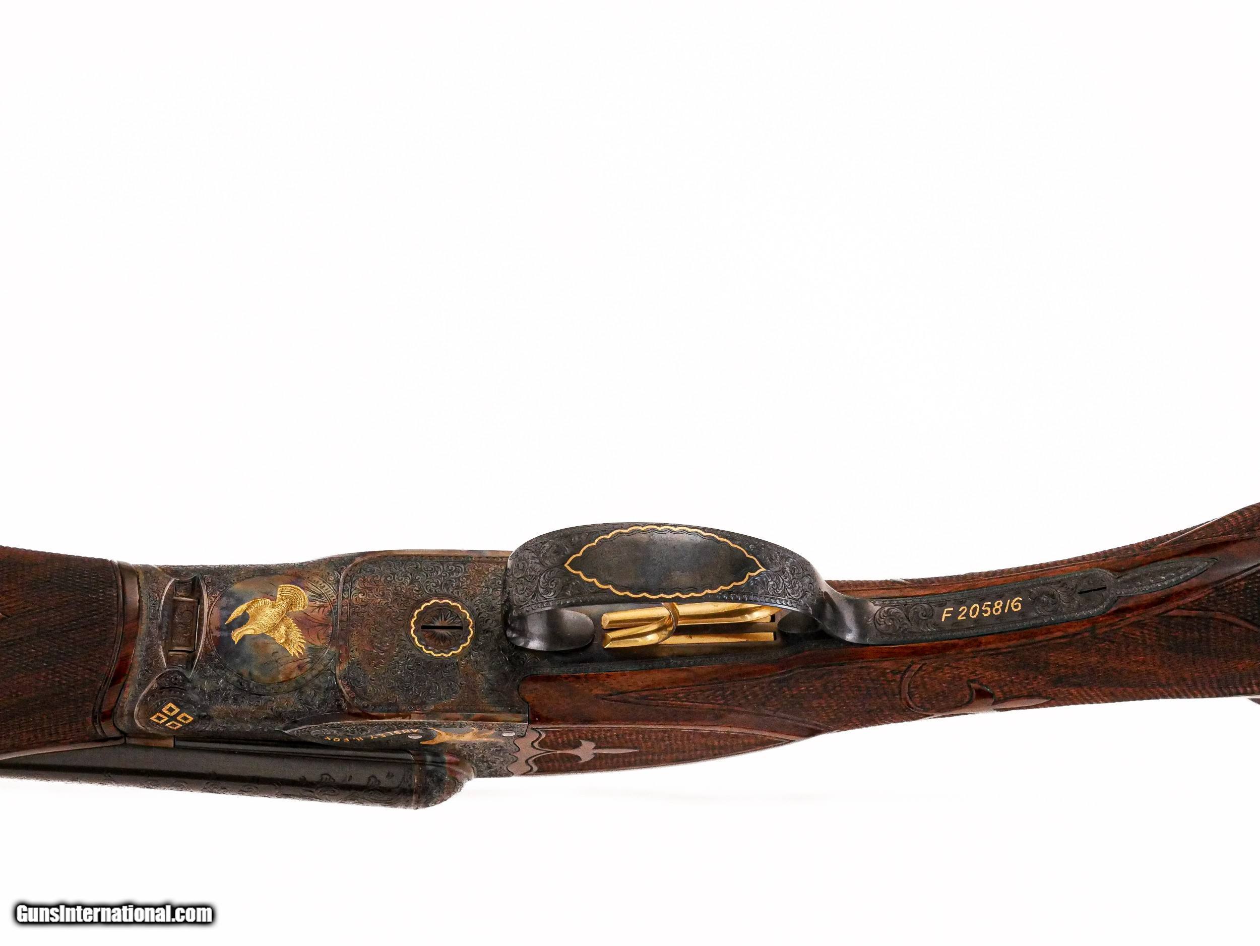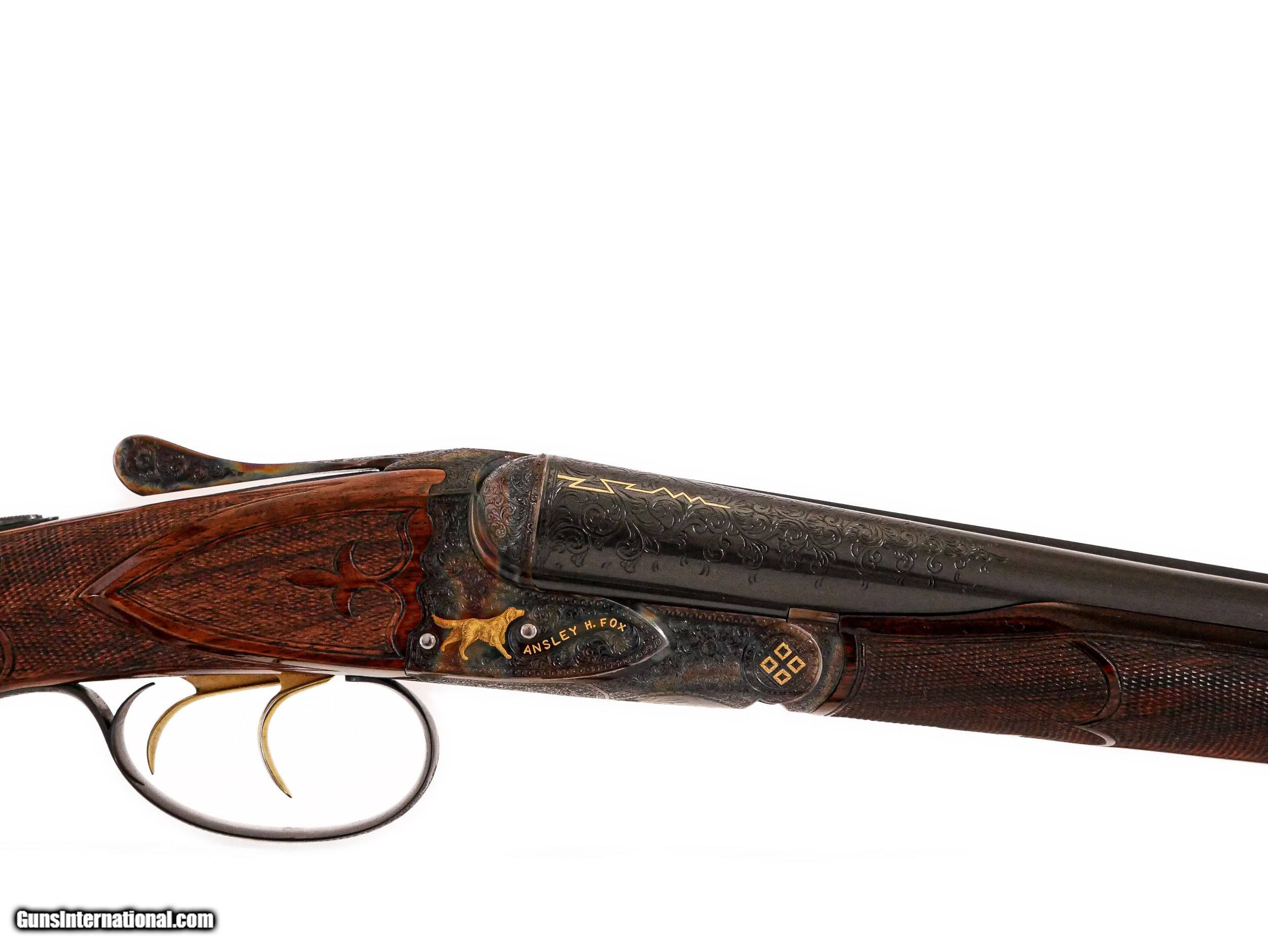 Description: A.H. Fox - FE Grade, SxS, 28ga. 28 ½" Barrels Choked IC/M. Turkish Circassian exhibition walnut round knob stock, skeleton butt, gold double triggers, game rib, automatic ejectors, solid game rib, small beavertail forend, highly detailed gold inlayed games scenes of setters and grouse surrounded by full coverage scroll engraving, gold line work on frame and gold lightning bolts on barrels, bone and charcoal case coloring, engraved by the master Demunk, 100% perfect and new condition, lifetime warranty, includes makers' case and accessories, available for immediate delivery. Inv: 43100 5 lbs. 12 oz. 15" x 1 ½" x 2 1/2" $32,999.00 SOLD |