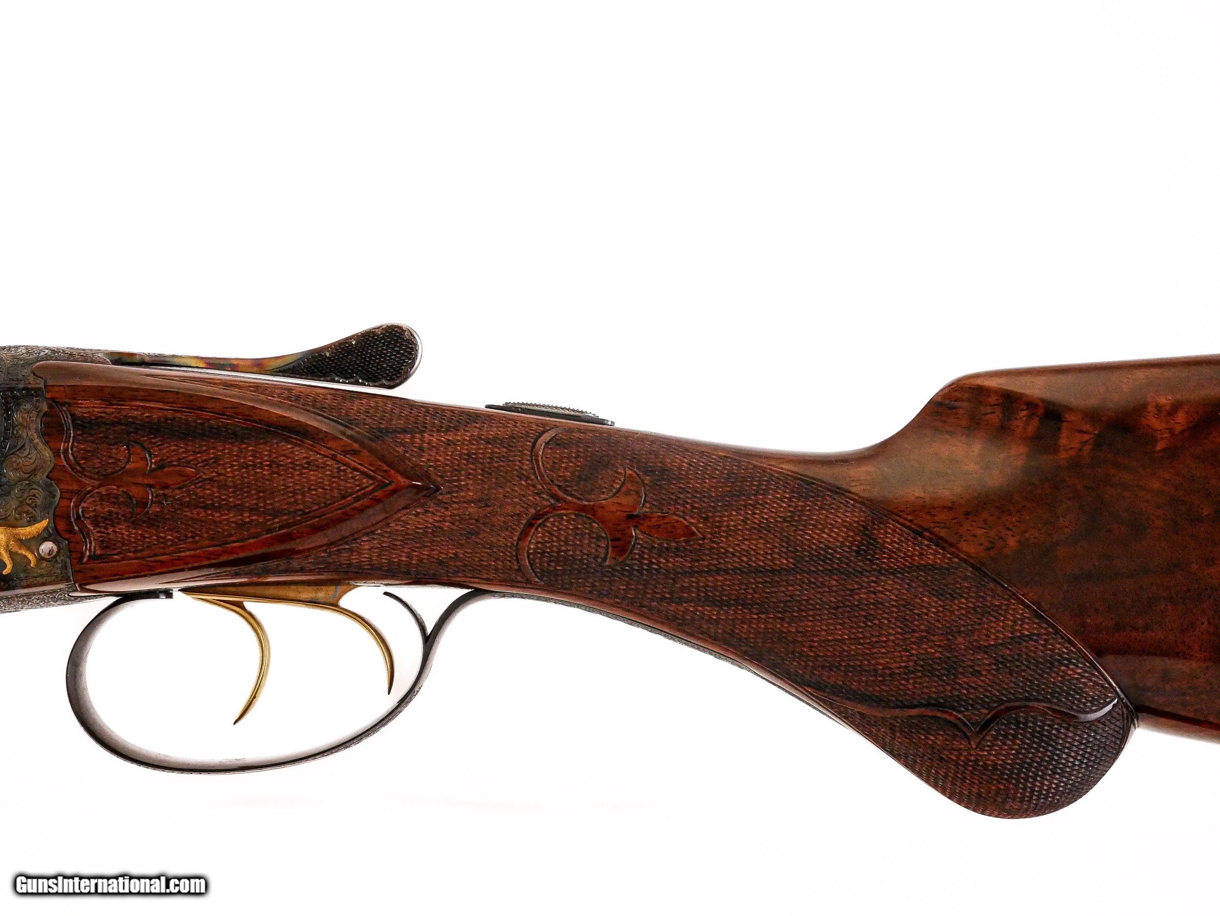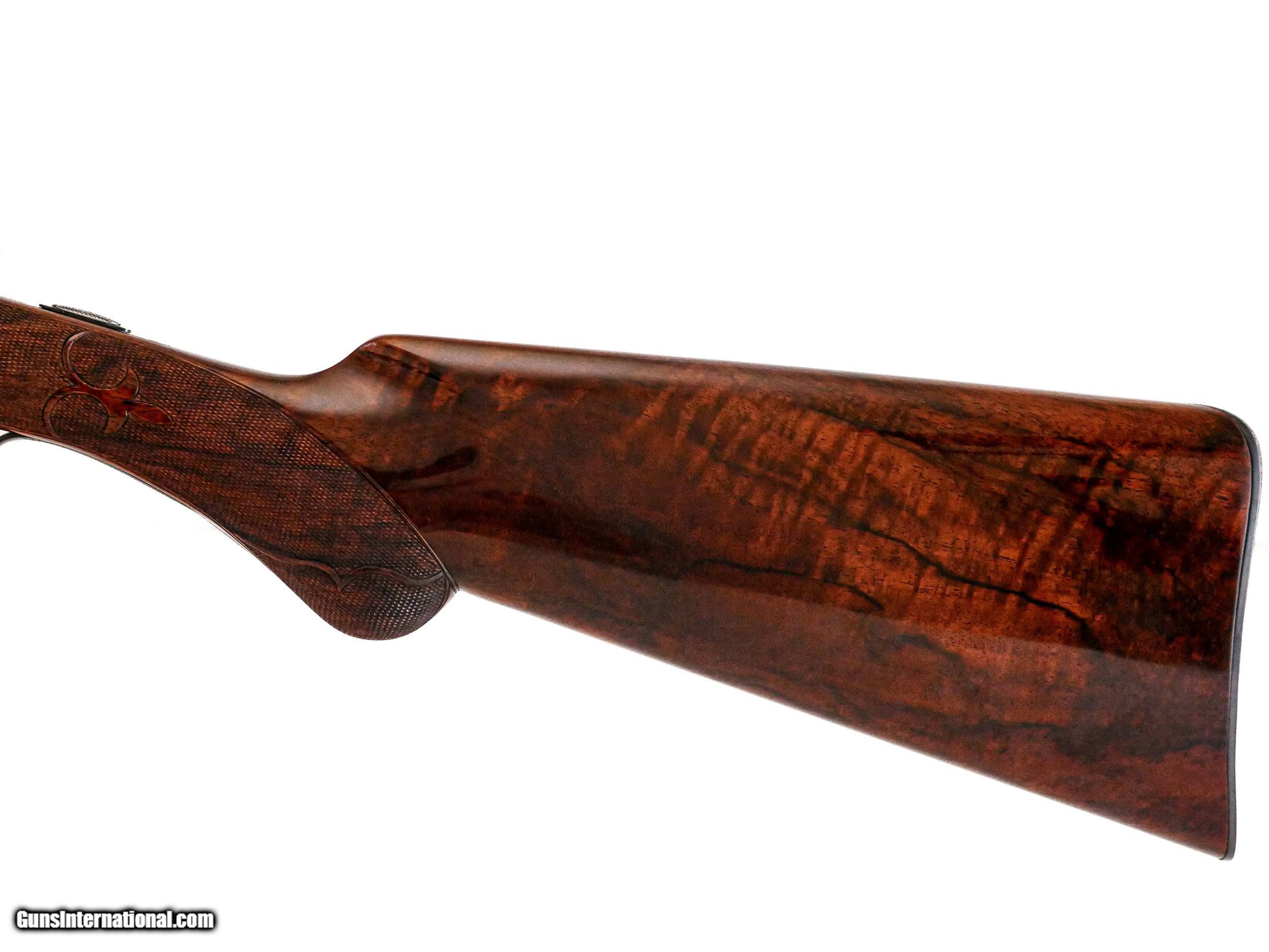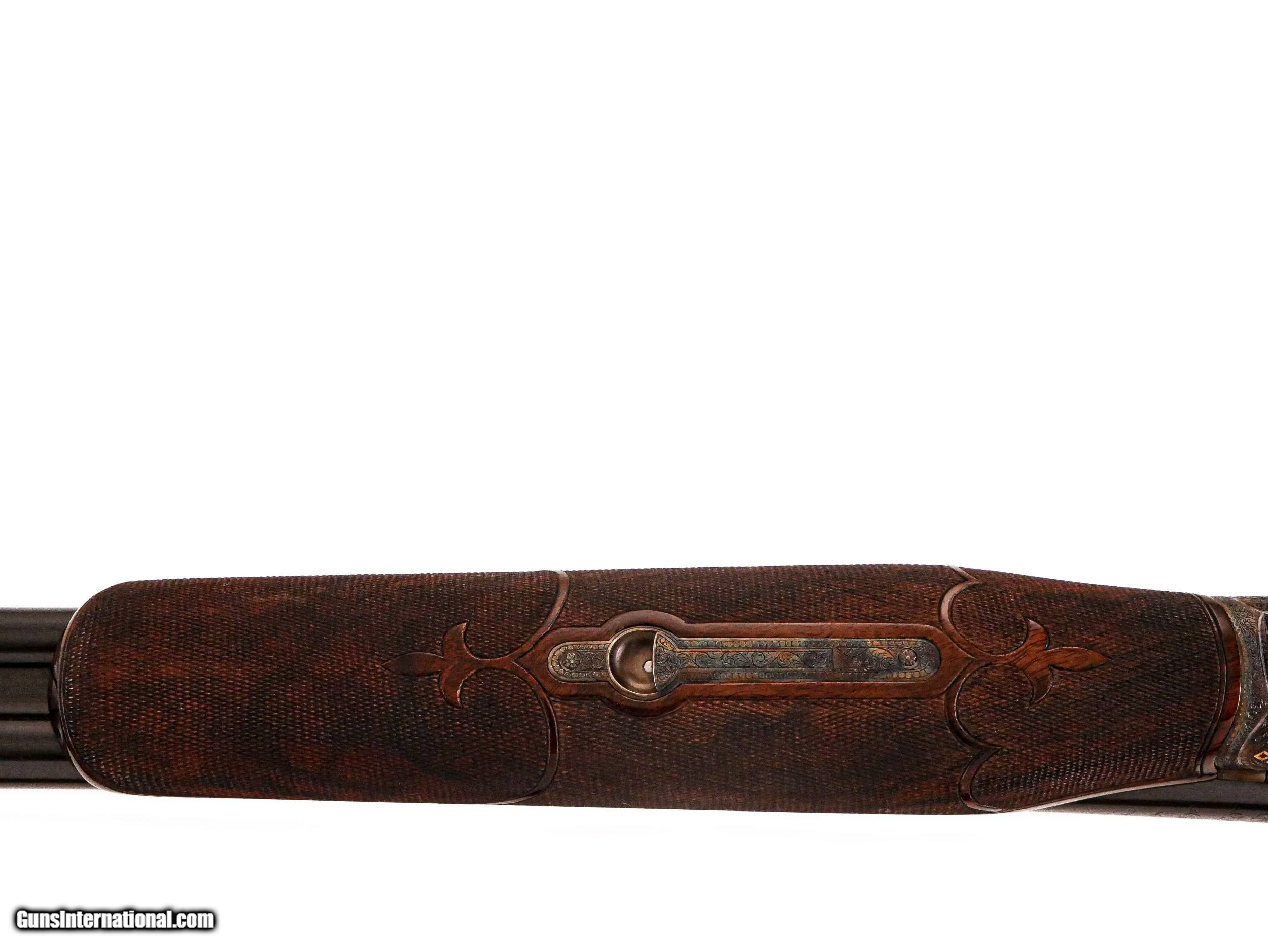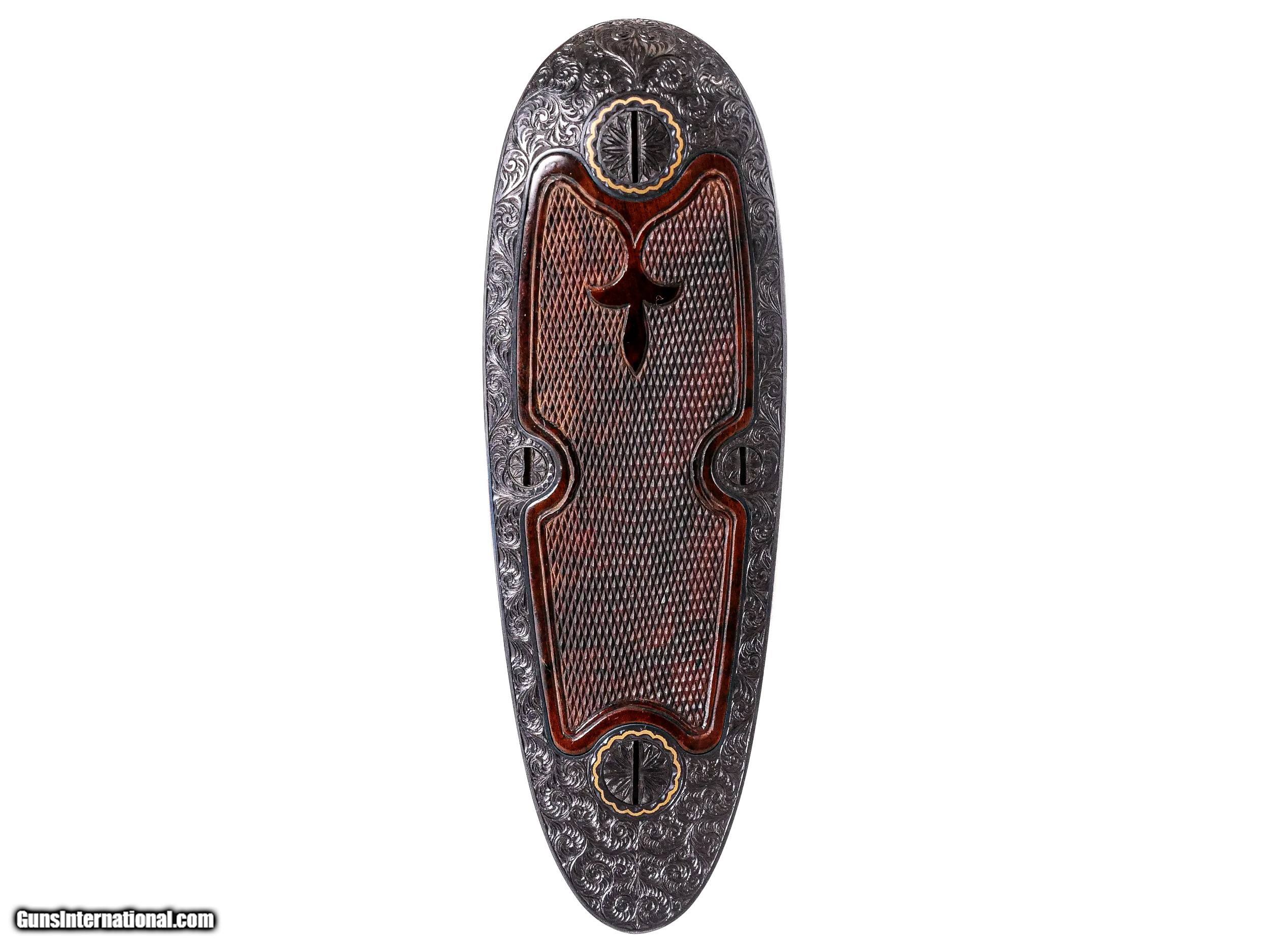 Description: A.H. Fox - FE Grade, SxS, 28ga. 28 ½" Barrels Choked IC/M. Turkish Circassian exhibition walnut round knob stock, skeleton butt, gold double triggers, game rib, automatic ejectors, solid game rib, small beavertail forend, highly detailed gold inlayed games scenes of setters and grouse surrounded by full coverage scroll engraving, gold line work on frame and gold lightning bolts on barrels, bone and charcoal case coloring, engraved by the master Demunk, 100% perfect and new condition, lifetime warranty, includes makers' case and accessories, available for immediate delivery. Inv: 43100 5 lbs. 12 oz. 15" x 1 ½" x 2 1/2" $32,999.00 SOLD |