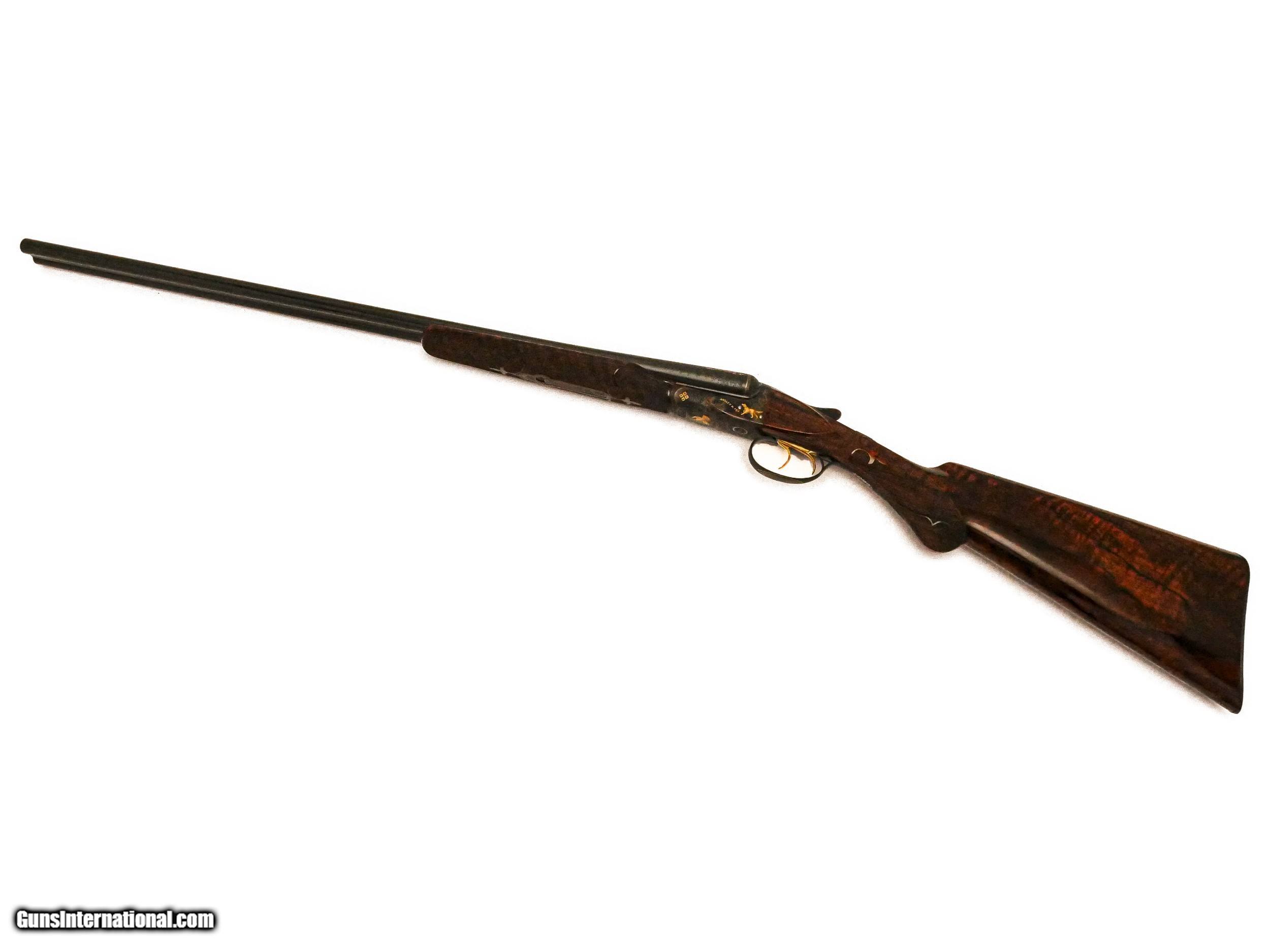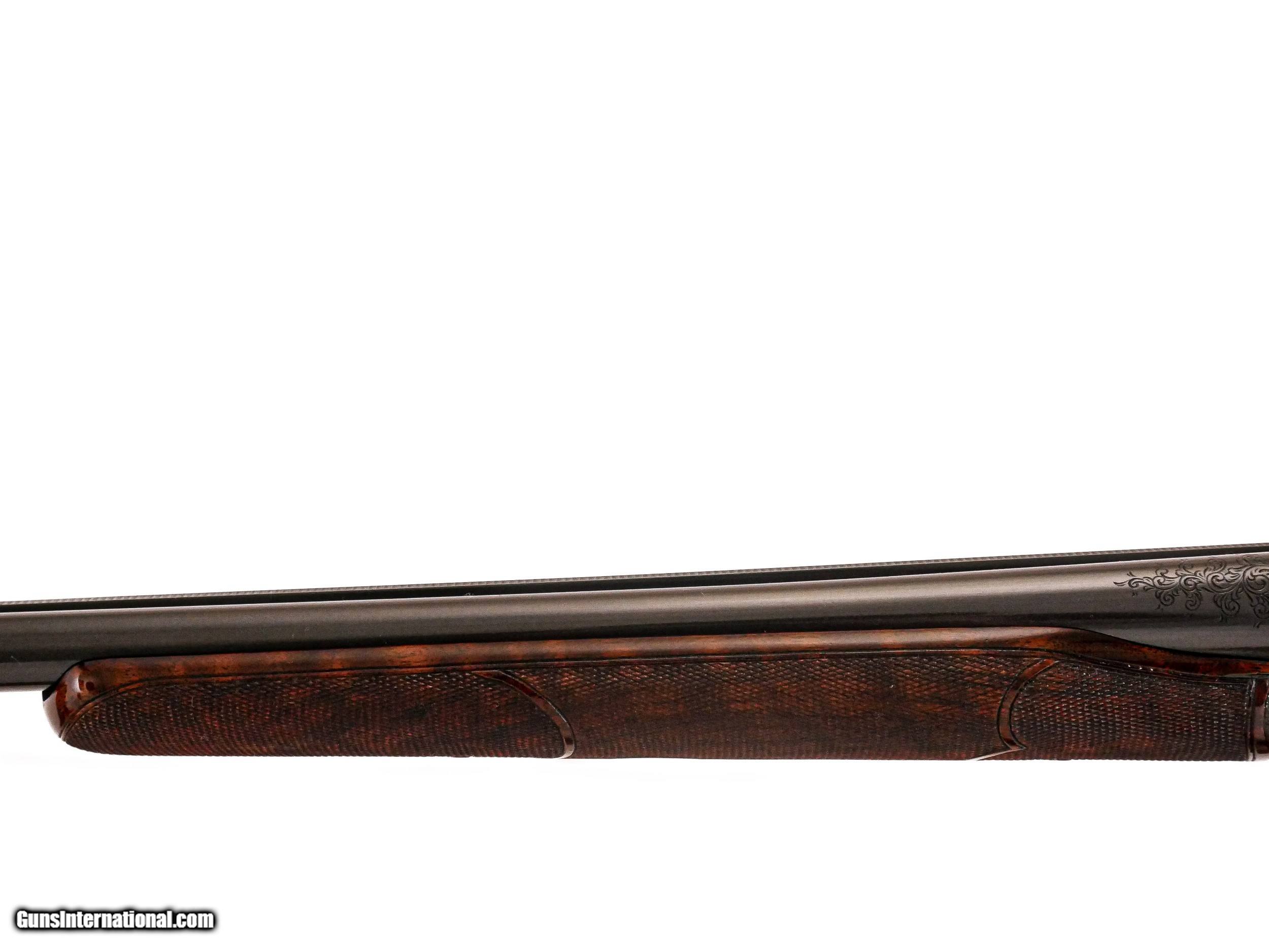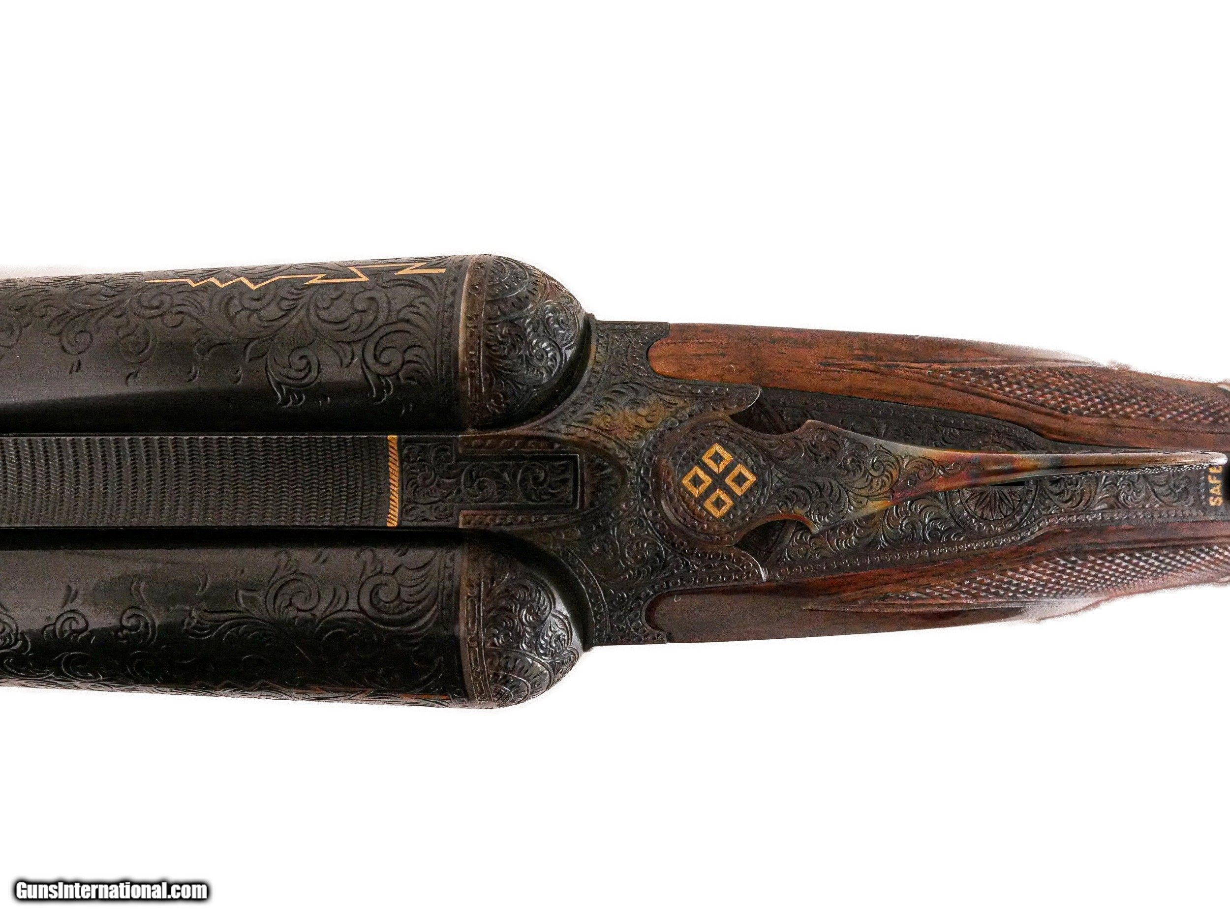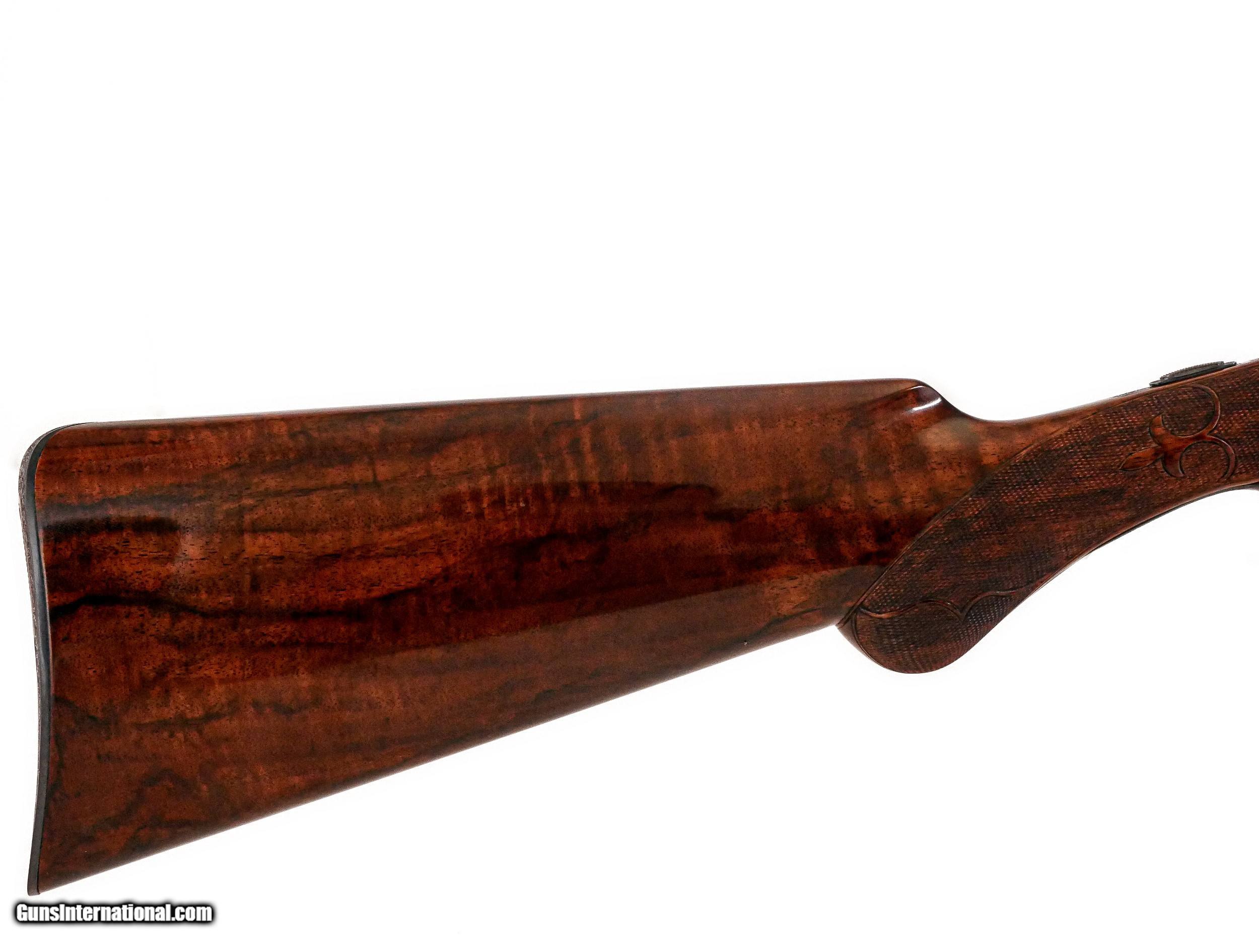 Description: A.H. Fox - FE Grade, SxS, 28ga. 28 ½" Barrels Choked IC/M. Turkish Circassian exhibition walnut round knob stock, skeleton butt, gold double triggers, game rib, automatic ejectors, solid game rib, small beavertail forend, highly detailed gold inlayed games scenes of setters and grouse surrounded by full coverage scroll engraving, gold line work on frame and gold lightning bolts on barrels, bone and charcoal case coloring, engraved by the master Demunk, 100% perfect and new condition, lifetime warranty, includes makers' case and accessories, available for immediate delivery. Inv: 43100 5 lbs. 12 oz. 15" x 1 ½" x 2 1/2" $32,999.00 SOLD |