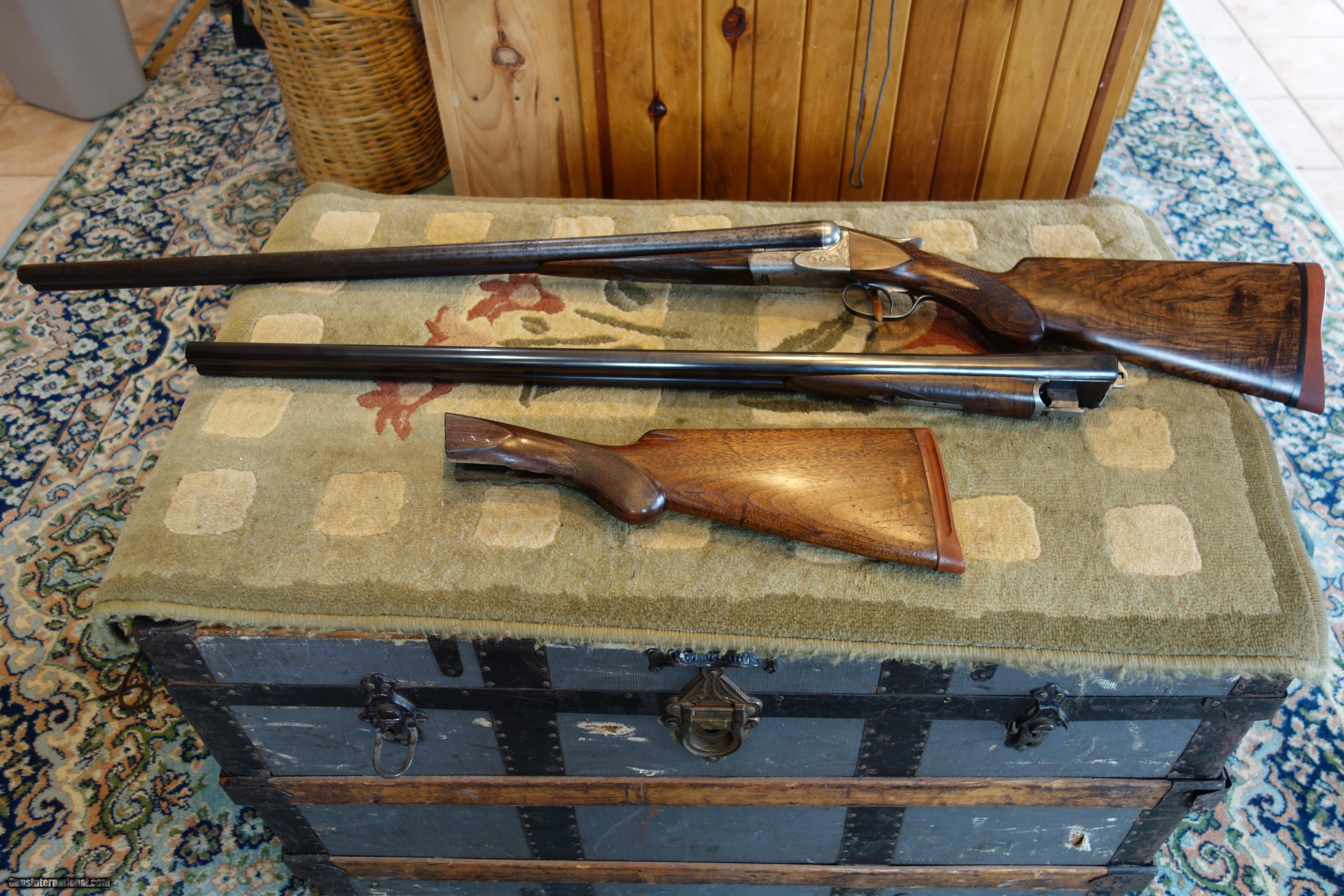 Description: 1st set -32" Full and Full. 2nd set is 32" sleeved barrels with Briley steel compatable screw in chokes installed. Both sets have 3" chambers and are so marked. Gun hase been restocked 1 1/2 X 2 1/4 X 14 1/2. The original stock is also included and is in good shape. This gun was featured in an article in the Double Gun Journal in the 2012 winter edition. It was shipped to Alaska a month before Fox advertised they would be offering the Super Fox. Both barrel sets are tight on face and the ejectors and single trigger work perfectly. Some interesting history here. SOLD Curio/Relic: Yes |