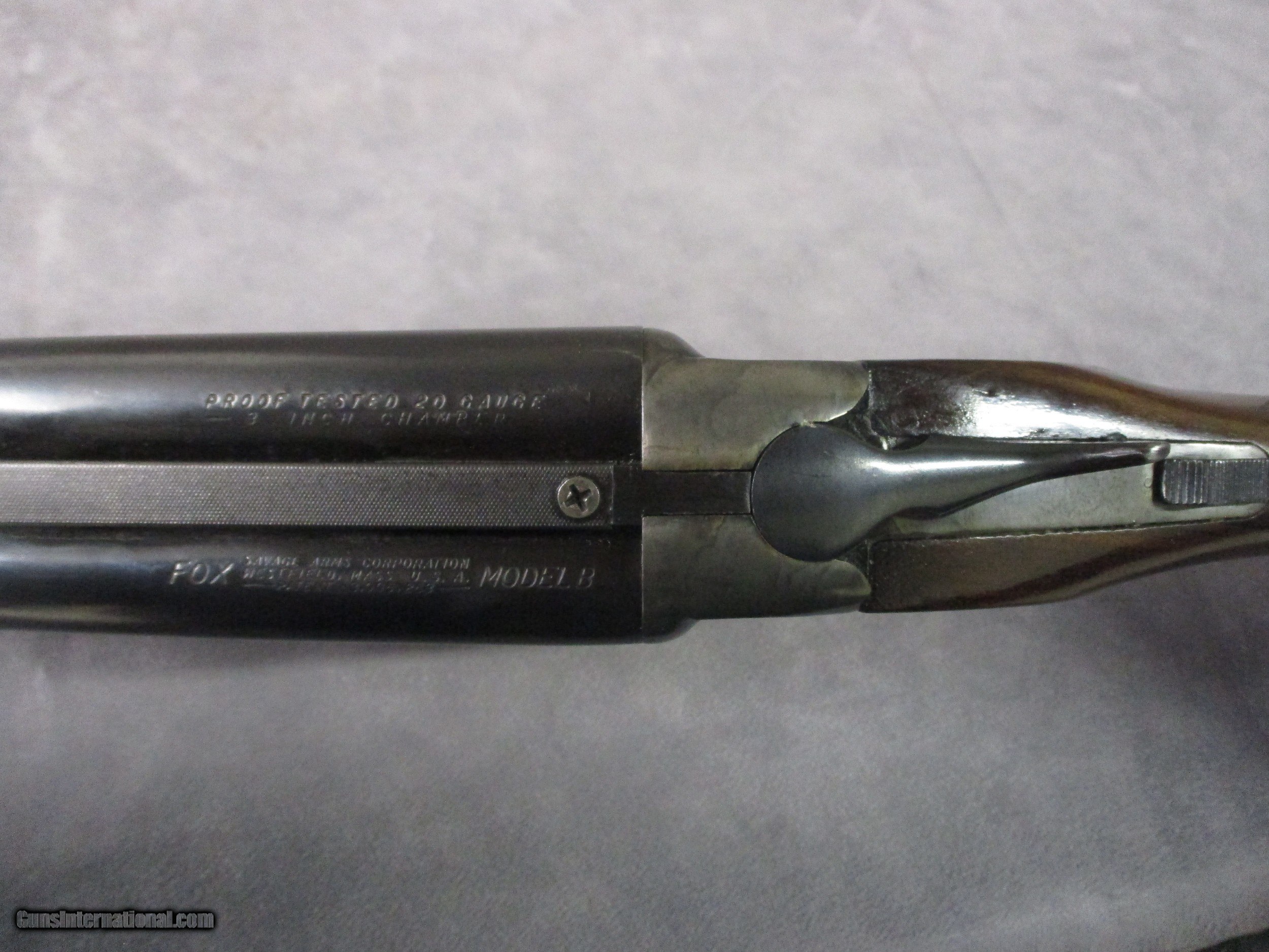 Description: The Fox Model B side-by-side shotgun was introduced to the market in 1940 although pre-production examples were produced as early as 1938. It features a case-hardened receiver, blued barrels, a checkered wood buttstock and forearm, and a ventilated rib. It is chambered for the 20 gauge, 3.0-inch shell. According to the Savage/Stevens date code on the bottom of the receiver, this one was made in 1964. It is in good condition given its age of 58 years. The case hardening of the receiver has worn with time which is common to any firearm with that type of finish. The barrels retain almost all of their bluing. The stock retains most of the finish with some wear on the lower left side. There is the usual handling wear as well. On the positive side, the lockup is still very tight, and the bores are very clean. The right bore appears to have been opened up slightly near the muzzle. It could have been done either at the factory or by a gunsmith. The right bore has a 0.610" constriction and the left one a 0.600" constriction. These more or less correspond to an improved cylinder (right) and a modified choke (left). These two choke sizes make the Model B suitable for a variety of uses including hunting and home defense. The Model B has two triggers which compared to single trigger SxS shotguns provides a nice level of redundancy. If one trigger is broken, only one barrel is affected, the other will still be functional. Having been made prior to 1968, this Model B does not have a serial number, only inspection markings on the inside of the receiver (“P.C.” and the circled letter’s “A” and “J”) and the aforementioned Savage date code. SOLD Shotgun Gauge: 20 Gauge Manufacturer: A.H. Fox Model: Model B Serial Number: NVSN Bore: Smoothbore Chambers: 3.0 and 2.75 inches (76 and 70 mm) Ejectors: None Condition: Used - Good to Excellent Barrels: SxS Barrel Type: Ribbed Action: Box-lock Triggers: Double Stock: Checkered wood, pistol grip Fore End: Checkered wood Butt Pad: Standard Plate LOP: 14.25 inches (362 mm) from front trigger, 13.25 inches (337 mm) from rear trigger Rib: Vent, 0.3125 inches (7.94 mm) wide Finish: Blued, Color case hardened Sights: Front silver bead, mid silver bead Manufacture Date: 1964 Choke Left: Modified Choke Right: Improved Cylinder Engraving: Fox head roll marked on bottom of frame, Fox logo engraved on both sides of receiver |