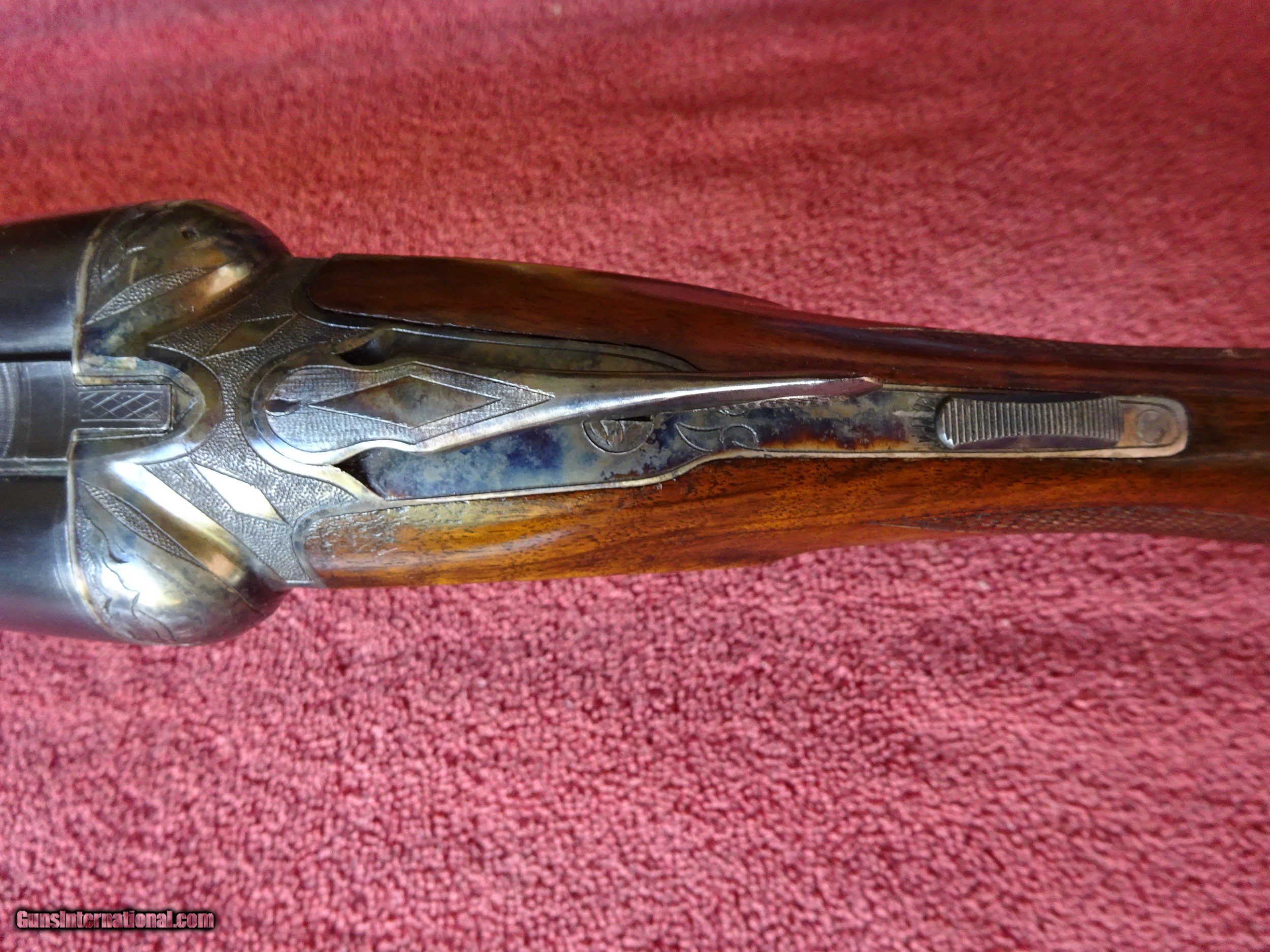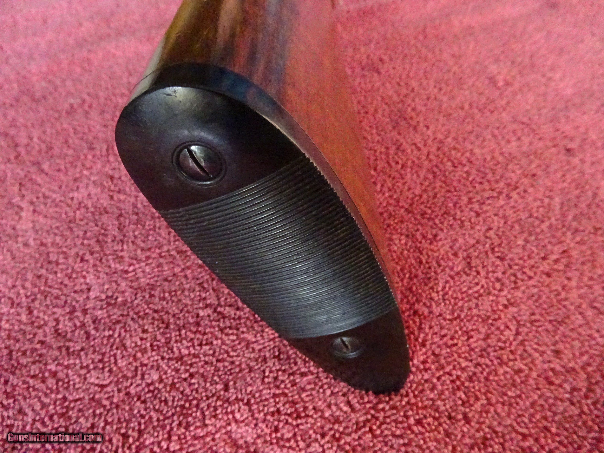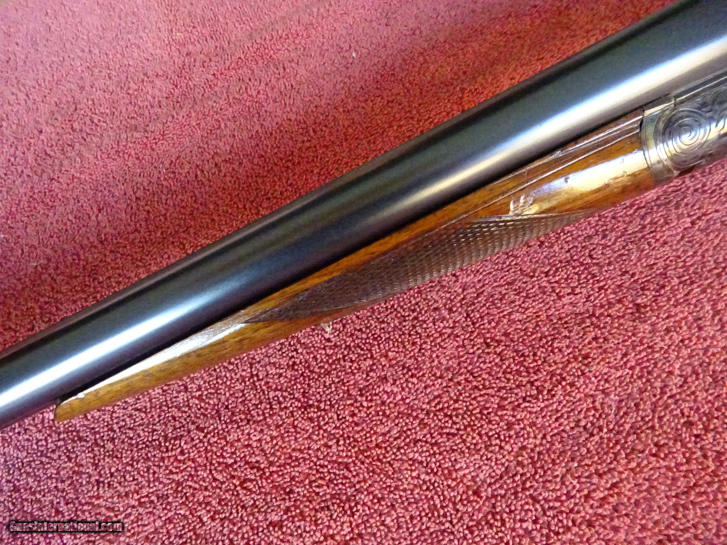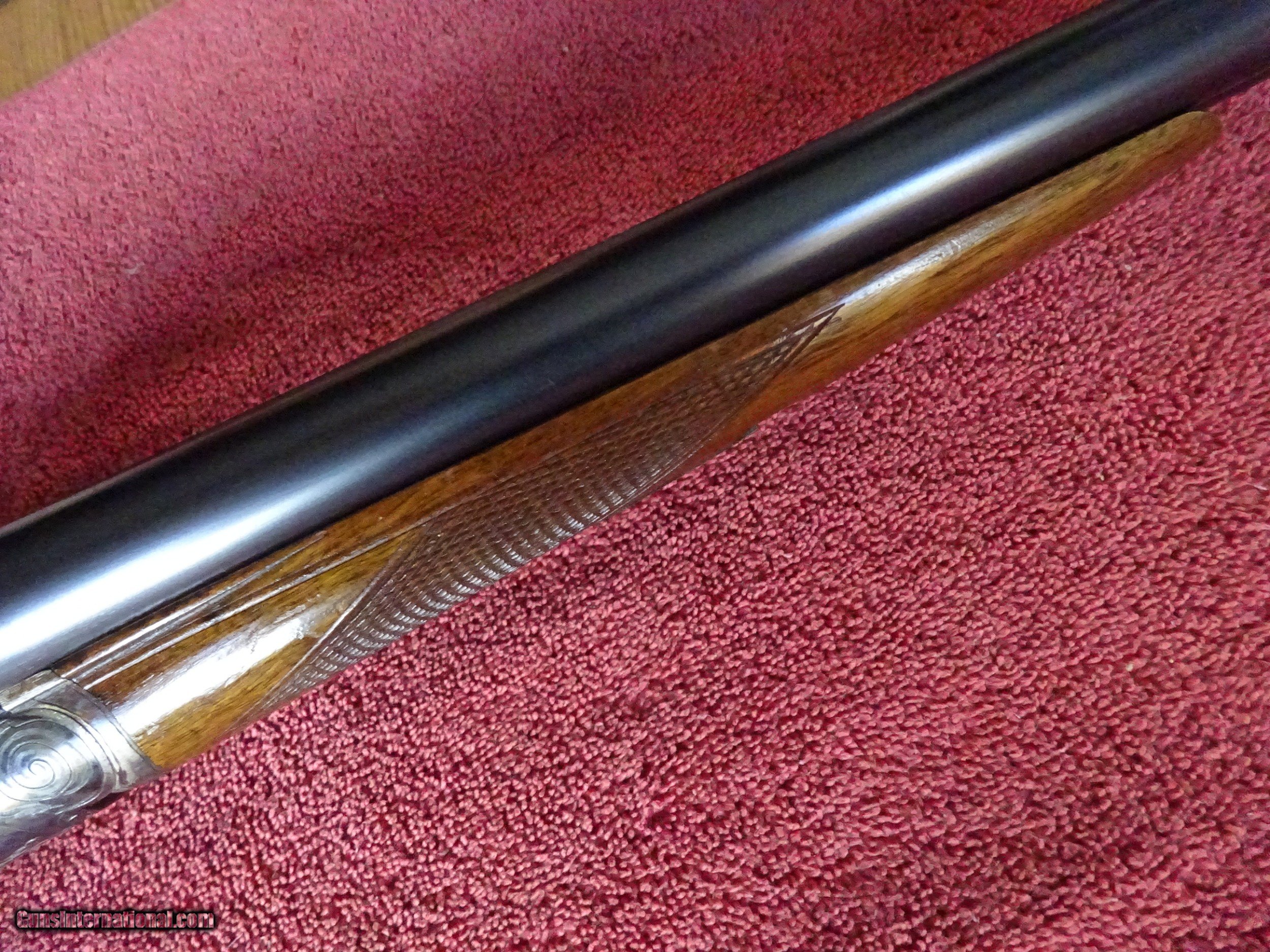 Description: A H FOX, PHIL., A GRADE 12 GUAGE. 30" CHROMOX STEEL NO. 2 WEIGHT BARRELS, MODIFIED AND FULL, 2 1/2" CHAMBERS, 100% BLUE, MIRROR PERFECT BORES, BARRELS RING BEAUTIFULLY. LATER STYLE DEEP CUT ENGRAVING, 100% BOLD VIVID CASE COLOR, PERFECT ENGRAVED SCREWS, TOP LEVER TO THE FAR RIGHT, TIGHT ON FACE. ROUND KNOB GRIP STOCK, SPLINTER FOREARM, ATTRACTIVE FIGURE AND COLOR, MINOR HANDLING MARKS IN THE VARNISH FINISH, 100% TRIGGERGUARD BLUE. ORIGINAL BUTTPLATE, 1 1/2" X 2 5/8" X 14 1/2", 7 POUNDS 3 OUNCES. I DOUBT THE GUN HAS EVER BEEN IN THE FIELD. NEAR PERFECT ORIGINAL CONDITION, MADE IN 1927. $3000.00 + $50.00 Insured shipping to an FFL address. See all Pats gun listings on this site! We also have hundreds of pieces of ORIGINAL gun company advertising & memorabilia available for sale on our site SPORTINGCOLLECTIBLES. We have no reprints or reproductions. Email for more information. SOLD Curio/Relic: Yes |
