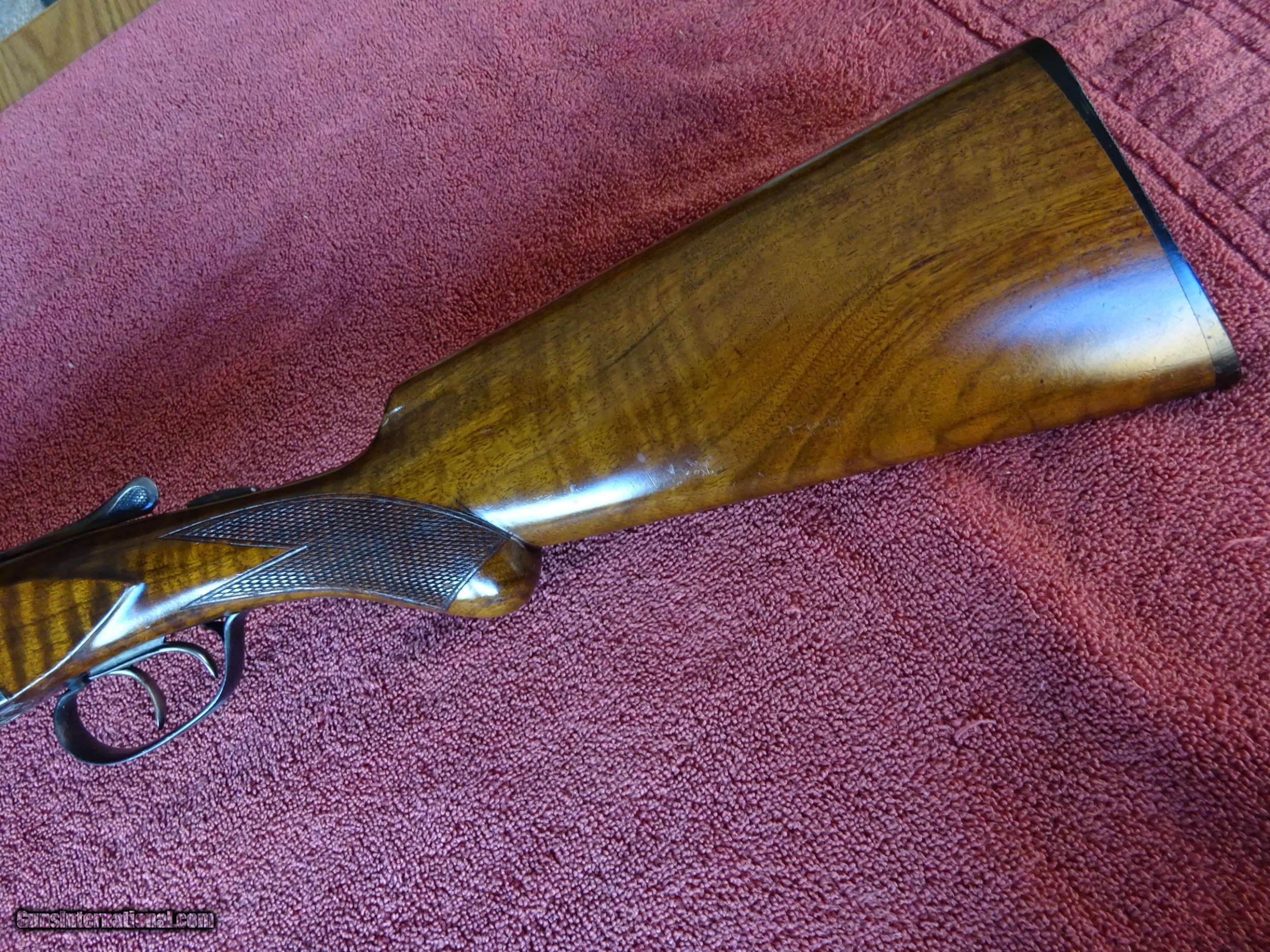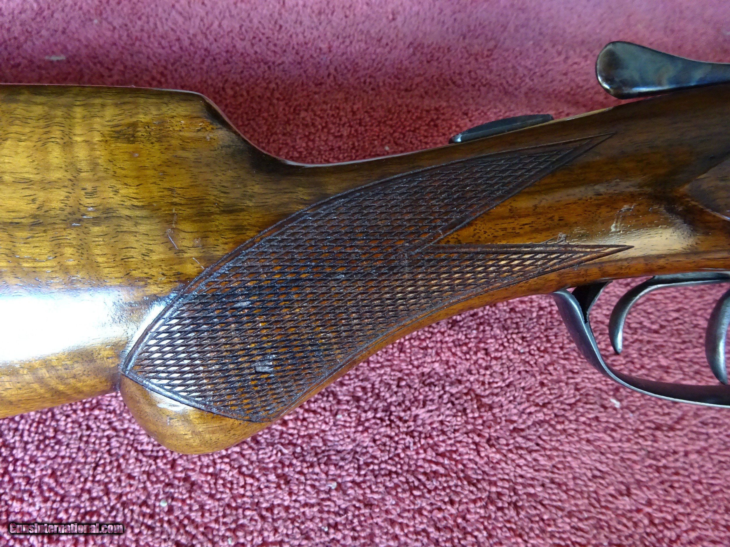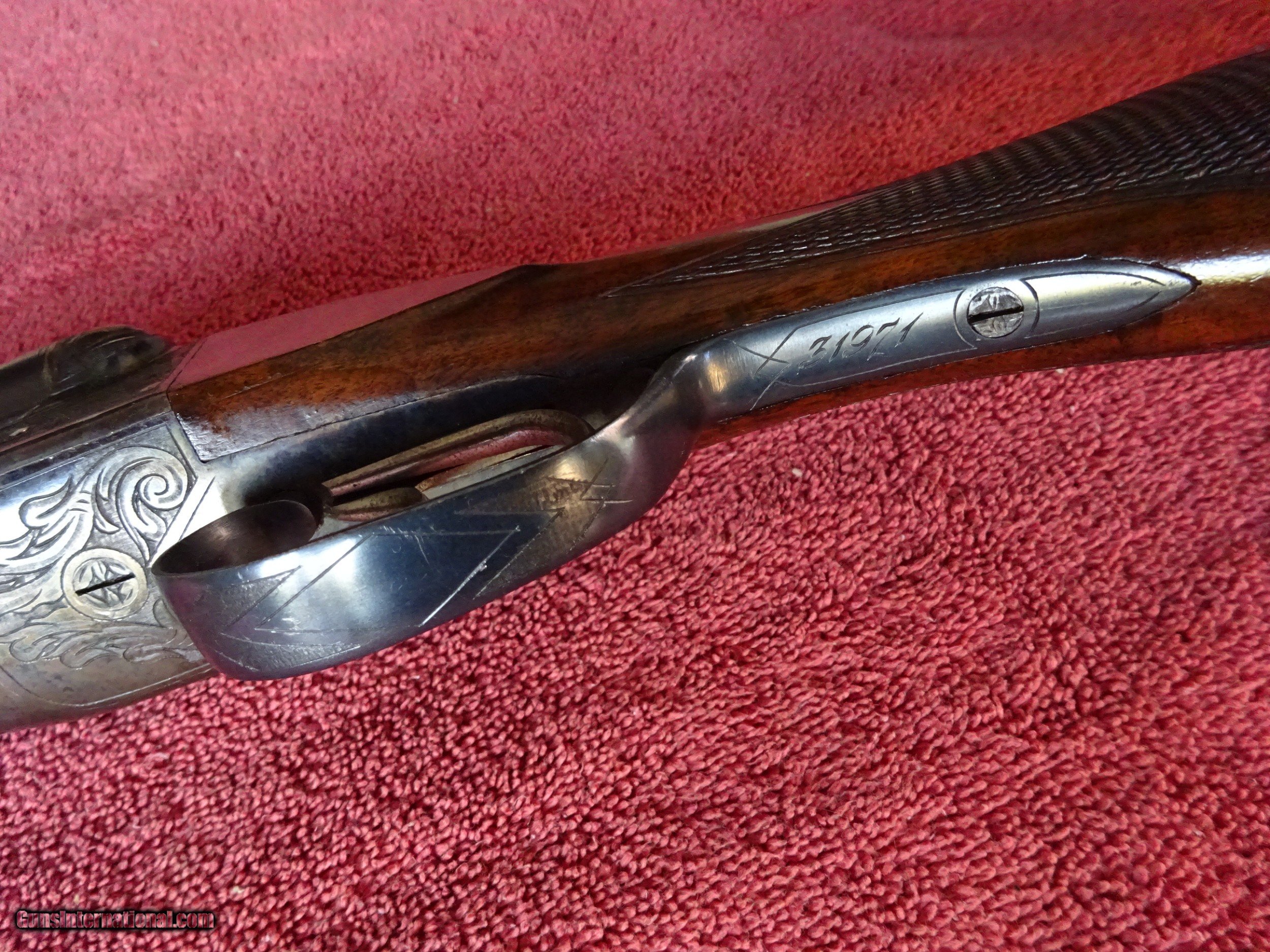 Description: A H FOX, PHIL., A GRADE 12 GUAGE. 30" CHROMOX STEEL NO. 2 WEIGHT BARRELS, MODIFIED AND FULL, 2 1/2" CHAMBERS, 100% BLUE, MIRROR PERFECT BORES, BARRELS RING BEAUTIFULLY. LATER STYLE DEEP CUT ENGRAVING, 100% BOLD VIVID CASE COLOR, PERFECT ENGRAVED SCREWS, TOP LEVER TO THE FAR RIGHT, TIGHT ON FACE. ROUND KNOB GRIP STOCK, SPLINTER FOREARM, ATTRACTIVE FIGURE AND COLOR, MINOR HANDLING MARKS IN THE VARNISH FINISH, 100% TRIGGERGUARD BLUE. ORIGINAL BUTTPLATE, 1 1/2" X 2 5/8" X 14 1/2", 7 POUNDS 3 OUNCES. I DOUBT THE GUN HAS EVER BEEN IN THE FIELD. NEAR PERFECT ORIGINAL CONDITION, MADE IN 1927. $3000.00 + $50.00 Insured shipping to an FFL address. See all Pats gun listings on this site! We also have hundreds of pieces of ORIGINAL gun company advertising & memorabilia available for sale on our site SPORTINGCOLLECTIBLES. We have no reprints or reproductions. Email for more information. SOLD Curio/Relic: Yes |