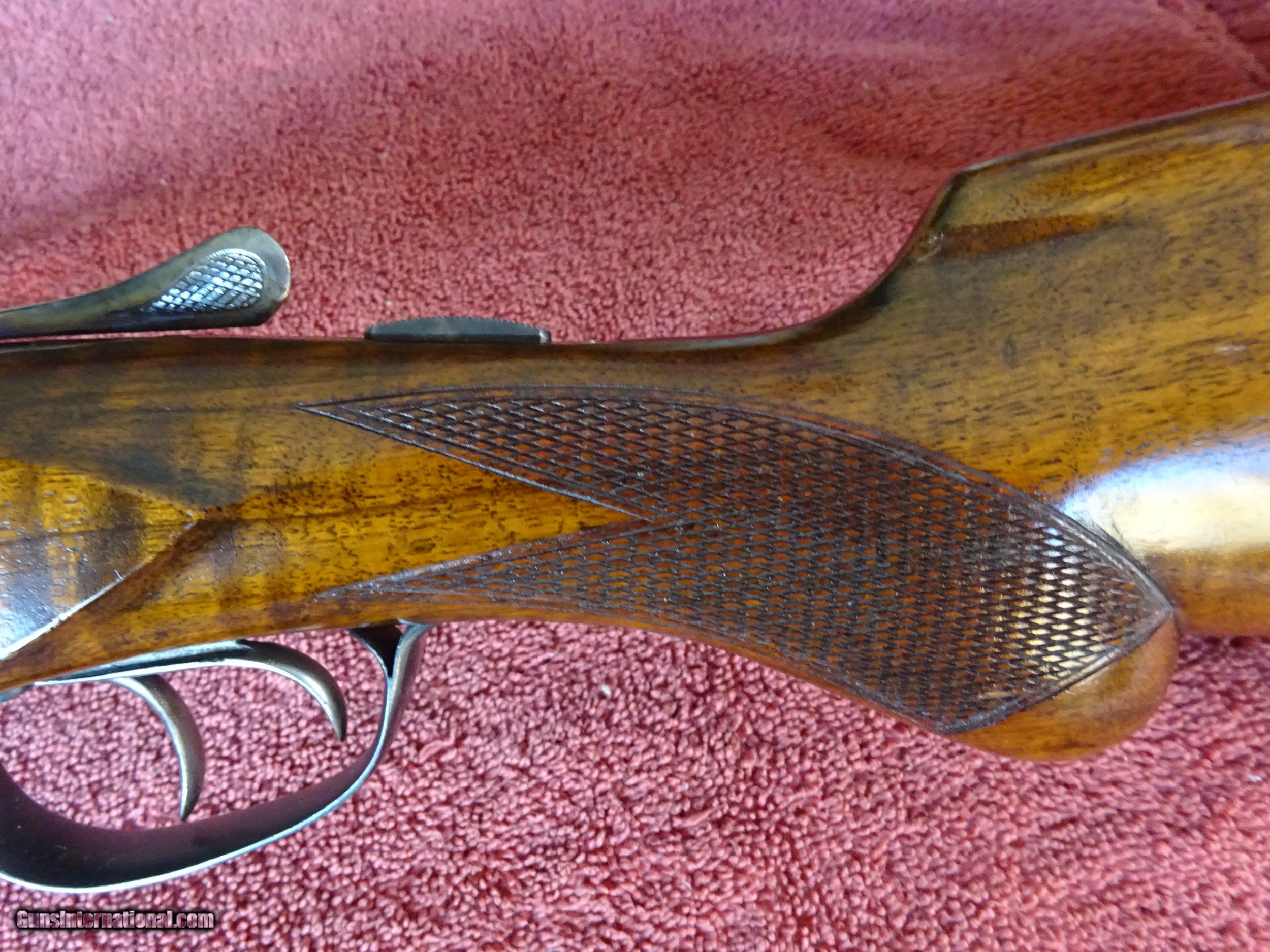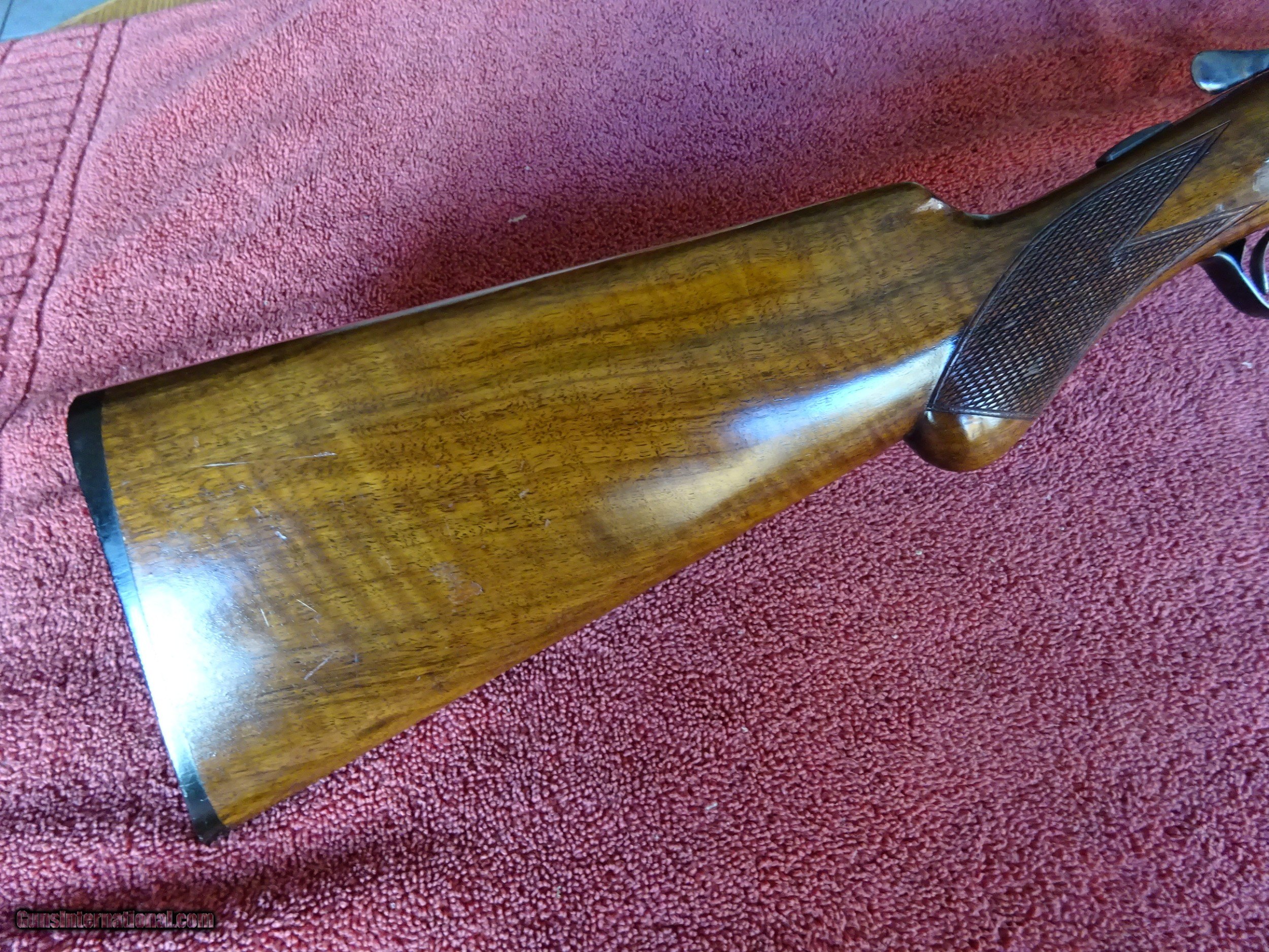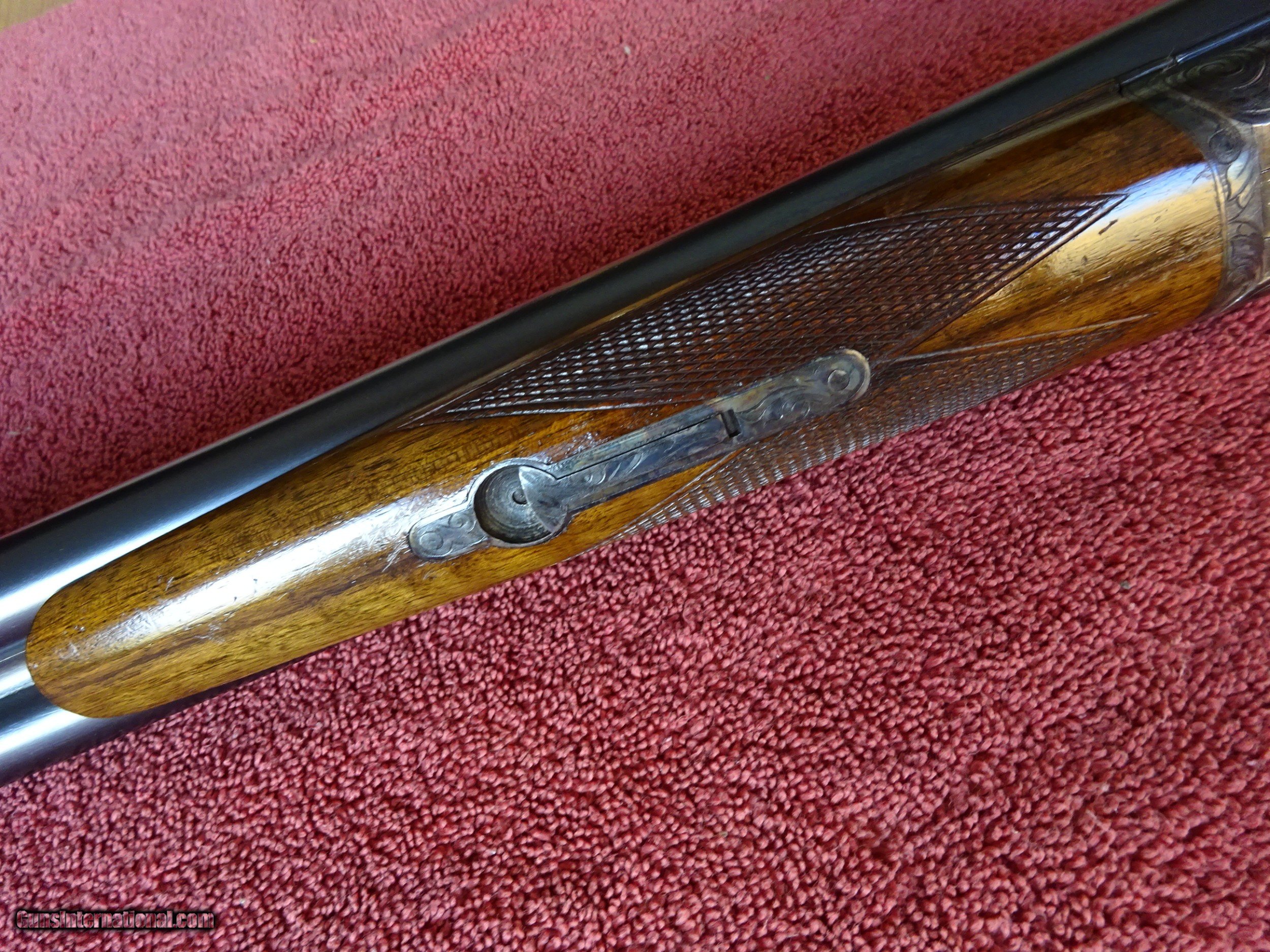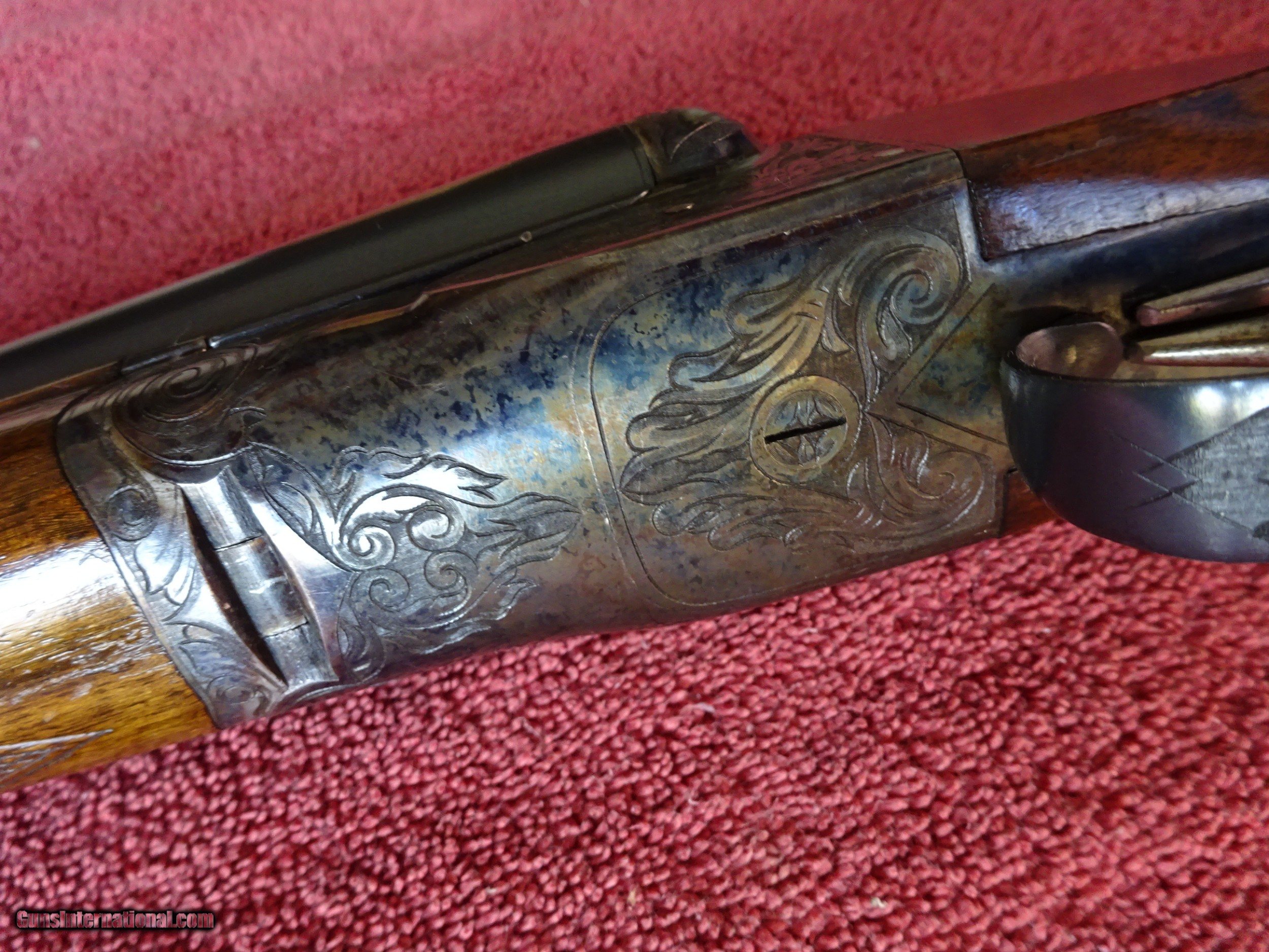Description: A H FOX, PHIL., A GRADE 12 GUAGE. 30" CHROMOX STEEL NO. 2 WEIGHT BARRELS, MODIFIED AND FULL, 2 1/2" CHAMBERS, 100% BLUE, MIRROR PERFECT BORES, BARRELS RING BEAUTIFULLY. LATER STYLE DEEP CUT ENGRAVING, 100% BOLD VIVID CASE COLOR, PERFECT ENGRAVED SCREWS, TOP LEVER TO THE FAR RIGHT, TIGHT ON FACE. ROUND KNOB GRIP STOCK, SPLINTER FOREARM, ATTRACTIVE FIGURE AND COLOR, MINOR HANDLING MARKS IN THE VARNISH FINISH, 100% TRIGGERGUARD BLUE. ORIGINAL BUTTPLATE, 1 1/2" X 2 5/8" X 14 1/2", 7 POUNDS 3 OUNCES. I DOUBT THE GUN HAS EVER BEEN IN THE FIELD. NEAR PERFECT ORIGINAL CONDITION, MADE IN 1927. $3000.00 + $50.00 Insured shipping to an FFL address. See all Pats gun listings on this site! We also have hundreds of pieces of ORIGINAL gun company advertising & memorabilia available for sale on our site SPORTINGCOLLECTIBLES. We have no reprints or reproductions. Email for more information. SOLD Curio/Relic: Yes |