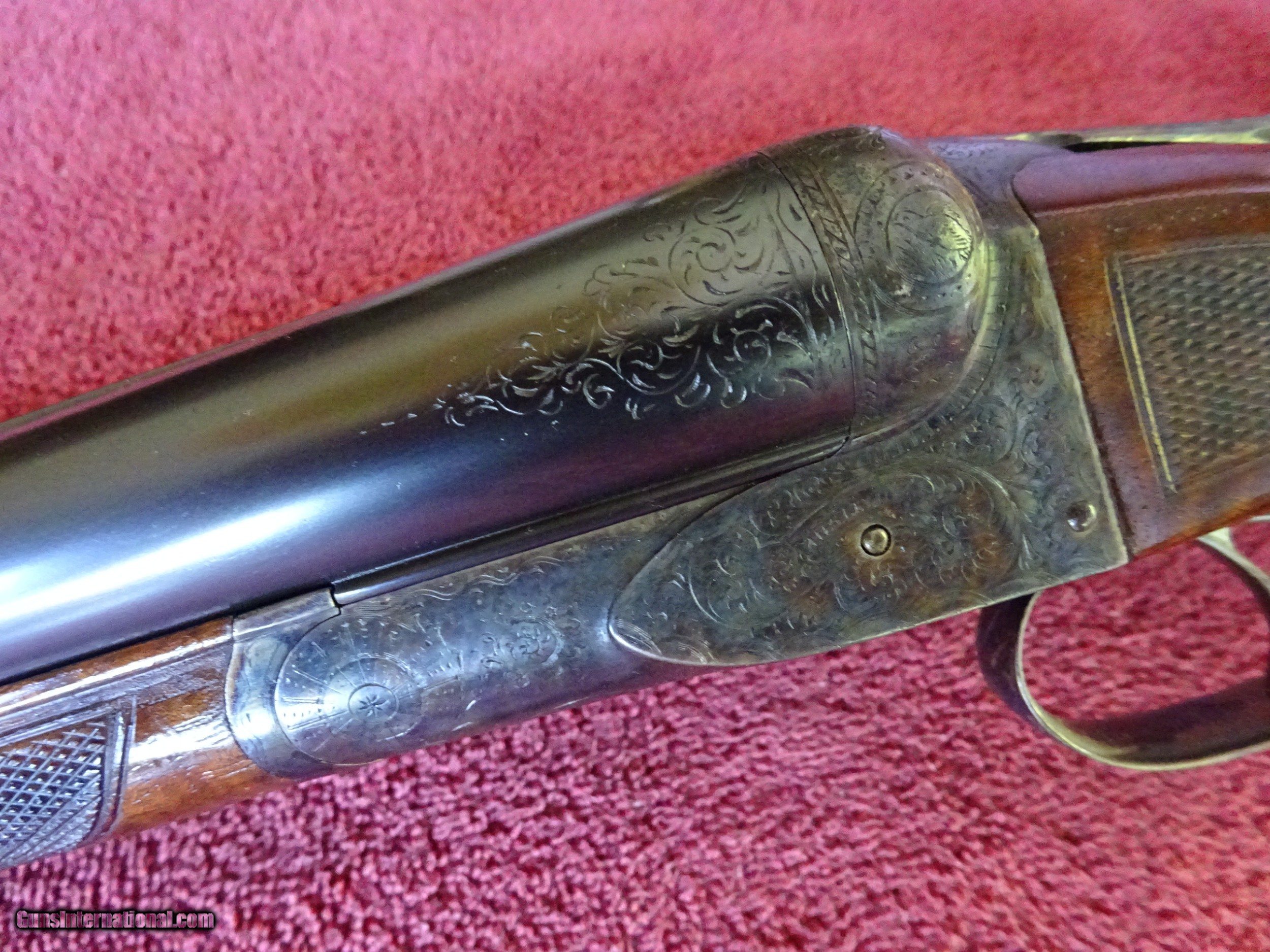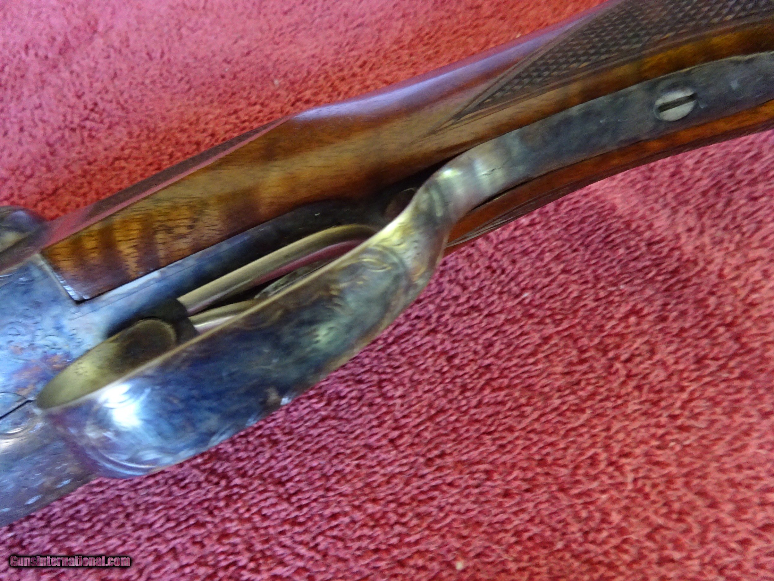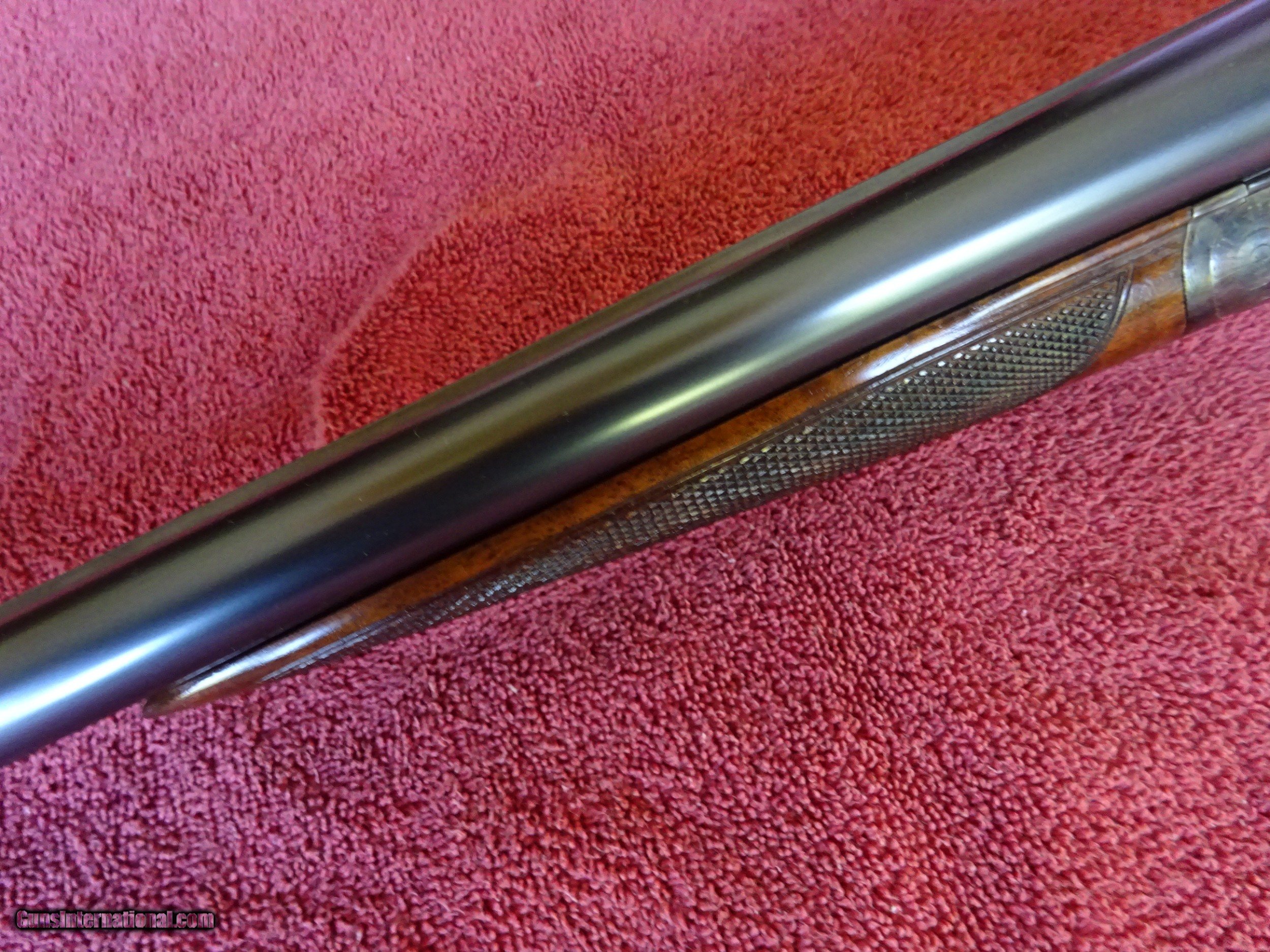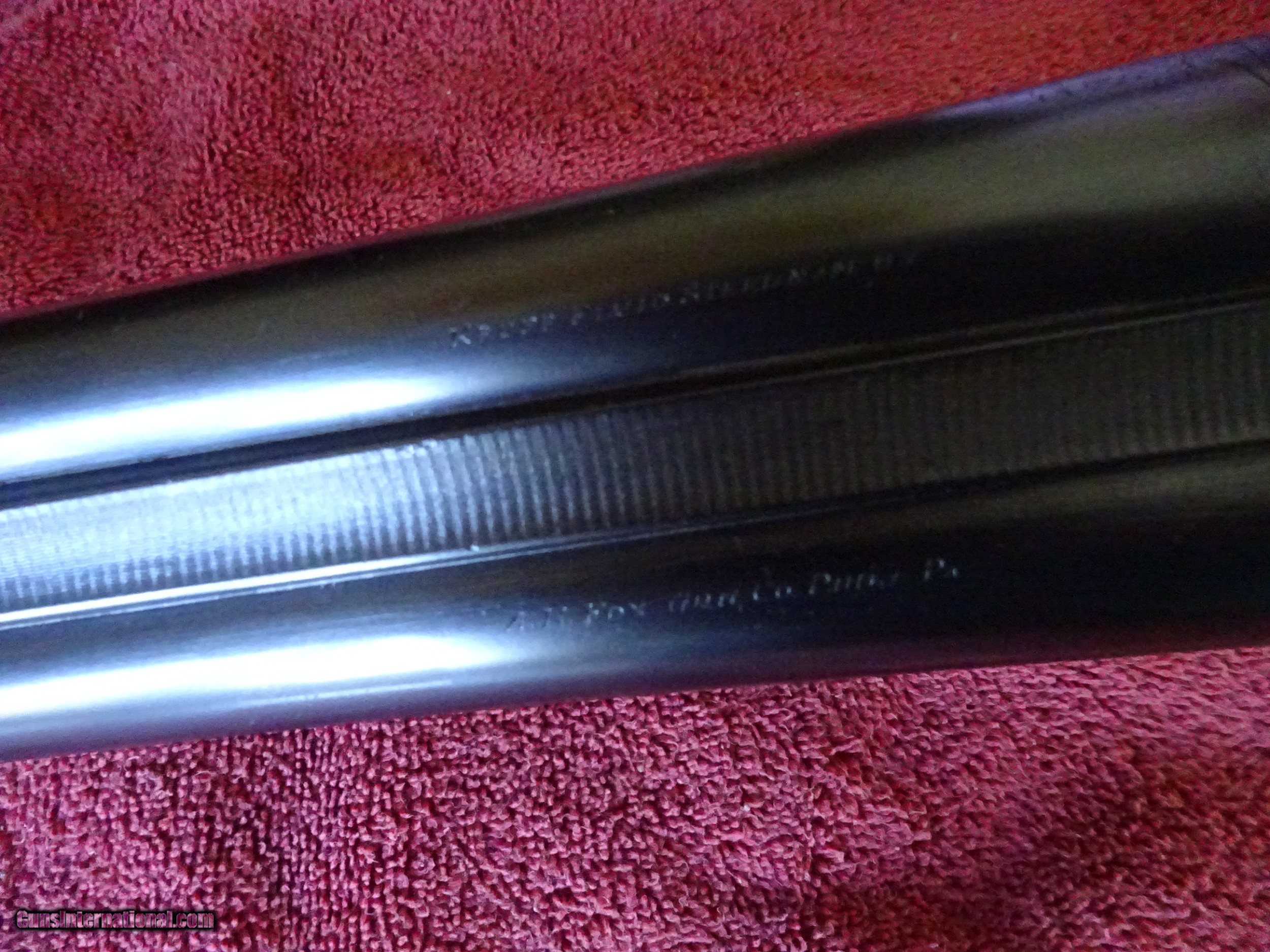 Description: SALE PENDING A H FOX, PHIL., C GRADE 12 GAUGE. KRUPP FLUID STEEL 30" BARRELS, IMCYL. (.010) AND MODIFIED (.015), 98% BLUE, MIRROR PERFECT FORES, SINGLE SIGHT, ENGRAVED AT THE BREECH ENDS, TYPICAL EARLY LOW WIDE RIB, BARRELS RING NICELY. TOP LEVER TO THE FAR RIGHT, TIGHT ON FACE, INTERESTING ENGRAVING, VERY FINE SCROLL ON THE SIDES RATHER THAN GAME BIRDS, TYPICAL ENGLISH SETTER ON THE BOTTOM, DUCK IN FLIGHT ON THE TRIGGERGUARD, PERFECT ENGRAVED SCREWS. PISTOL GRIP STOCK, SPLINTER FOREARM, NICELY FIGURED EUROPEAN WALNUT, PERFECT WOOD FINISH AND CHECKERING. ORIGINAL GRIP CAP, LEATHER COVERED PAD, GREAT DIMENSIONS, 1 1/2" X 2 1/4" X 14 3/4", 7 POUNDS 3 OUNCES. THE GUN WAS PROFESSIONALLY RESTORED WITH THE CORRECT FINISHES. MADE IN THE FIRST YEAR OF PRODUCTION 1907. THIS IS THE EARLIEST PRODUCED BOX I HAVE EVER SEEN. ATTRACTIVE GUN, 4 DIGIT SERIAL NUMBER. $5200.00 + $60.00 Insured shipping to an FFL address. Layaway is available. See all Pats gun listings on this site! We also have hundreds of pieces of ORIGINAL gun company advertising & memorabilia available for sale on our site SPORTINGCOLLECTIBLES. We have no reprints or reproductions. Email for more information. SOLD Curio/Relic: Yes |