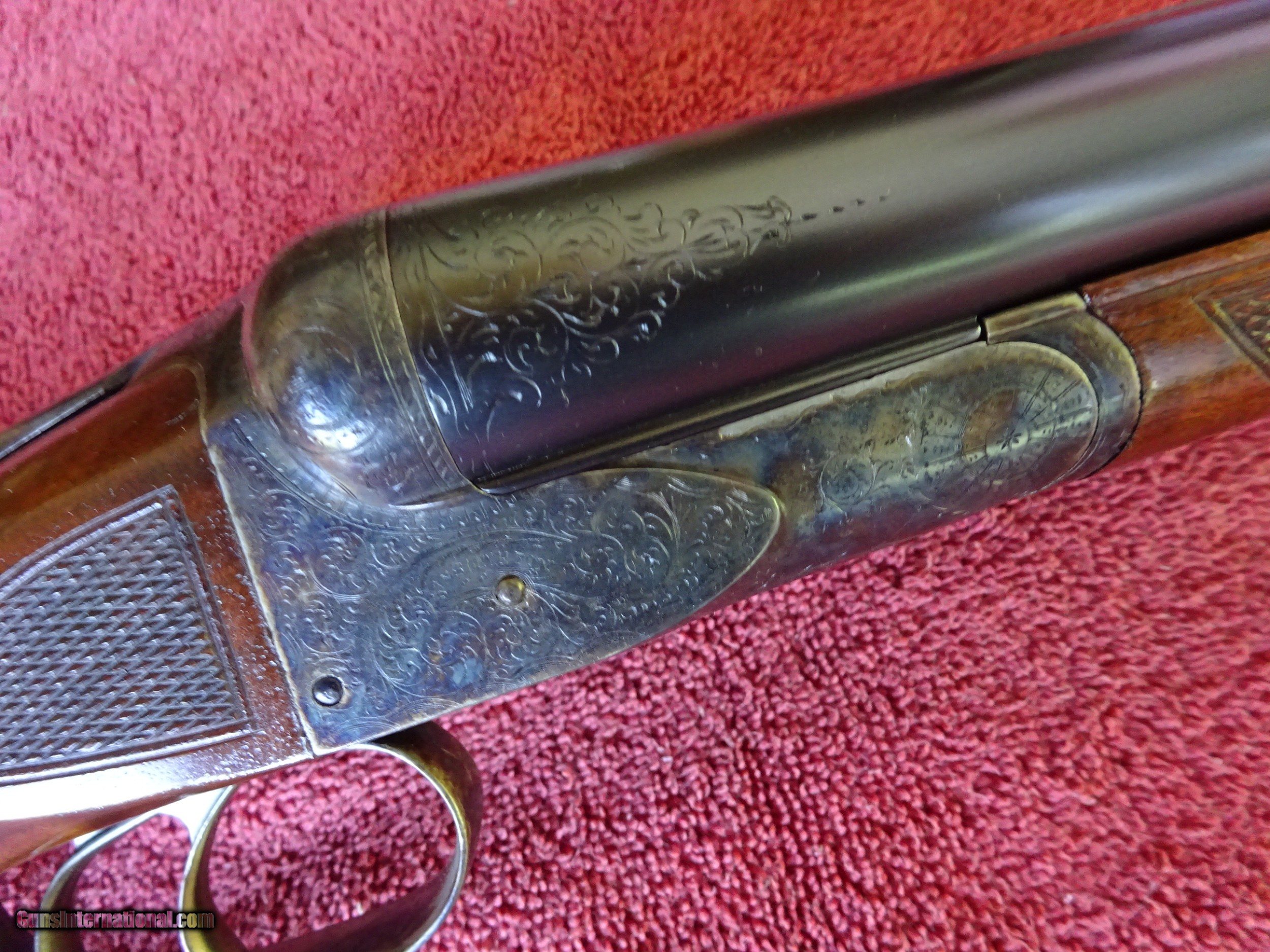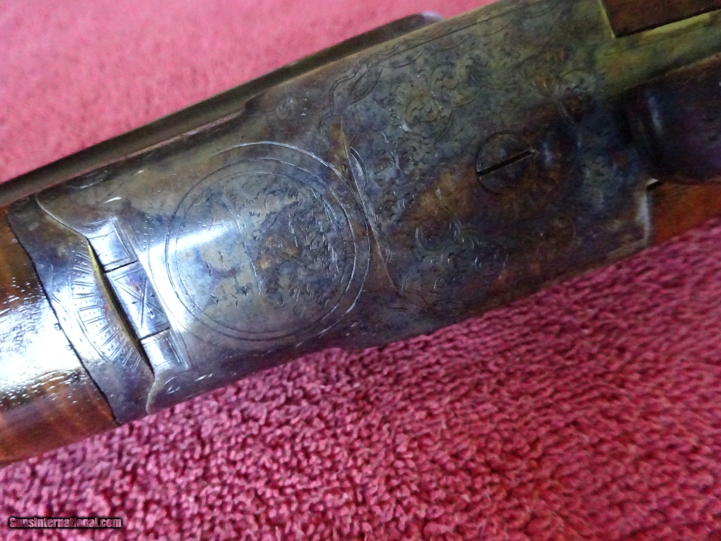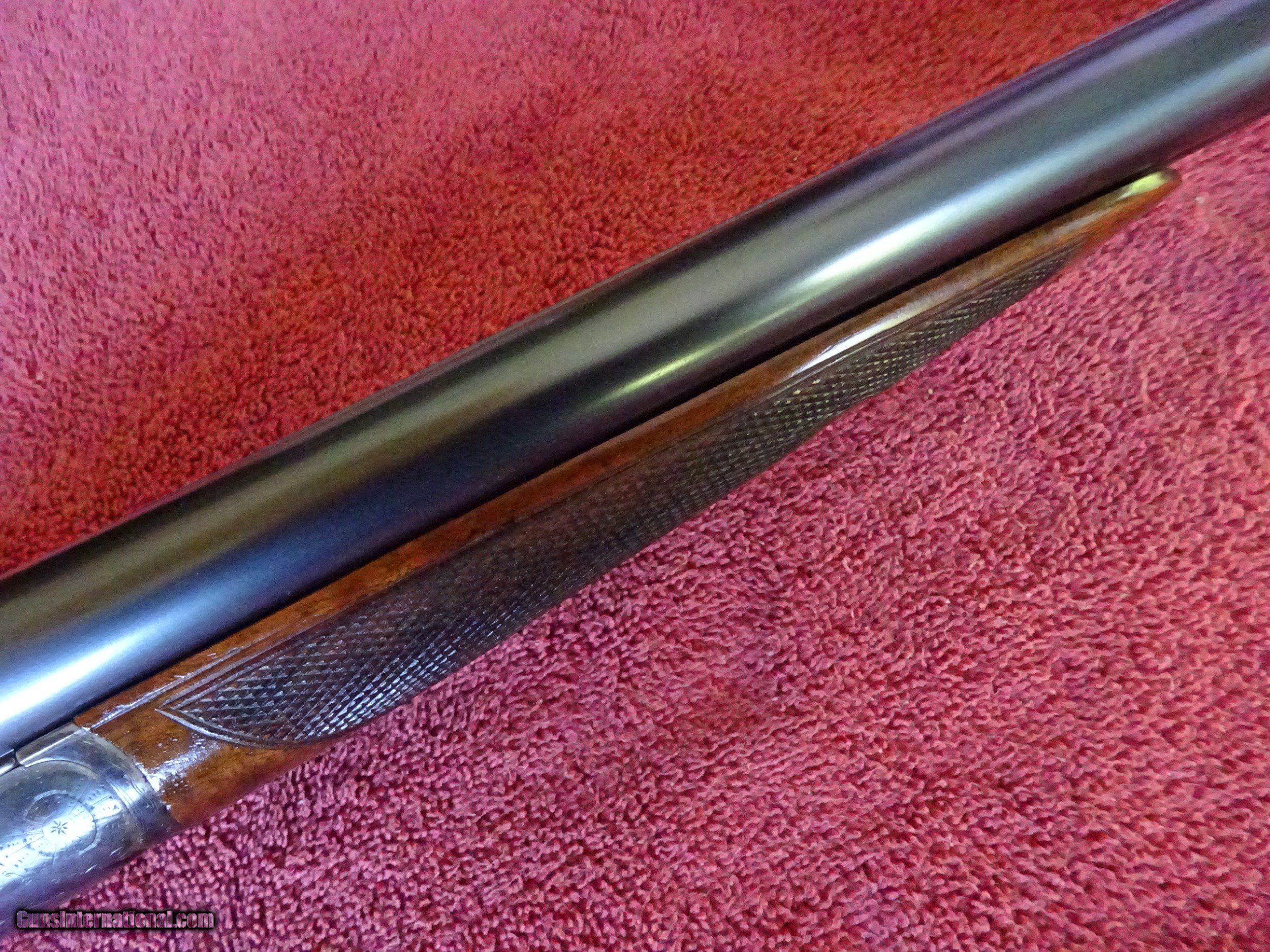 Description: SALE PENDING A H FOX, PHIL., C GRADE 12 GAUGE. KRUPP FLUID STEEL 30" BARRELS, IMCYL. (.010) AND MODIFIED (.015), 98% BLUE, MIRROR PERFECT FORES, SINGLE SIGHT, ENGRAVED AT THE BREECH ENDS, TYPICAL EARLY LOW WIDE RIB, BARRELS RING NICELY. TOP LEVER TO THE FAR RIGHT, TIGHT ON FACE, INTERESTING ENGRAVING, VERY FINE SCROLL ON THE SIDES RATHER THAN GAME BIRDS, TYPICAL ENGLISH SETTER ON THE BOTTOM, DUCK IN FLIGHT ON THE TRIGGERGUARD, PERFECT ENGRAVED SCREWS. PISTOL GRIP STOCK, SPLINTER FOREARM, NICELY FIGURED EUROPEAN WALNUT, PERFECT WOOD FINISH AND CHECKERING. ORIGINAL GRIP CAP, LEATHER COVERED PAD, GREAT DIMENSIONS, 1 1/2" X 2 1/4" X 14 3/4", 7 POUNDS 3 OUNCES. THE GUN WAS PROFESSIONALLY RESTORED WITH THE CORRECT FINISHES. MADE IN THE FIRST YEAR OF PRODUCTION 1907. THIS IS THE EARLIEST PRODUCED BOX I HAVE EVER SEEN. ATTRACTIVE GUN, 4 DIGIT SERIAL NUMBER. $5200.00 + $60.00 Insured shipping to an FFL address. Layaway is available. See all Pats gun listings on this site! We also have hundreds of pieces of ORIGINAL gun company advertising & memorabilia available for sale on our site SPORTINGCOLLECTIBLES. We have no reprints or reproductions. Email for more information. SOLD Curio/Relic: Yes |