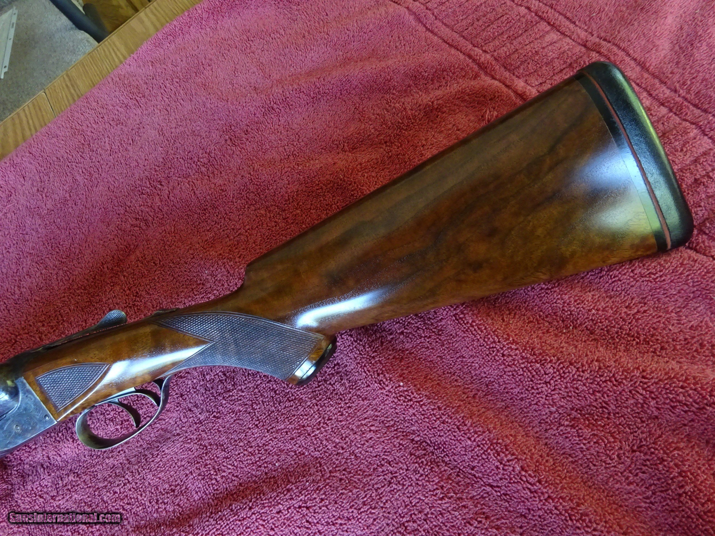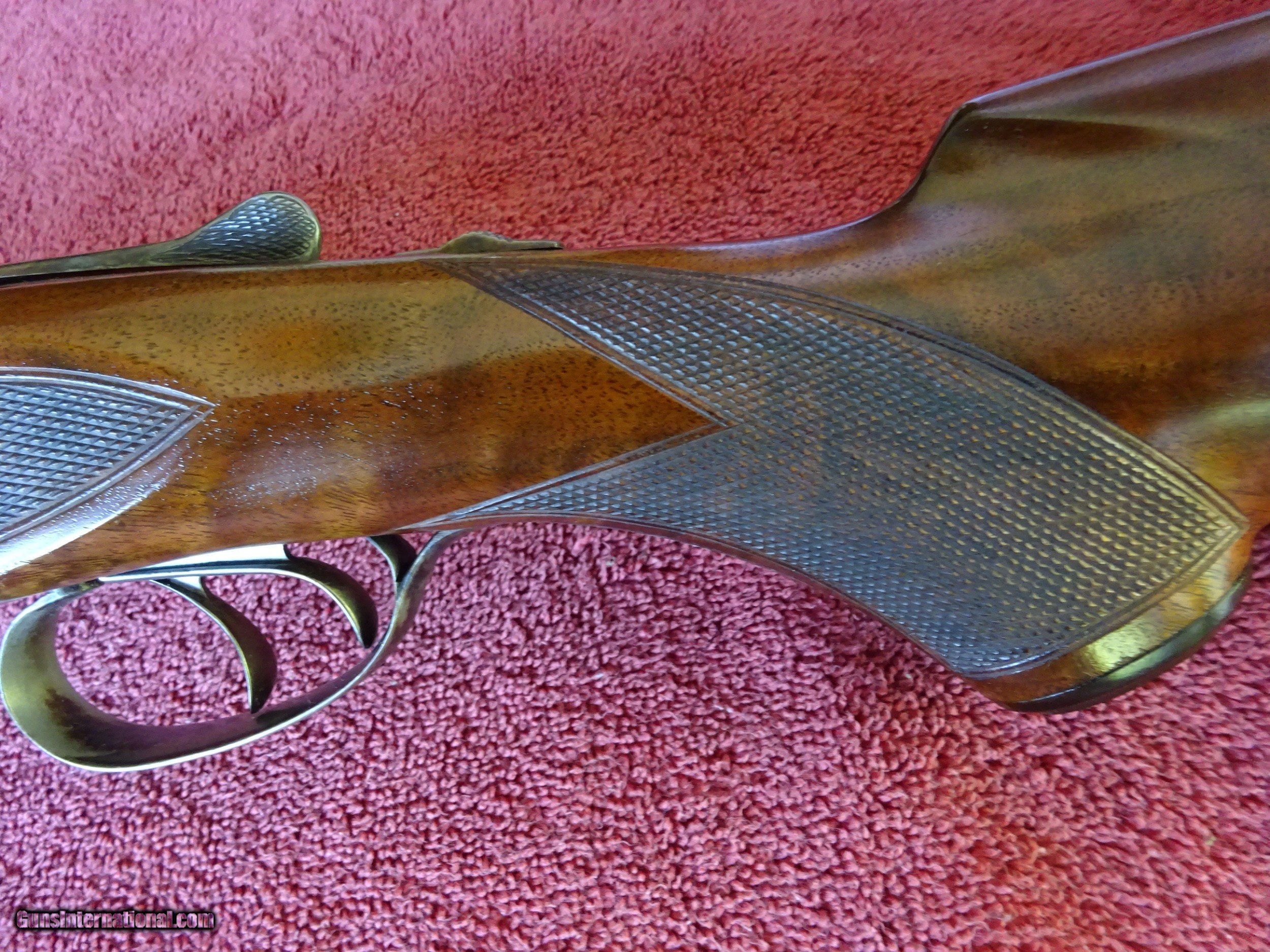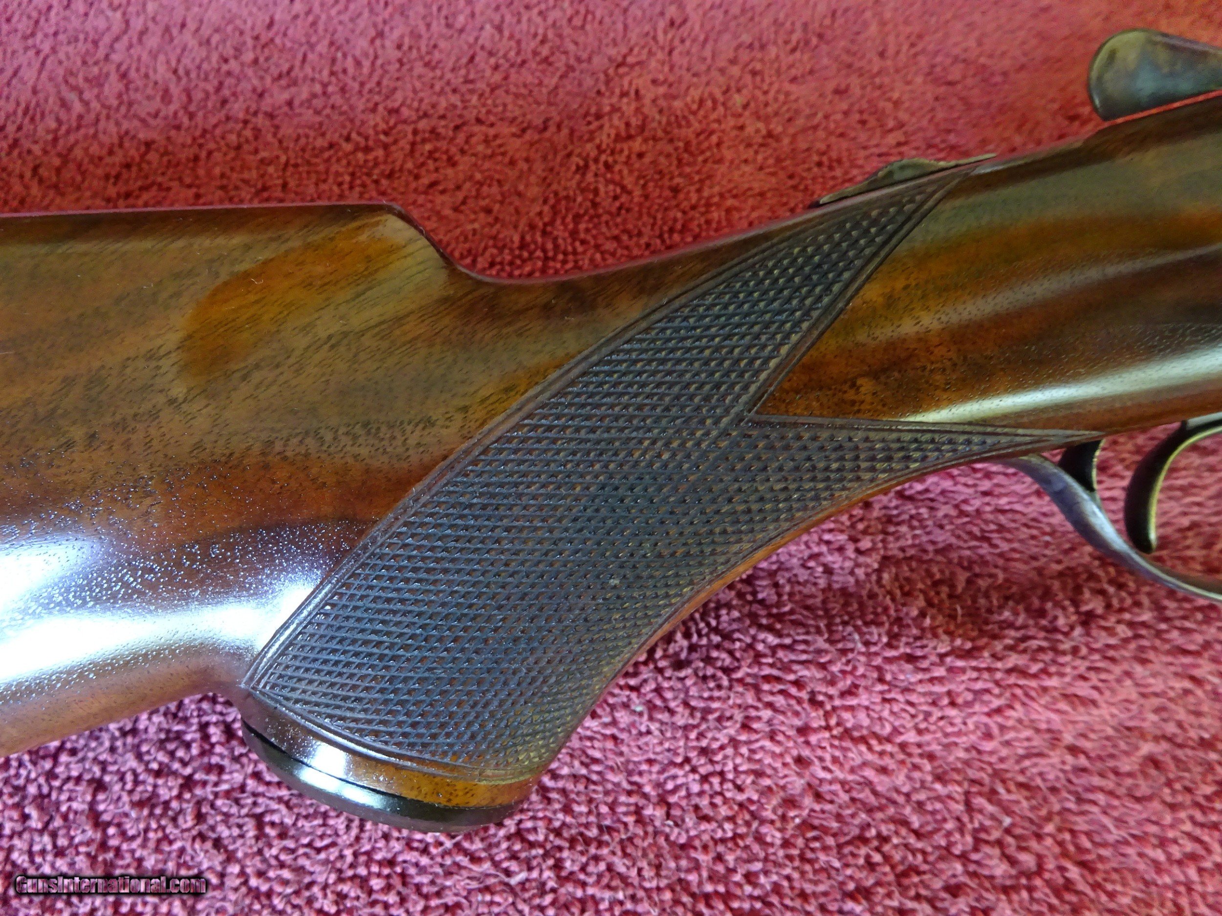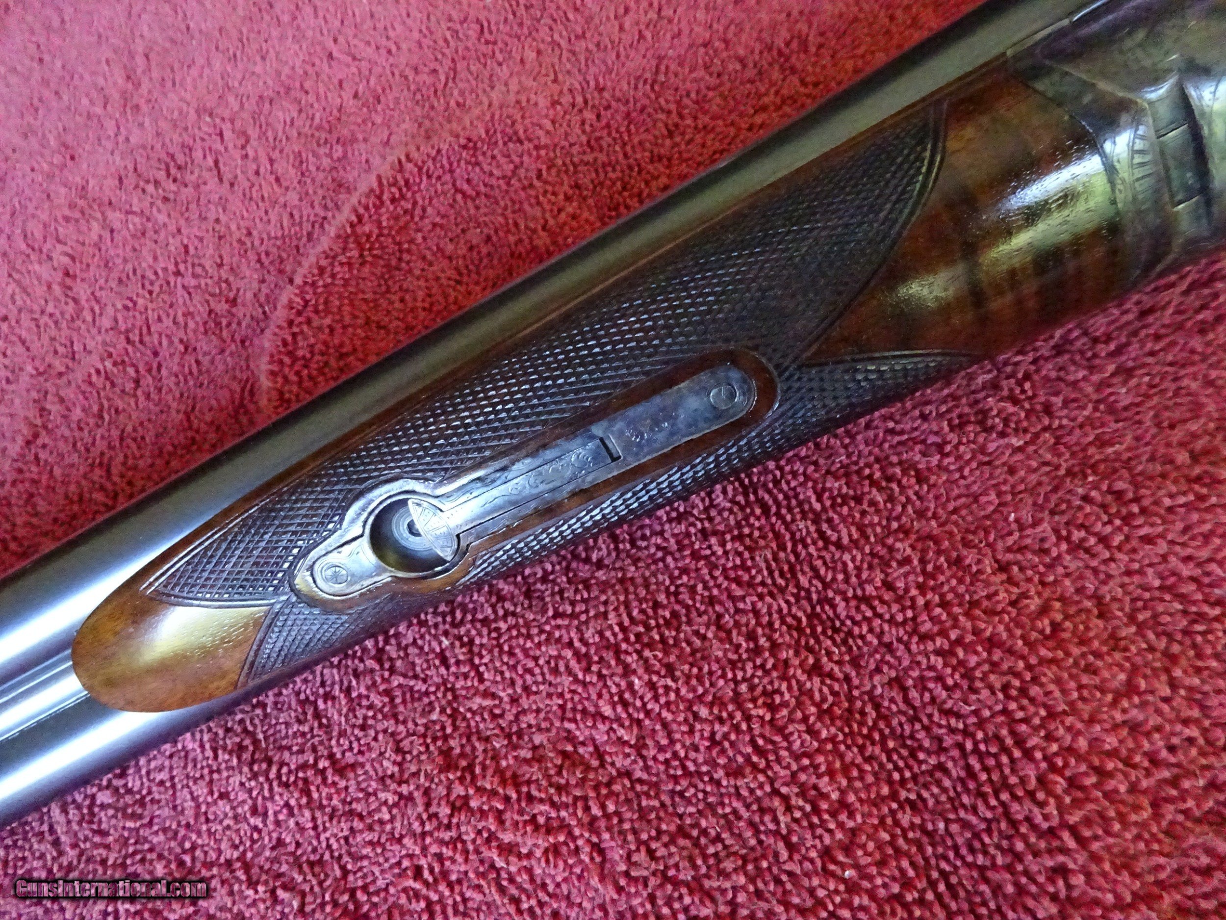 Description: SALE PENDING A H FOX, PHIL., C GRADE 12 GAUGE. KRUPP FLUID STEEL 30" BARRELS, IMCYL. (.010) AND MODIFIED (.015), 98% BLUE, MIRROR PERFECT FORES, SINGLE SIGHT, ENGRAVED AT THE BREECH ENDS, TYPICAL EARLY LOW WIDE RIB, BARRELS RING NICELY. TOP LEVER TO THE FAR RIGHT, TIGHT ON FACE, INTERESTING ENGRAVING, VERY FINE SCROLL ON THE SIDES RATHER THAN GAME BIRDS, TYPICAL ENGLISH SETTER ON THE BOTTOM, DUCK IN FLIGHT ON THE TRIGGERGUARD, PERFECT ENGRAVED SCREWS. PISTOL GRIP STOCK, SPLINTER FOREARM, NICELY FIGURED EUROPEAN WALNUT, PERFECT WOOD FINISH AND CHECKERING. ORIGINAL GRIP CAP, LEATHER COVERED PAD, GREAT DIMENSIONS, 1 1/2" X 2 1/4" X 14 3/4", 7 POUNDS 3 OUNCES. THE GUN WAS PROFESSIONALLY RESTORED WITH THE CORRECT FINISHES. MADE IN THE FIRST YEAR OF PRODUCTION 1907. THIS IS THE EARLIEST PRODUCED BOX I HAVE EVER SEEN. ATTRACTIVE GUN, 4 DIGIT SERIAL NUMBER. $5200.00 + $60.00 Insured shipping to an FFL address. Layaway is available. See all Pats gun listings on this site! We also have hundreds of pieces of ORIGINAL gun company advertising & memorabilia available for sale on our site SPORTINGCOLLECTIBLES. We have no reprints or reproductions. Email for more information. SOLD Curio/Relic: Yes |