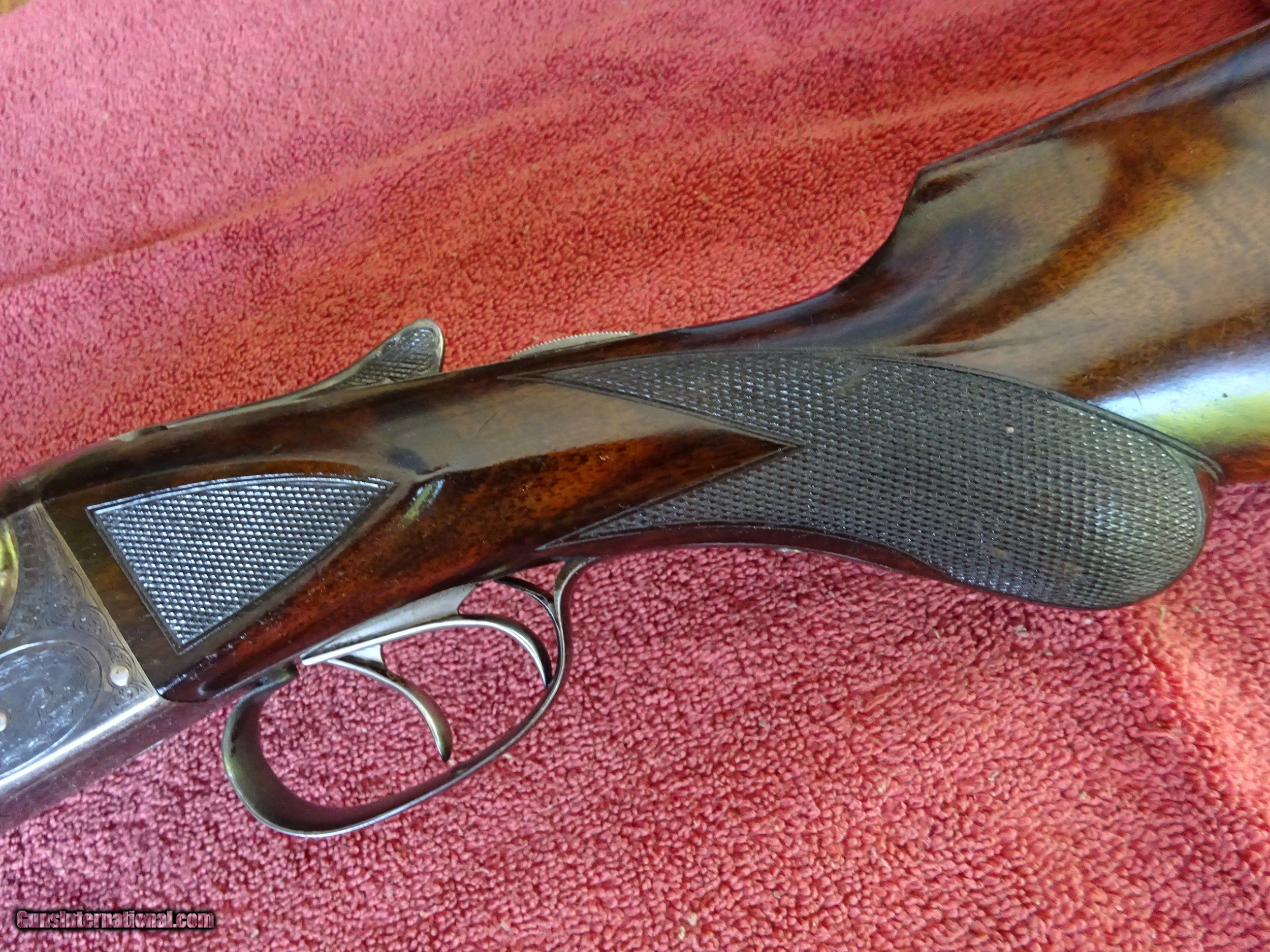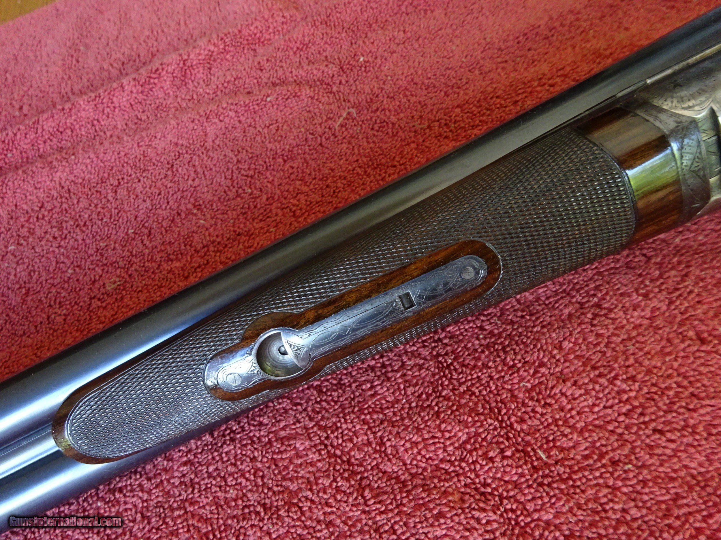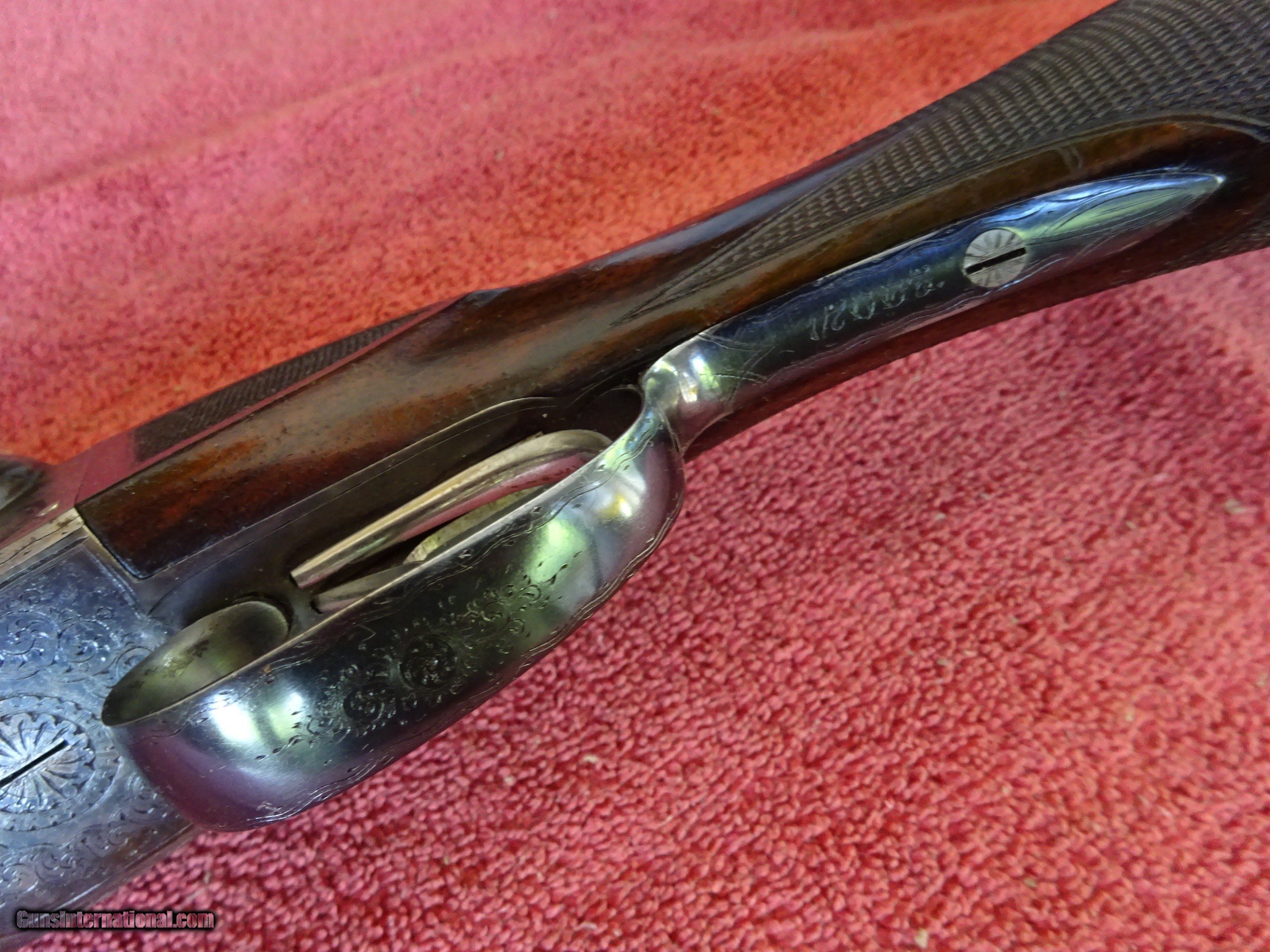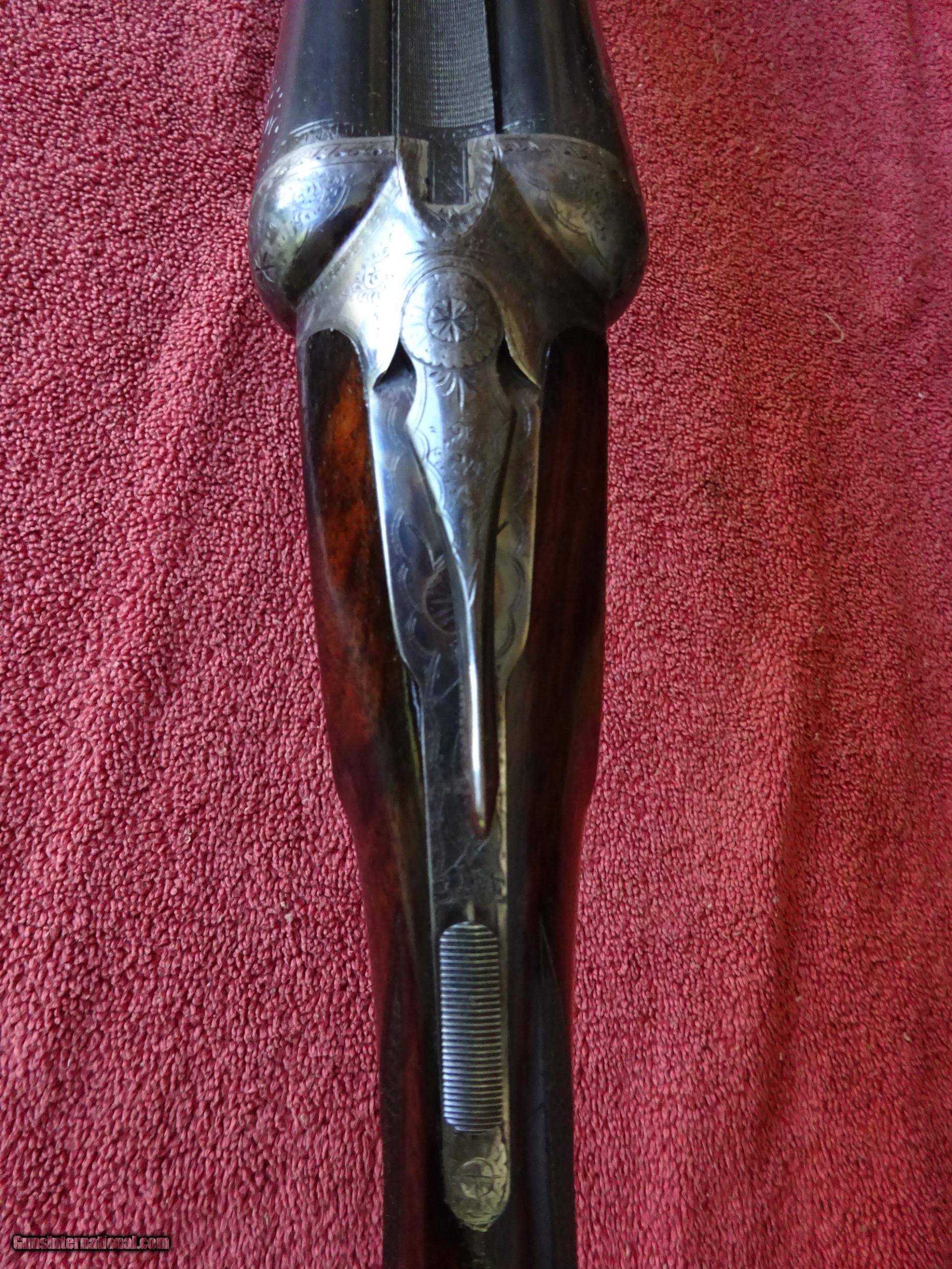 Description: A H FOX, PHIL., C GRADE 12 GAUGE. KRUPP FLUID STEEL 30" BARRELS, NUMBER 3 WEIGHT, IMCYL. AND FULL, 2 3/4" CHAMBERS. BARRELS RING LIKE A BELL. ENGRAVED AT BREECH ENDS, 98% BRIGHT BLUE, MIRROR PERFECT BORES, SINGLE BEAD SIGHT. NICELY ENGRAVED WITH PAIR OF STANDING WOODCOCK ON THE RIGHT SIDE, PAIR OF STANDING QUAIL ON THE LEFT, ENGLISH SETTER ON POINT ON THE BOTTOM PLUS FINE SCROLLWORK AND INTRICATE BORDERS. THE FRAME IS COVERED WITH BOLD VIVID CASE COLOR, PERFECT ENGRAVED SCREWS, TOP LEVER TO THE FAR RIGHT AND TIGHT ON FACE. ROUND KNOB GRIP STOCK, SPLINTER FOREARM, NEAR PERFECT CHECKERING AND FINISH. OUTSTANDING WOOD WITH GORGEOUS FIGURE AND COLOR. ORIGINAL BUTTPLATE WITH ENGRAVED SCREWS, VERY UNUSUAL DIMENSIONS, 1 5/8" X 3 1/2" X 13 1/2", 7 POUNDS 2 OUNCES. VERY HIGH QUALITY COLLECTOR CONDITION FOX MADE IN 1911. $5500.00 + $60.00 Insured shipping to an FFL address. Layaway is available. See all Pats gun listings on this site! We also have hundreds of pieces of ORIGINAL gun company advertising & memorabilia available for sale on our site SPORTINGCOLLECTIBLES. We have no reprints or reproductions. Email for more information. SOLD Curio/Relic: Yes |
