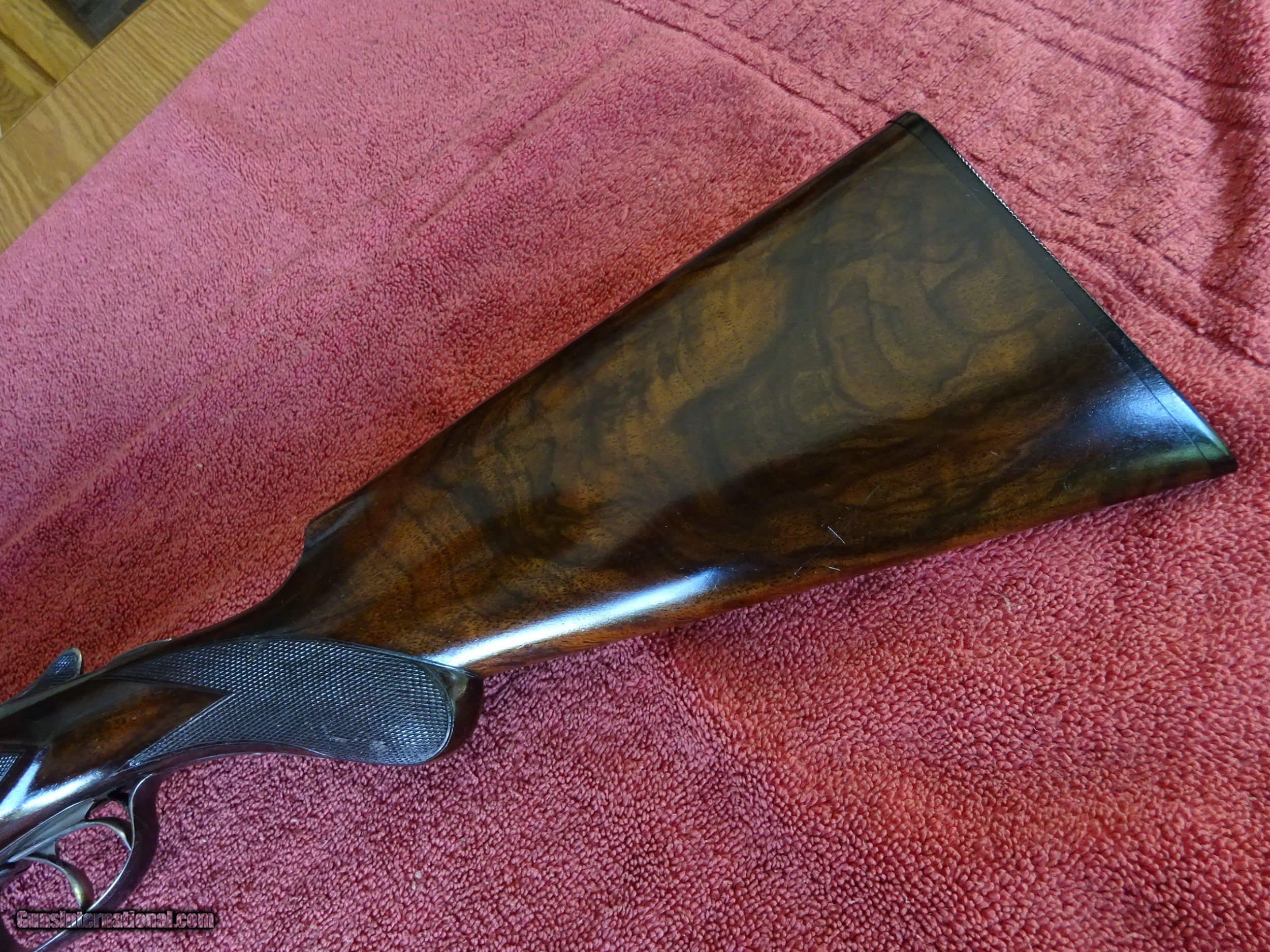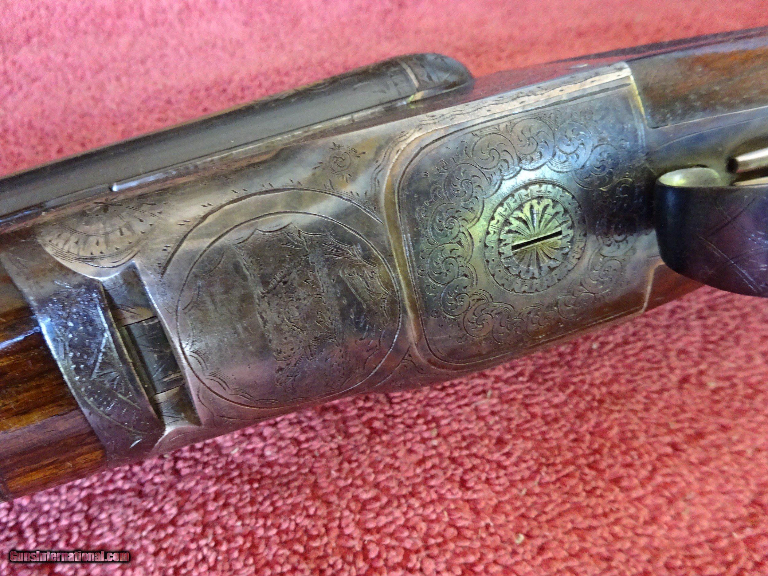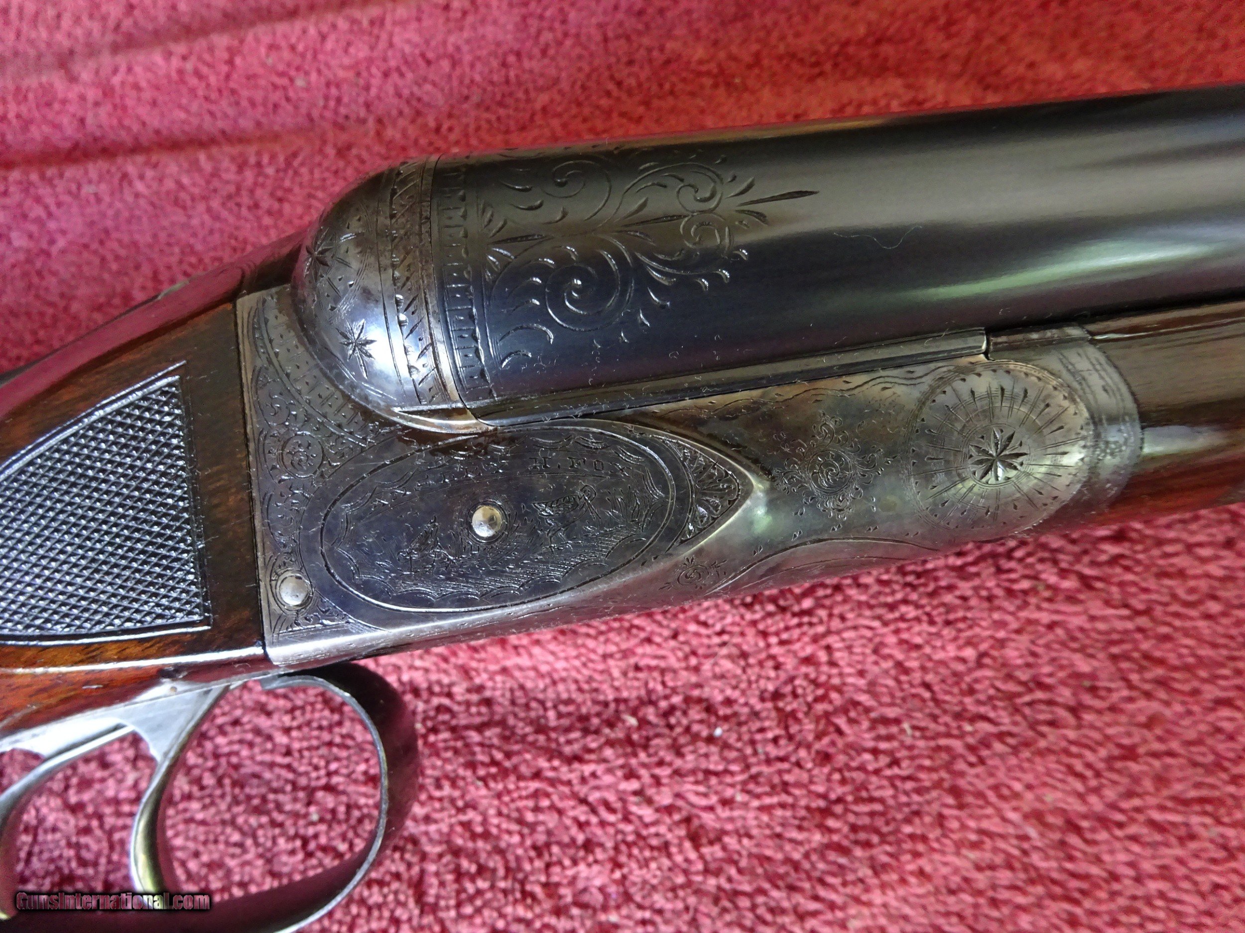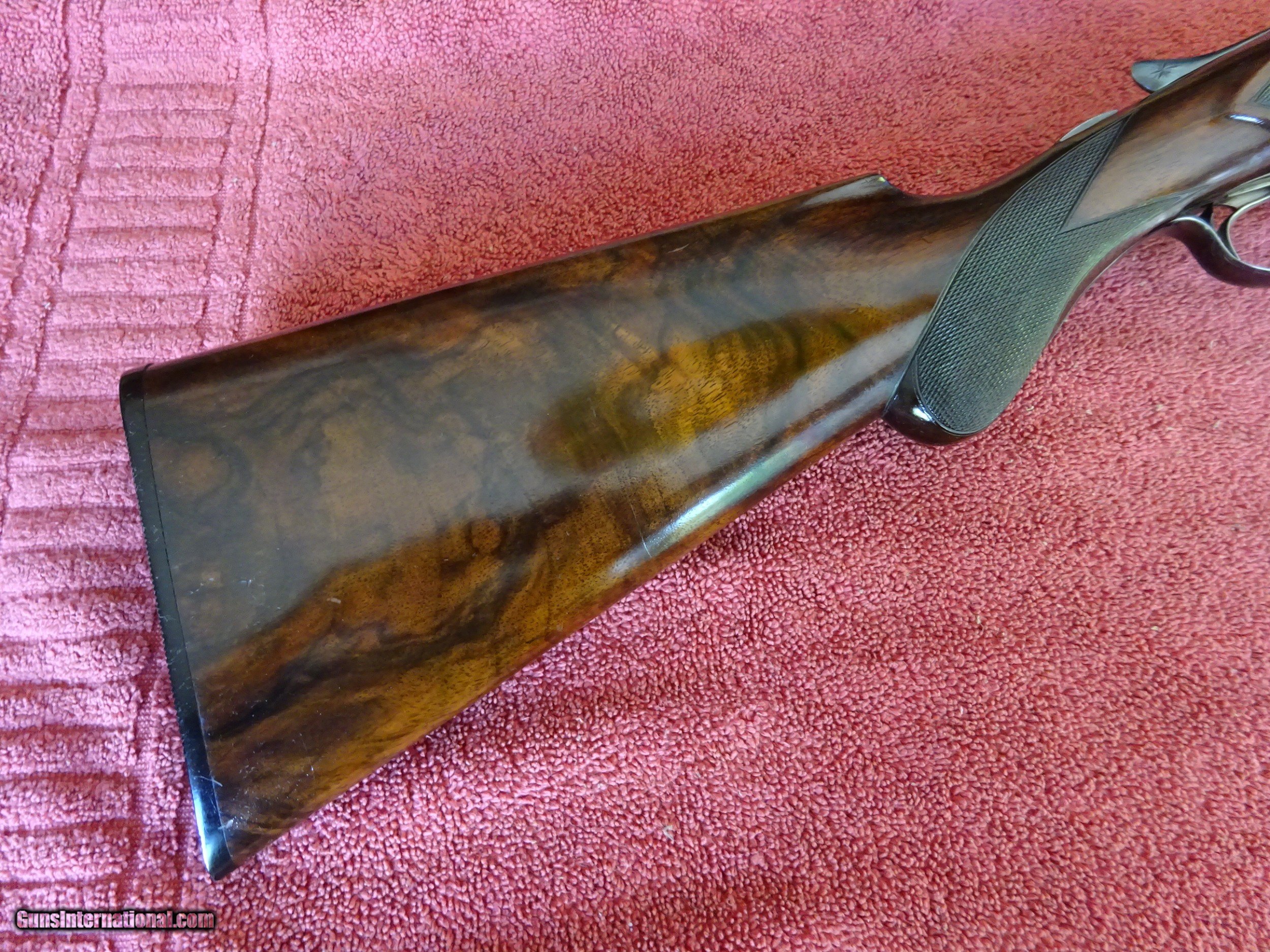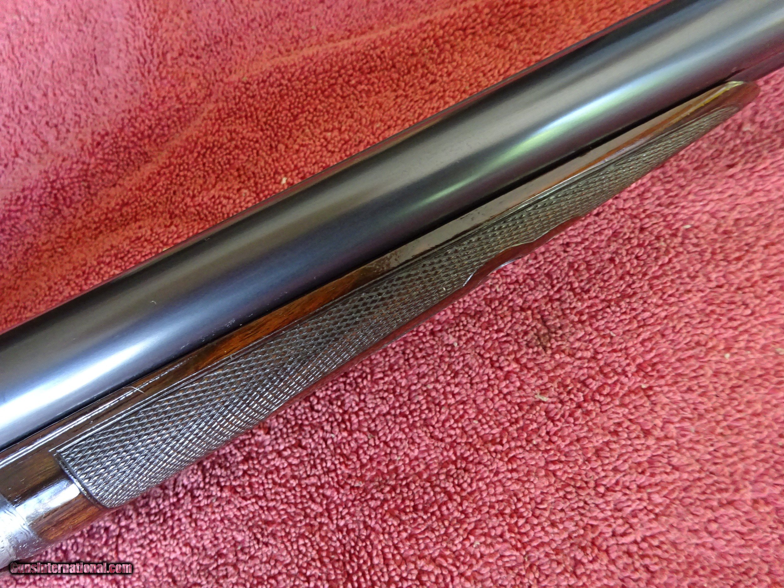 Description: A H FOX, PHIL., C GRADE 12 GAUGE. KRUPP FLUID STEEL 30" BARRELS, NUMBER 3 WEIGHT, IMCYL. AND FULL, 2 3/4" CHAMBERS. BARRELS RING LIKE A BELL. ENGRAVED AT BREECH ENDS, 98% BRIGHT BLUE, MIRROR PERFECT BORES, SINGLE BEAD SIGHT. NICELY ENGRAVED WITH PAIR OF STANDING WOODCOCK ON THE RIGHT SIDE, PAIR OF STANDING QUAIL ON THE LEFT, ENGLISH SETTER ON POINT ON THE BOTTOM PLUS FINE SCROLLWORK AND INTRICATE BORDERS. THE FRAME IS COVERED WITH BOLD VIVID CASE COLOR, PERFECT ENGRAVED SCREWS, TOP LEVER TO THE FAR RIGHT AND TIGHT ON FACE. ROUND KNOB GRIP STOCK, SPLINTER FOREARM, NEAR PERFECT CHECKERING AND FINISH. OUTSTANDING WOOD WITH GORGEOUS FIGURE AND COLOR. ORIGINAL BUTTPLATE WITH ENGRAVED SCREWS, VERY UNUSUAL DIMENSIONS, 1 5/8" X 3 1/2" X 13 1/2", 7 POUNDS 2 OUNCES. VERY HIGH QUALITY COLLECTOR CONDITION FOX MADE IN 1911. $5500.00 + $60.00 Insured shipping to an FFL address. Layaway is available. See all Pats gun listings on this site! We also have hundreds of pieces of ORIGINAL gun company advertising & memorabilia available for sale on our site SPORTINGCOLLECTIBLES. We have no reprints or reproductions. Email for more information. SOLD Curio/Relic: Yes |