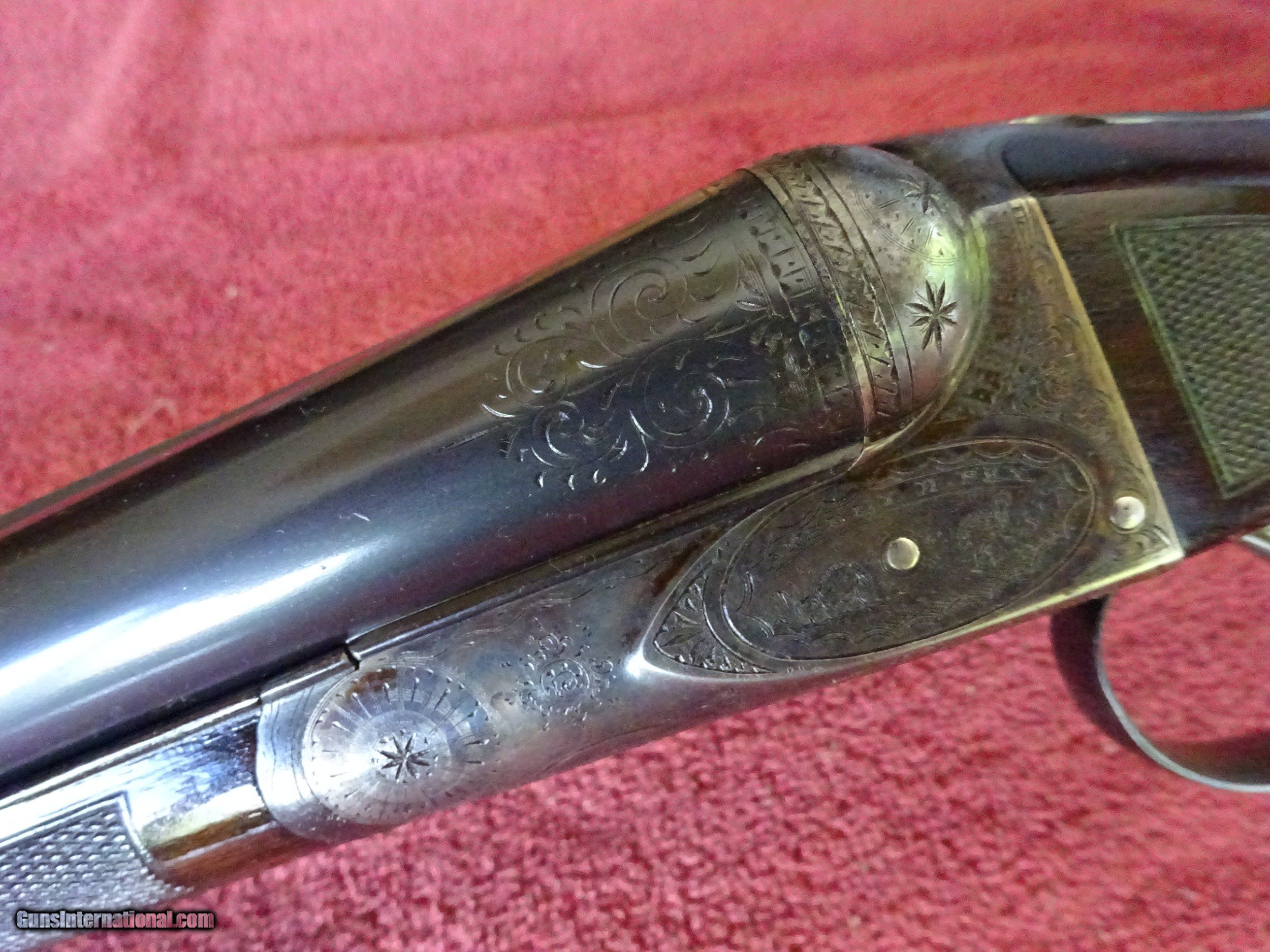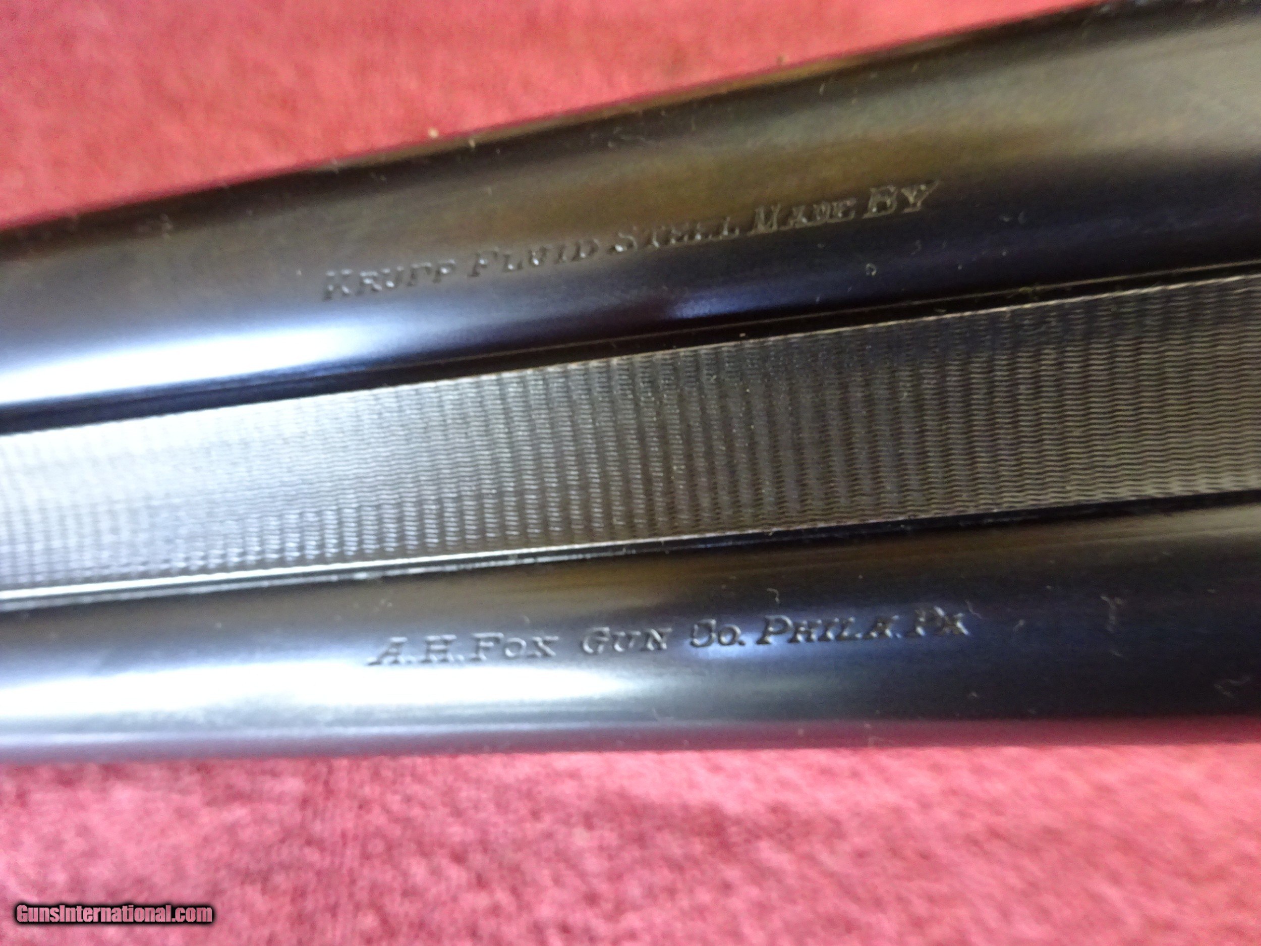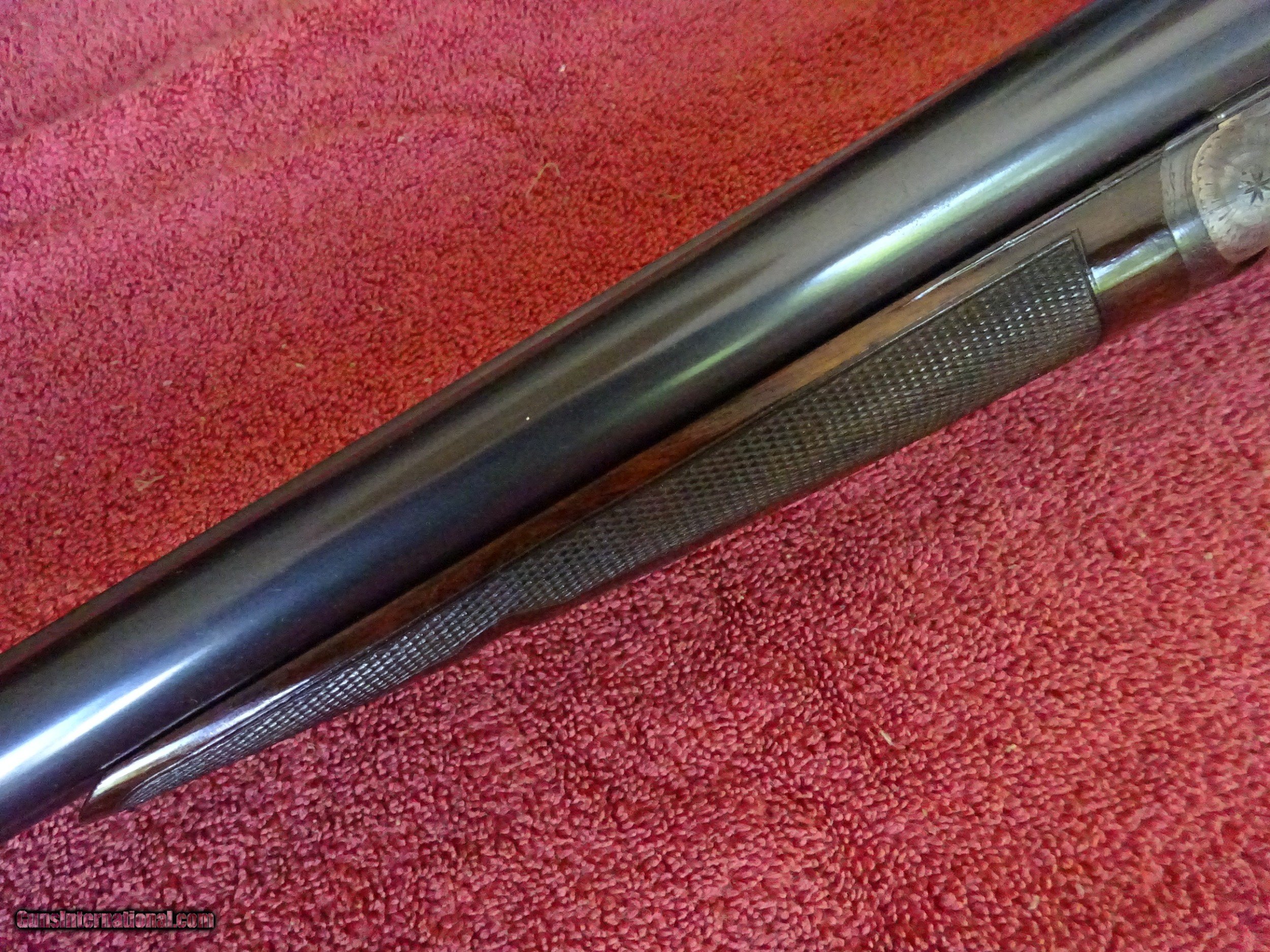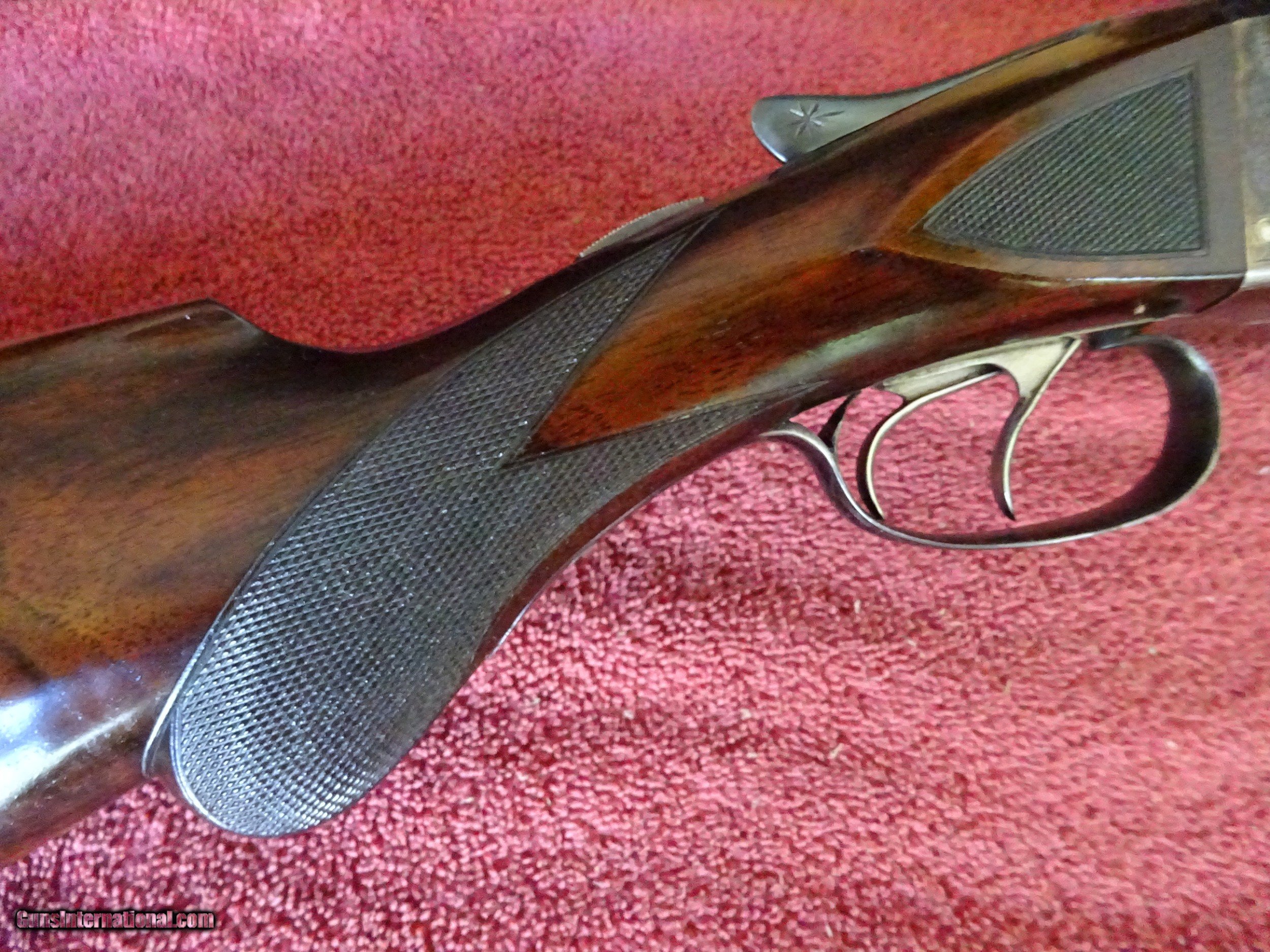 Description: A H FOX, PHIL., C GRADE 12 GAUGE. KRUPP FLUID STEEL 30" BARRELS, NUMBER 3 WEIGHT, IMCYL. AND FULL, 2 3/4" CHAMBERS. BARRELS RING LIKE A BELL. ENGRAVED AT BREECH ENDS, 98% BRIGHT BLUE, MIRROR PERFECT BORES, SINGLE BEAD SIGHT. NICELY ENGRAVED WITH PAIR OF STANDING WOODCOCK ON THE RIGHT SIDE, PAIR OF STANDING QUAIL ON THE LEFT, ENGLISH SETTER ON POINT ON THE BOTTOM PLUS FINE SCROLLWORK AND INTRICATE BORDERS. THE FRAME IS COVERED WITH BOLD VIVID CASE COLOR, PERFECT ENGRAVED SCREWS, TOP LEVER TO THE FAR RIGHT AND TIGHT ON FACE. ROUND KNOB GRIP STOCK, SPLINTER FOREARM, NEAR PERFECT CHECKERING AND FINISH. OUTSTANDING WOOD WITH GORGEOUS FIGURE AND COLOR. ORIGINAL BUTTPLATE WITH ENGRAVED SCREWS, VERY UNUSUAL DIMENSIONS, 1 5/8" X 3 1/2" X 13 1/2", 7 POUNDS 2 OUNCES. VERY HIGH QUALITY COLLECTOR CONDITION FOX MADE IN 1911. $5500.00 + $60.00 Insured shipping to an FFL address. Layaway is available. See all Pats gun listings on this site! We also have hundreds of pieces of ORIGINAL gun company advertising & memorabilia available for sale on our site SPORTINGCOLLECTIBLES. We have no reprints or reproductions. Email for more information. SOLD Curio/Relic: Yes |