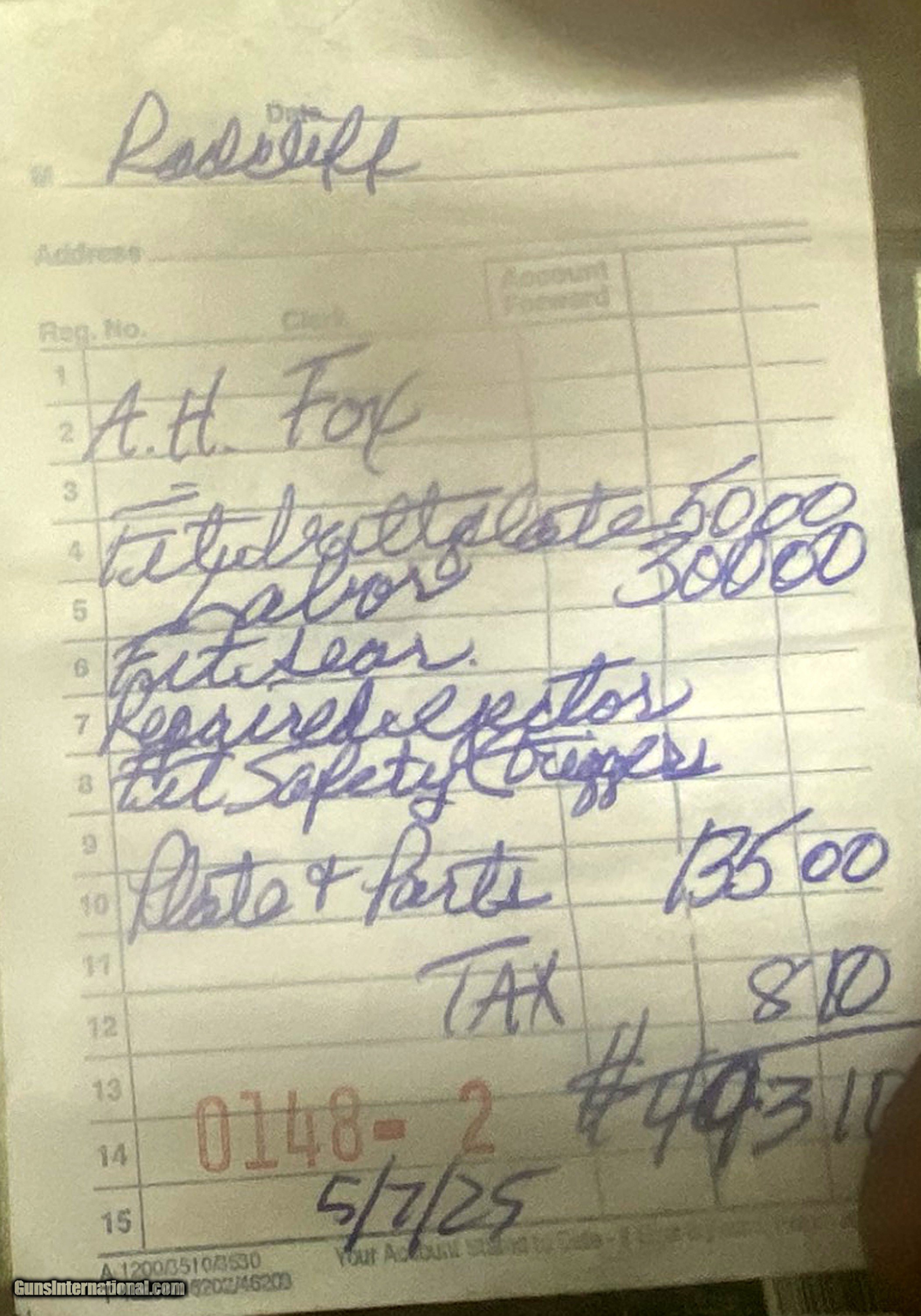 Description: Had this gun for many years but not used. I recently had it dissasembled and new sear added and action put back to as new. Very nice feather crotch stock un good ( unabused 0 condition.Faded case but good blue. Added many PIX but ask if you need more. Ship to your FFL includes transfer. Bore may be Mod/IC. Make offer Curio/Relic: Yes Shotgun Gauge: 12 Gauge Manufacturer: Ansley H Fox Model: A Serial Number: 16164 Barrel Length: 27 Chambers: 2.75 Ejectors: No Condition: Good + Metal Condition: VG Wood Condition: VF Bore Condition: VF Barrels: Krupp Fluid Steel Barrel Type: Krupp Fluid Steel Action: boxlock Triggers: double Stock: walnut Stock Dimensions: 14.25 lop Stock Drop: 3 Stock Comb: 1 3/4 Stock Heel: 3 Stock Cast: 1/8 on -if any Fore End: splinter Butt Pad: plastic LOP: 14.25 Rib: matted Weight: 7lb 6 oz Sights: steel bead Manufacture Date: 1912 Chokes: MF Engraving: early style A Case: fading Item Location: Maryland Grips: round knob pistol Price: $800.00 Contact Seller |