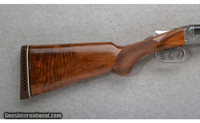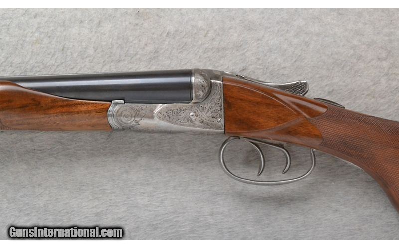 Description: This A.H. Fox Side by Side Model shotgun comes in 16 Ga. It has 30 inch barrels with extractors and a solid rib. A white bead front sight. With 2.5 inch chambers it has fixed Imp. Mod. and Imp. Cyl. chokes. It has double triggers. The butt stock is a checkered grip walnut round knob pistol grip. The forearm is a checkered grip walnut beavertail style. The receiver is very nicely engraved and has Ansley H. Fox stamped on both sides. S/N 301210A. 12 Gauge SOLD Chambers: 2.5 inch. Metal Condition: Very Good. A few very minor handling marks and very minor blue wear. Wood Condition: Very Good. A few very minor handling marks. Bore Condition: "Clean, bright and shiny. Barrels: 30 inch barrels with extractors and a solid rib. Triggers: Double. Stock Dimensions: LOP 14 3/8 inches. Fore End: Checkered grip walnut beavertail style. Butt Pad: White Line brown rubber recoil pad. Weight: 7 lb. 2 oz. Sights: White bead front. Chokes: Fixed IM and IC. Item Location: Richfield, WI |
