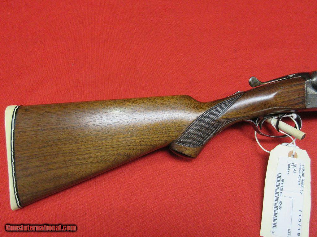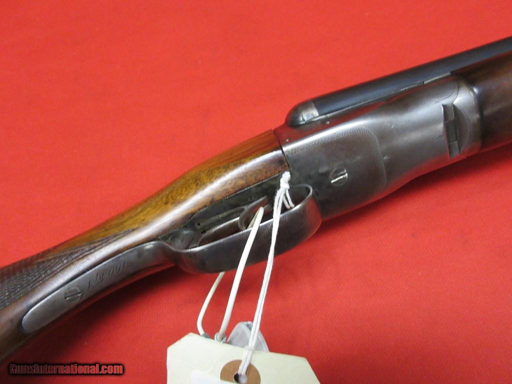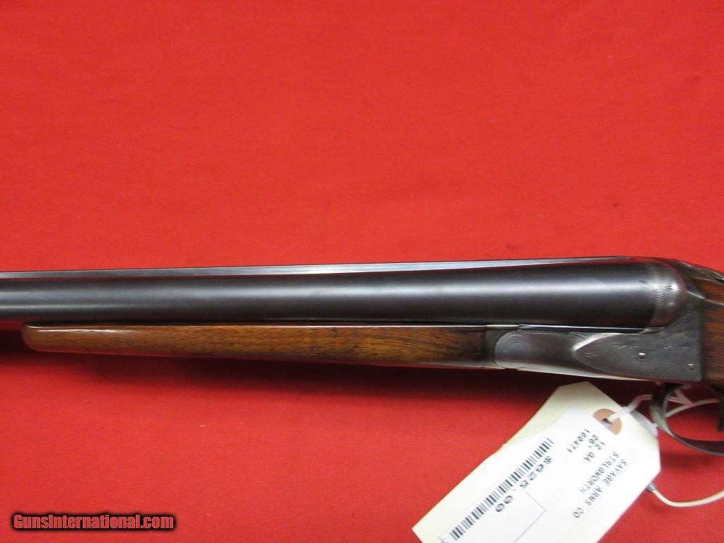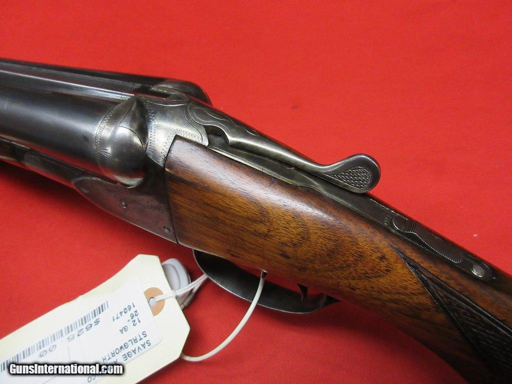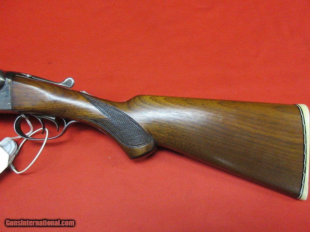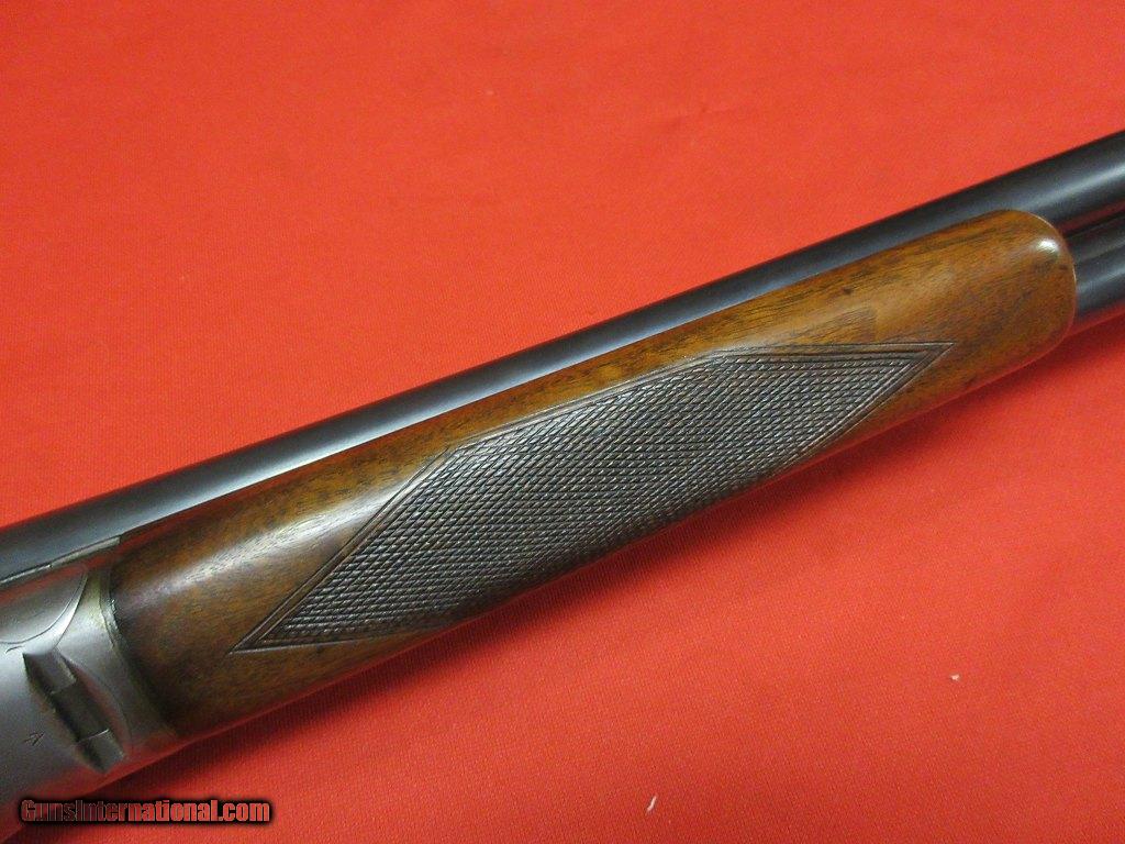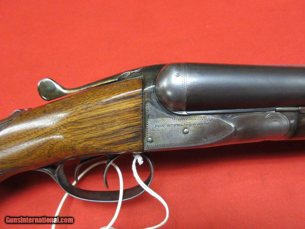 Description: A.H. Fox Sterlingworth 12ga/26" -- STERLINGWORTH--TRACES OF COLORS ON RECEIVER, EXCELLENT BLUE ON BARRELS, GOOD WOOD FINISH, WHITE BAKEALITE BUTT PLATE WITH LIGHTNING DESIGN SPACER. SMALL CRACK IN THE STOCK SOLD |