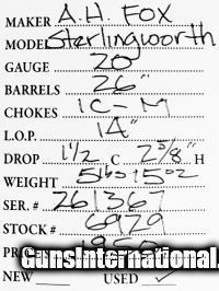 Description: A. H. Fox Sterlingworth 20 gauge SOLD Curio/Relic: Yes Serial Number: 261367 Barrels: 26 Stock Comb: 1 1/2 Stock Heel: 2 5/8 LOP: 14 Weight: 5lbs 15oz Chokes: IC-Mod |
