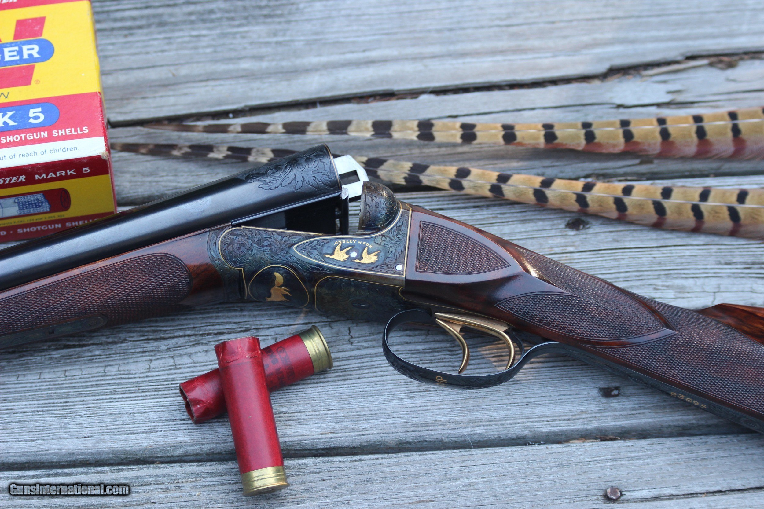 Description: A.H. Fox XE Grade 12Ga. 30” Barrels, Straight grip stock. Serial # 23695, Date of mfg. 1916. Stock dimensions: 14 ½” LOP, 1 ½” DAC, 2 1/8” DAH. Perfect modern dimensions. Chokes: Right barrel .038 Full, Left barrel .041 Fuller. Chambers: 2 5/8”. The chokes and chambers have survived unchanged. This stunning Fox XE Grade came to us totally restored. The work was performed circa 2005 by CT. Shotgun mfg. co. It remains today in unfired 100 % ++ condition. It comes complete in a maker’s type oak & leather trunk case, and dust cover with all accessories. The gilded game birds, and traditional trademark Fox on the floor plate give this gun an air of providence, and uniqueness not often seen. This Fox balances on the hinge pin, and swings like a dream! If you ever thought of, or dreamed of walking into your local gun shop back in the day and placing an order for a new high grade Fox, look no further! This Fox XE is ready for a new life, and a new journey. A fitting companion to accompany you afield for many seasons to come. An heirloom to pass down from generation to generation. Note: this is not an upgraded gun. It is an original XE Grade that has under gone a total, and full resteration inside and out. The former owner (now deceased) had added some personal touches. The tasteful gilded subjects, and a very handsom skeleton but plate. Offered at $13,500.00. All offers will be considered. SOLD Curio/Relic: Yes Shotgun Gauge: 12 Gauge Manufacturer: A.H. Fox Model: XE Serial Number: 23695 Barrel Length: 30 Bore: 12GA. Chambers: 2 5/8 Ejectors: Yes Condition: 100 % + Metal Condition: 100 % + Wood Condition: 100 % + Bore Condition: 100 % + Barrel Type: Cromox Fox Steel Action: Top break Triggers: Double Stock: Straight Stock Dimensions: Yes Stock Drop: Yes Stock Comb: 1 1/2 Stock Heel: 2 1/8 Fore End: Long style Fox Fore End Butt Pad: Skeleton LOP: 14 1/2 Rib: Solid Matted Finish: Case Color Weight: 7# 7oz Sights: Bead Manufacture Date: 1916 Chokes: Yes Choke Left: .041 Fuller Choke Right: .038 Full Engraving: Yes, Fox XE style Extras: Yes Case: Oak & Leather w/ dust cover Item Location: CT. Proof:Nitro: Yes Proof:Black: Yes |