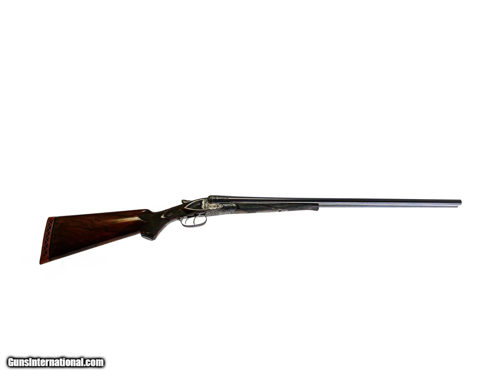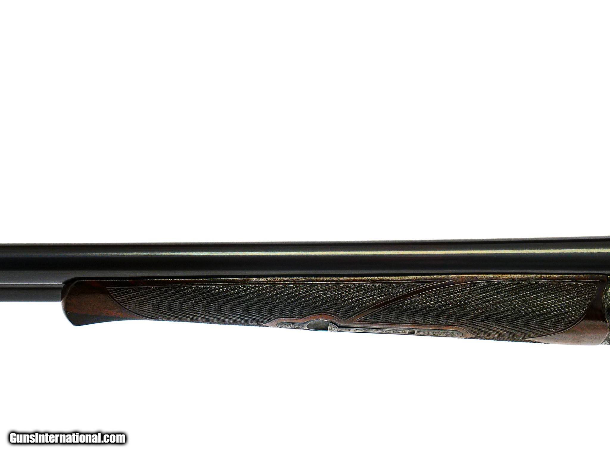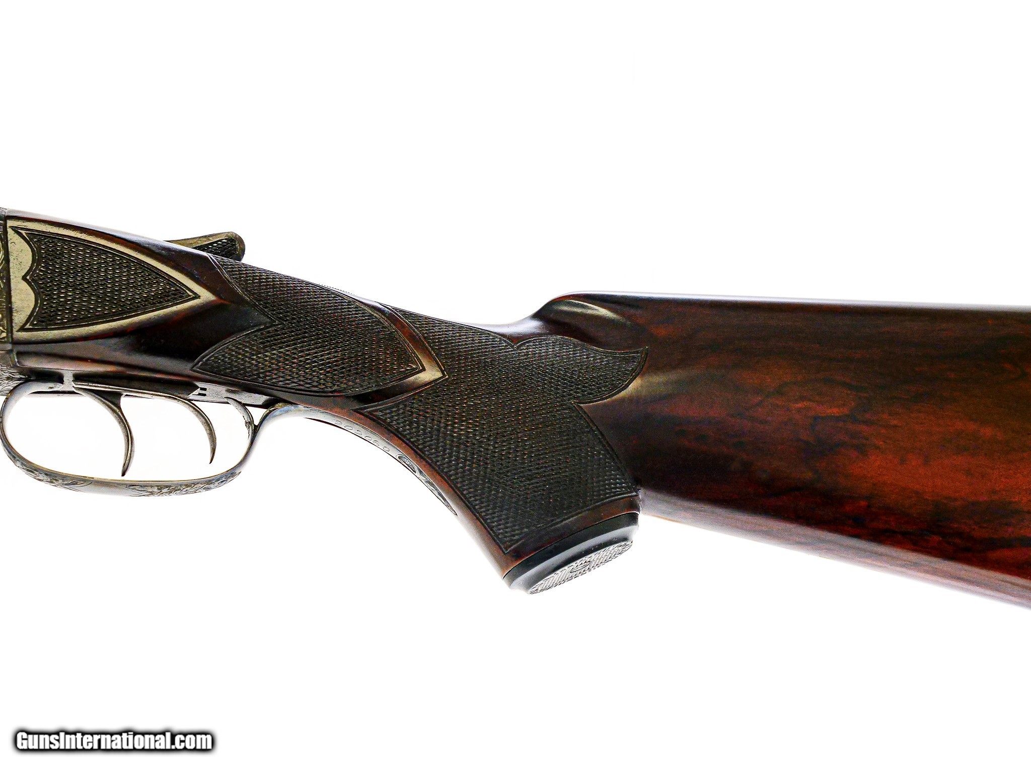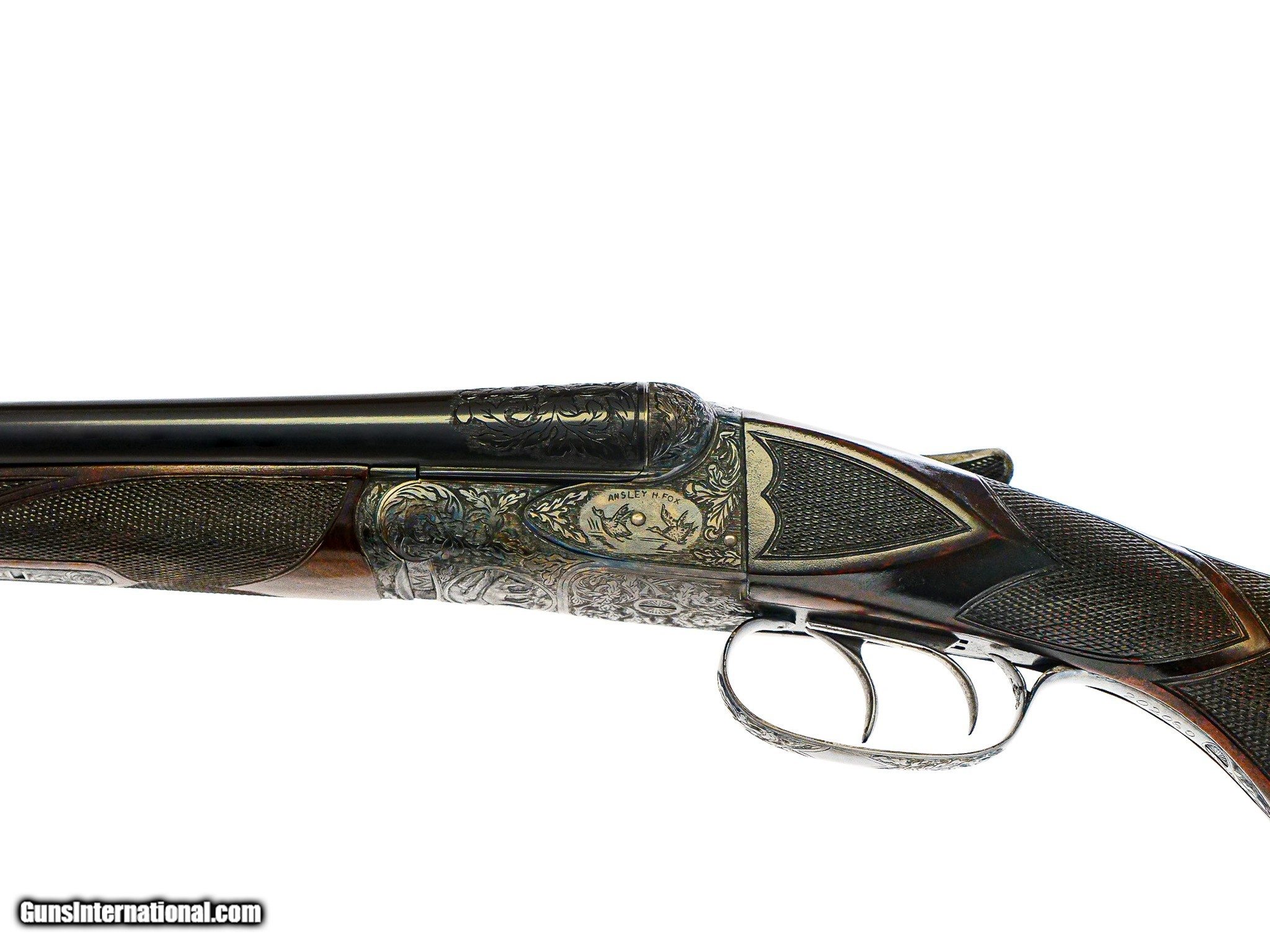Description: A.H. Fox - XE Grade, SxS, 20ga. 28" Krupp Steel Barrels. PA gun, double trigger, auto ejector, deep engraving, capped pistol grip, original Hawkins pad, very deep engraving, virtually all of it ‘s case color, perfect screws, minor handling marks. Inv: 65849 6 lbs. 3 oz. 15 1/8" x 1 ½" x 2 ½" $26,995.00 SOLD |