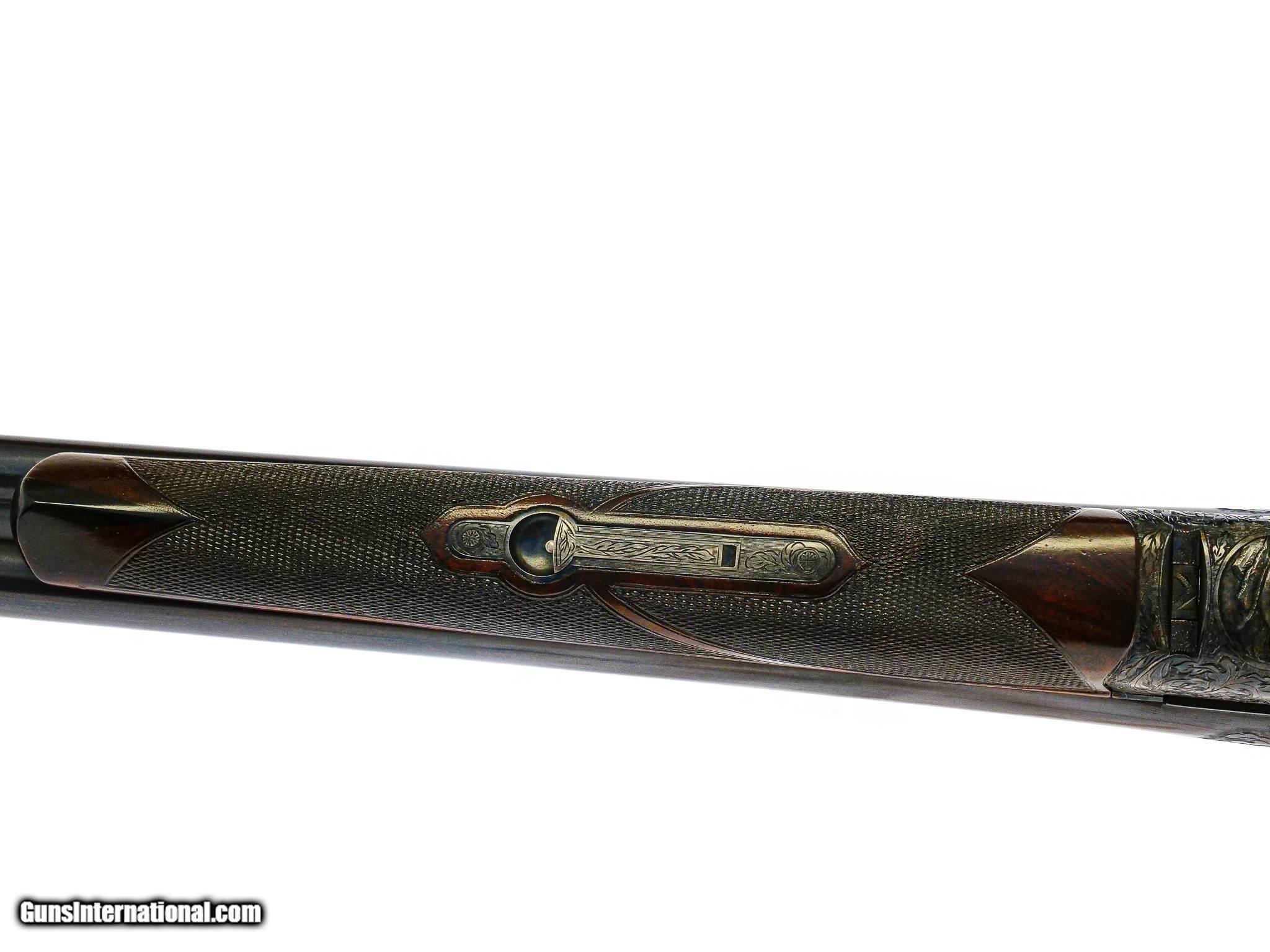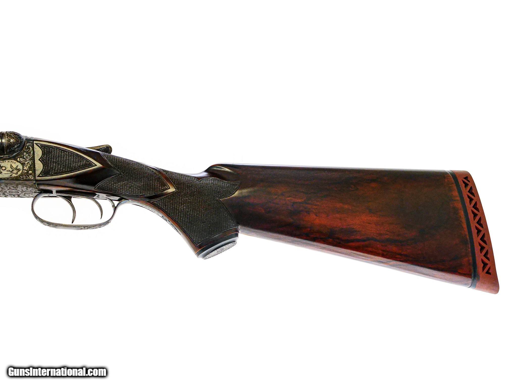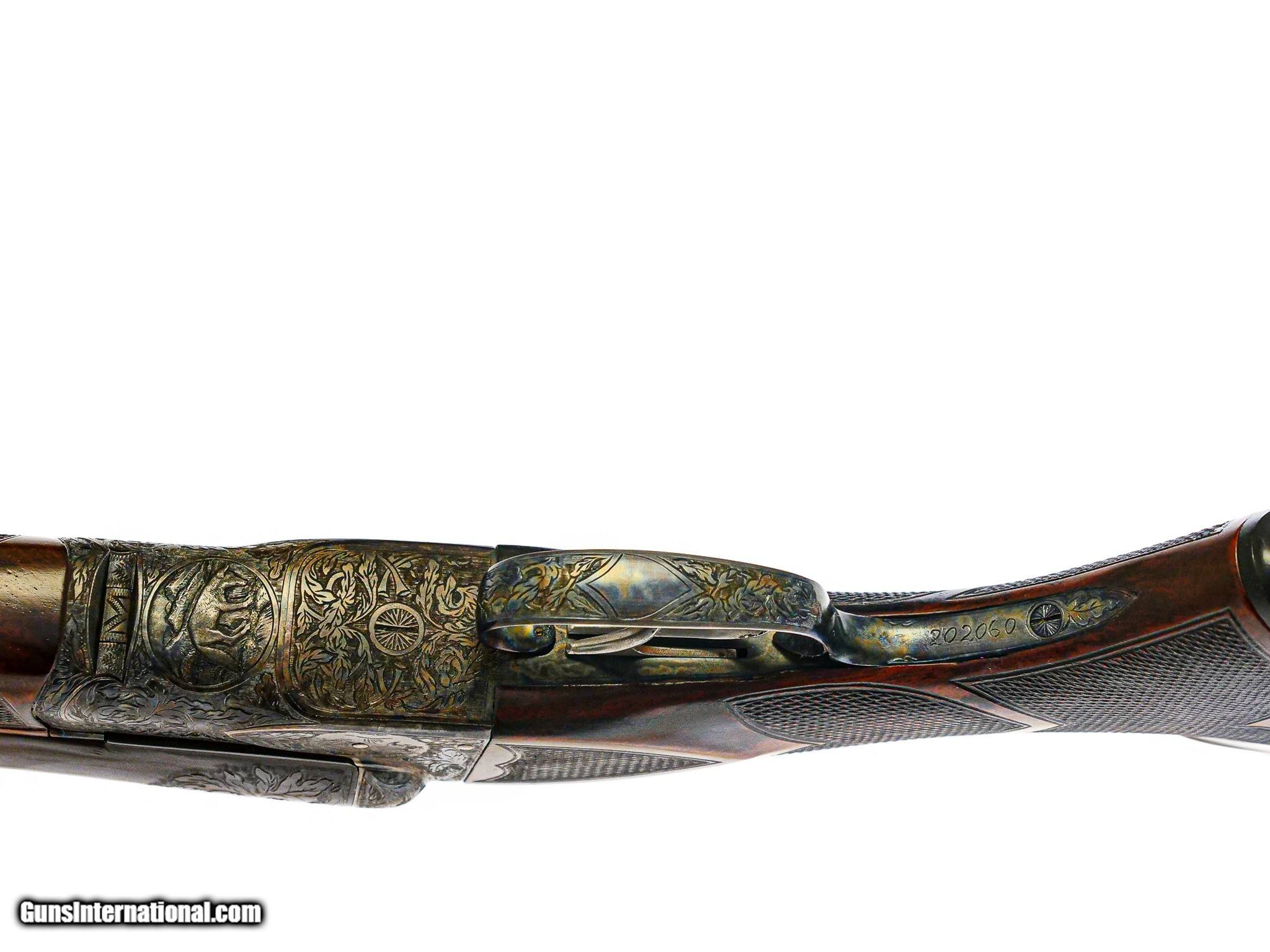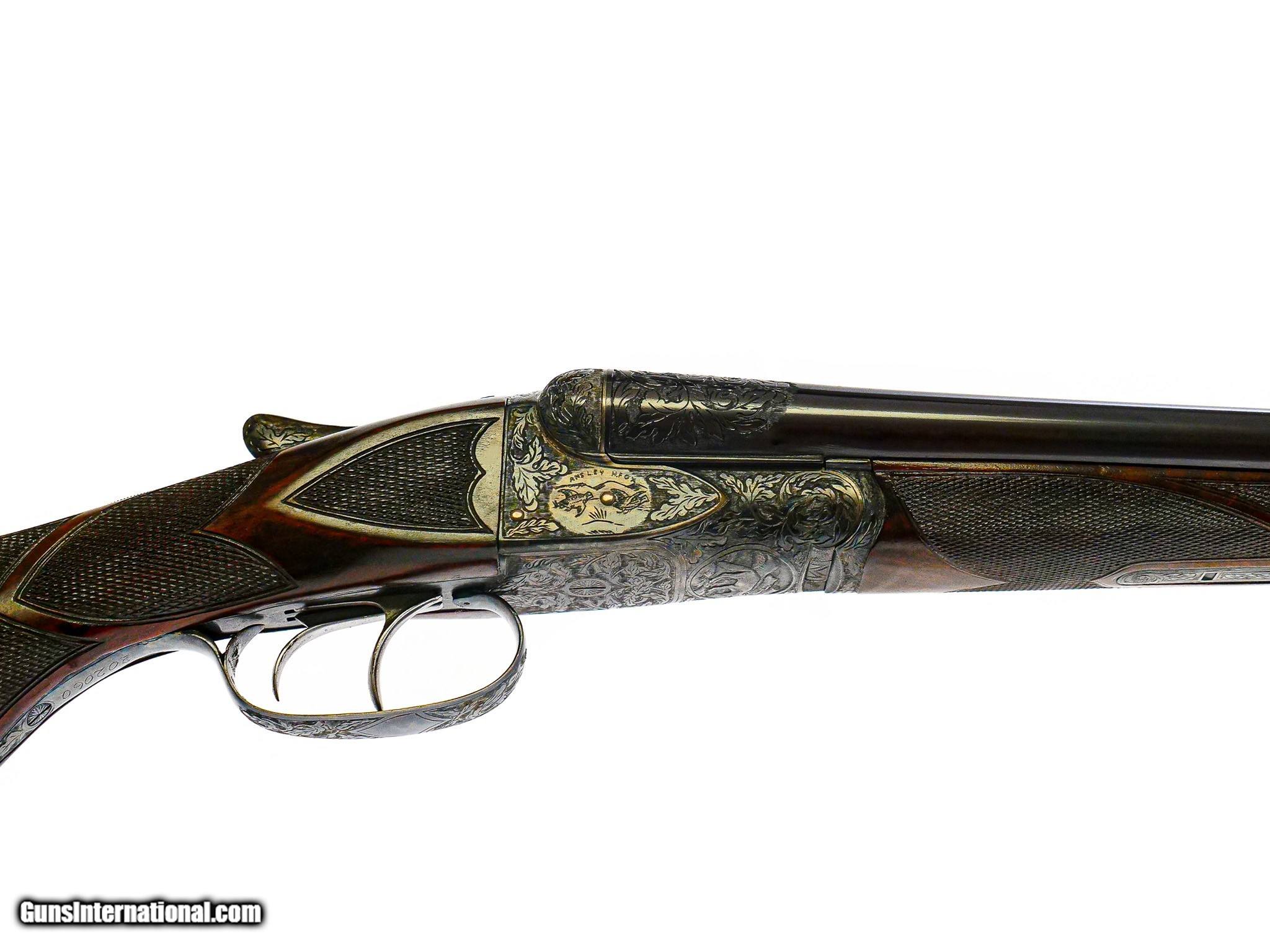 Description: A.H. Fox - XE Grade, SxS, 20ga. 28" Krupp Steel Barrels. PA gun, double trigger, auto ejector, deep engraving, capped pistol grip, original Hawkins pad, very deep engraving, virtually all of it ‘s case color, perfect screws, minor handling marks. Inv: 65849 6 lbs. 3 oz. 15 1/8" x 1 ½" x 2 ½" $26,995.00 SOLD |