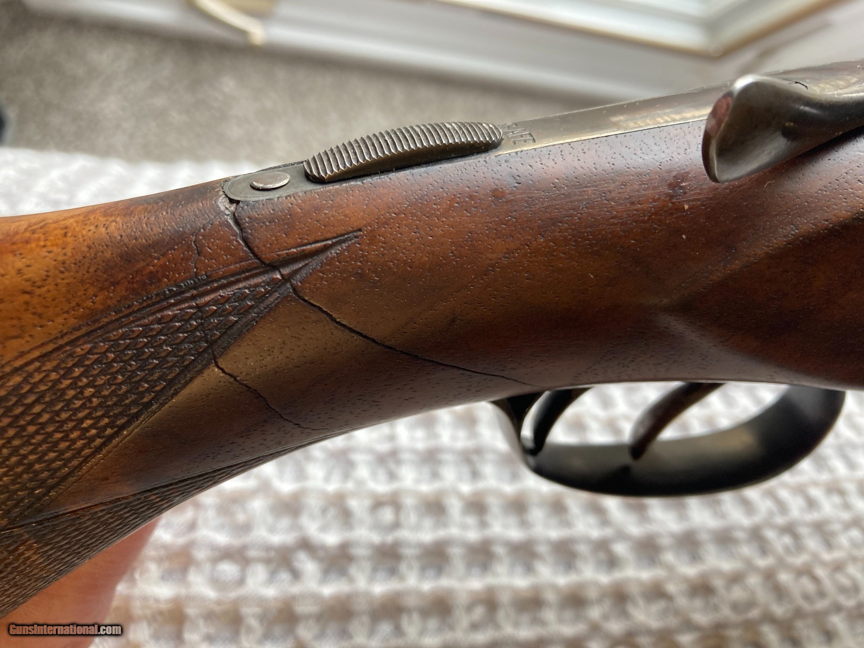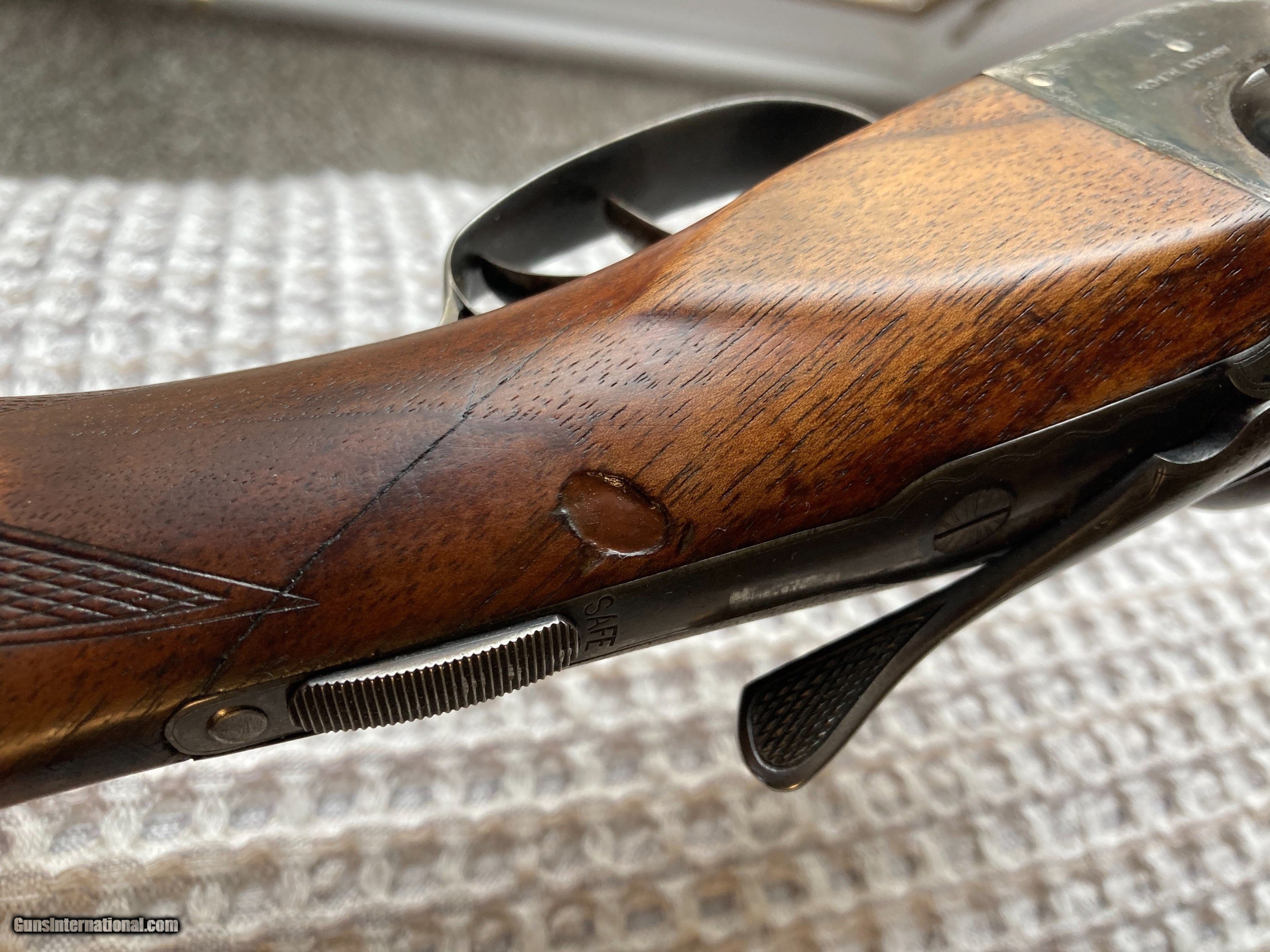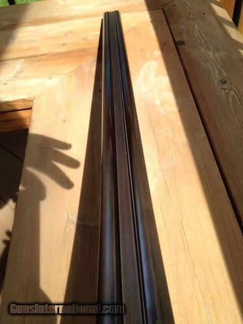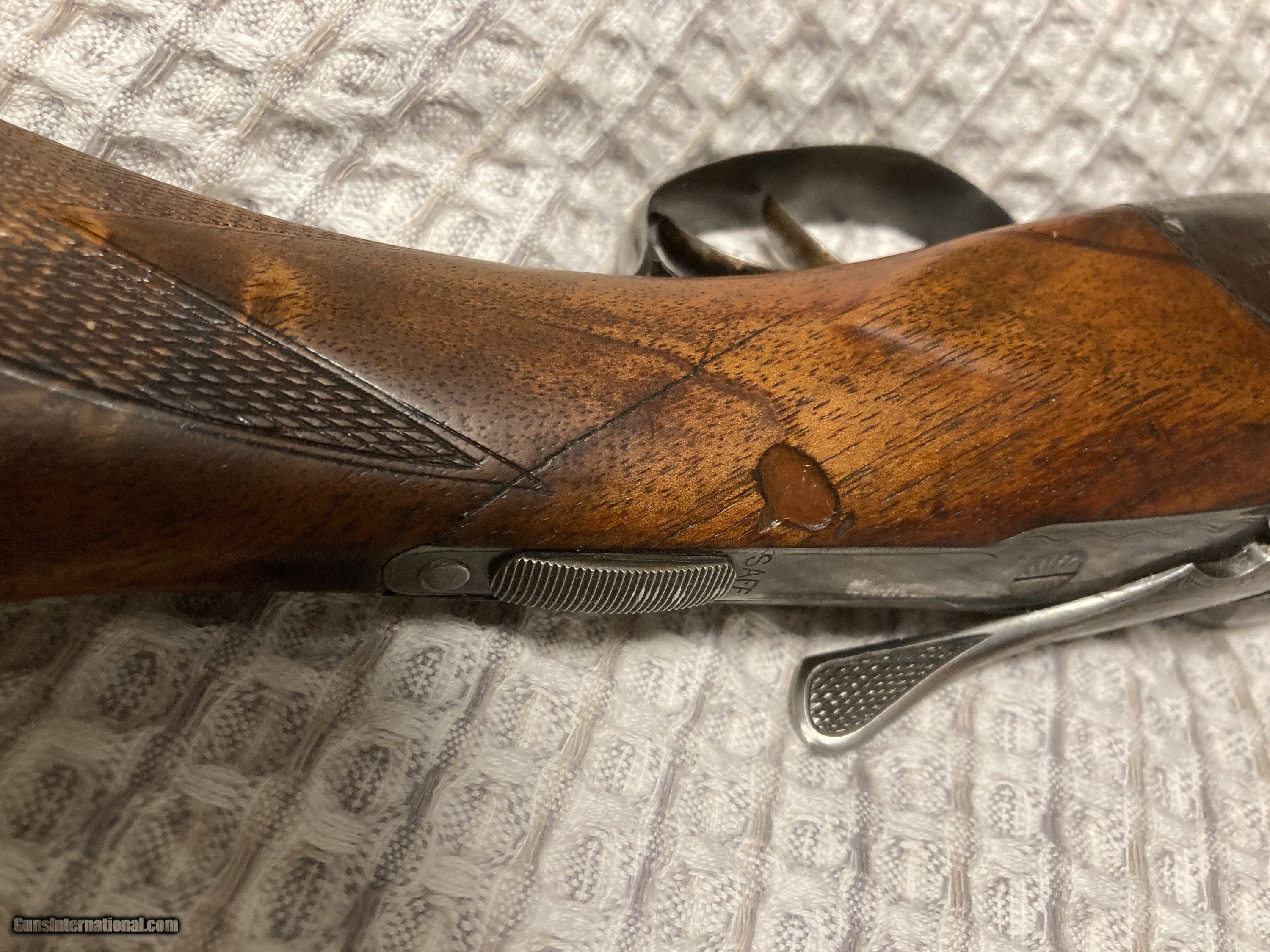 Description: AH Fox 12 gauge double 30" Krupp Steel barrels, M & F chokes, 2 3/4" chambers, very good shiny bores. Crack in wrist of stock was glued and pinned by a professsional stock maker. Locks up tight. Traces of case colors, some freckling where it was carried on the lower right barrel and right receiver area. Was $750, now $695. plus $45. shipping. USPS Money order. Ken Longe, 18313 Van Camp Drive, Omaha, NE 68130-4248. Phone 402-203-8422. SOLD Curio/Relic: Yes Shotgun Gauge: 12 Gauge Manufacturer: AH Fox Model: A Serial Number: 174xx Barrel Length: 30 Bore: very good/shiny Chambers: 2 3/4 Ejectors: extractors, no ejectors Condition: Good Metal Condition: Good/excellent Wood Condition: repaired stock Bore Condition: very good Barrels: double Barrel Type: steel Triggers: double Fore End: splinter Butt Pad: plate LOP: 14 Rib: matted Sights: front bead Manufacture Date: 1910 Chokes: M&F Choke Left: full Choke Right: modified Case: 10% Item Location: Nebraska |