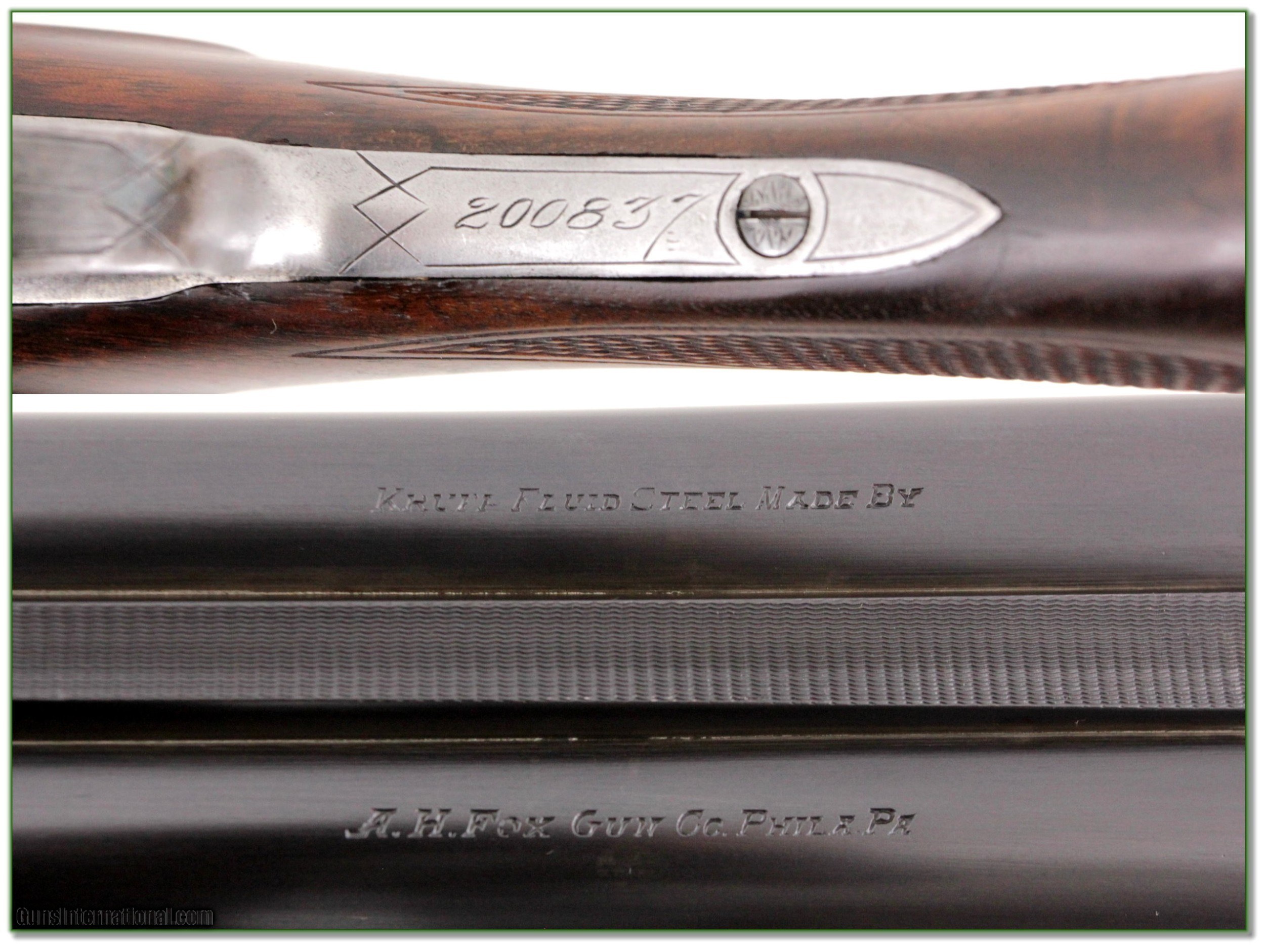 Description: This is an all original AH Fox AE Grade 20 bore. It has beautiful factory engraving. The blue is strong and the wood in excellent condition. It has 28in barrels choked Full & IC. The bores are mirror and the lever is still way right! The LOP is 13 7/8in to front trigger. This one will make a prized addition to your collection. I am selling this one on consignment and as such lay-a-way can’t be used. It does of course have the standard 3-day inspection. Shipping with insurance is $69. Please email me with any questions or larger pictures. (Consign your quality firearms with Shooting Investments for only 12%! Let me know if you have any you would like to sell!) 20-0025 Payment: Payment is by Money Order, Cashiers Check or Personal Check. I can now also accept MasterCard and Visa with a 3% convenience fee. PayPal can be used for some items but never firearms. Please let us know if you would like to pay via PayPal. Shipping: The shipping charge will be listed in each description. It is $39 for most guns. Some heavy guns or those insured for over $2000 will be higher. Shipments to Alaska and Hawaii are higher because air shipment is required. Most firearms are shipped on Tuesday and Thursday and usually in 5 days of receipt of payment. We package all shipments carefully and insure them. Returns: Our return policy is simple. If for any reason you are not pleased with your purchase, you may return your item for a full refund of purchase price. Ammunition cannot be returned. It is important to us that you are happy. Guns cannot be fired or dissembled before returning them and they must be returned in the same condition as received. Notification of a return must occur with-in 3 days of receipt at your dealer. Shipping, convenience and dealer fees are not refundable and are the responsibility of the buyer. Lay-a-way: If needed, we offer a 60 day lay-a-way option on most firearms. It is 1/3 now, 1/3 in 30 days and 1/3 in 60 days. Lay-a-way firearm sales are final and if not completed the first payment cannot be returned. Consigning your firearms with Shooting Investments: We will help you get top dollar for your firearms. While most local guns shops charge 20% or more, our fee is only 12% with a minimum of $75. At your local gun shop it might take months to sell. Selling on-line provides instant access to thousands of interested buyers. You won’t find any other on-line dealer willing to sell your firearms for only 12% or listing every gun on 3 separate s. Selling through an House typically costs the seller 15% and the buyer an addition 15% (so 30%) and you have to wait several months to sell and longer to receive funds. If properly priced, we will sell your firearms in a few weeks. Send us an email or give us a call and we’ll explain how easy it is for you to get top dollar. Trading: Trading for use is really just buying your gun to re-sell. If you have a gun you want to trade, please email a picture and we will let you know what we can give or it. You will always get more if we sell it for you on consignment. Help for California Buyers: We are happy to ship to California. It is the buyer’s responsibility to make sure any item you buy is legal in your state. We are also happy to help with your purchase of a firearm from someone other than us. If you see a gun you would like to buy but the seller can’t or won’t ship to California they can ship to use and we’ll then ship it to your California dealer. The cost for this service is only $30 + shipping. Let us know if we can help! SOLD |