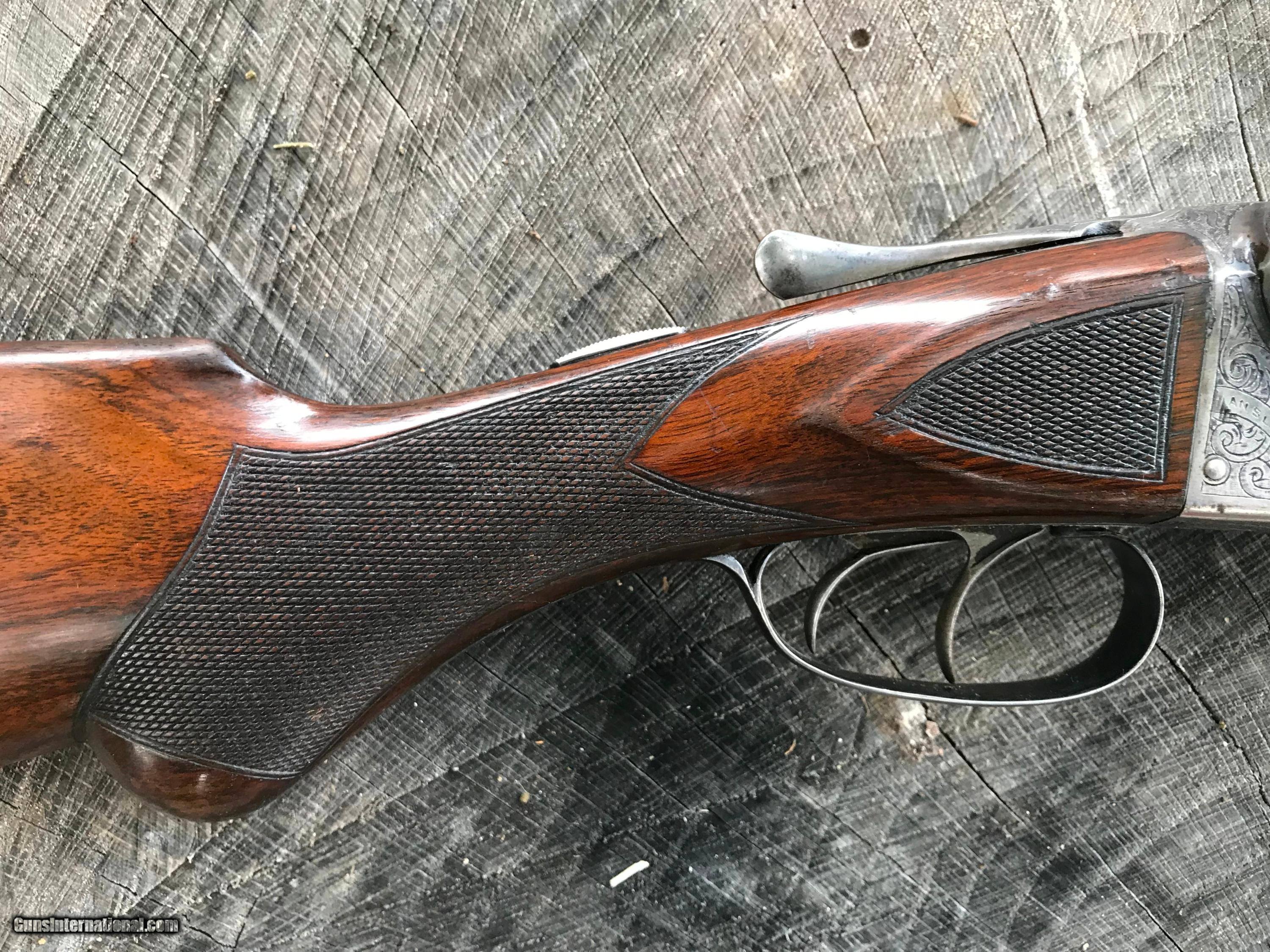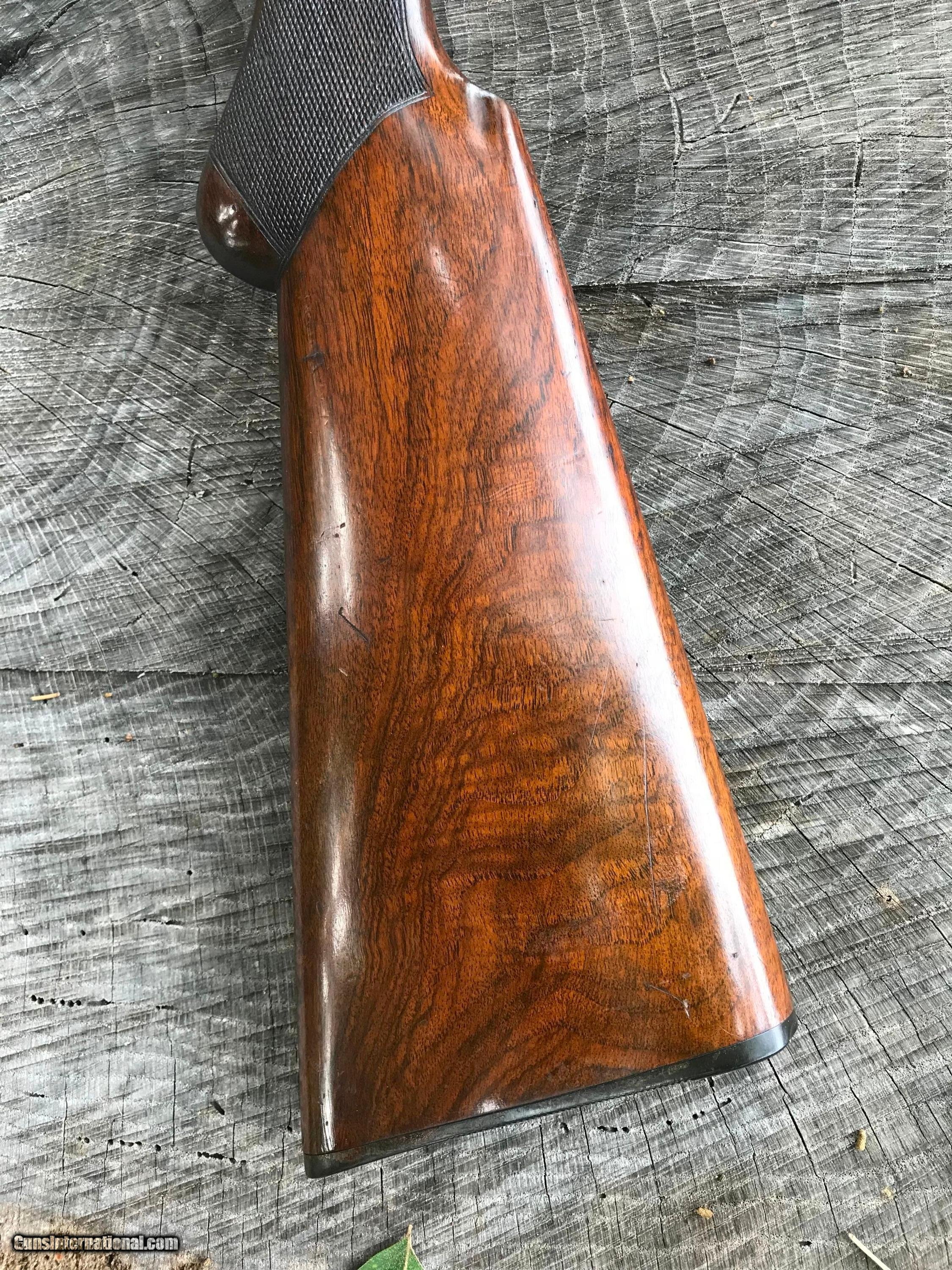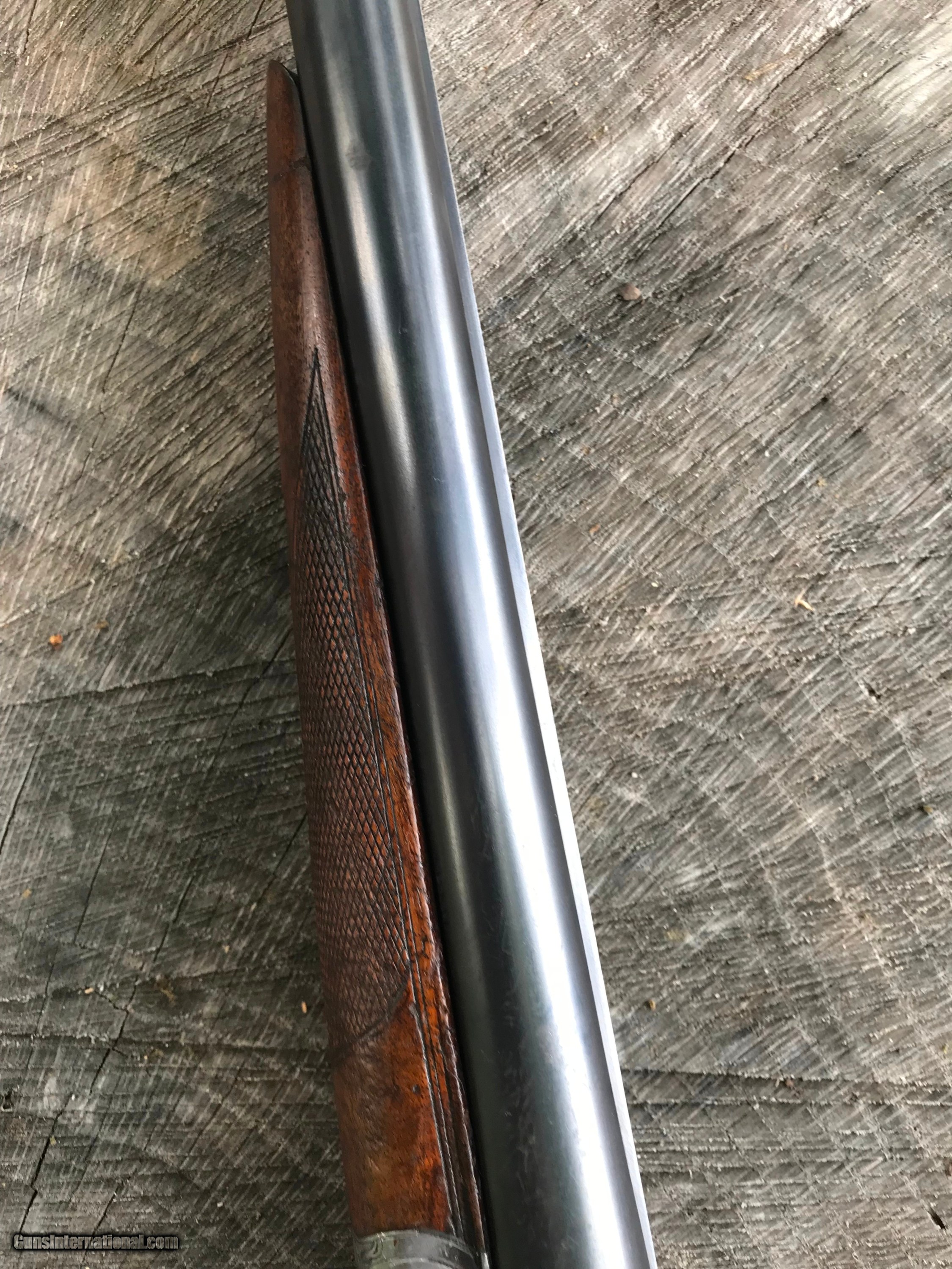 Description: Very rare B grade A H Fox with late style engraving in 12 gauge. 28" barrels choked mod/full. Barrel blue is 75% or better and there are traces of case color around the bolsters and in protected areas.There are some minor carry marks from handling. Weights 6.84 lbs and locks up like a drum. DAC is 1 3/4", DAH is 3". LOP is 14". Overall a very nice honest gun. SOLD Curio/Relic: Yes Manufacturer: A H Fox Model: B Grade Bore: 12 Chambers: 2 3/4 Condition: very good Triggers: double triggers Gauge Info: 12 Stock Comb: 1 3/4 Stock Heel: 3 Stock Cast: neutral LOP: 14 Weight: 6.84 lbs Manufacture Date: 1920's Choke Left: full Choke Right: mod Engraving: Late Style |