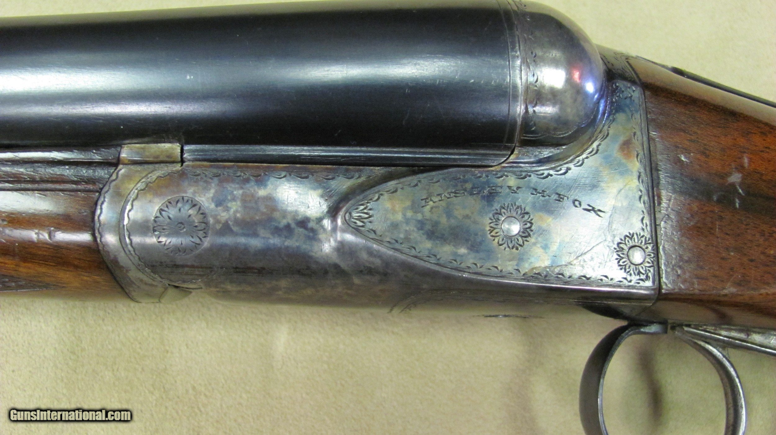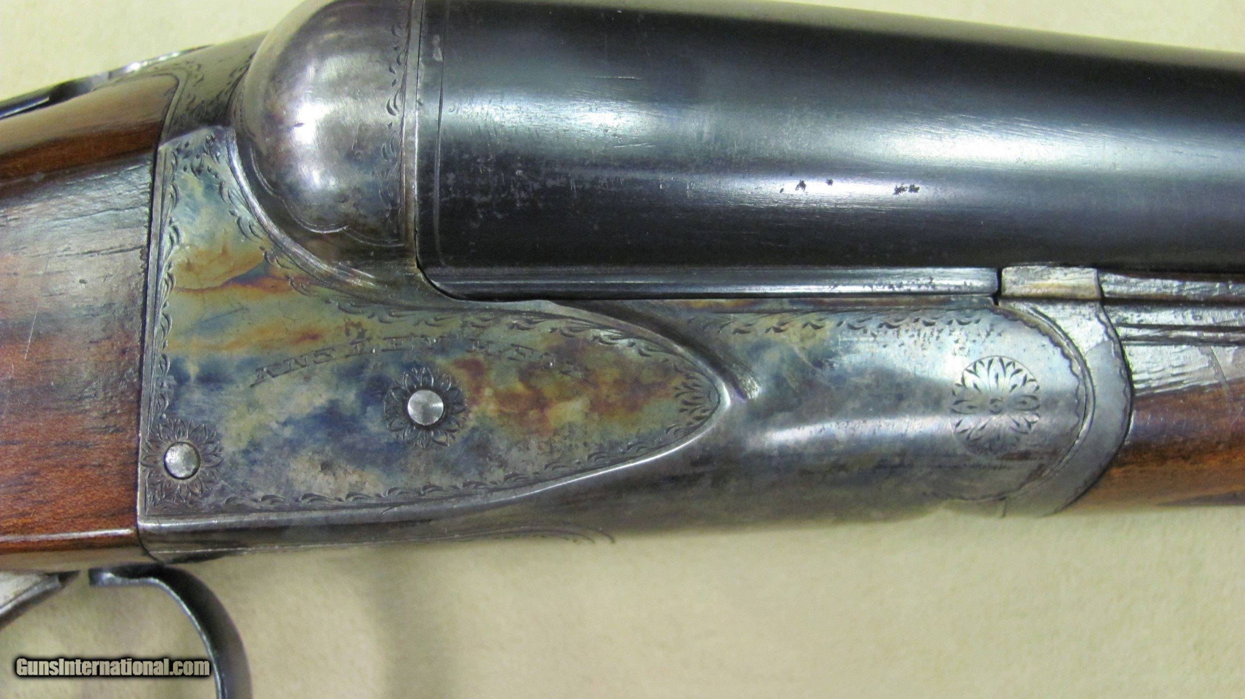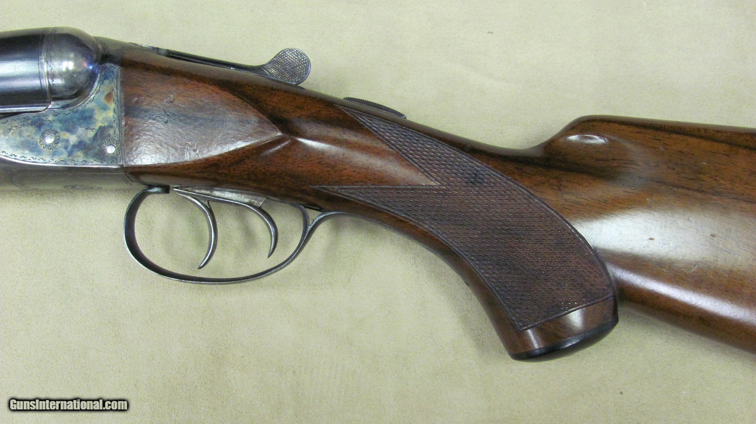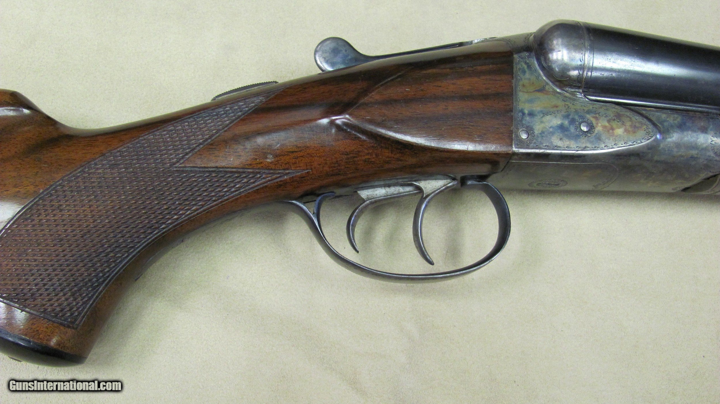 Description: AH Fox HE Superfox grade 12 gauge double barrel shotgun. This shotgun is in excellent condition with 32" barrels that have mirror bores. 3" chambers and auto ejectors. Weight is 8lbs. 9oz. LOP is 14 1/4", DC is 1 5/8" and DH is 2 5/8". Manufactured in 1929. Serial number is 33510. A high condition shotgun that still retains almost all original case colors, bluing and stock and forend finish. A rare gun in excellent condition. SOLD Curio/Relic: Yes Manufacturer: AH Fox Phil Model: HE Serial Number: 33510 Ejectors: Yes Condition: Excellent Metal Condition: Excellent Wood Condition: Excellent Bore Condition: Excellent Gauge Info: 12 Gauge Stock Comb: 1 5/8 Stock Heel: 2 5/8 Butt Pad: Original Butt Plate LOP: 14 1/4 Weight: 8lbs. 9oz. Manufacture Date: 1929 Choke Left: Full Choke Right: Full Proof:Nitro: Nitro |