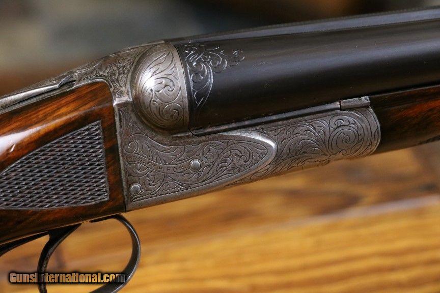 Description: SOLD AH Fox Late style BE 12 Gauge shotgun. Serial number is 30003 and the year of manufacture is circa 1925. Features include factory straight English style stock, 30 inch Chromox barrels and ejectors. This was obviously made as a heavy water fowl shotgun as the barrels are heavy and choked full and full with 3 inch chambers. Condition is very nice as partially restored. The barrels retail nerly all of a high quality restoration. They are straight with no damage or alterations. The bores are excellent but do have just a hint of frost near the chambers. We don't believe that they were ever polished or had the chokes altered as they are still full extra full. The chambers might have been lengthened to 3 inches but this was also an opton from Fox at that time so there is a chance that they are original. The receiver is mostly silver with sharp engraving and has not been refinished. The original straight stock and fore end have been nicely restored with the checkering being refreshed as well. The stock really does have a very pretty lighter fancy grain to it. This shotgun is tight and mechnically in great shape including the ejectors and automatic safety. The dimensions are great for shooting; Drop at heel is 2 3/8 inches, drop at comb is 1 3/8 inches. Length of pull is 14 inches from the front trigger over an older Pachmayr pad. Weight is right on 8 pounds. You don't see many of these Late B grade Foxes as production of this grade was quite low. Go to ironmenarms . c o m for additional photos. SOLD Curio/Relic: Yes Manufacturer: AH Fox Model: BE Serial Number: 30003 |