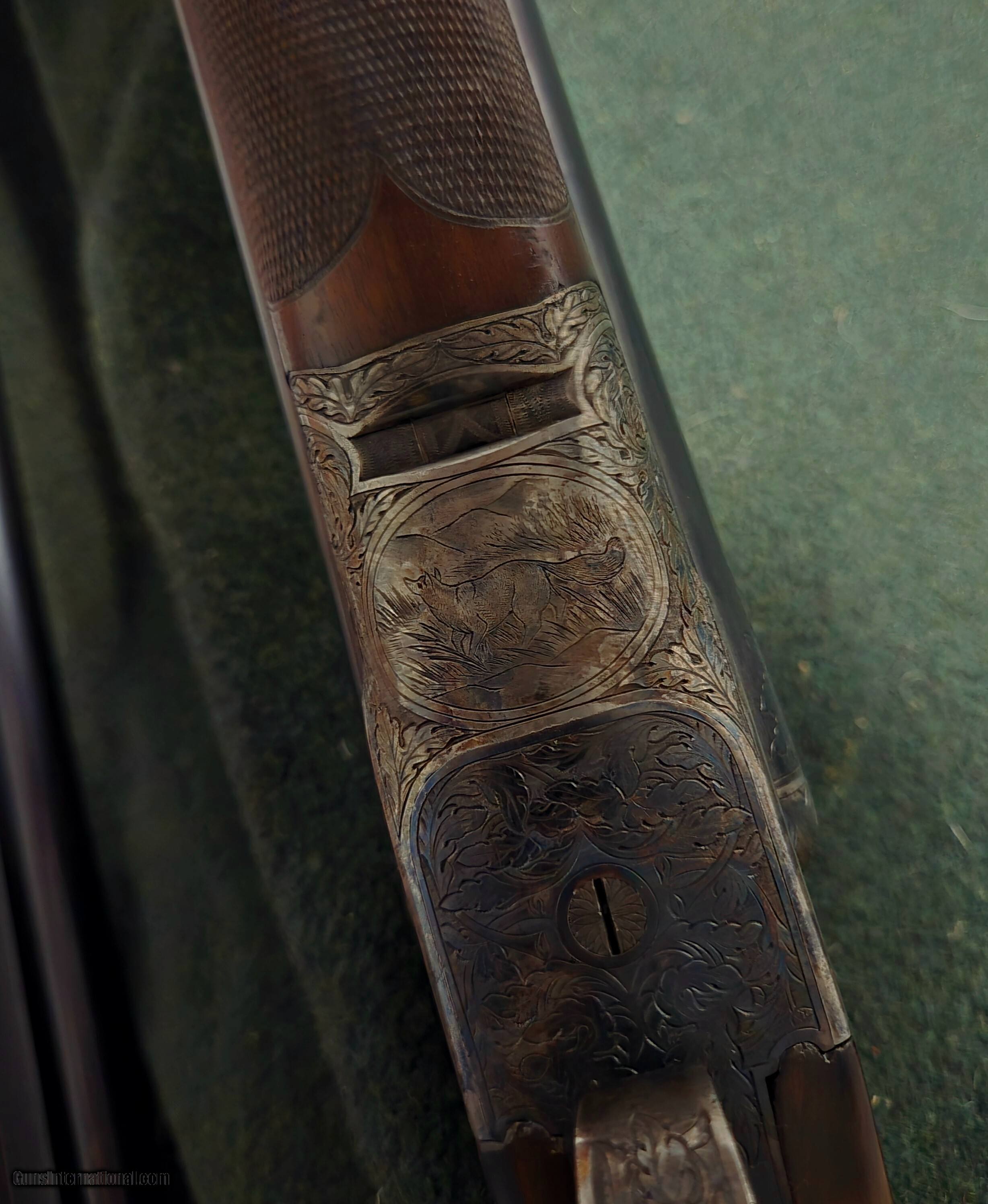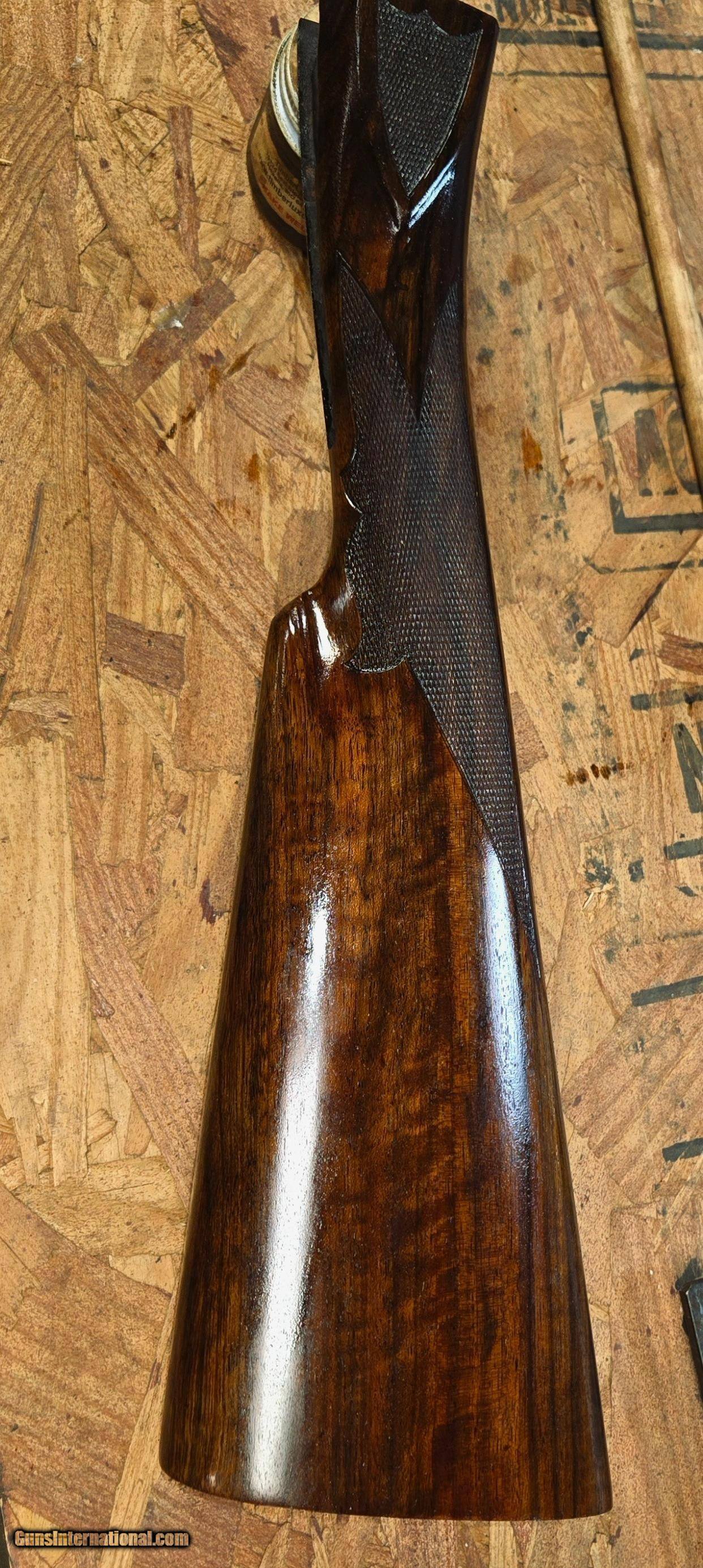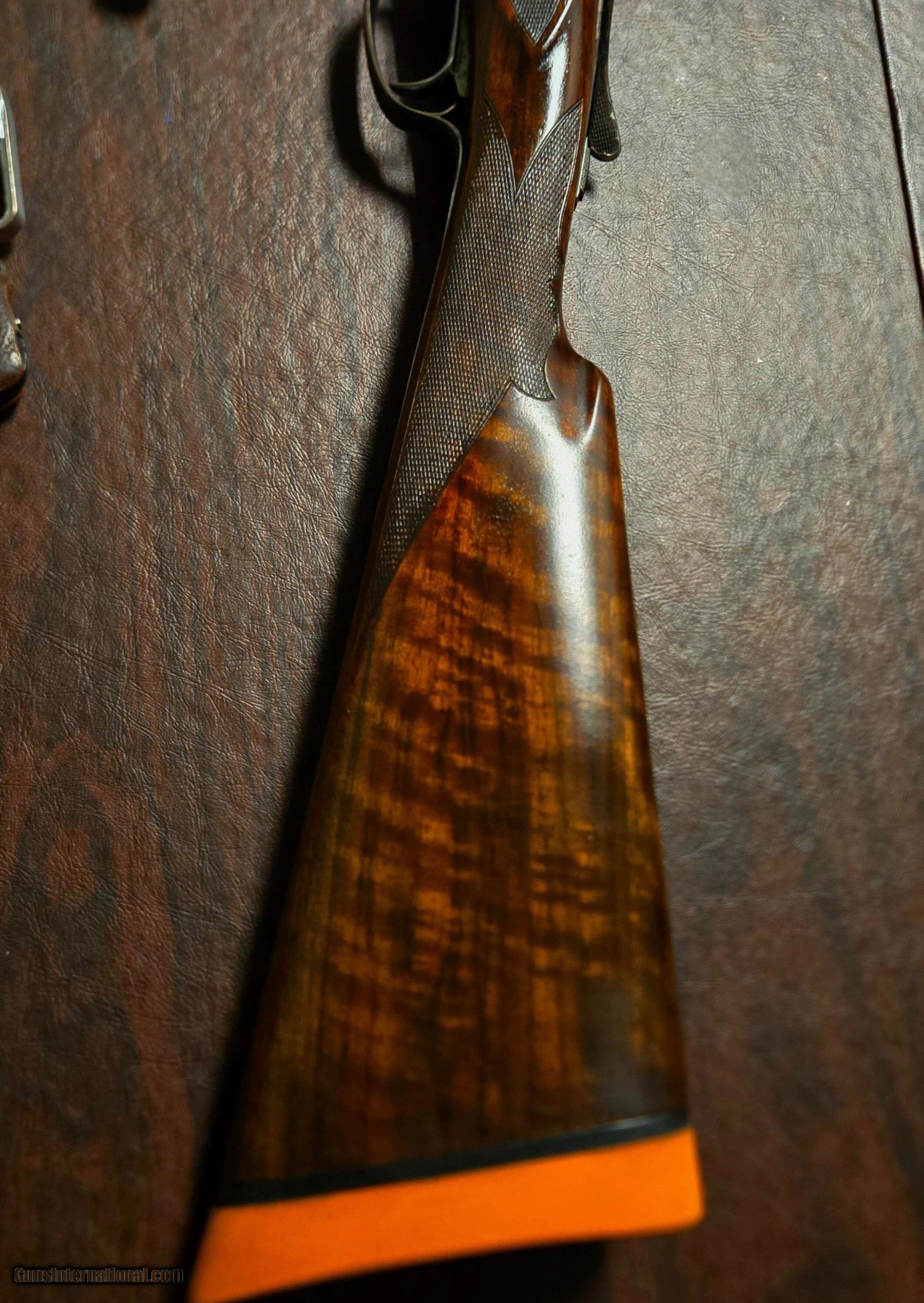 Description: Ansley H. FOX XE Grade Sn 27350. Savage, Fox Steven's Factory Certlfied (Cody Firearms Museum Records), Letter dated May 12, 2025, reflects A.H.FOX Factory features along with the work order tag 20647-39, dated July 13, 1939. All matching numbers. STOCK DIMENSIONS LOP = 14 3/8" over pad DAC = 1 1/4" DAH = 2 1/2" CAST = OFF 3/8" This fine A H Fox XE has a Single Select Factory Trigger, 2 barrel set:with dual Ivory beads: Set#1- 26in Choked R-Cy, L-Mod. Set#2- 32in R-F, Mod-Full. Factory original XE Engraving shows very sharp and Factory case hardened and correct timed screws. Both the action and barrels reflect 99% of vivid colors and mirror bores with ejectors being in time. Both the stock and forearm still retain factory checkering as sharp and on point. Given this guns age and very light use over the past 87 years reflects a high grade AH Fox in near mint condition. The only exceptions are the buttstock has had all light handling marks removed and now reflects the beautiful grain and feather crotch wood featuers. A new Silvers Pad has been added (orginal leather covered pad with leather covered matching plugs accompany this gun to buyer). This XE Grade will surely make a very fine addition to a Collectors investment or used to Duck hunt at daybreak and upland after lunch. Please feel free to call us should you have any questions, as we speak vintage and new shotguns. Curio/Relic: Yes Shotgun Gauge: 12 Gauge Price: $15,995.00 Shipping: $70.00 Buy Now Contact Seller |